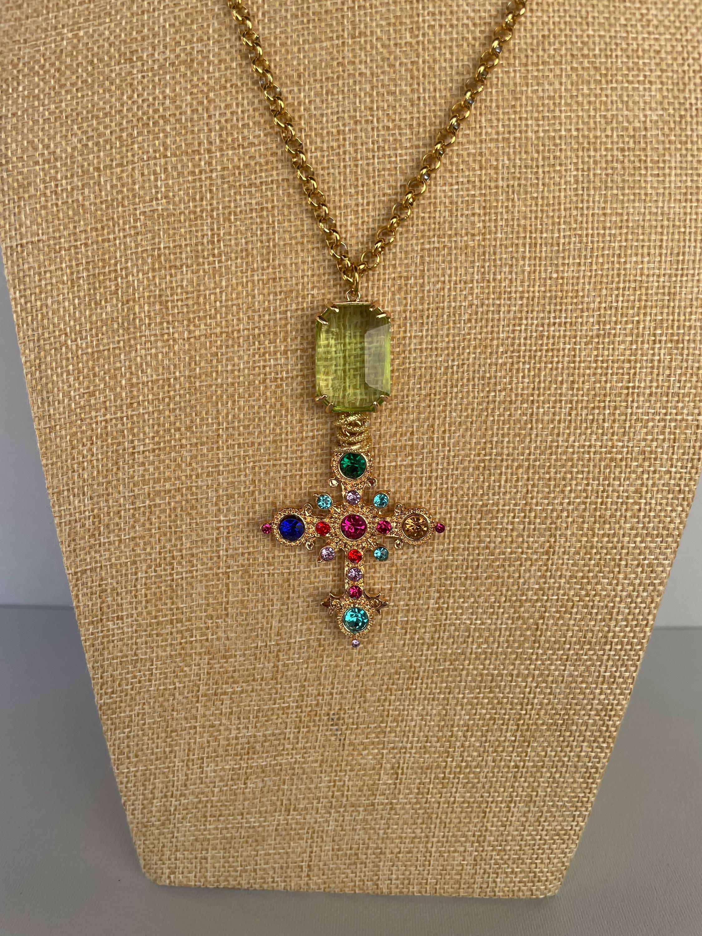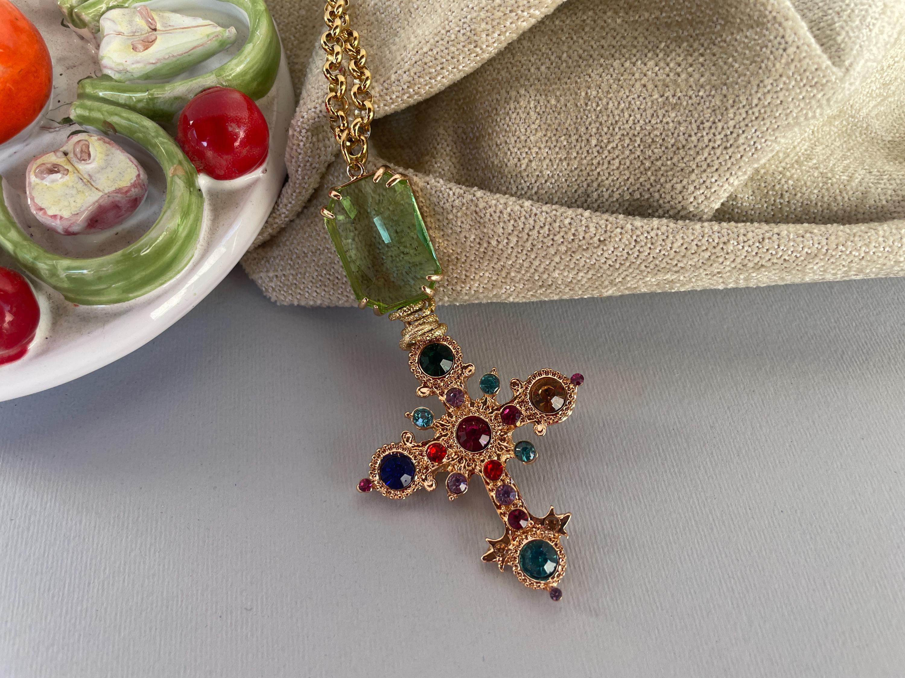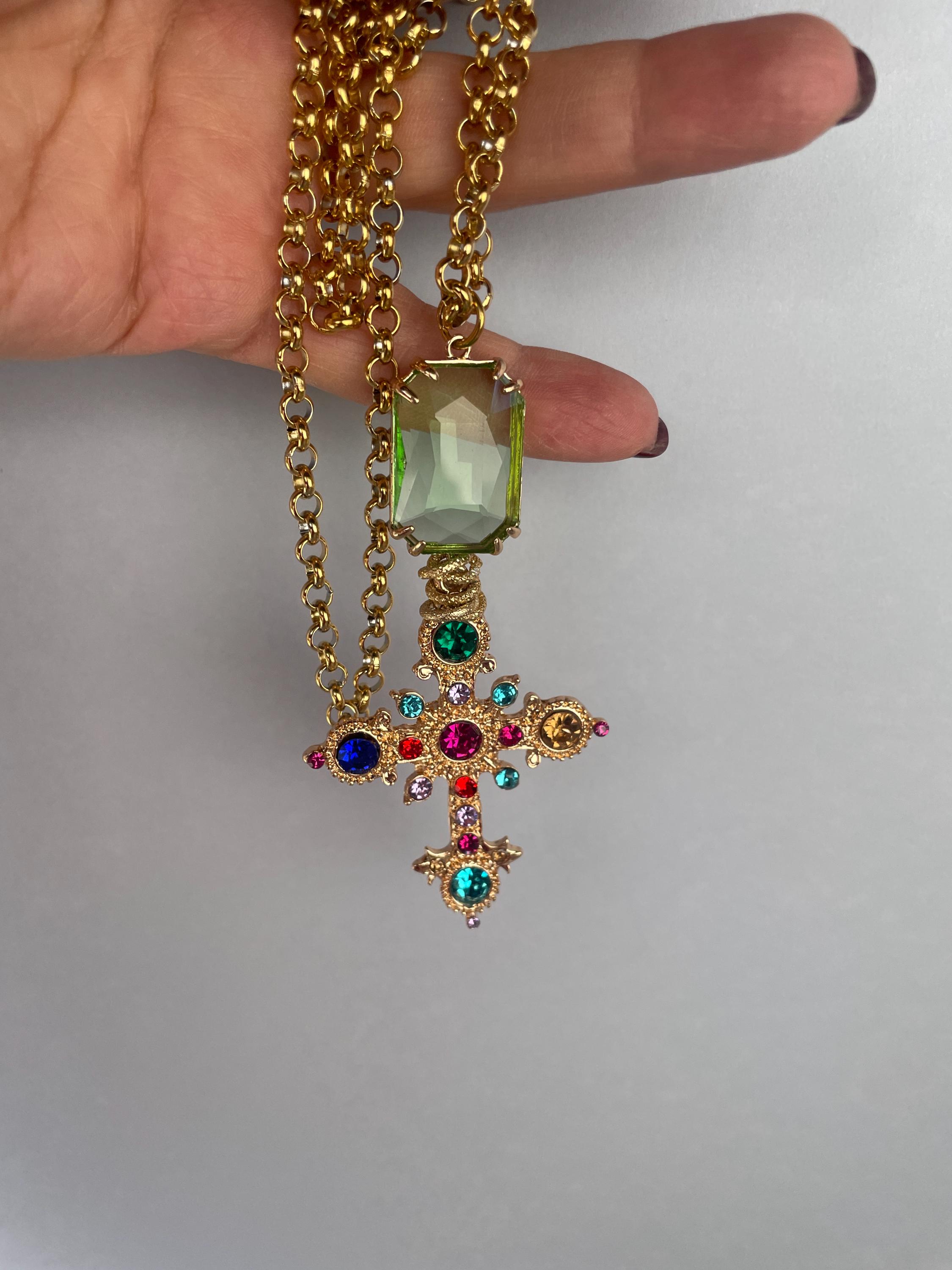 Collana dallo stile moderno con una lunga catena (cm 100/40″) in acciaio inossidabile placcato oro e un maxi ciondolo realizzato dalla combinazione di un cristallo rettangolare di colore verde incastonato su una base di ottone e una Croce dorata con cristalli multicolor.