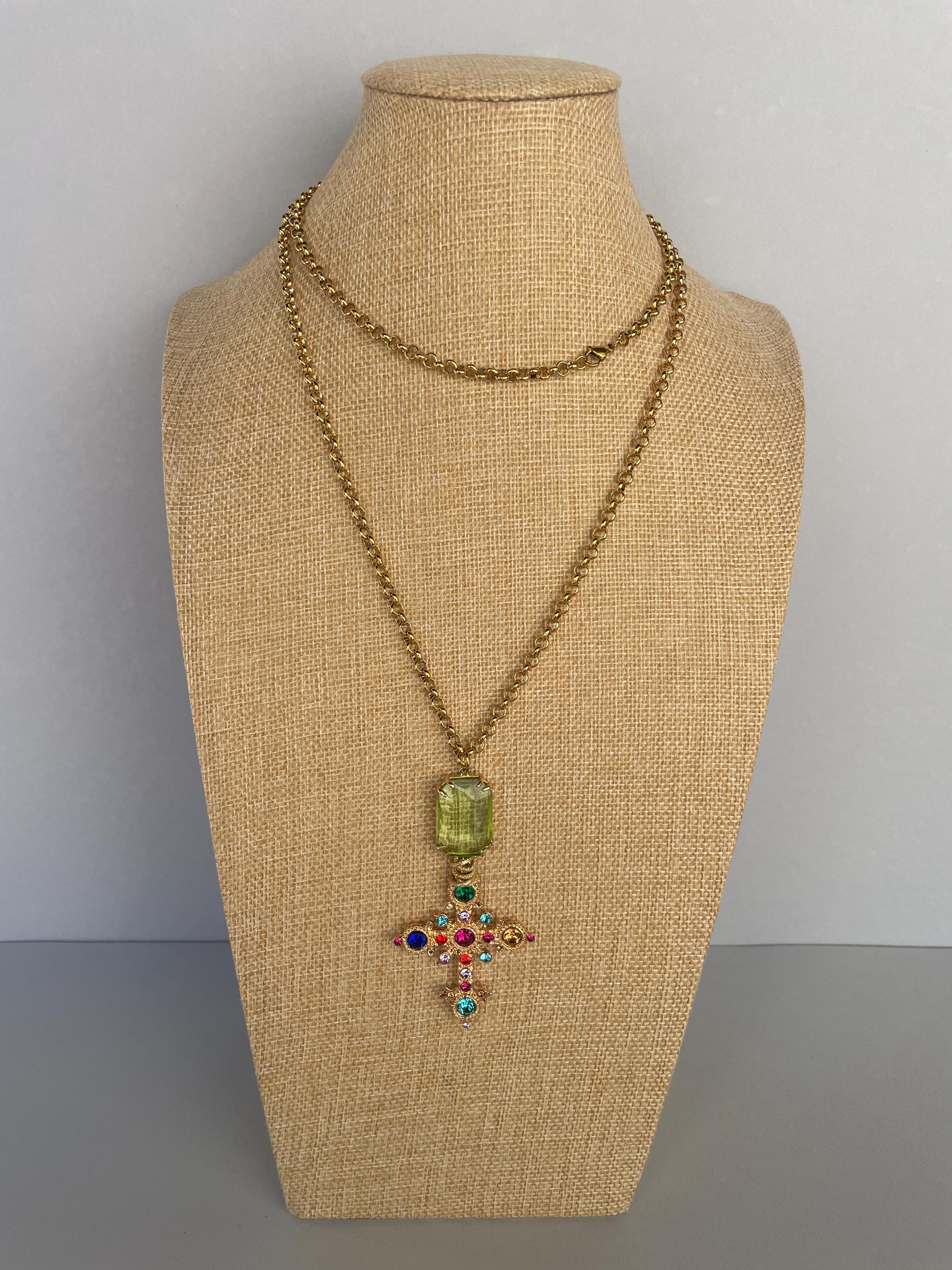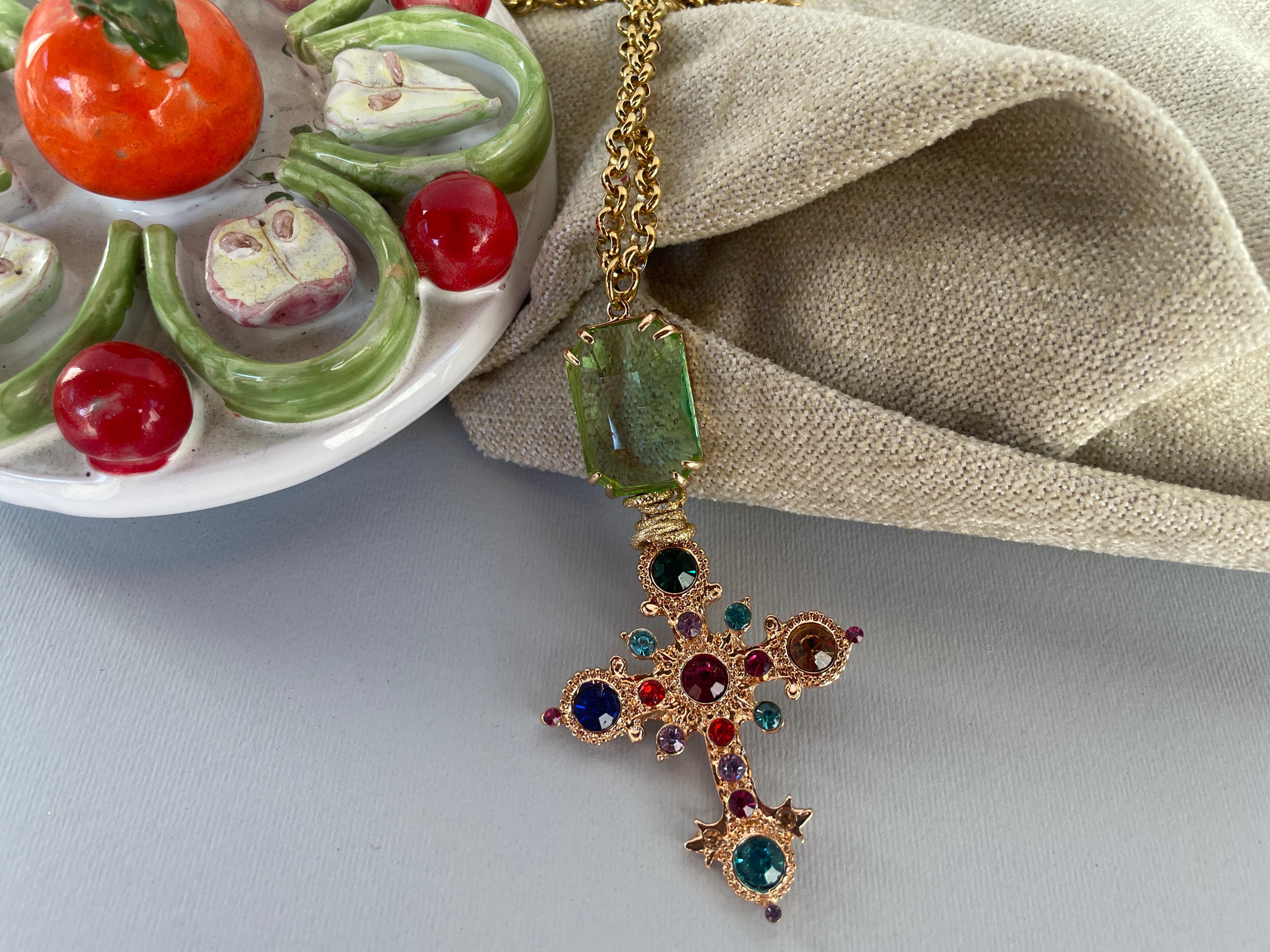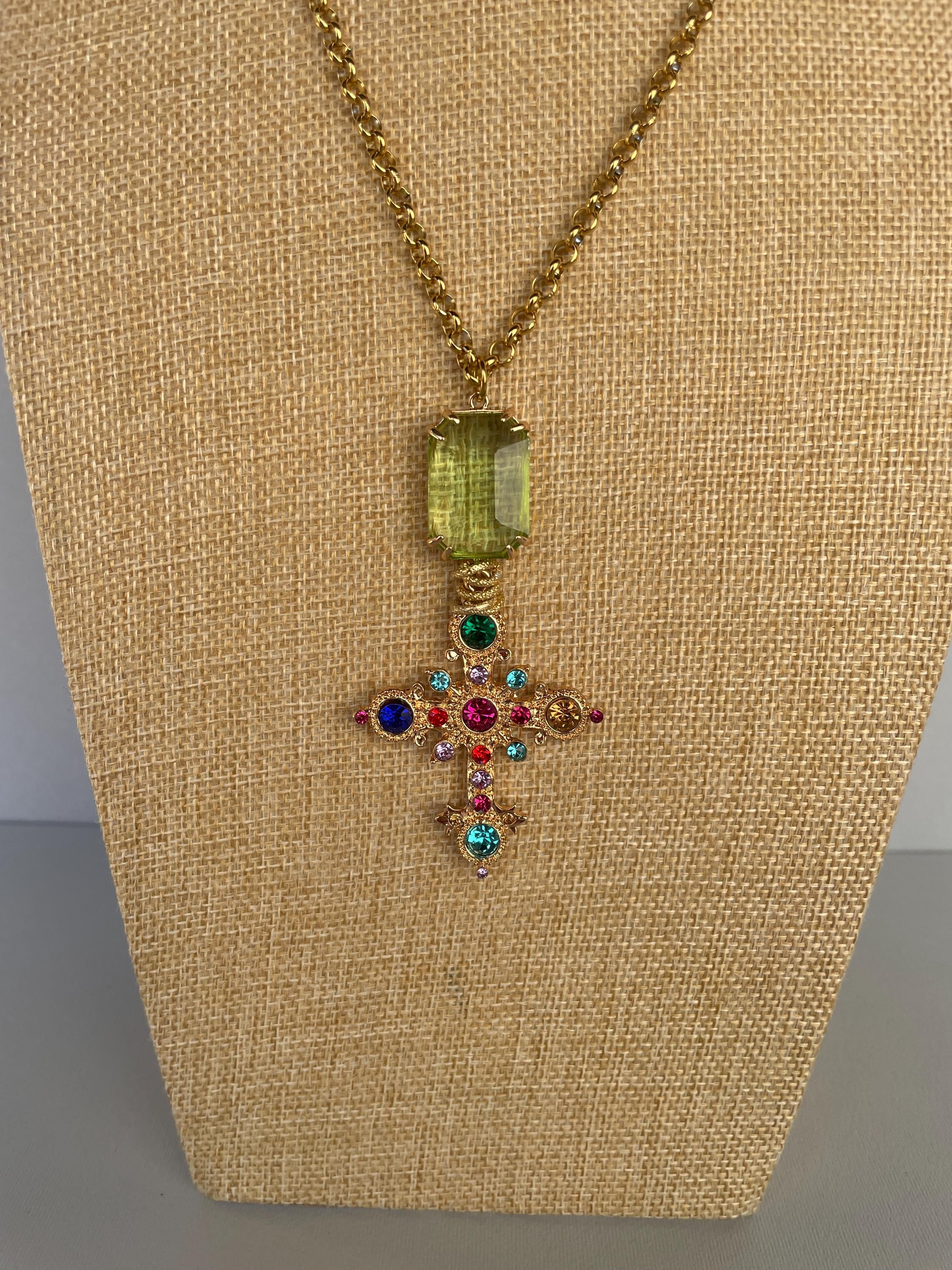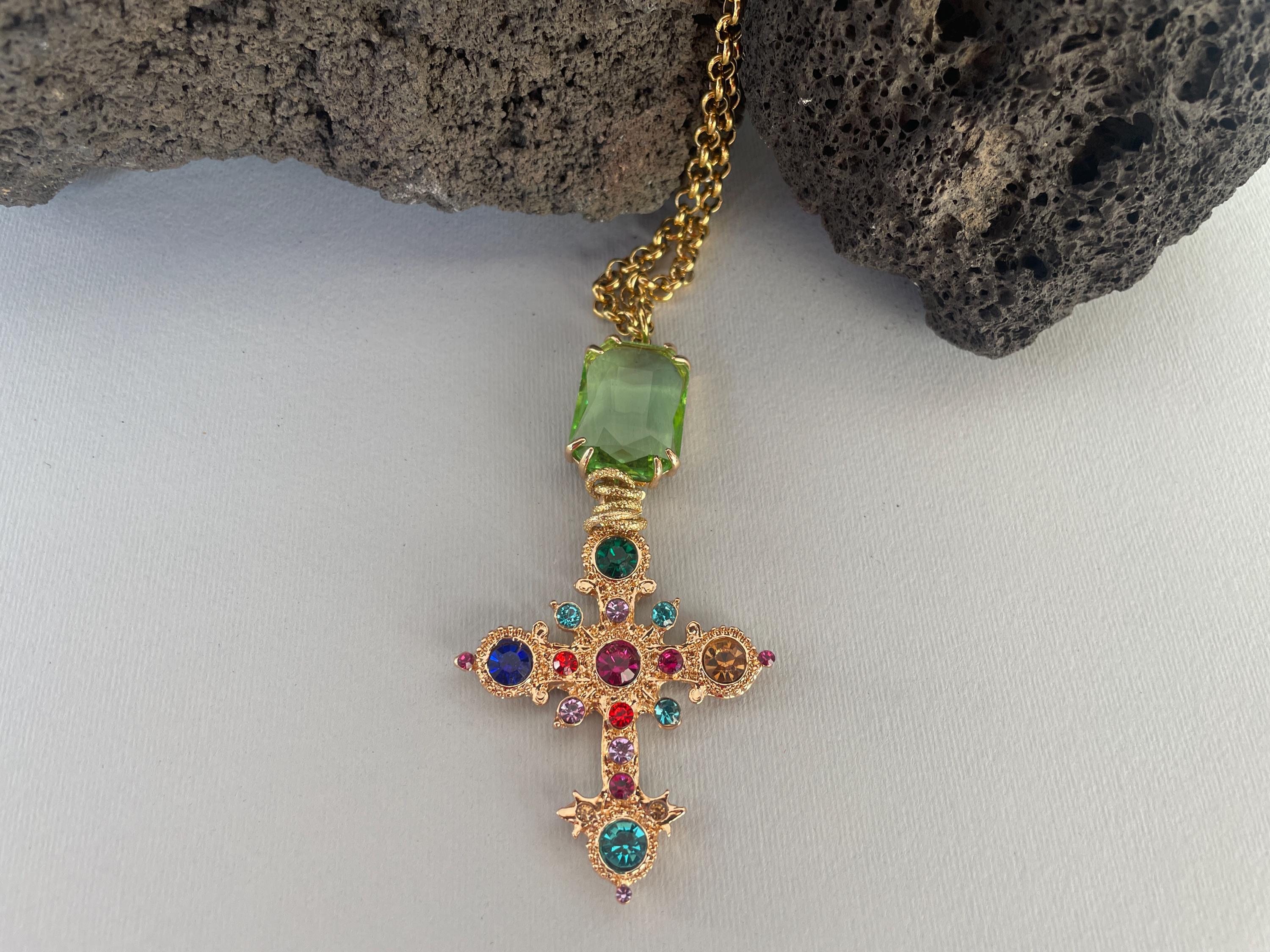 Collana dallo stile moderno con una lunga catena (cm 100/40″) in acciaio inossidabile placcato oro e un maxi ciondolo realizzato dalla combinazione di un cristallo rettangolare di colore verde incastonato su una base di ottone e una Croce dorata con cristalli multicolor.