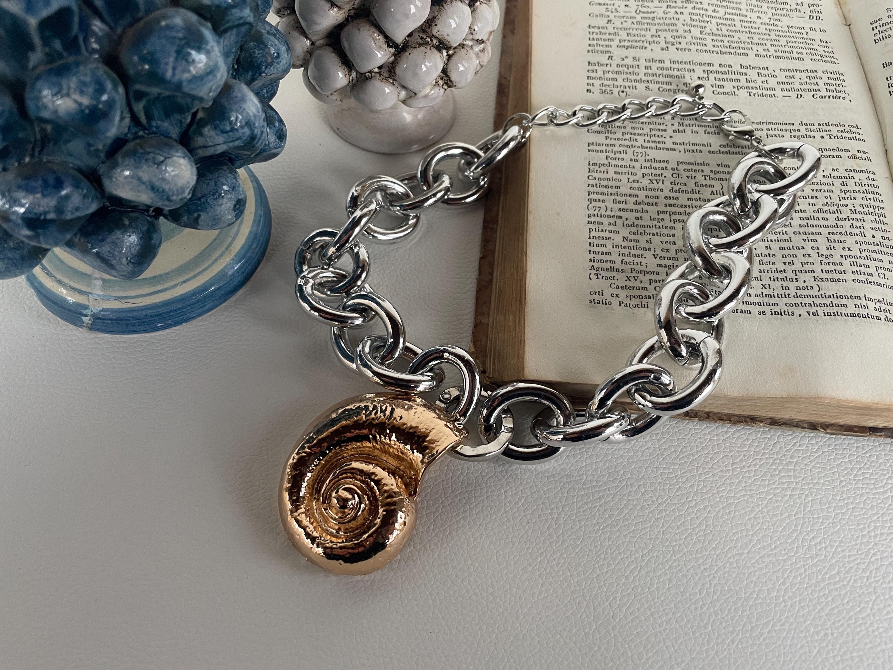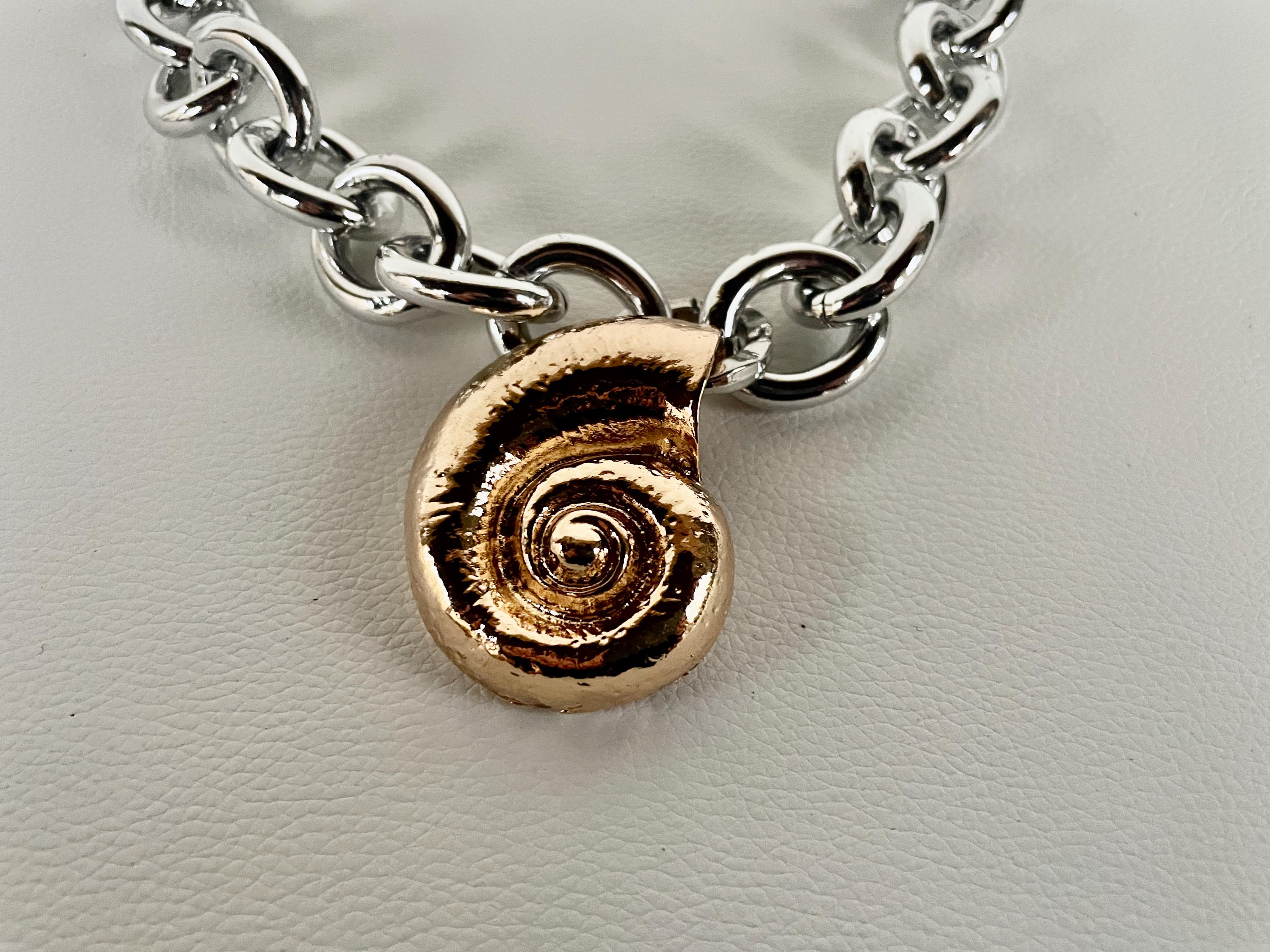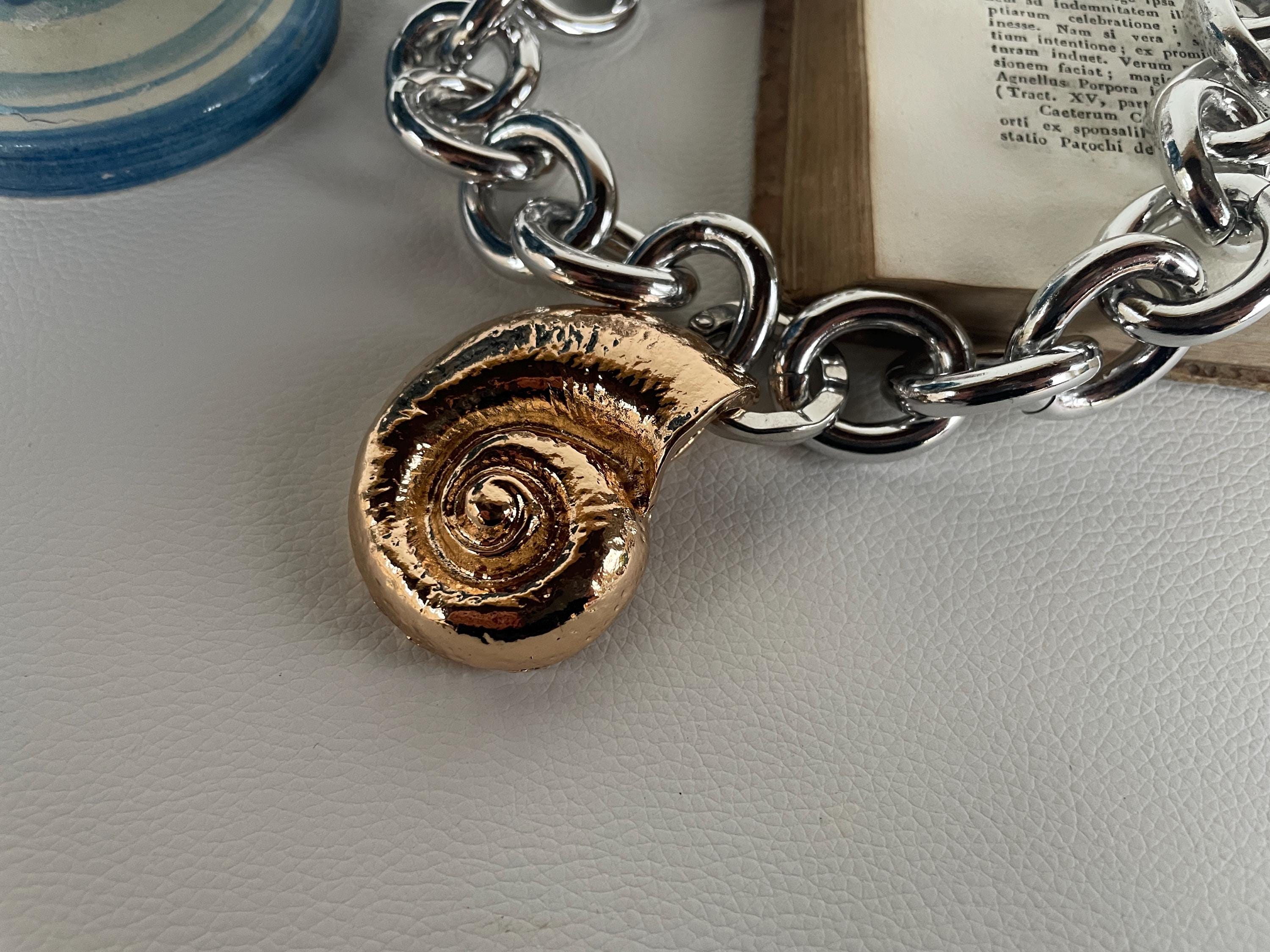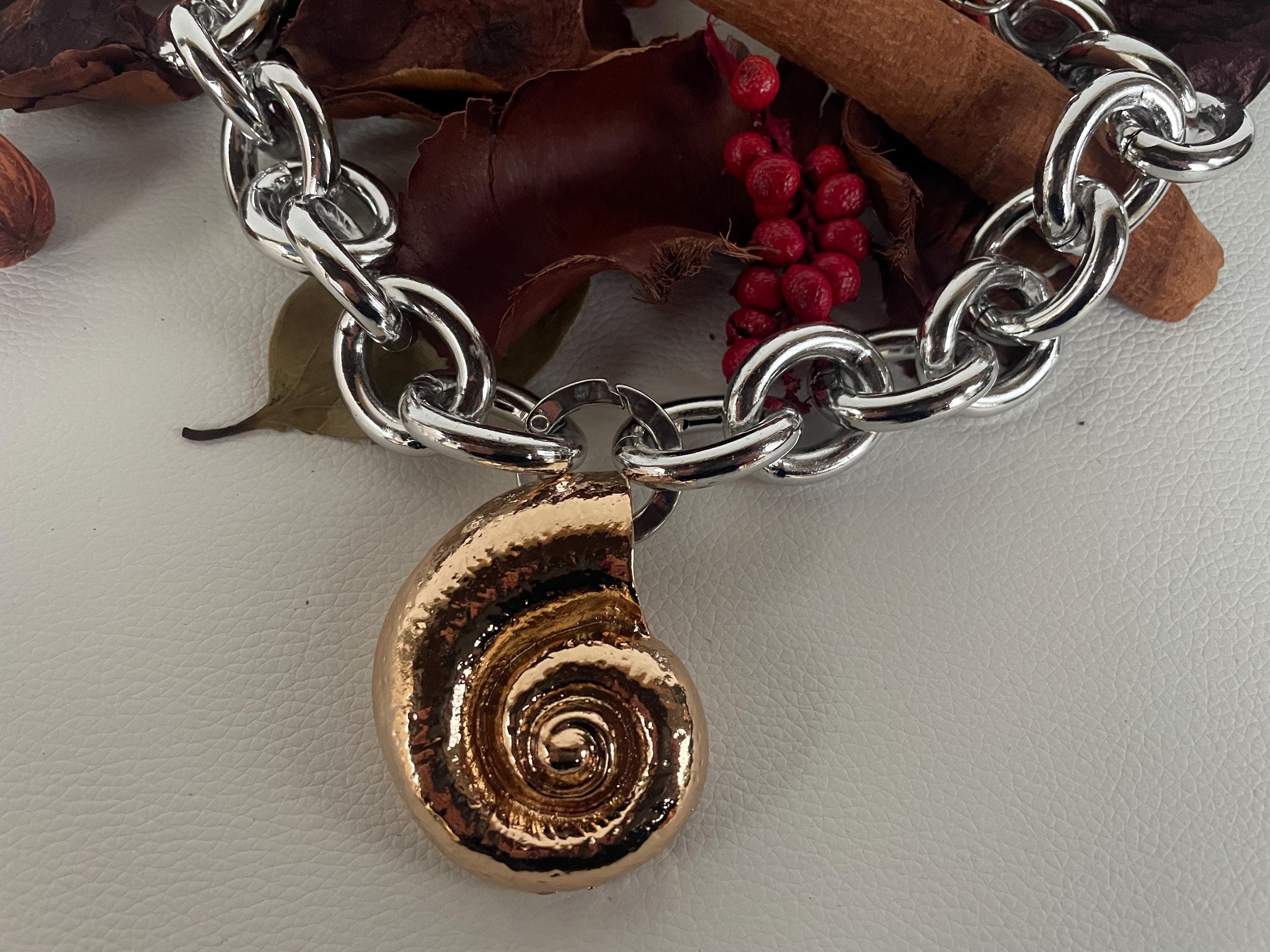 Un enorme ciondolo a forma di Conchiglia di bronzo dorato che si combina con una maxi catena moderna a maglie ovali in alluminio anallergico di colore argento.