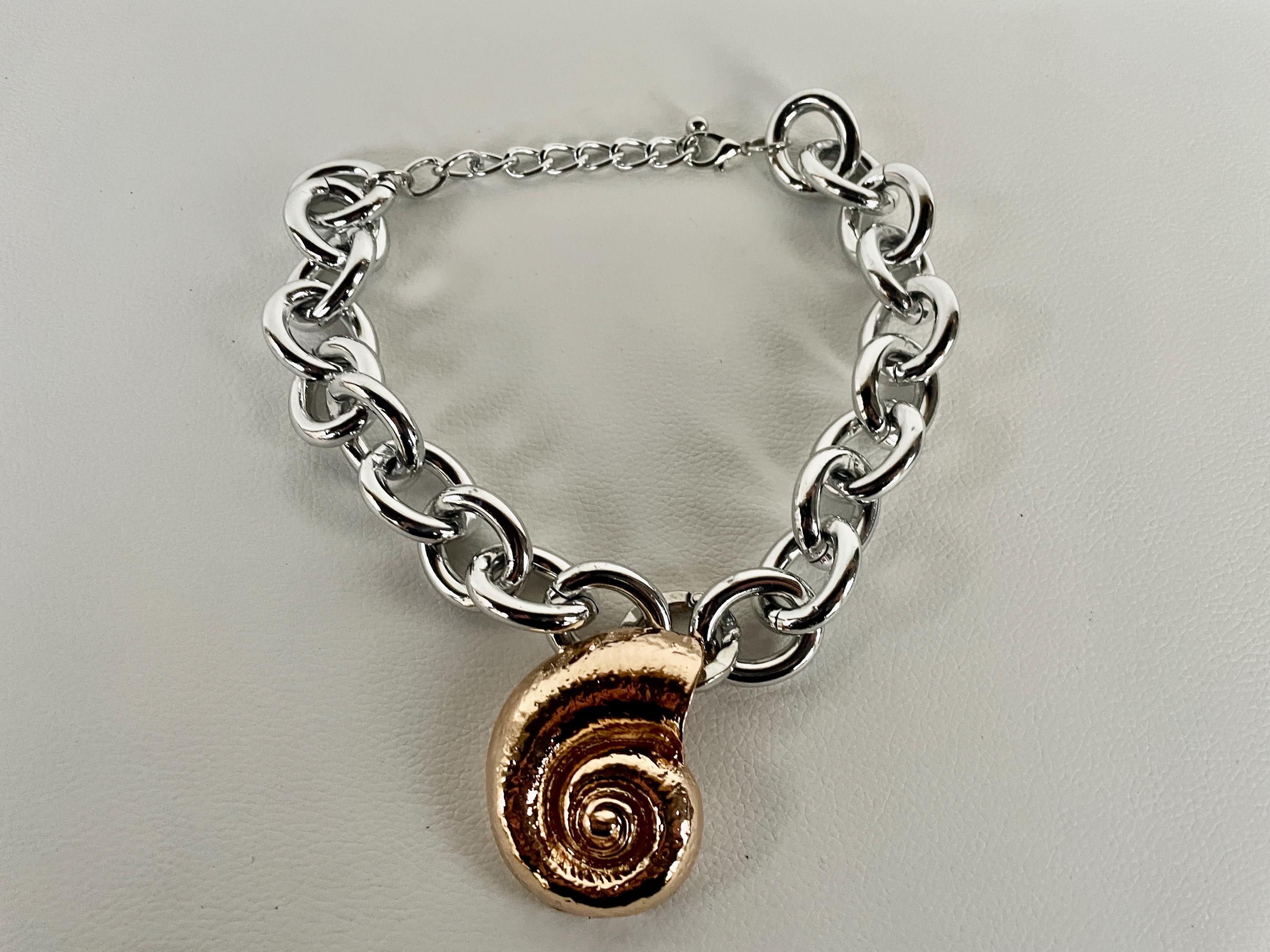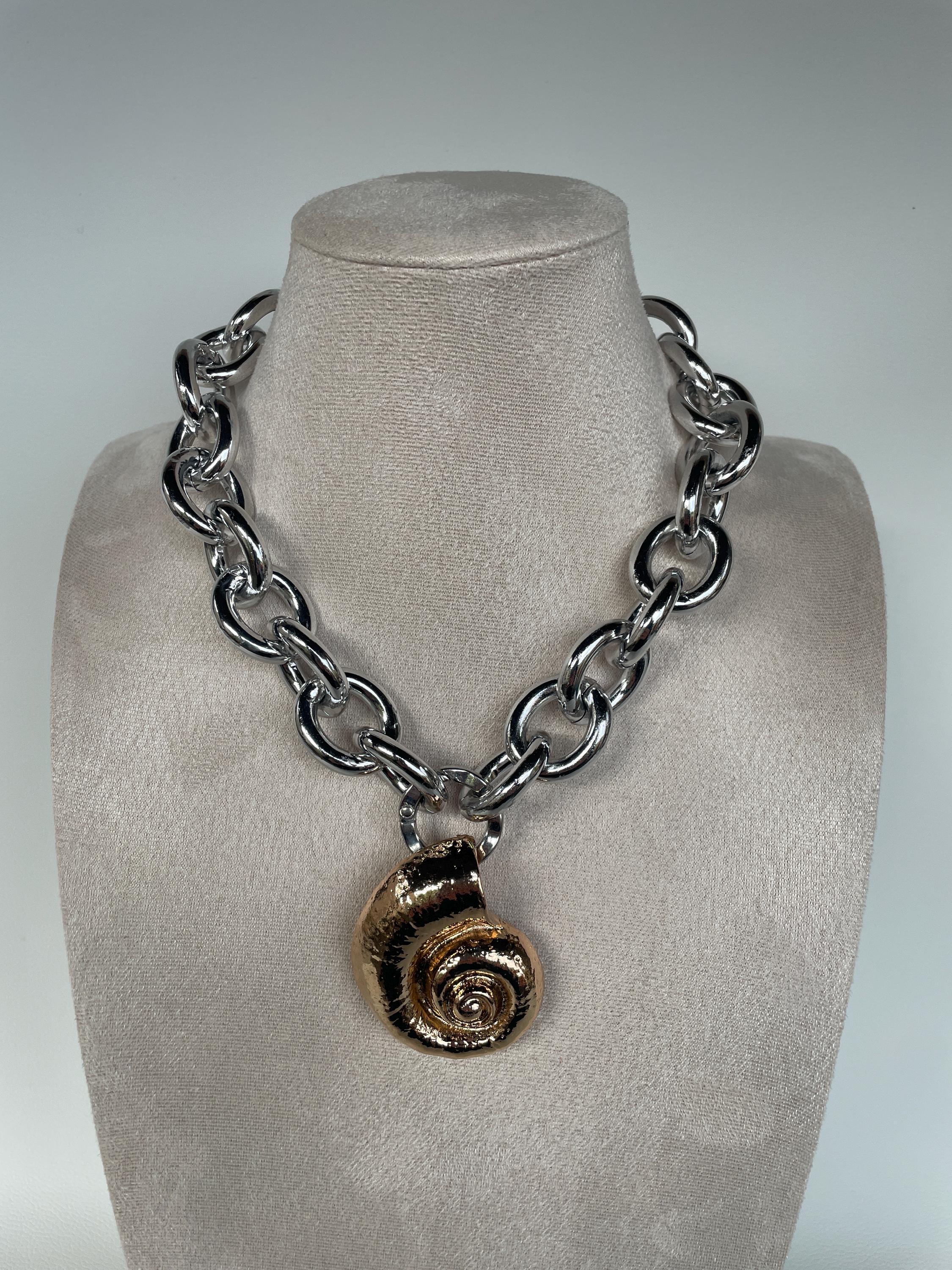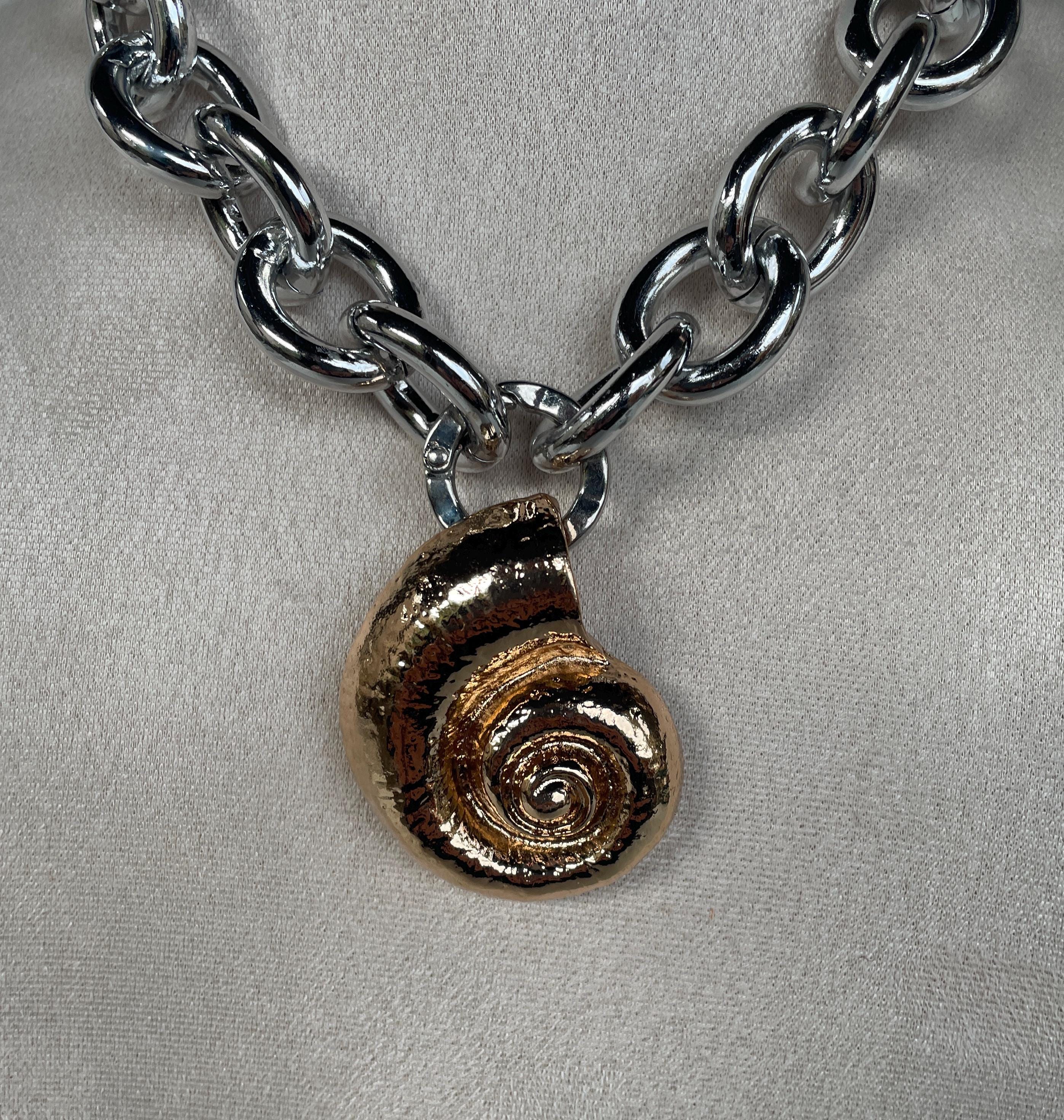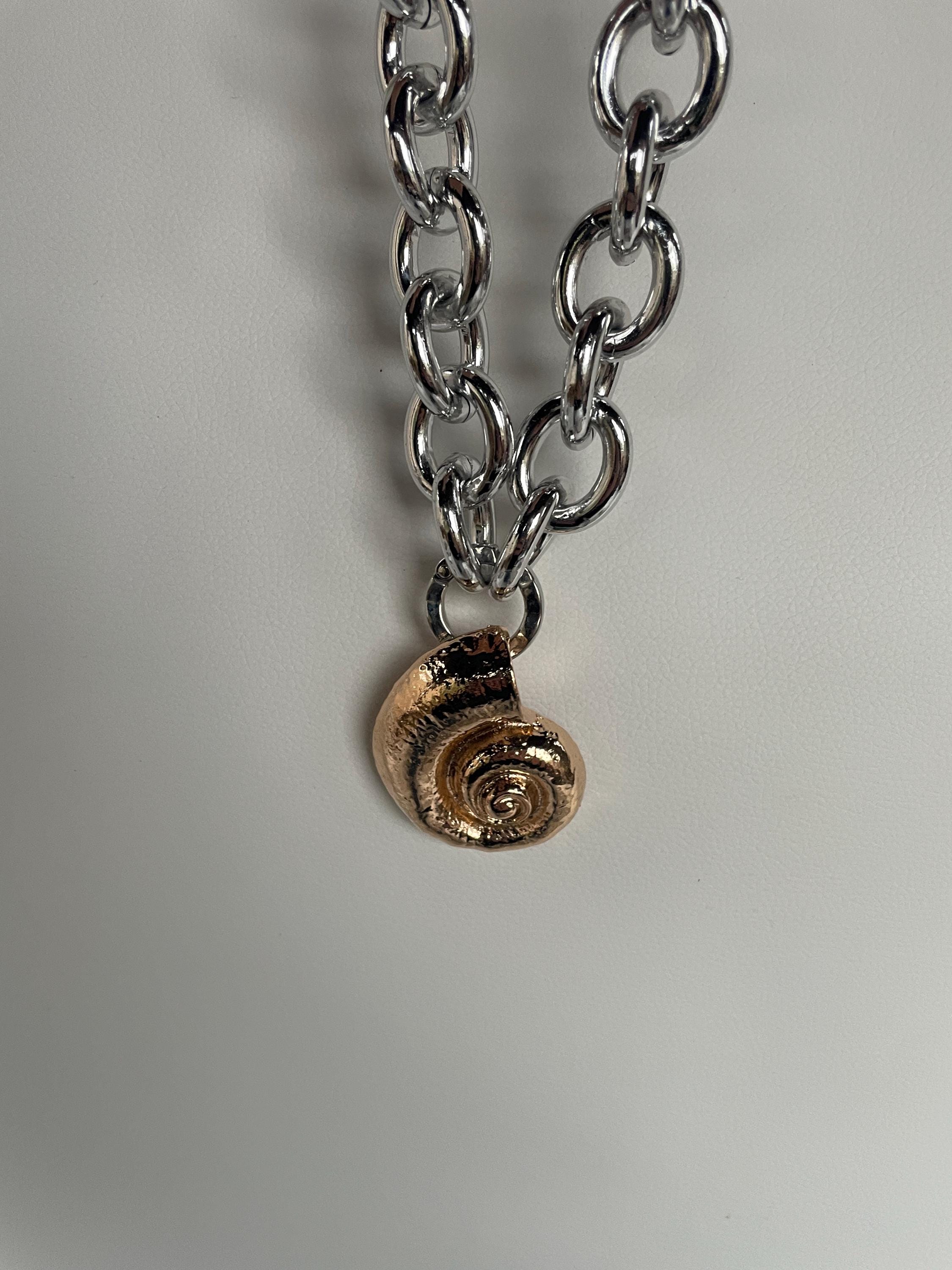 Un enorme ciondolo a forma di Conchiglia di bronzo dorato che si combina con una maxi catena moderna a maglie ovali in alluminio anallergico di colore argento.