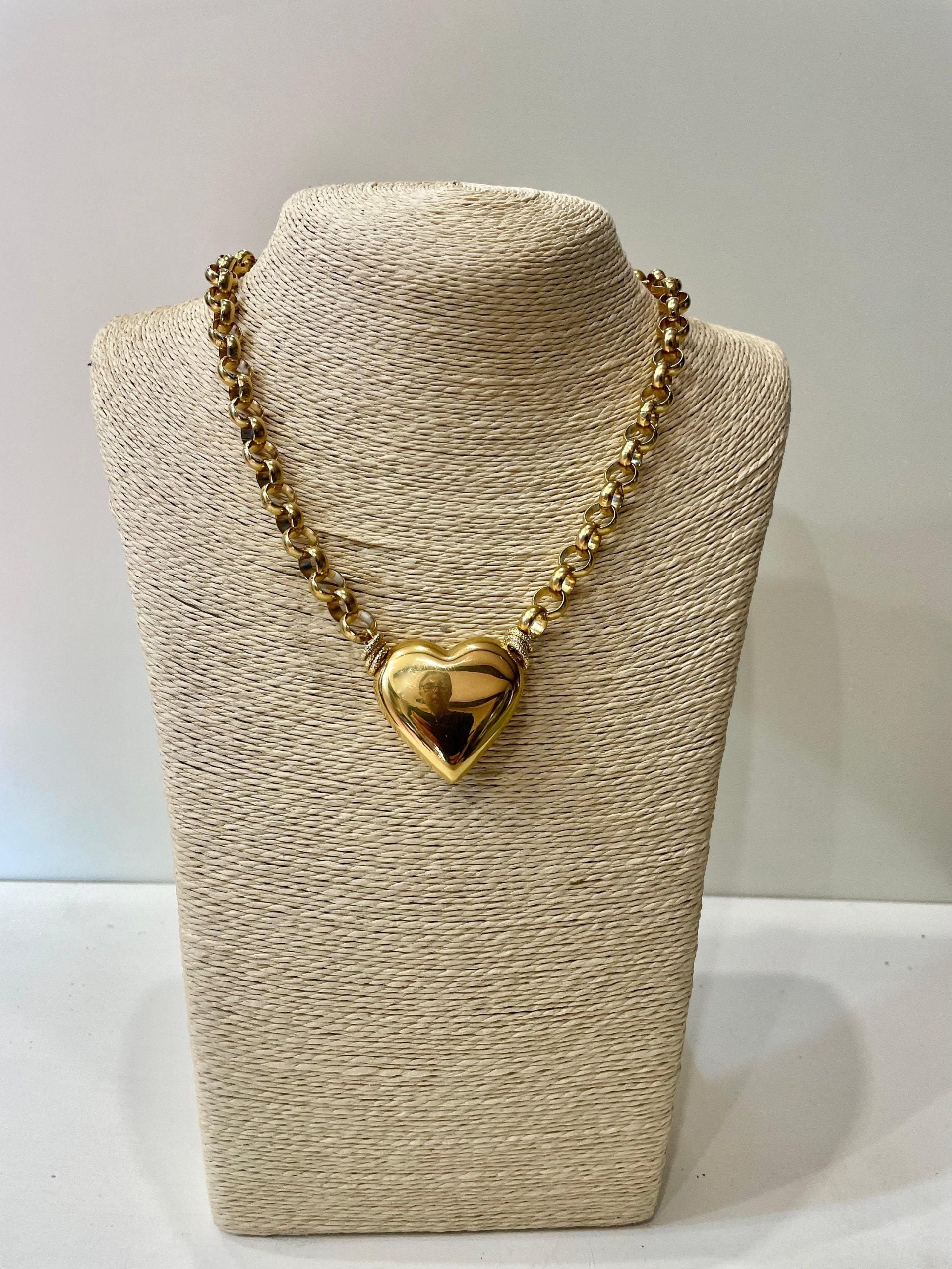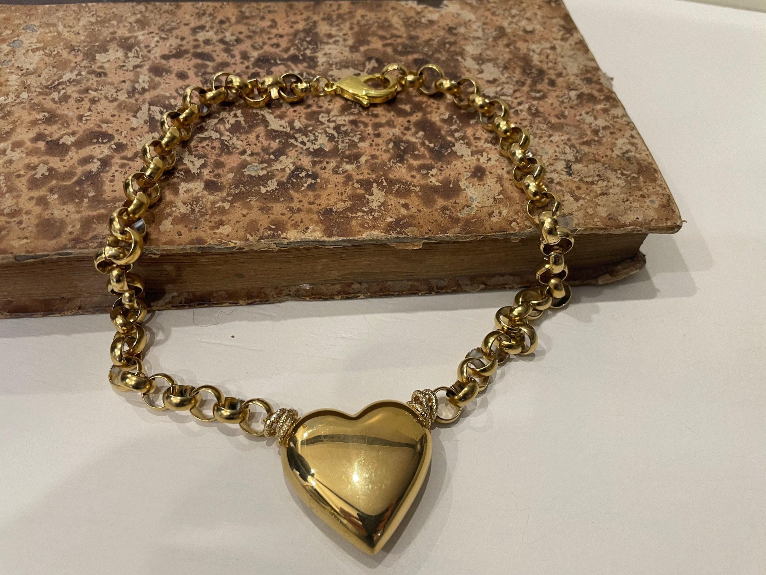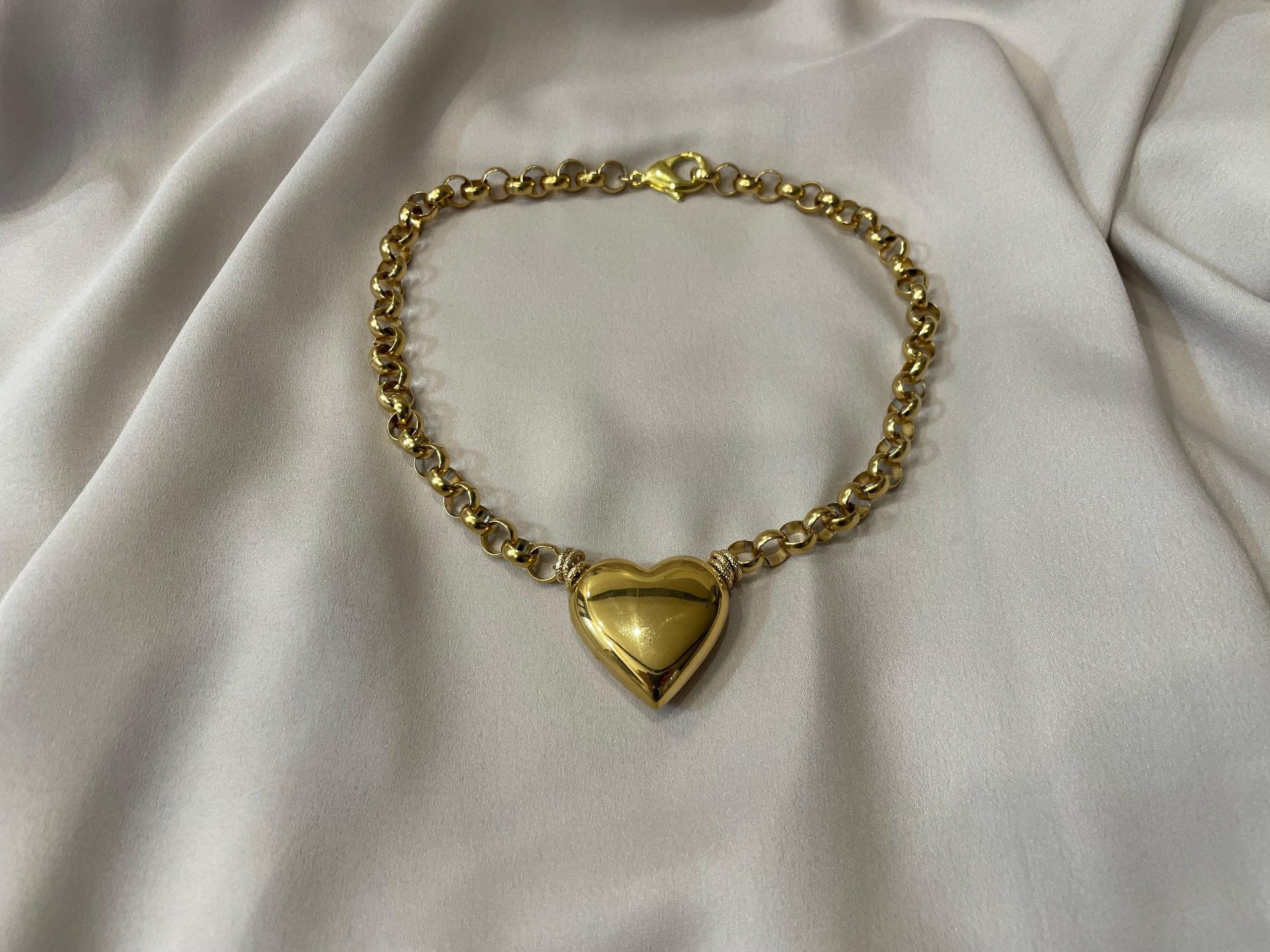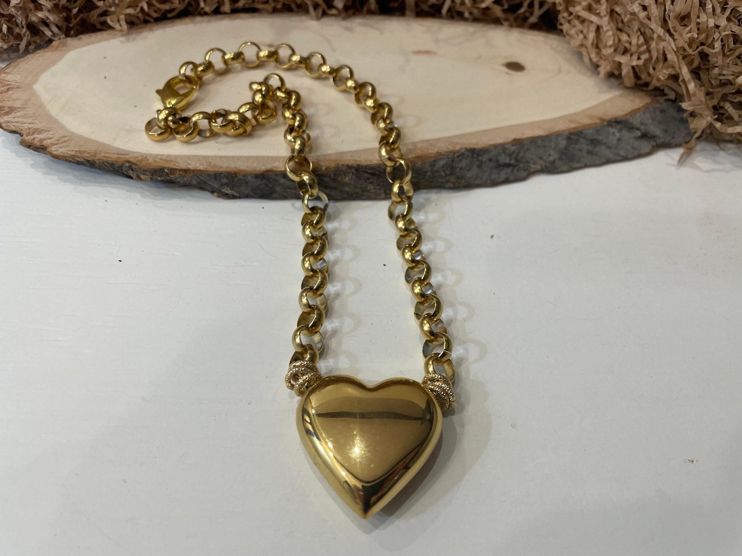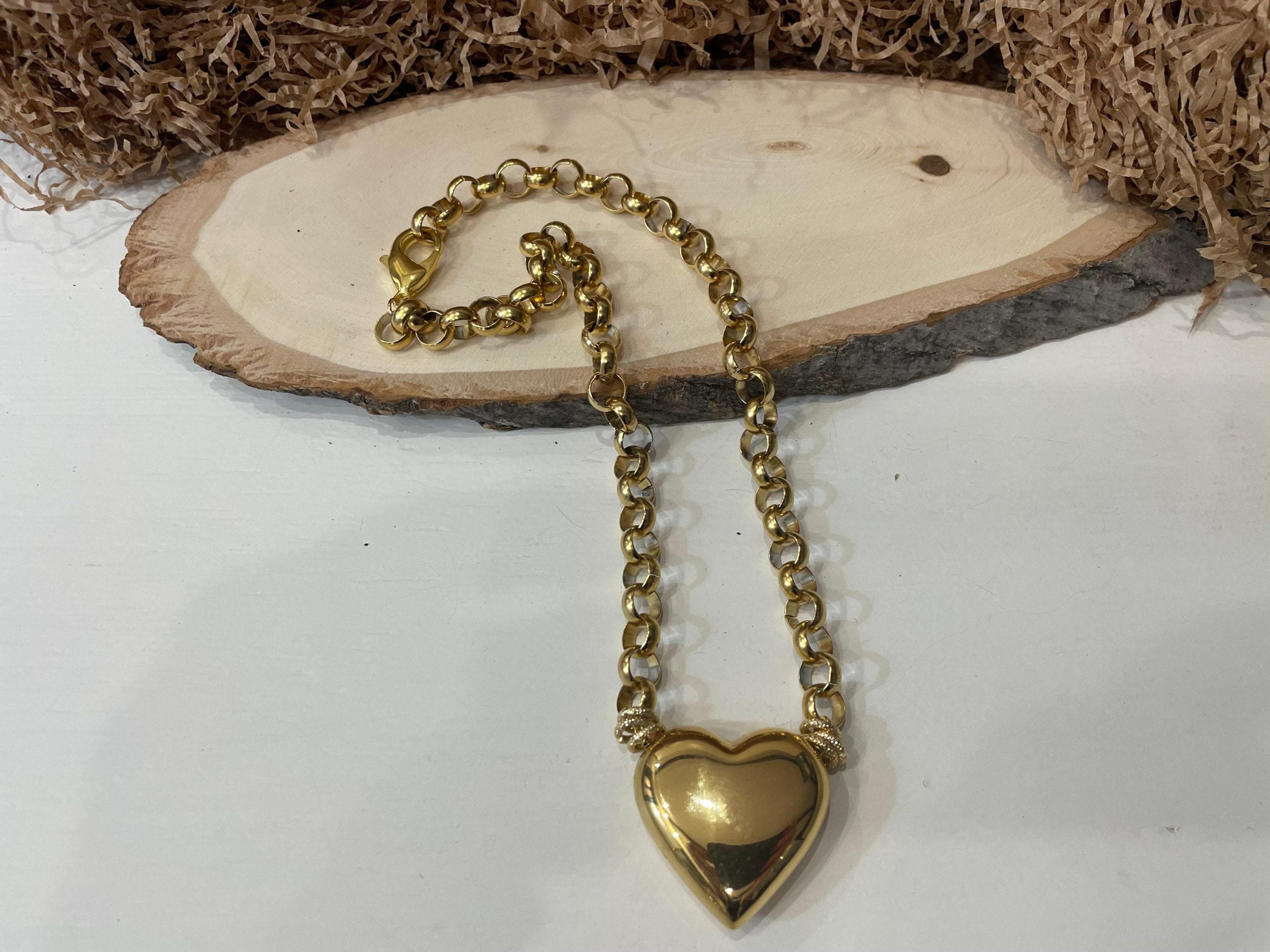 Un grande cuore paffuto in ottone placcato oro 14k come pendente combinato con una moderna catena rolo. Questa collana esprime un grande stile; ideale per tutto l’anno e per ogni occasione!