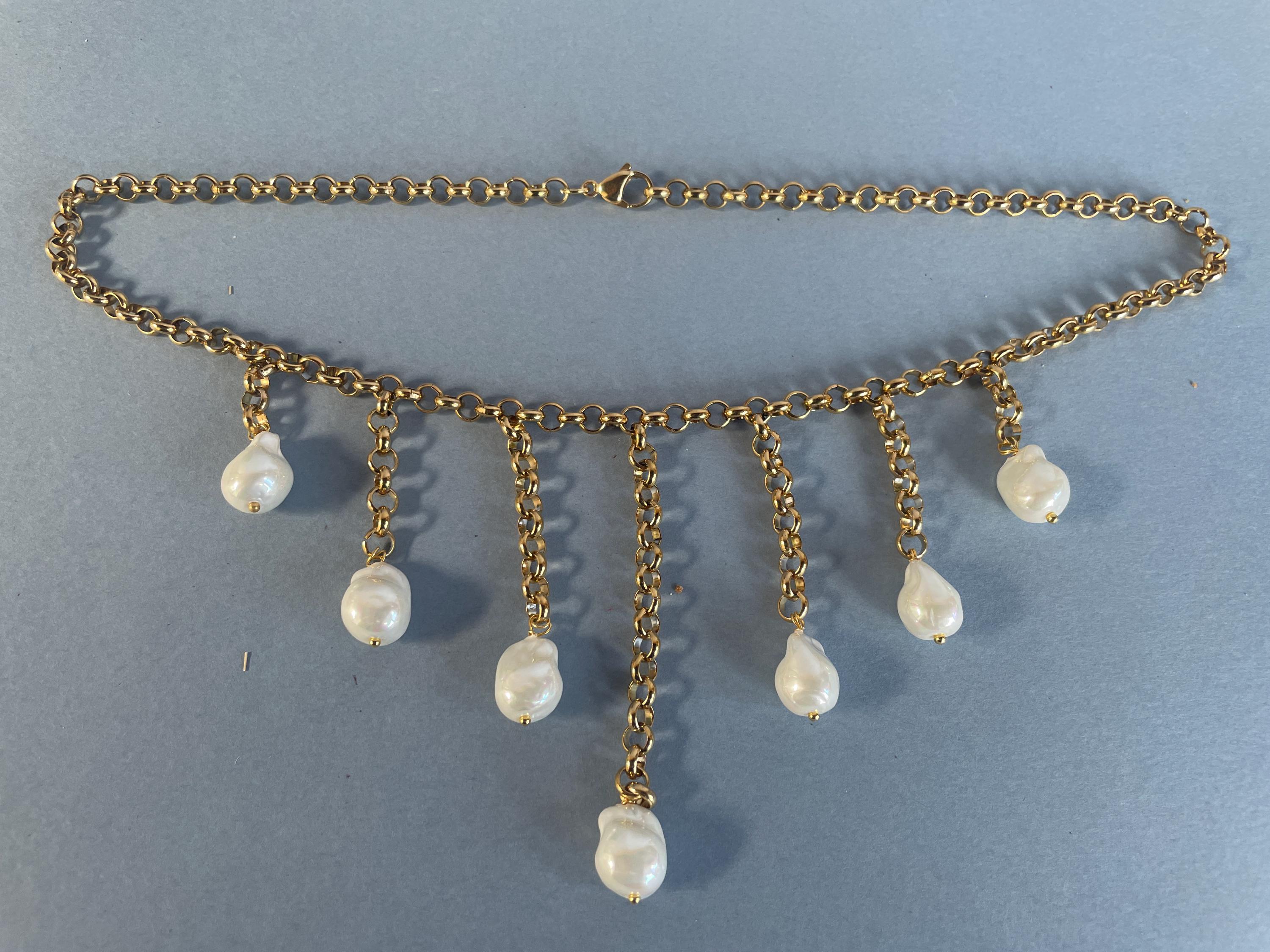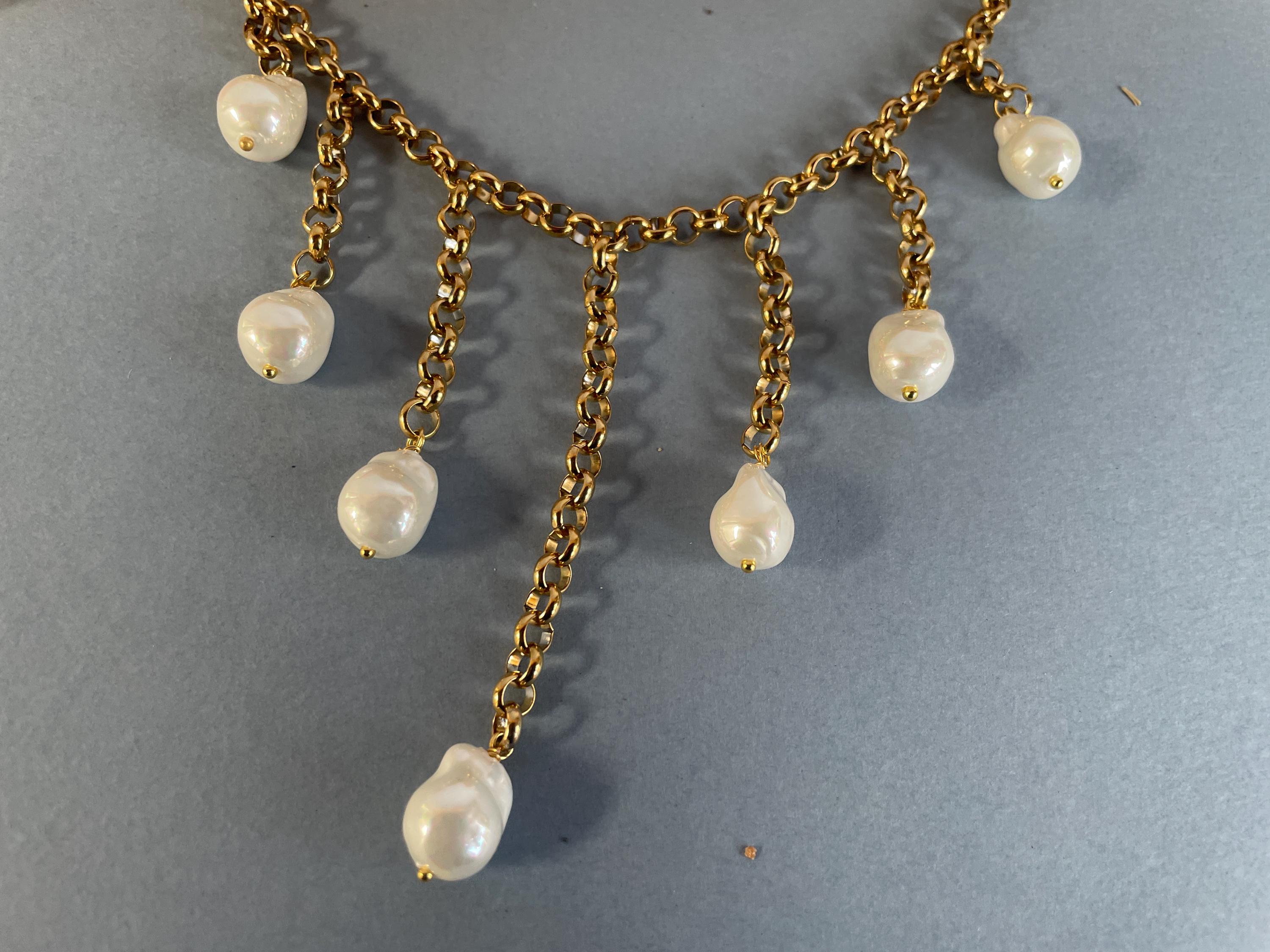 Da essa pendono in lunghezza progressiva 7 perle Maiorca dalla forma irregolare (tipo scaramazze).