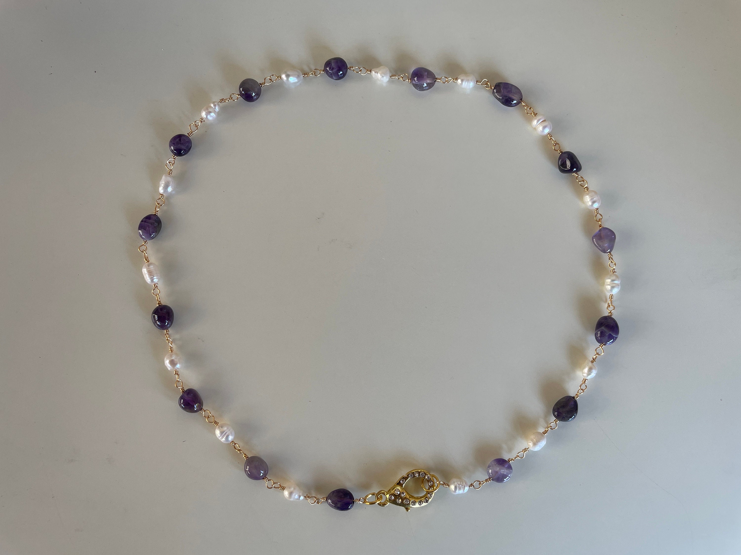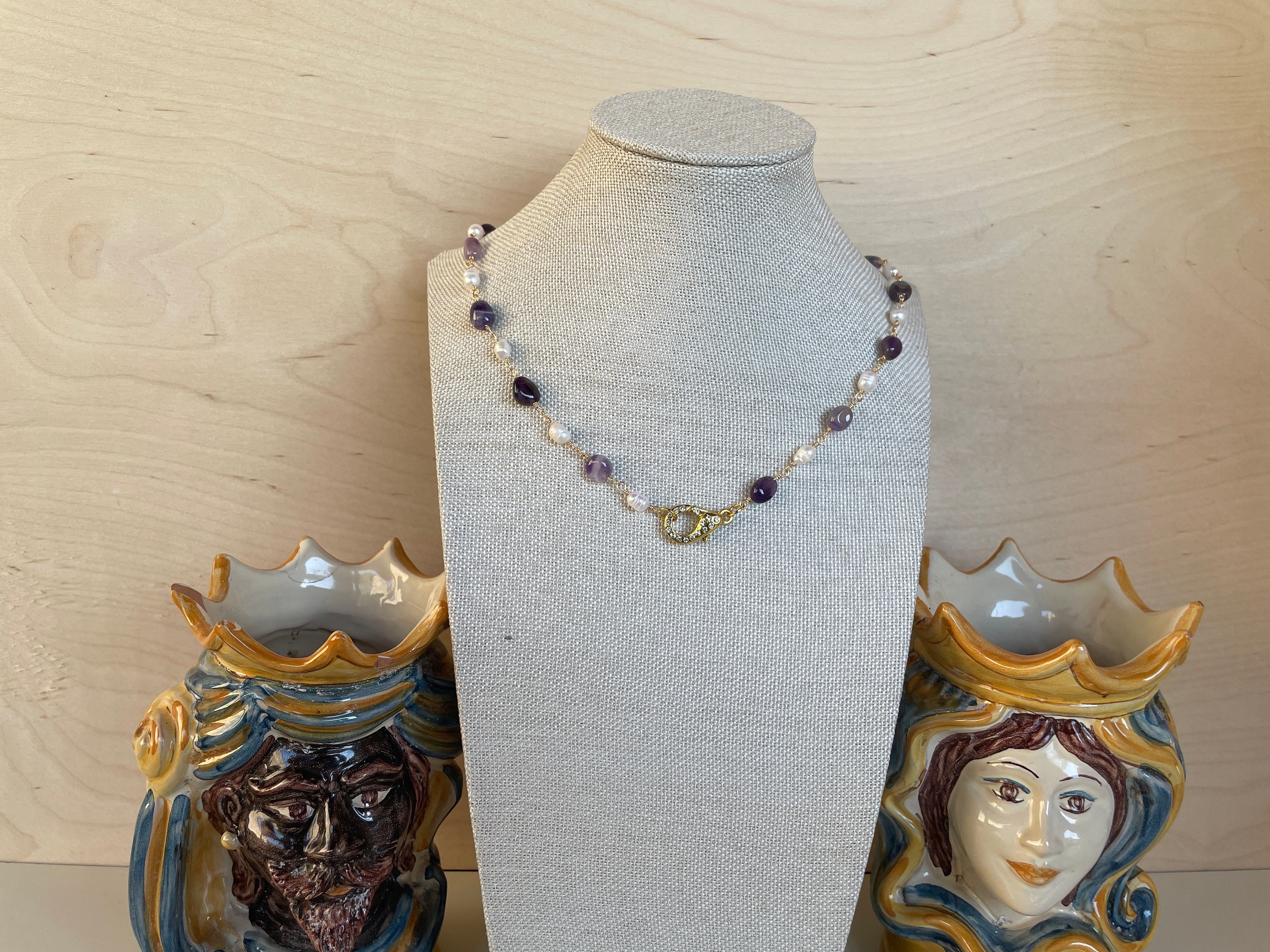 Collana girocollo sobria e dal gusto semplice realizzata con perle di fiume e sassi burattati di Ametista, legati da un filo di ottone dorato.