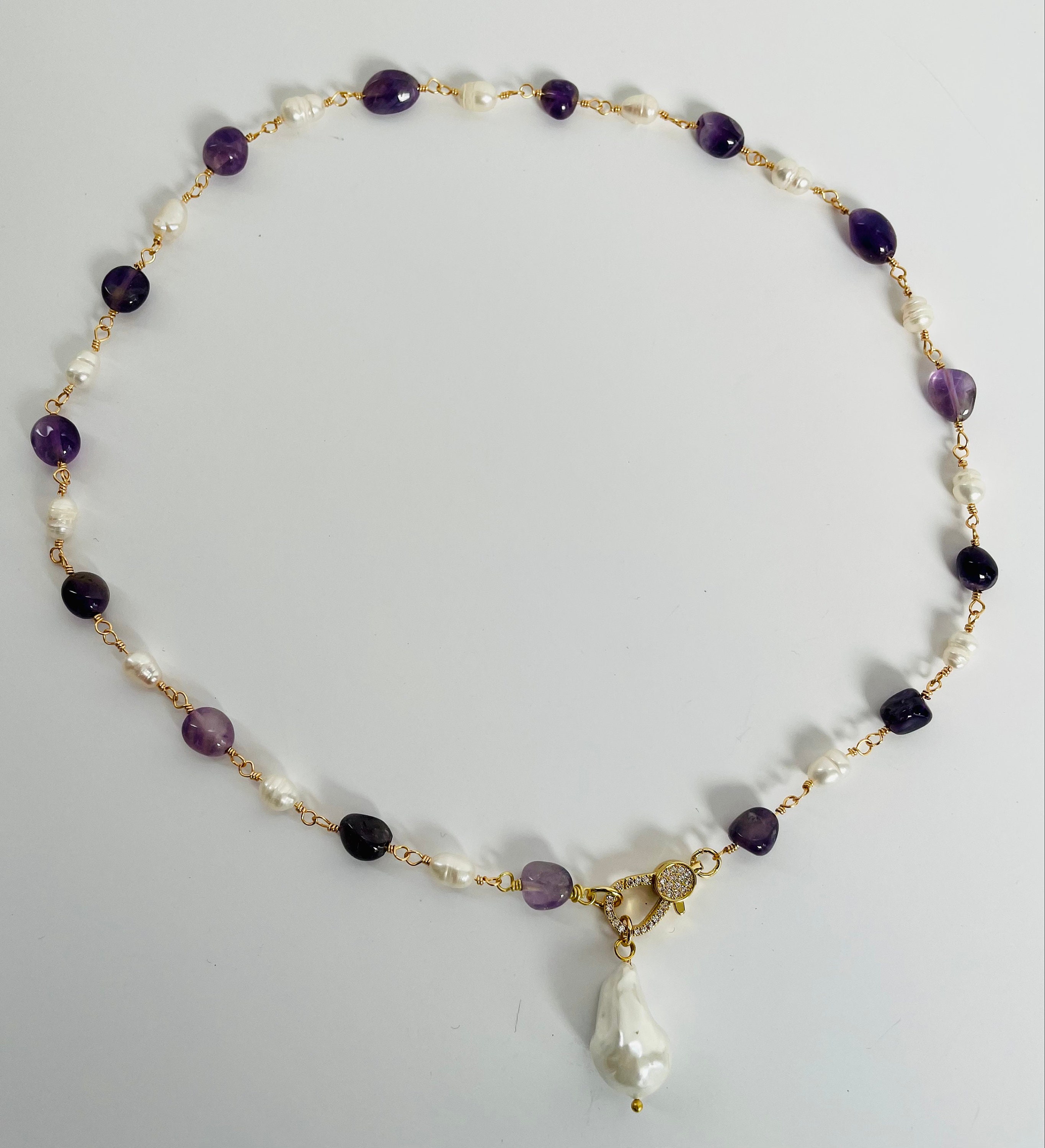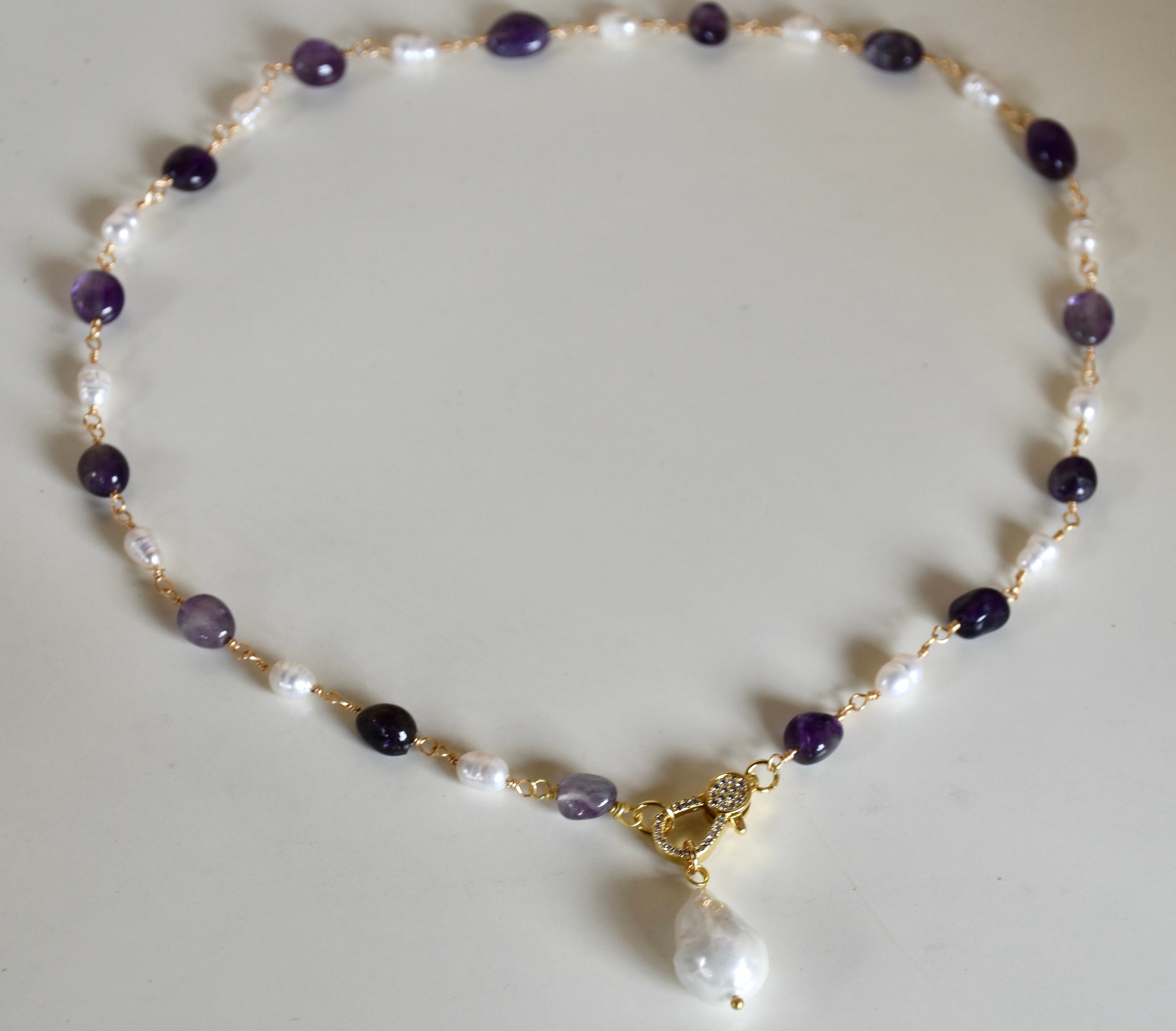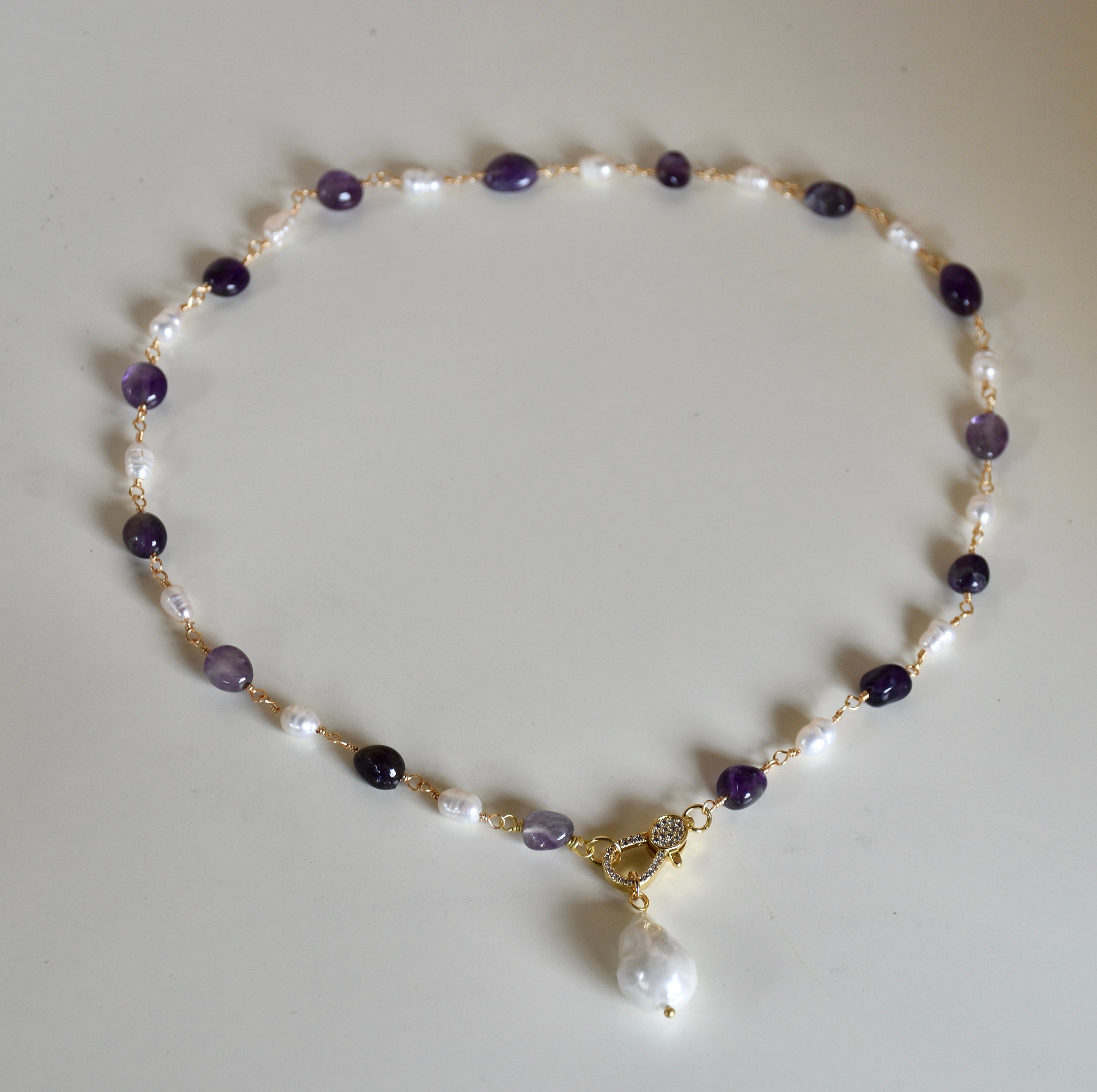 Collana girocollo classica e semplice dallo stile intramontabile realizzata con perle di fiume e sassi burattati di Ametista, legati da un filo di ottone dorato.