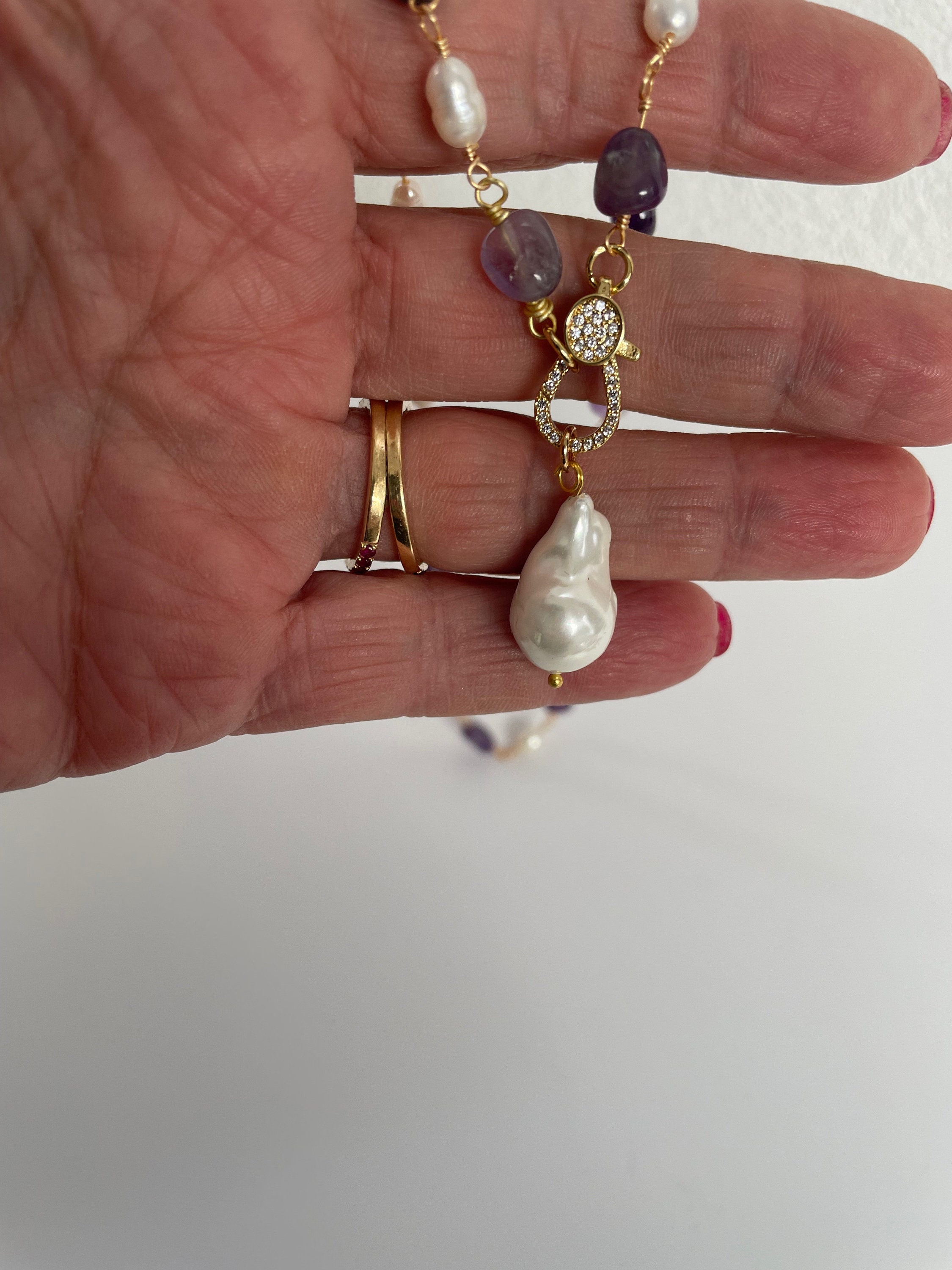 Collana con catena Rosario, collana perle di fiume e ametista, pendente perla, chiusura gioiello acciaio inossidabile, oro e zirconi.