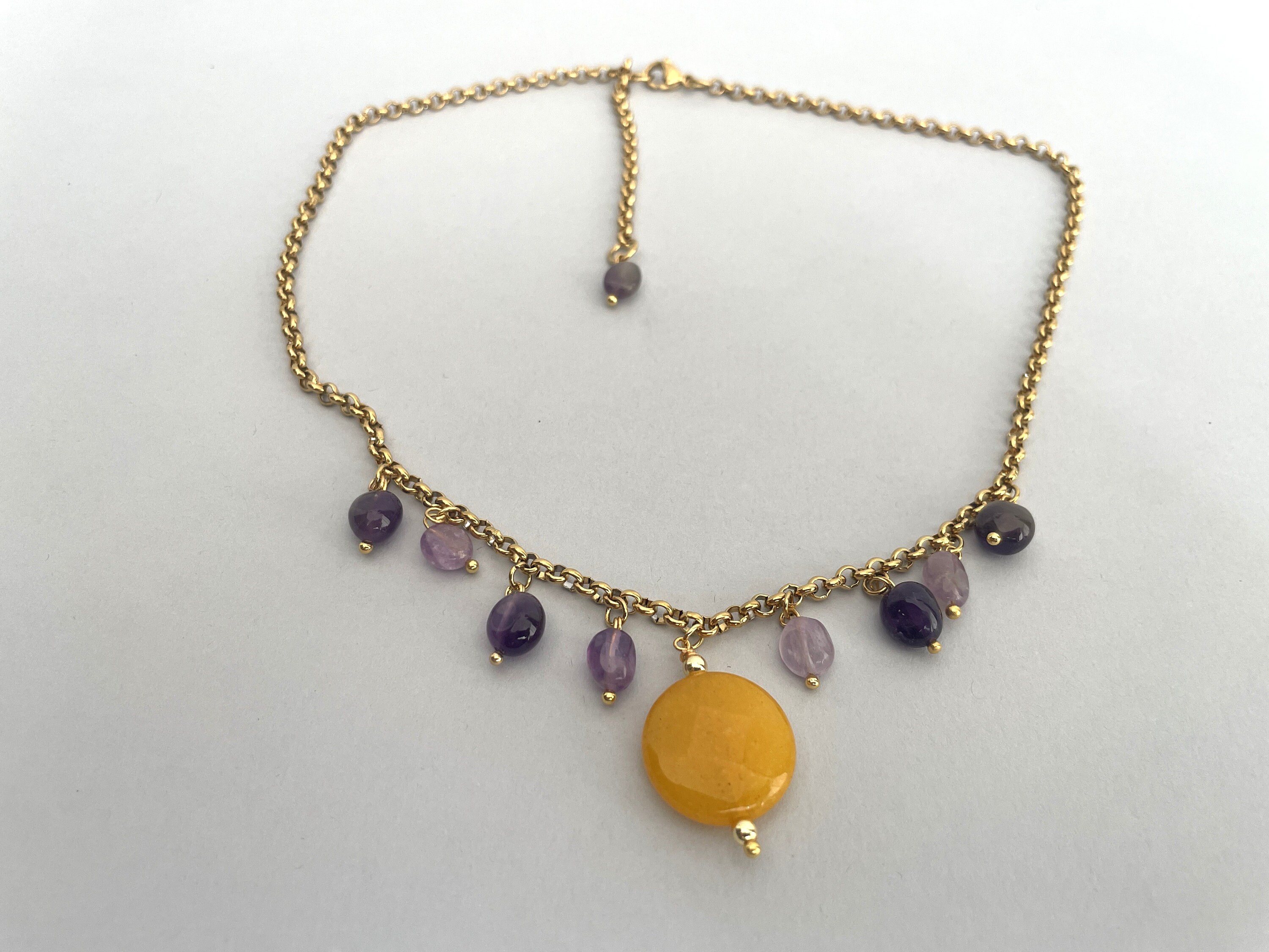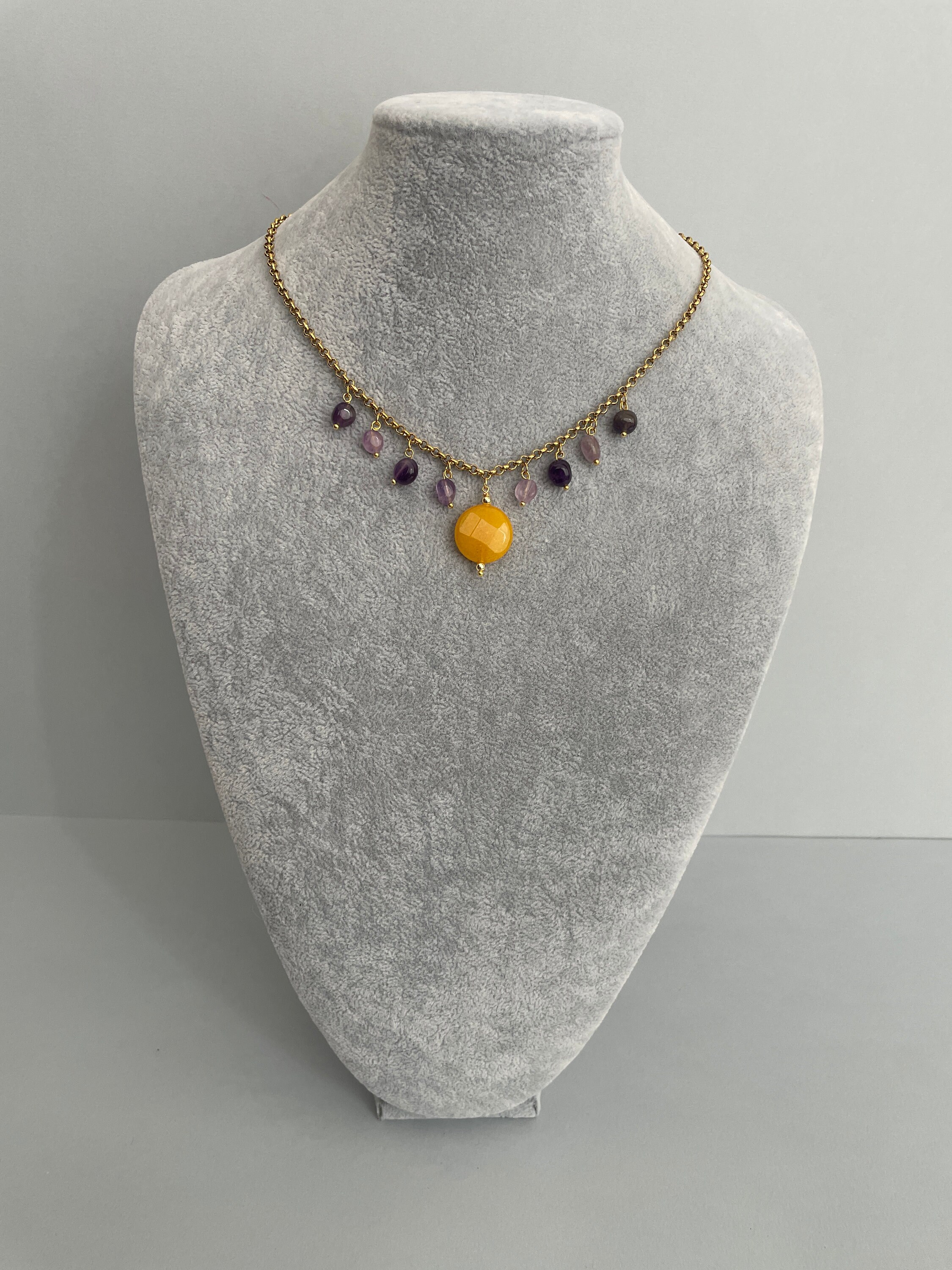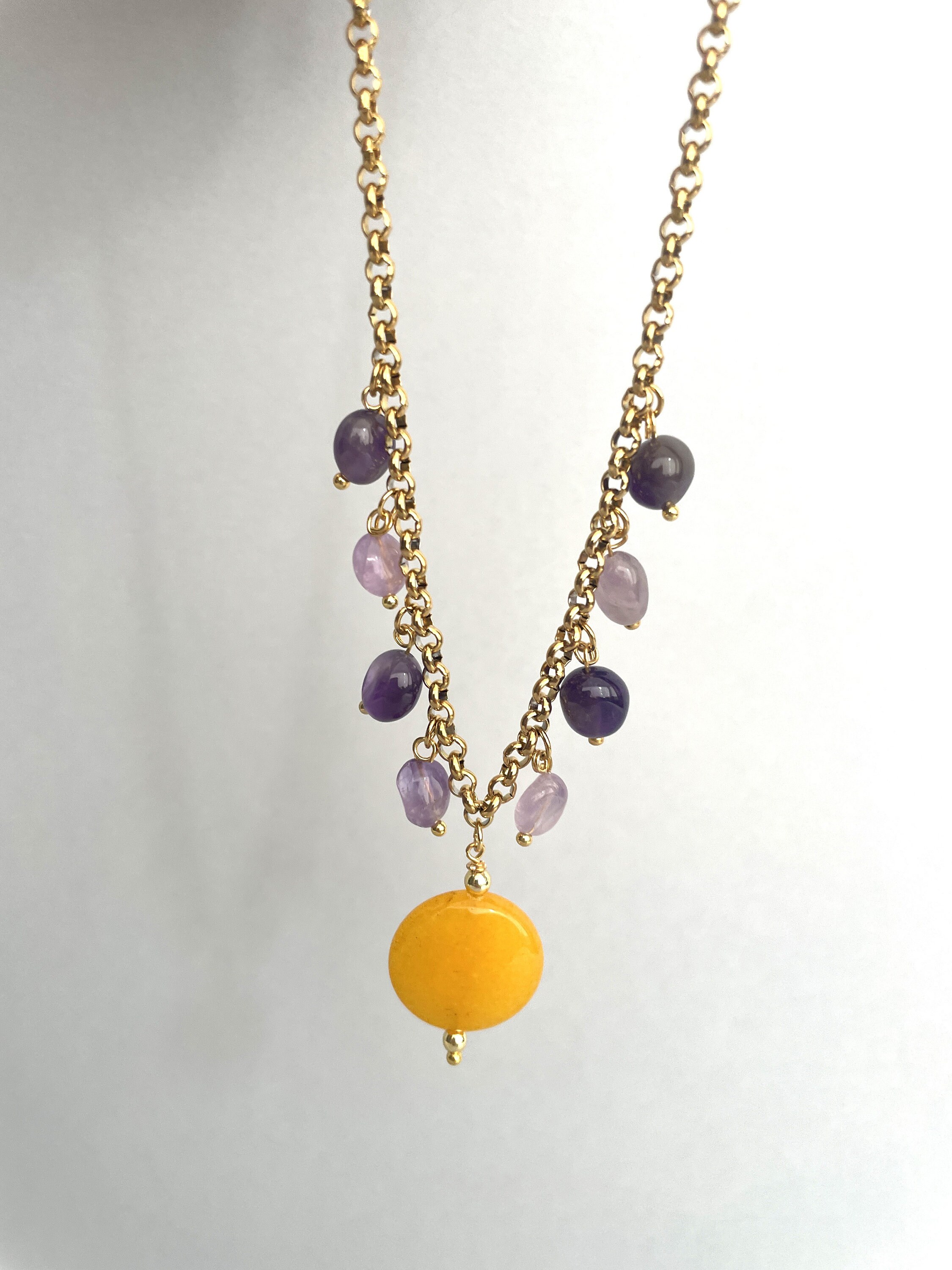 Delicata collana corta con ciondolo centrale costituito da una perla tonda piatta di Agata gialla e altri pendenti con sassi burattati di Ametista.