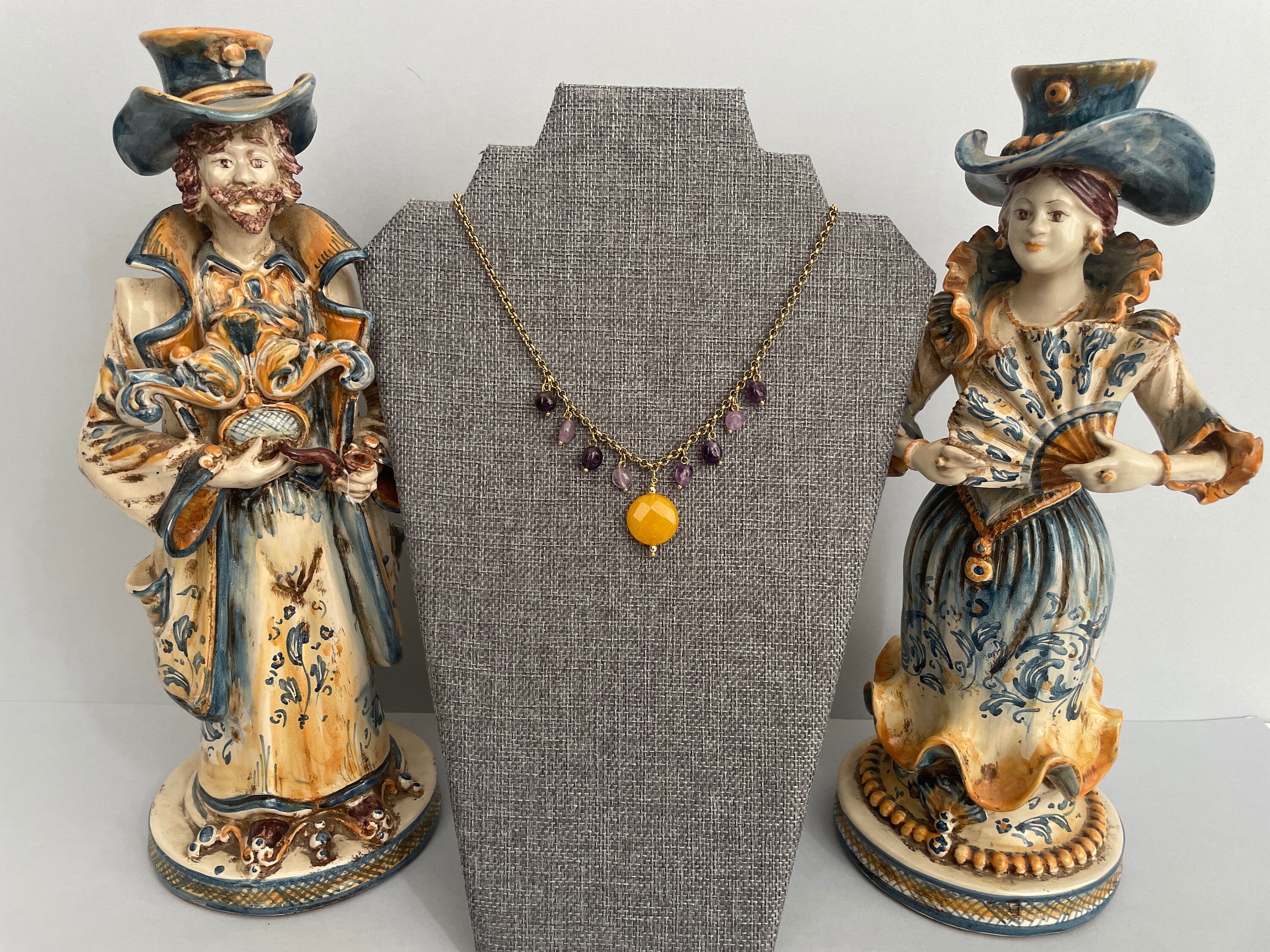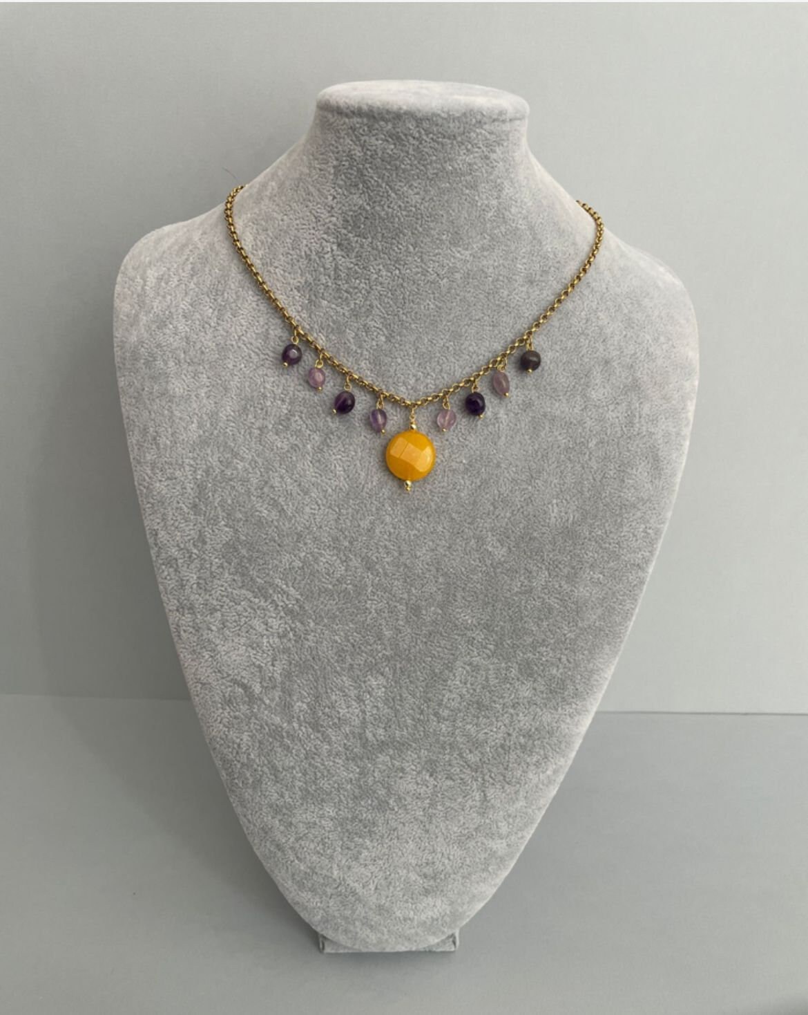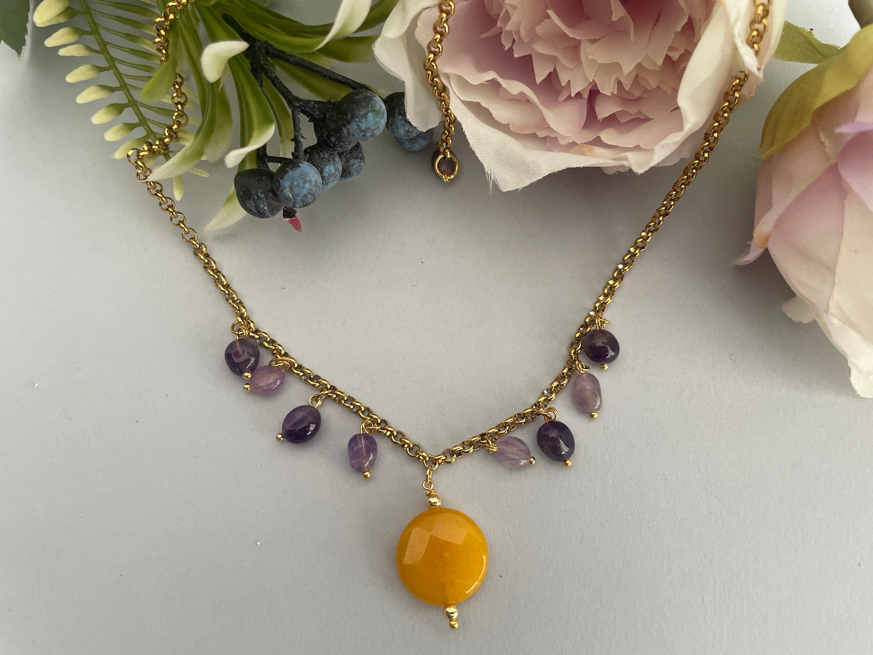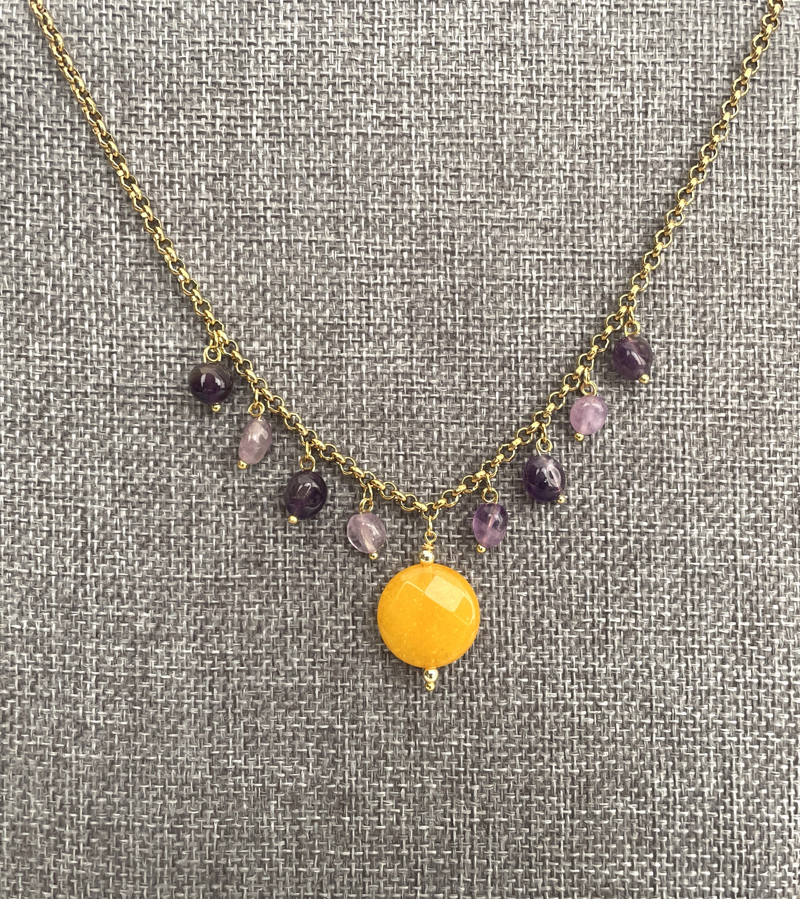 Delicata collana corta con ciondolo centrale costituito da una perla tonda piatta di Agata gialla e altri pendenti con sassi burattati di Ametista.