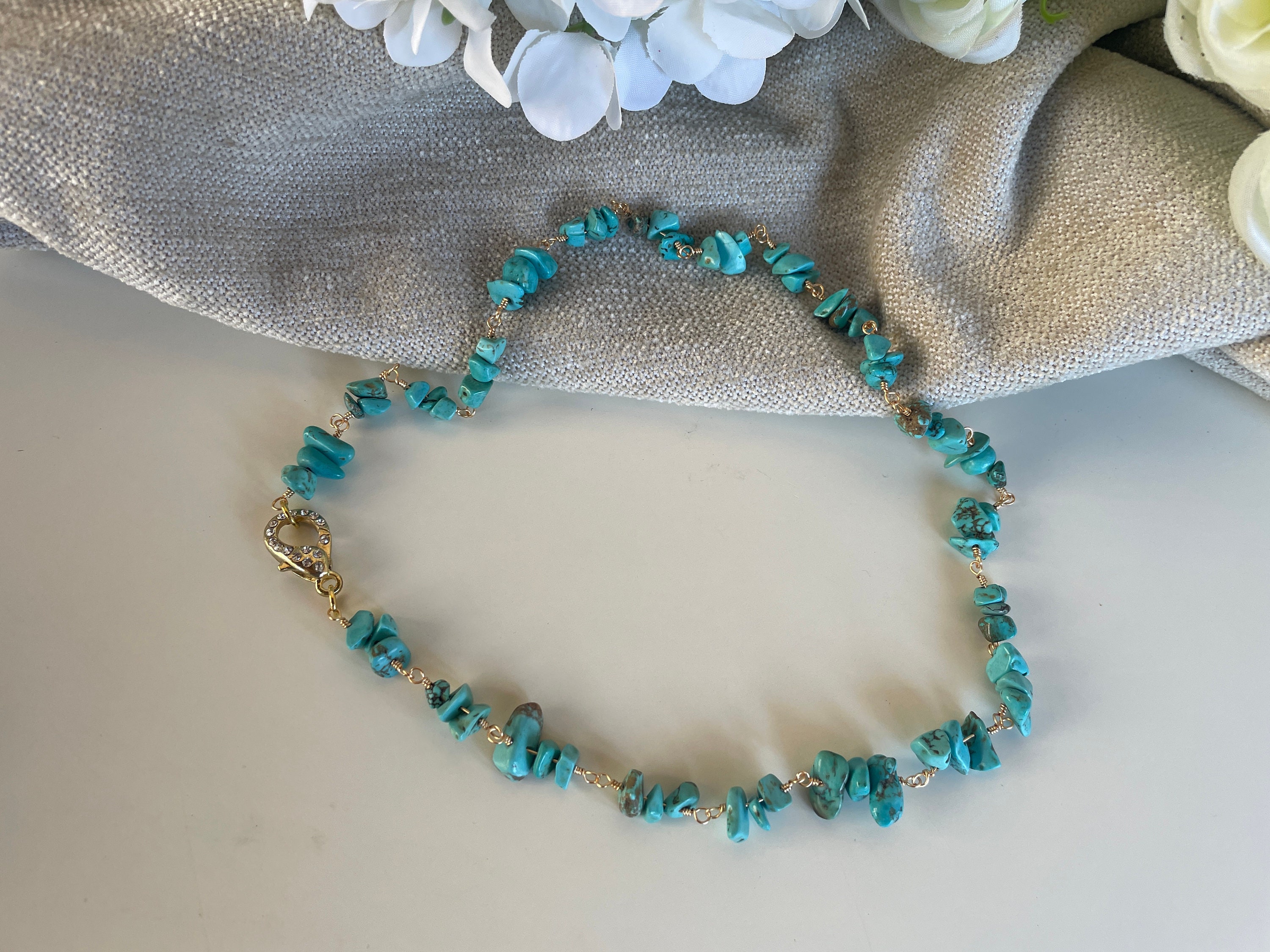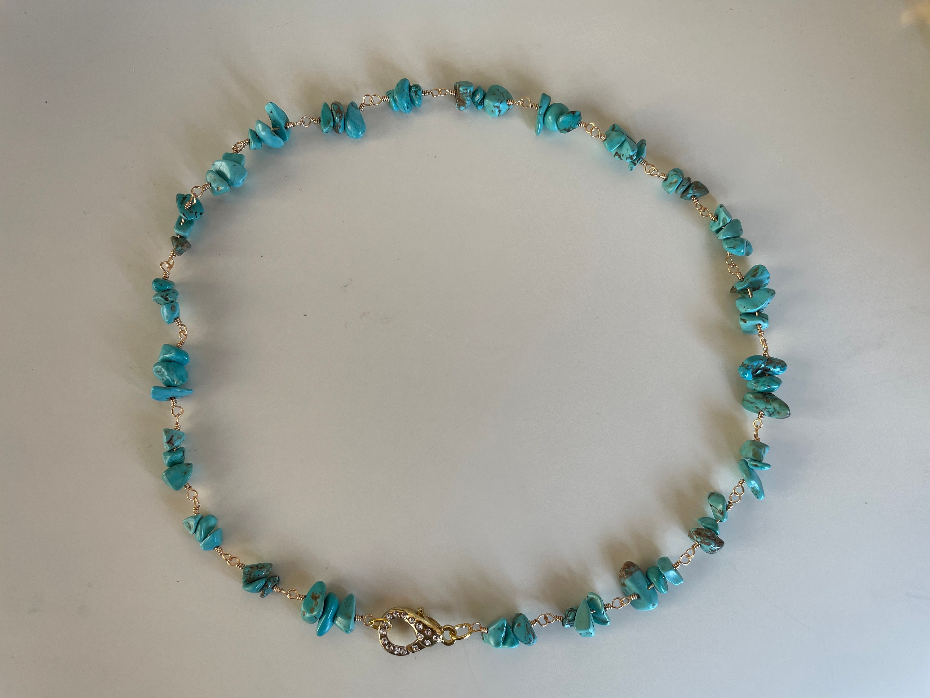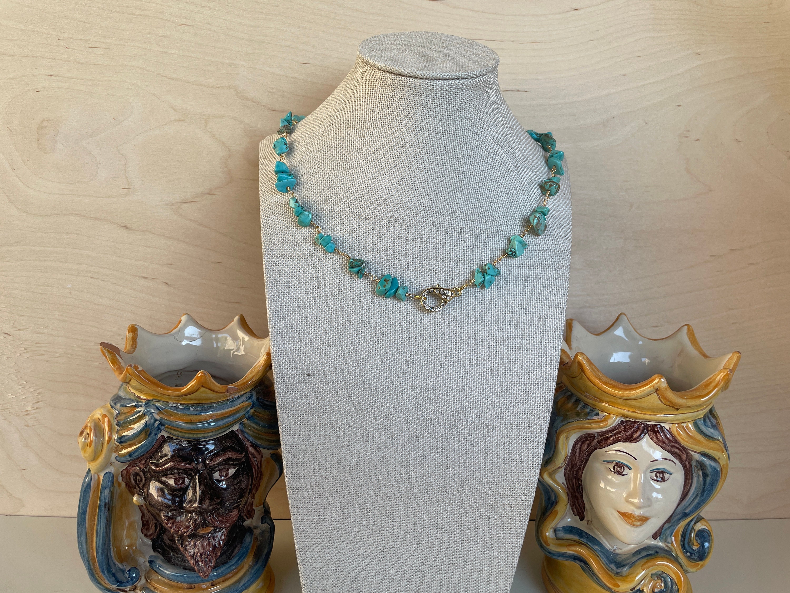 Collana girocollo sobria e dal gusto semplice realizzata con chips di pasta di turchese, legate da un filo di ottone dorato.
