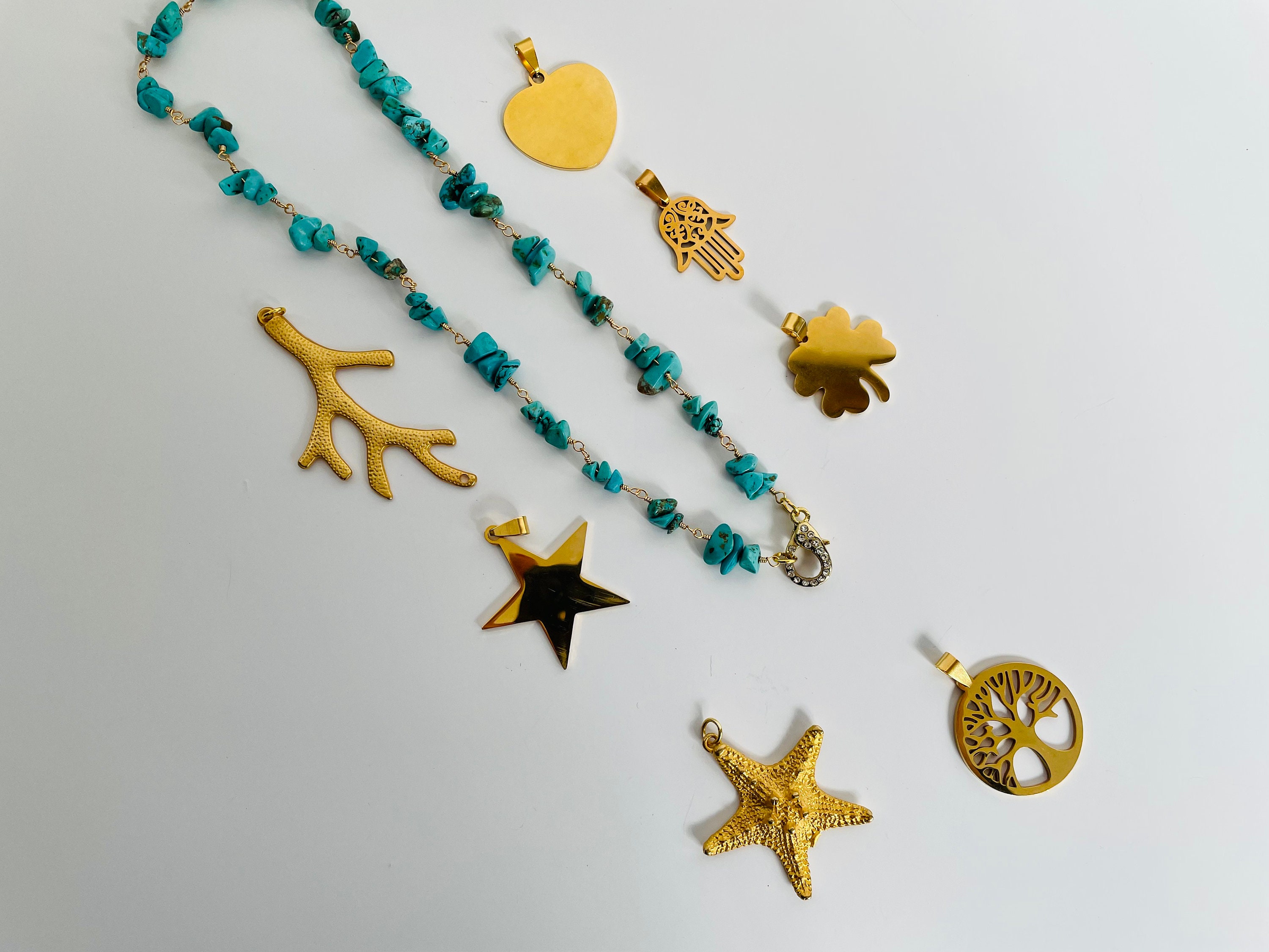 Noi vi proponiamo alcuni ciondoli che sono visibili in foto e tutti, tranne il #D che è in Zama oro, sono di acciaio inossidabile 316L, placcato oro 18k.