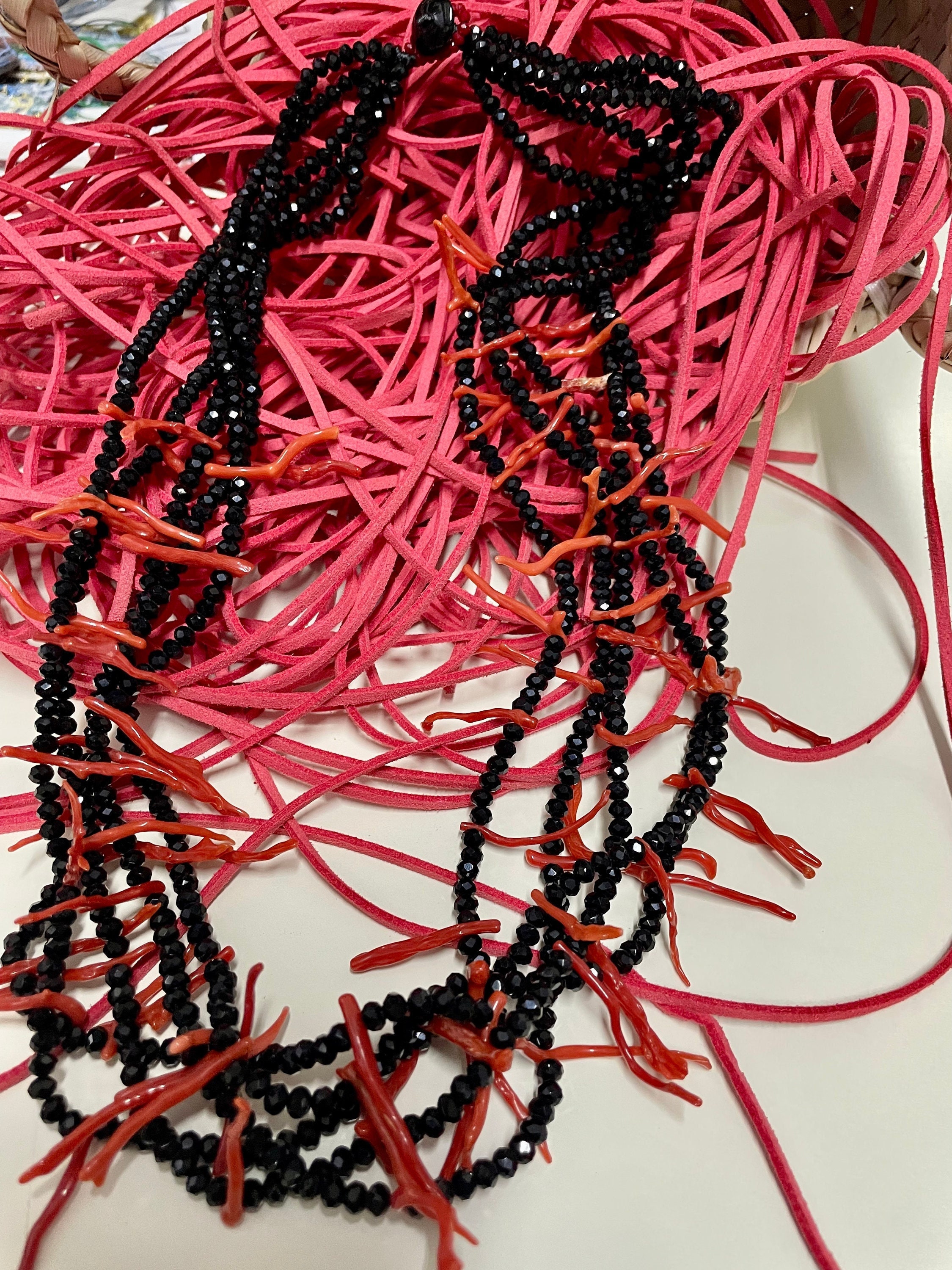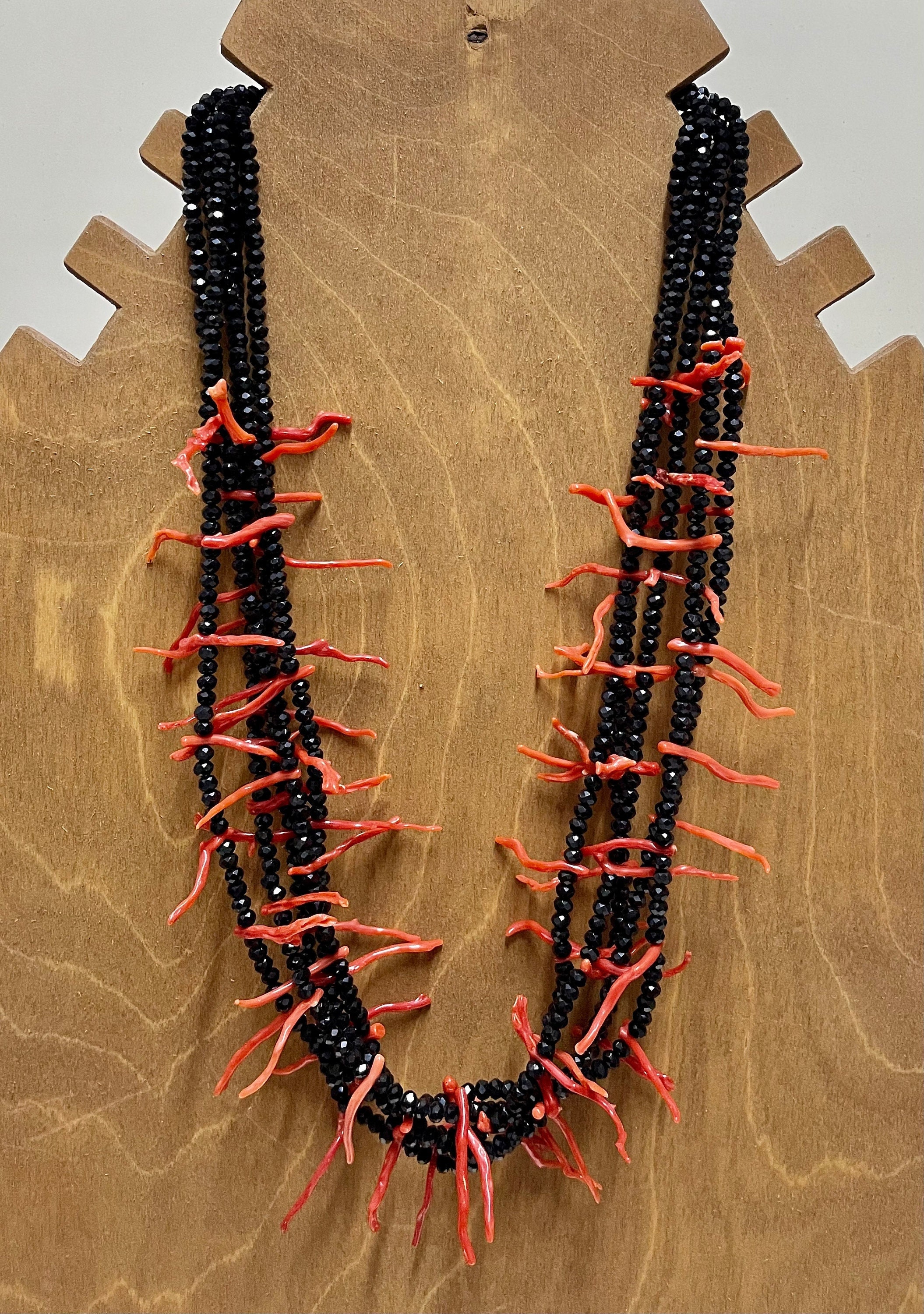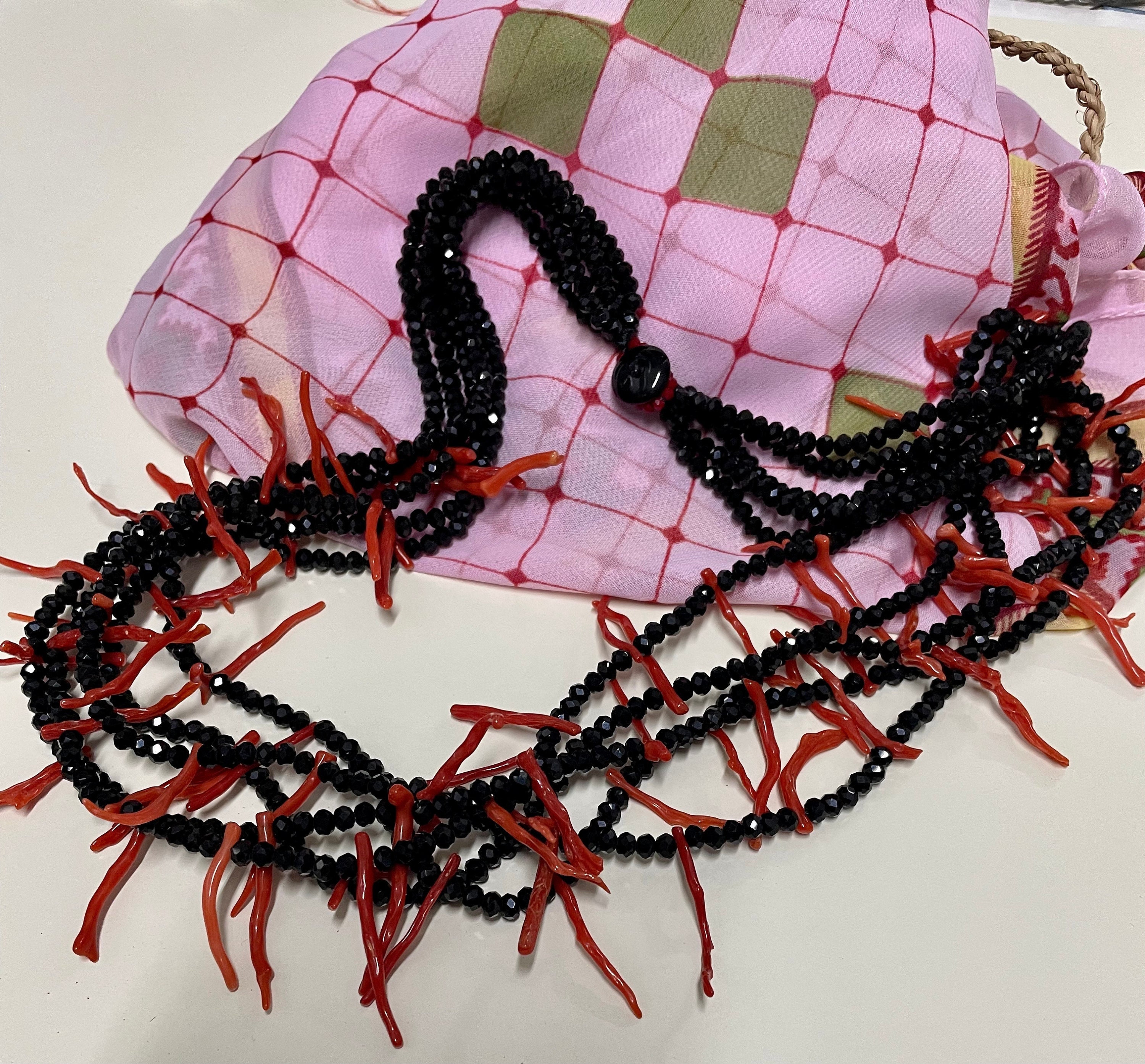 Realizzata con cinque fili di cristalli neri e rami di corallo rosso autentico di Trapani.