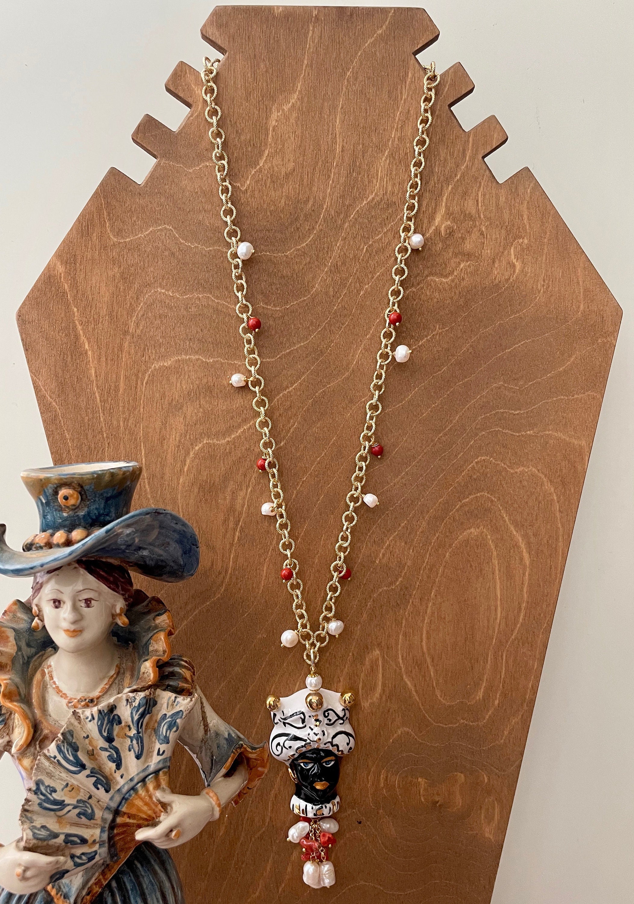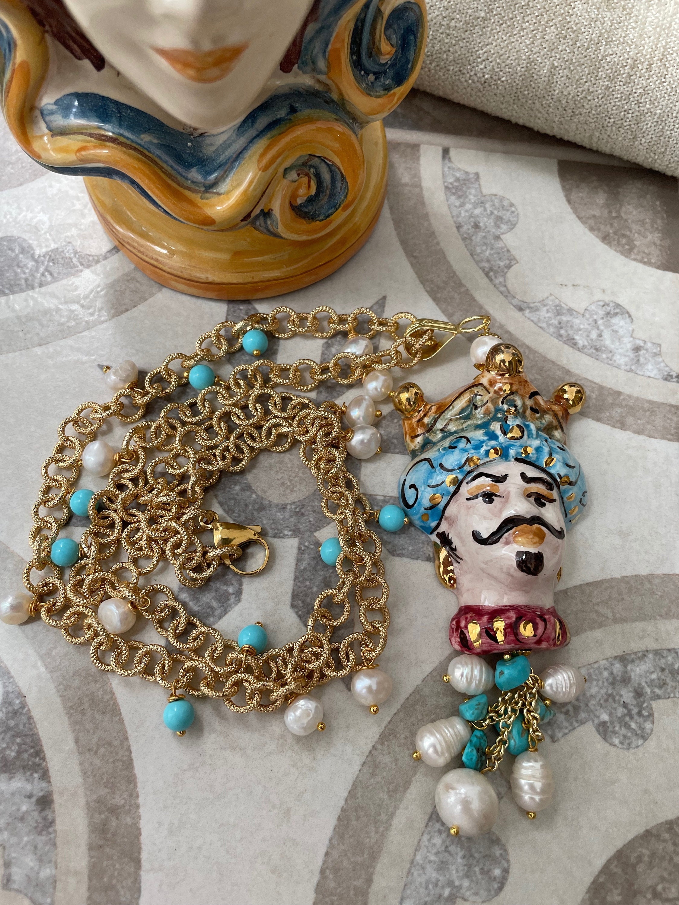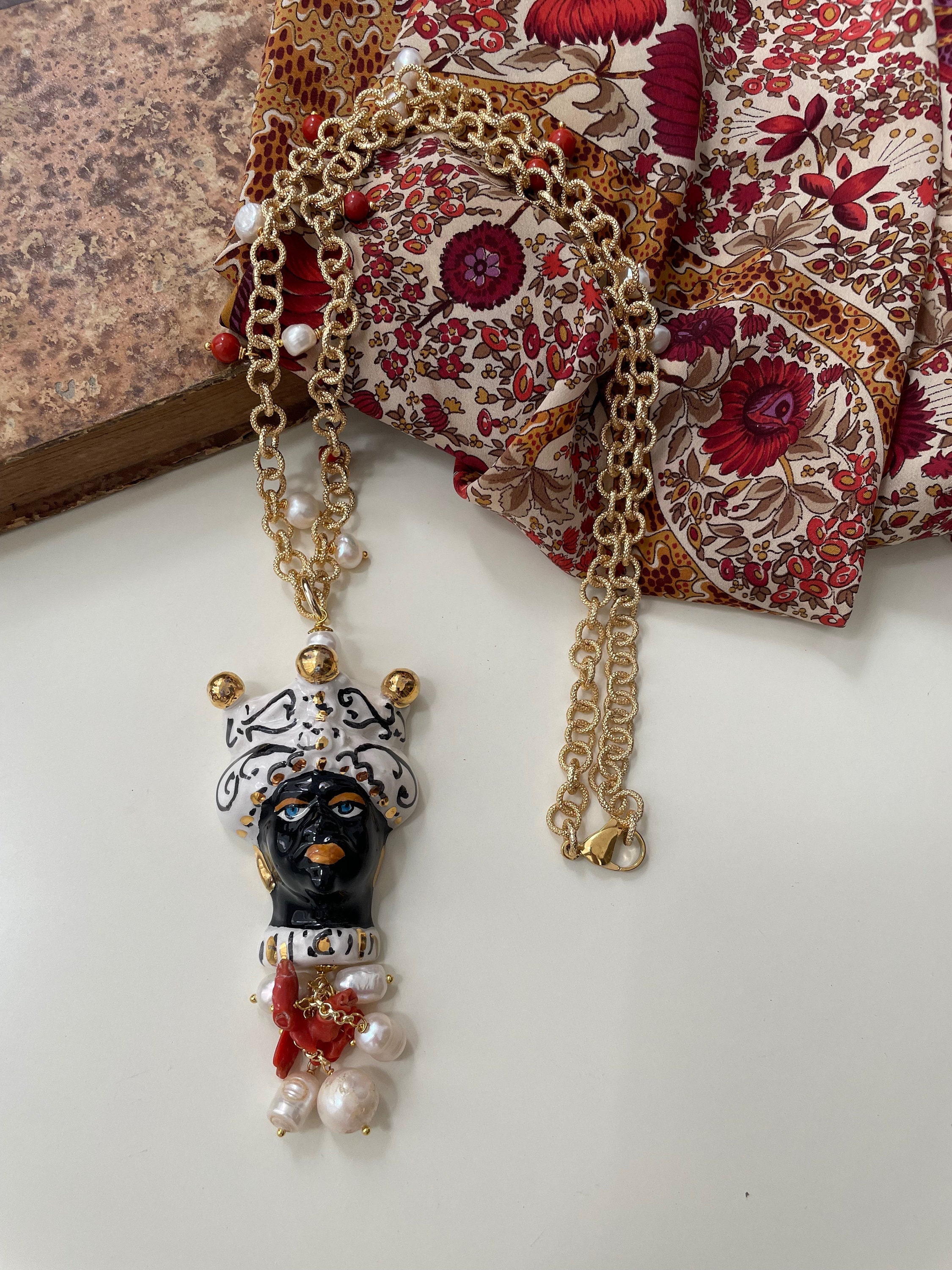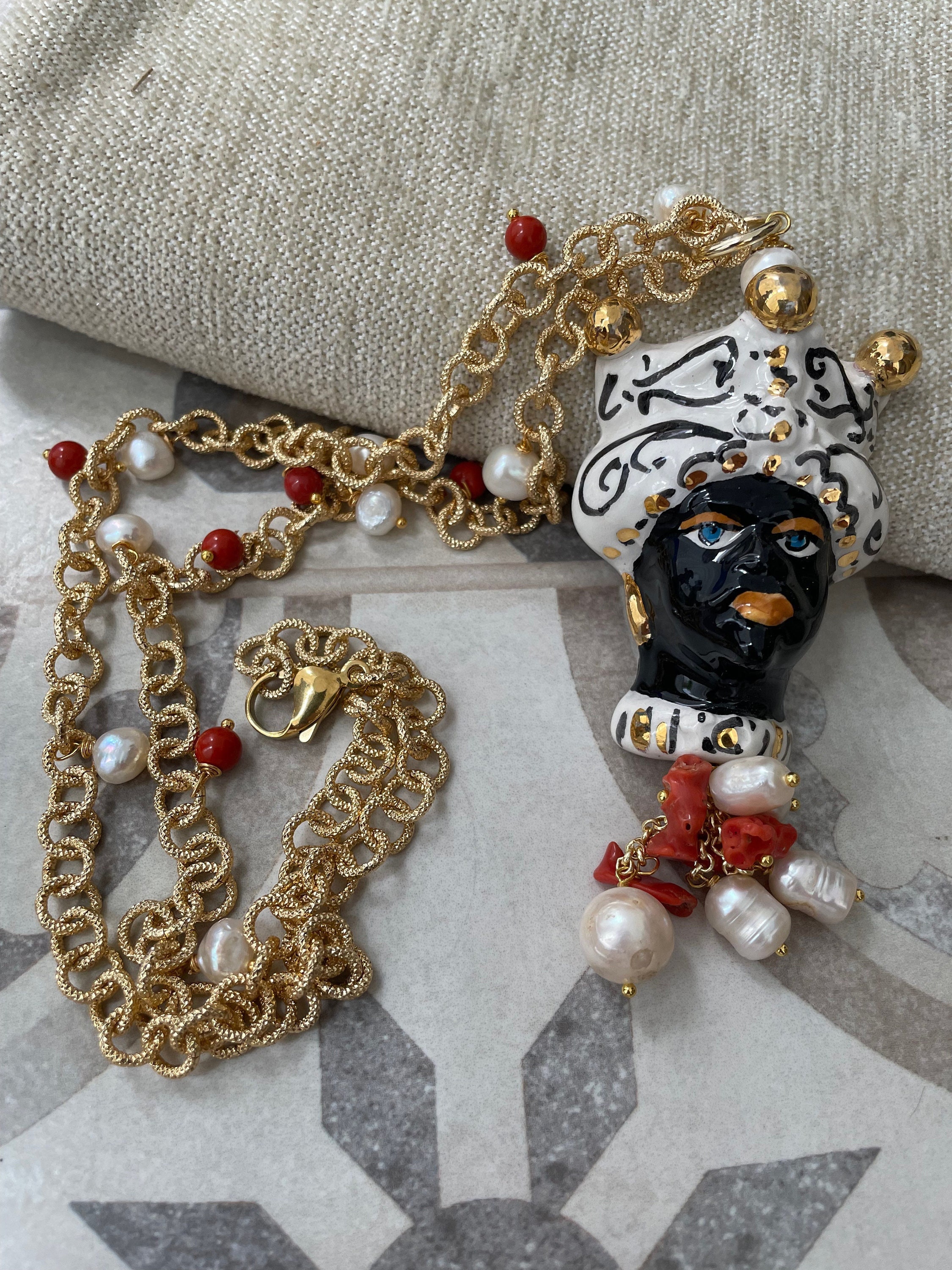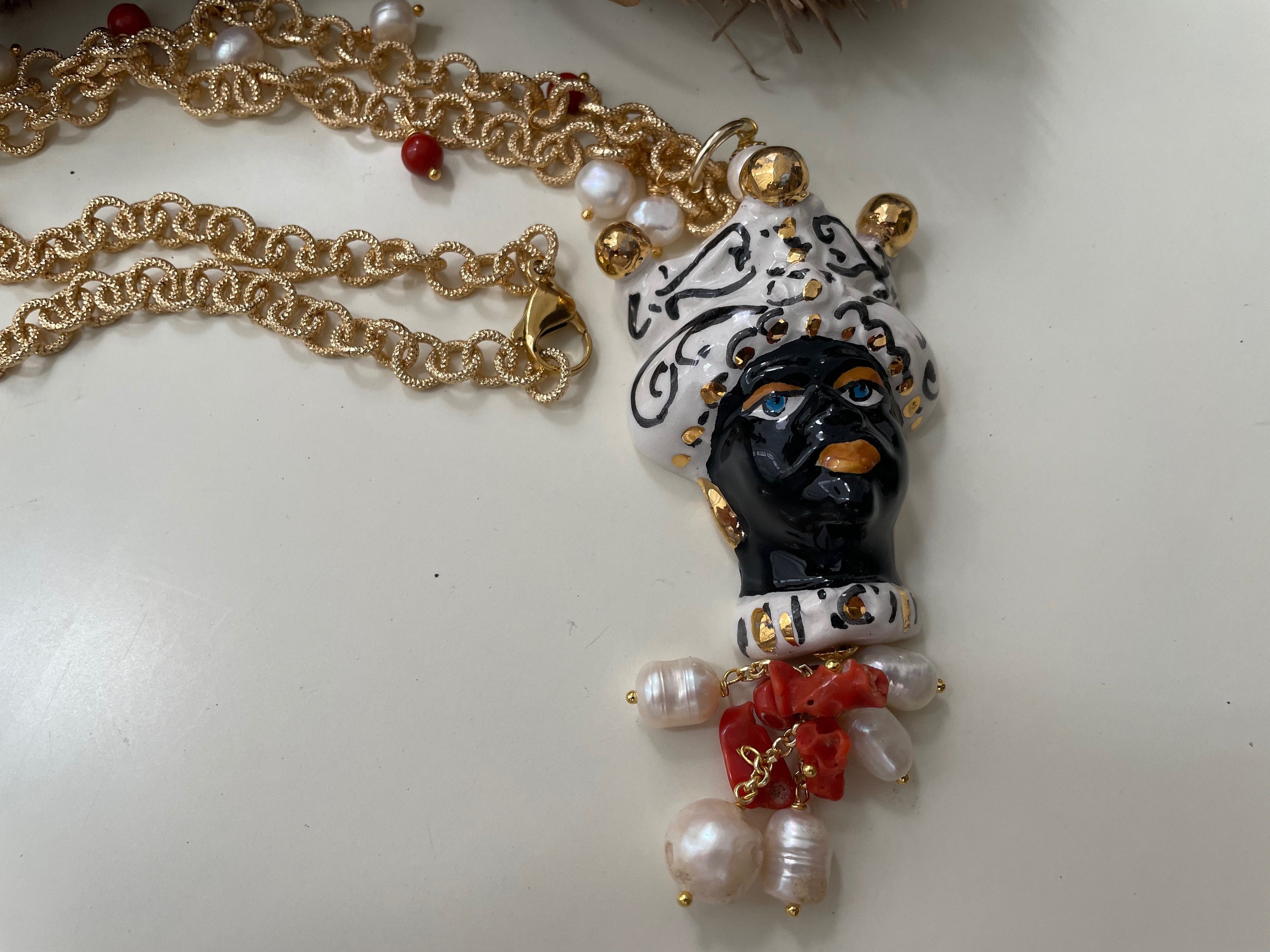 Completa il tutto un ciondolo pendente in ceramica di Caltagirone, dipinto a mano con dettagli in smalto oro zecchino, raffigurante una Testa di moro, simbolo siciliano!