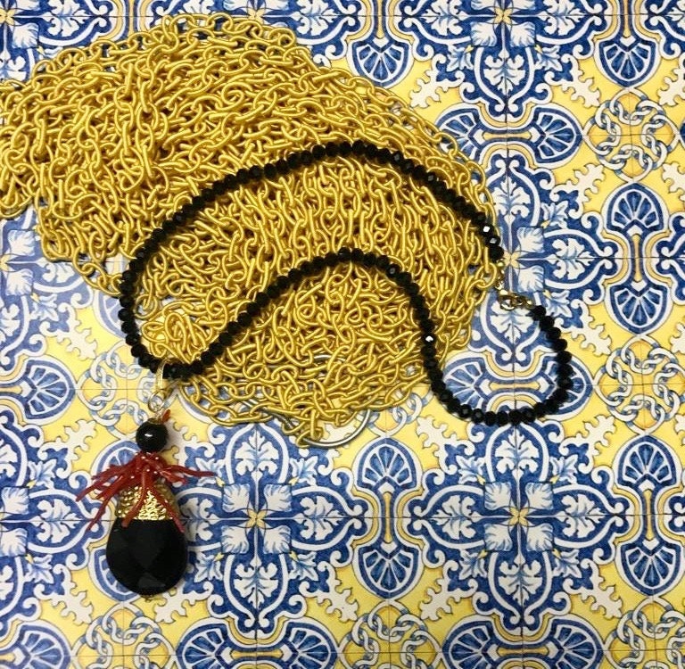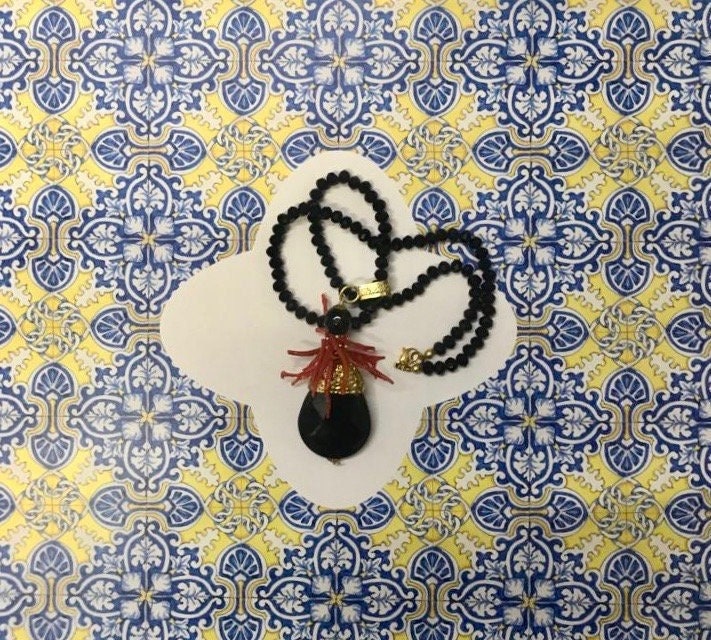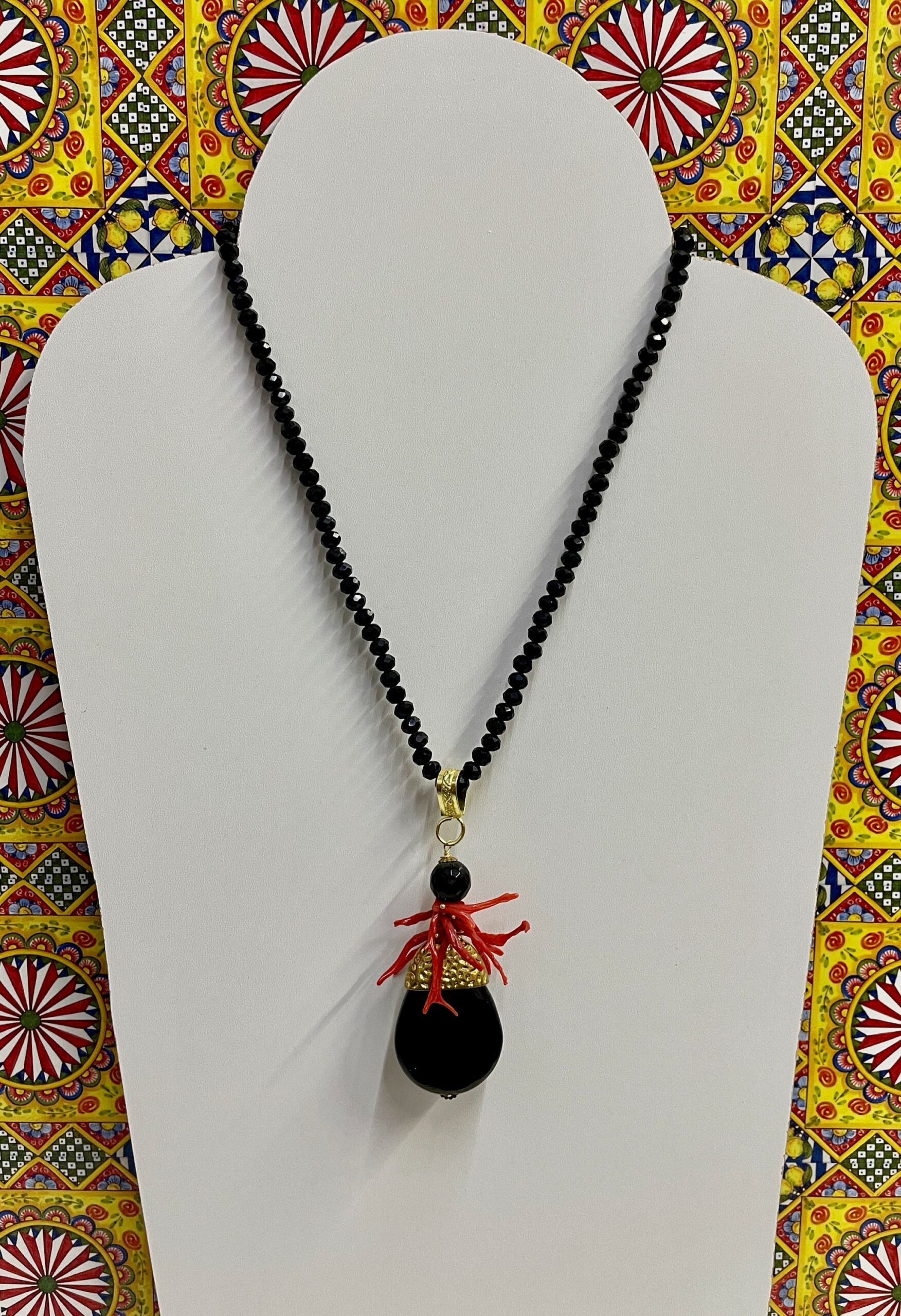 Composta da ciondolo a goccia in onice rivestito, nella parte superiore, da piastra di ottone battuto e rami di corallo rosso autentico di Trapani.