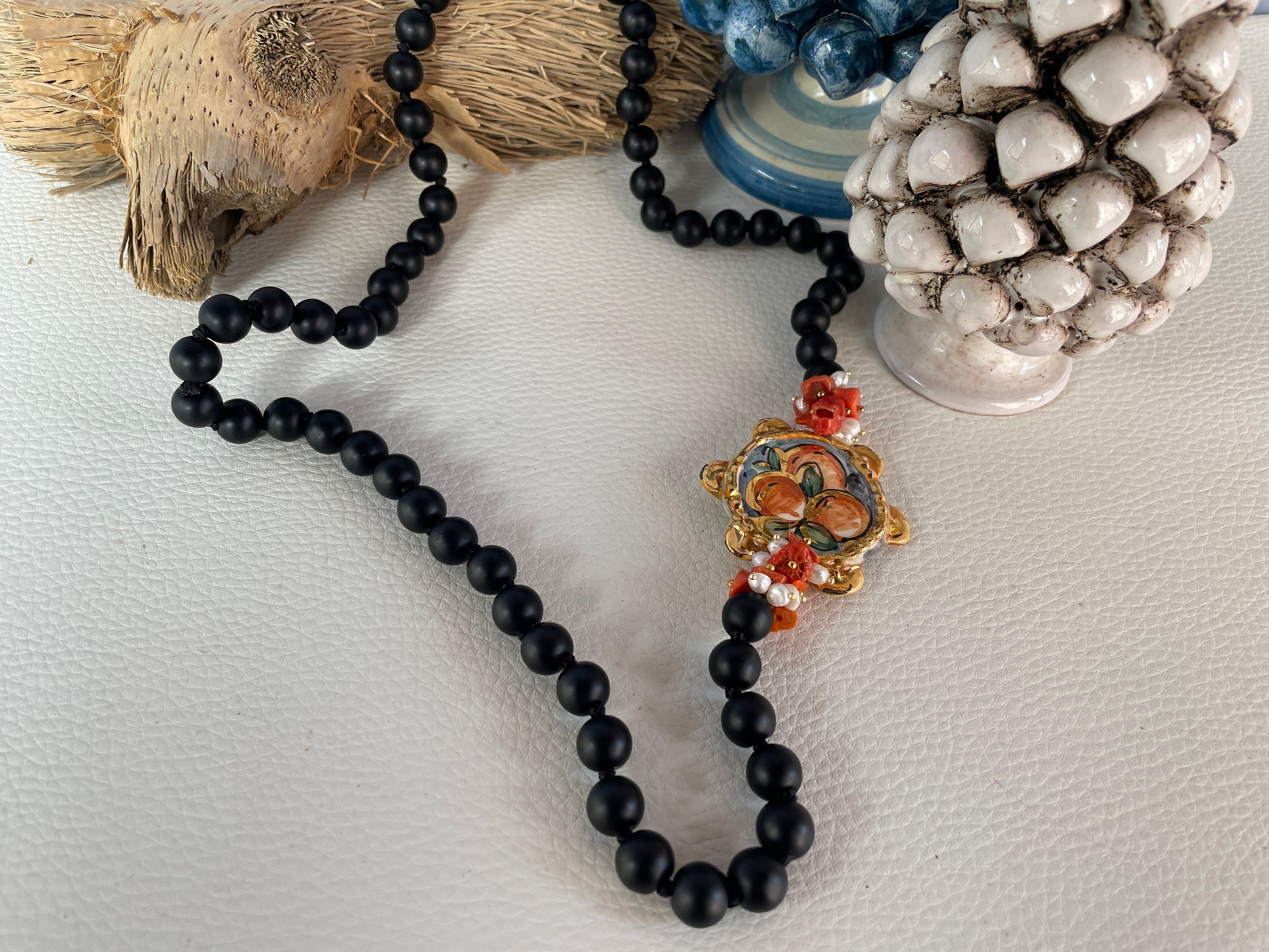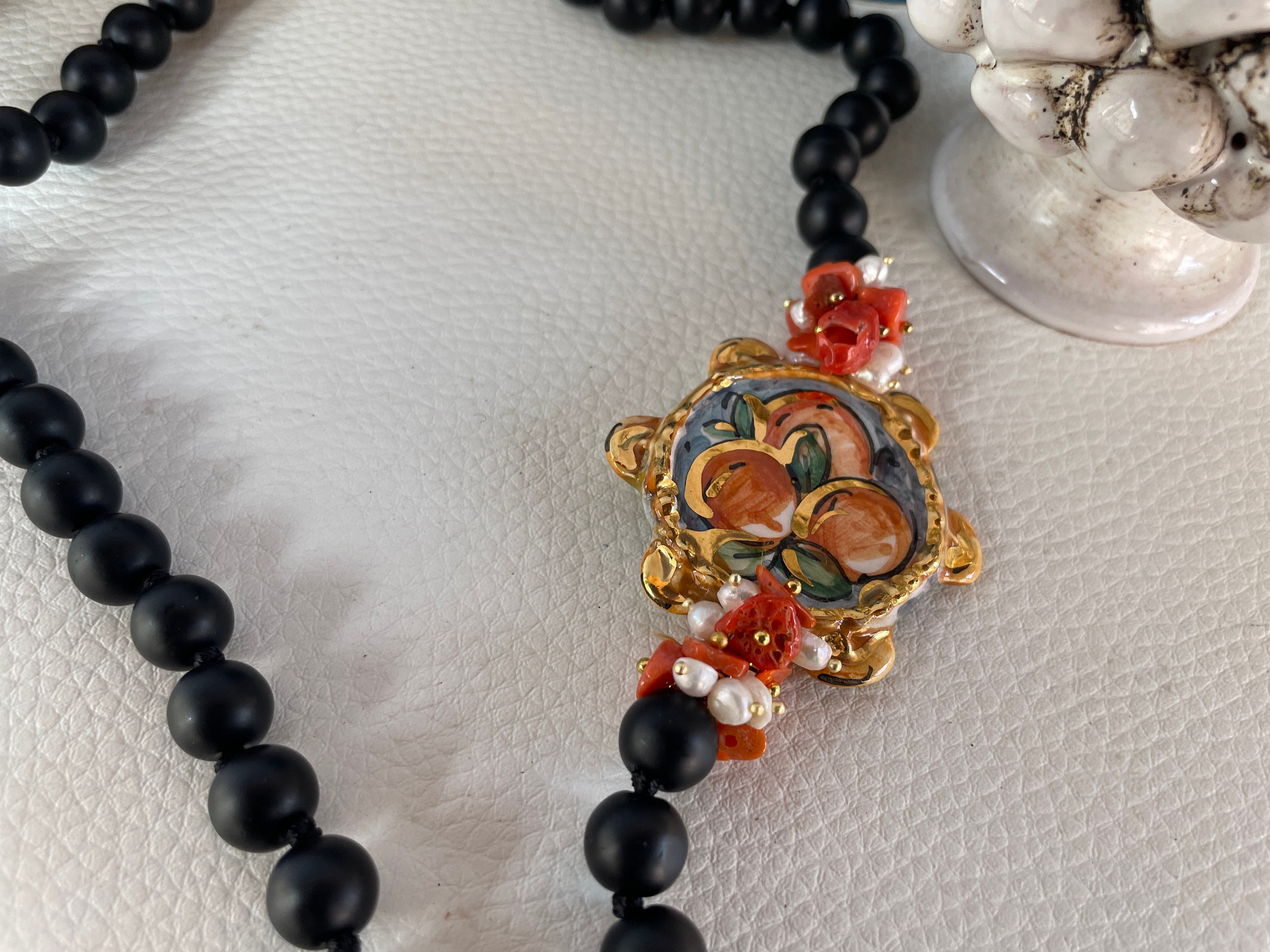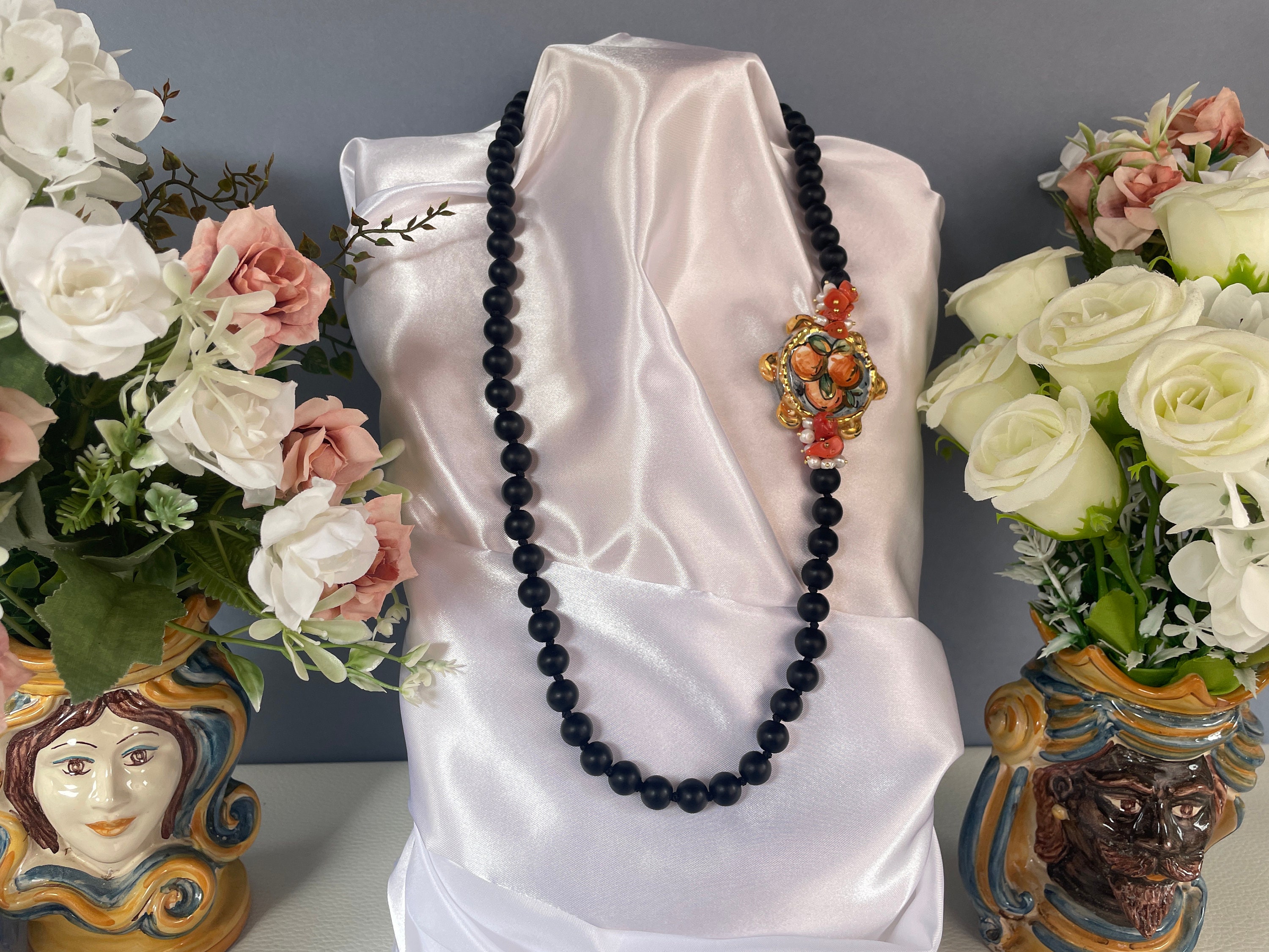 Infatti è realizzata con filo di perle di lava dell’Etna, tutte singolarmente annodate, e un bel connettore grande di ceramica di Caltagirone, dipinto a mano, che raffigura il tipico Tamburello della tradizione siciliana. Il Tamburello è impreziosito da grappoli di perle di fiume e pezzi di Corallo autentico del Mediterraneo.