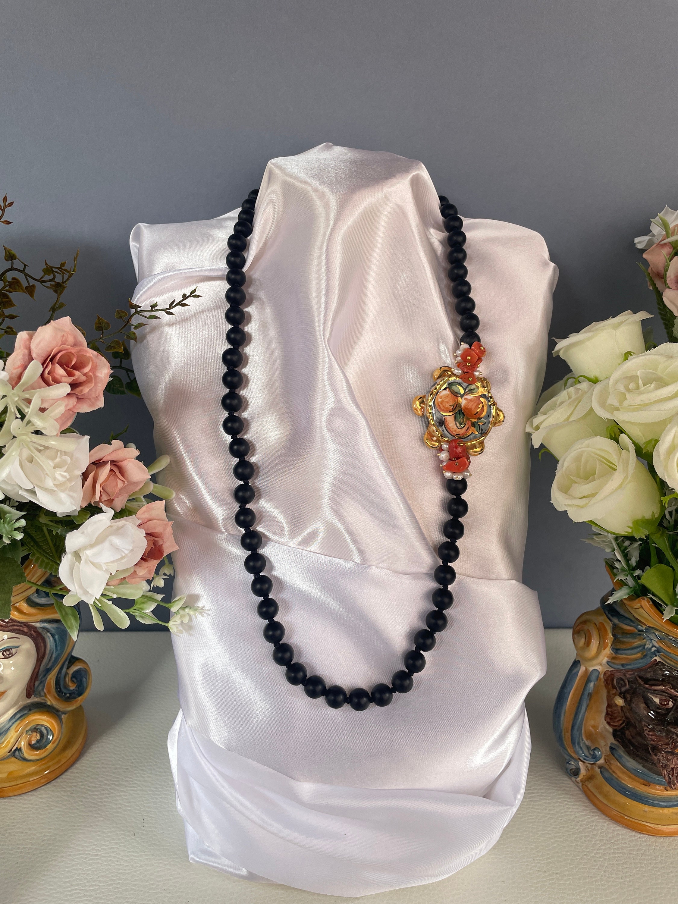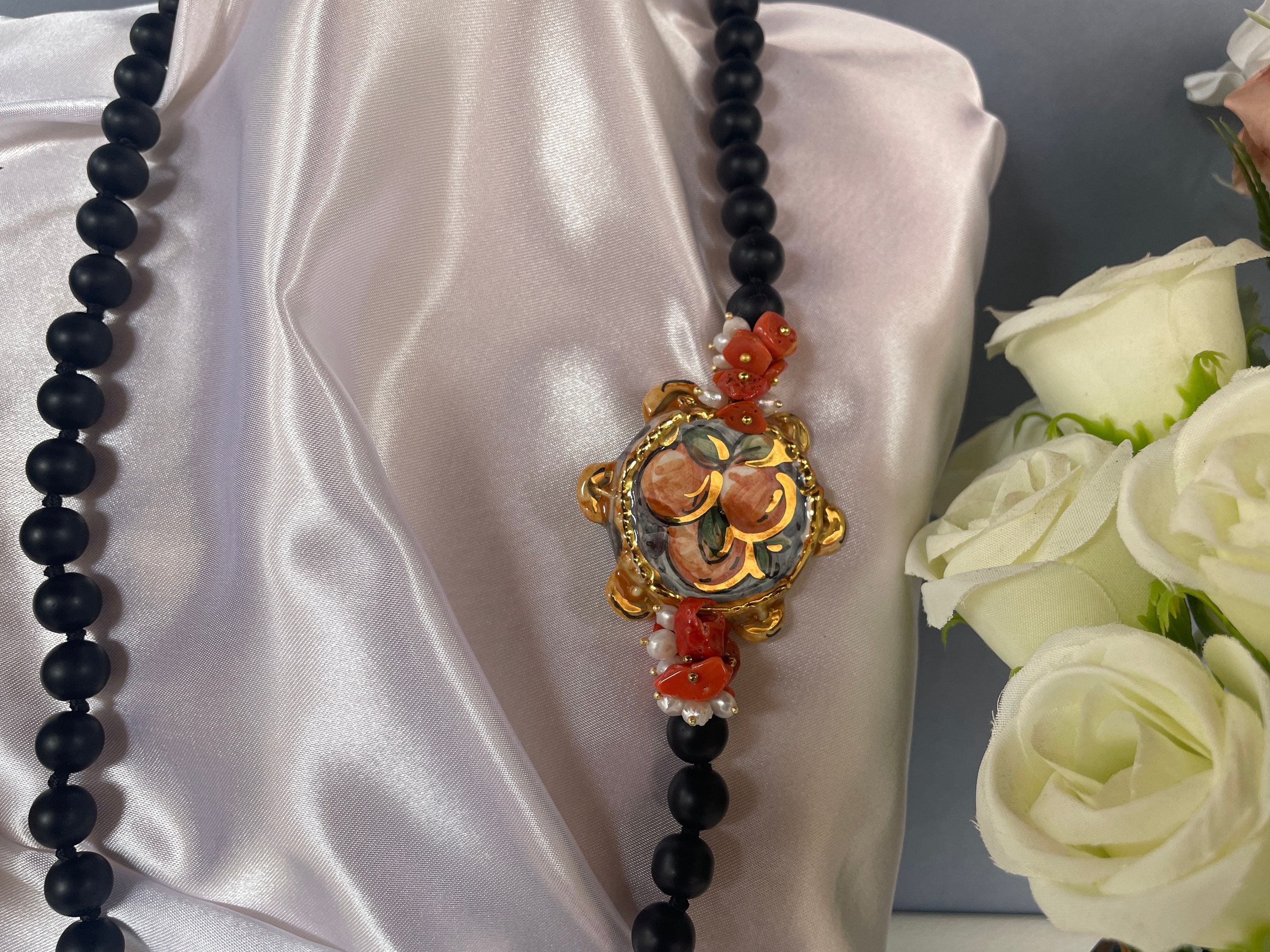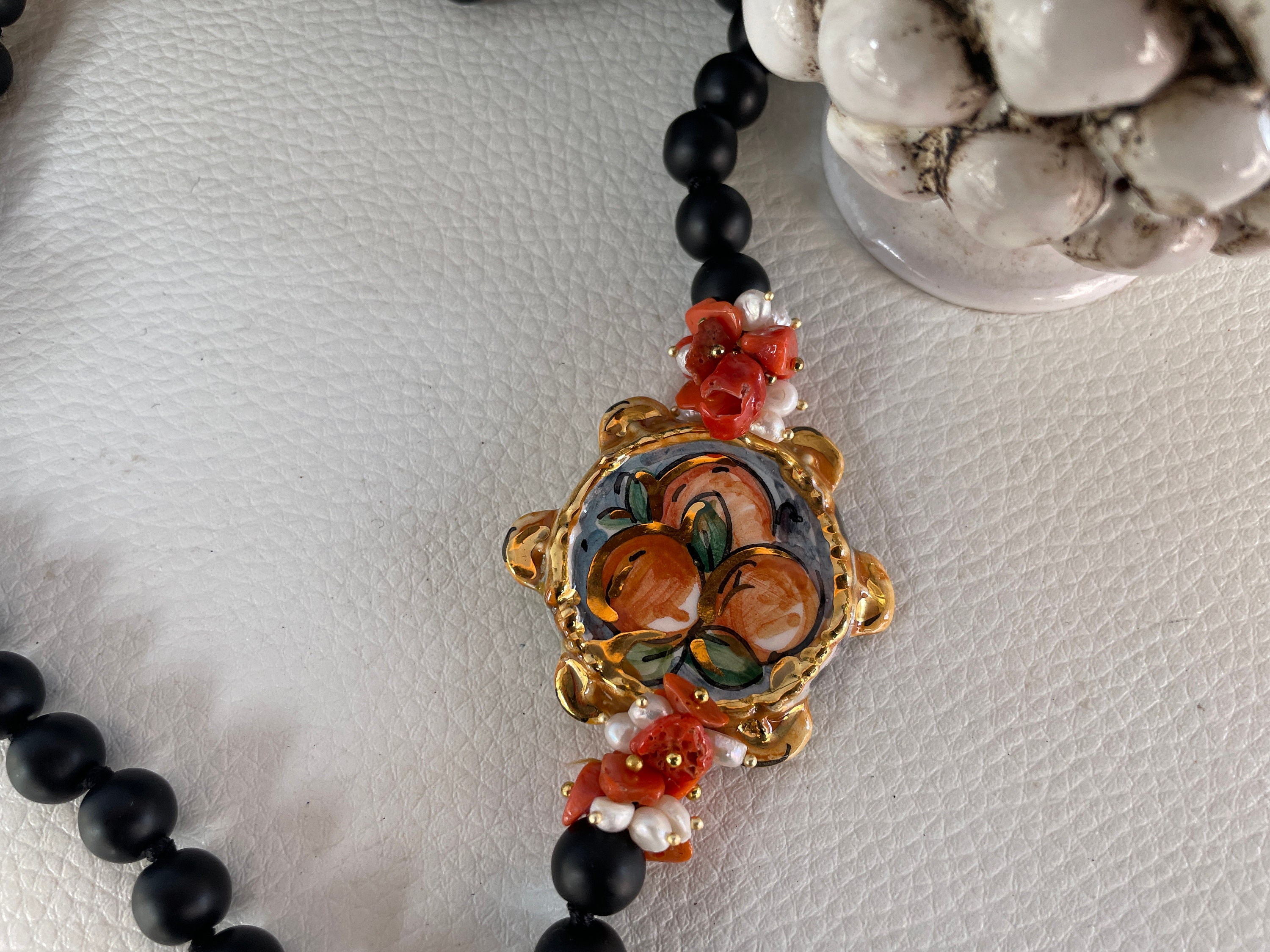 Infatti è realizzata con filo di perle di lava dell’Etna, tutte singolarmente annodate, e un bel connettore grande di ceramica di Caltagirone, dipinto a mano, che raffigura il tipico Tamburello della tradizione siciliana. Il Tamburello è impreziosito da grappoli di perle di fiume e pezzi di Corallo autentico del Mediterraneo.