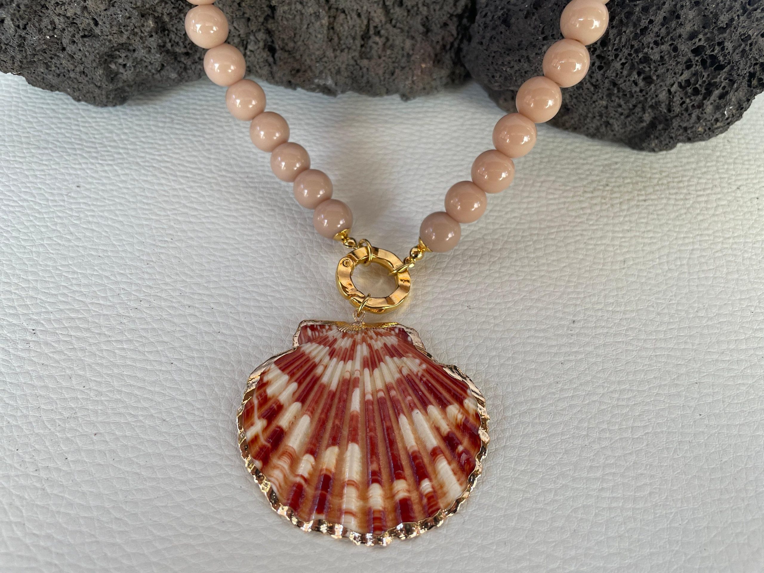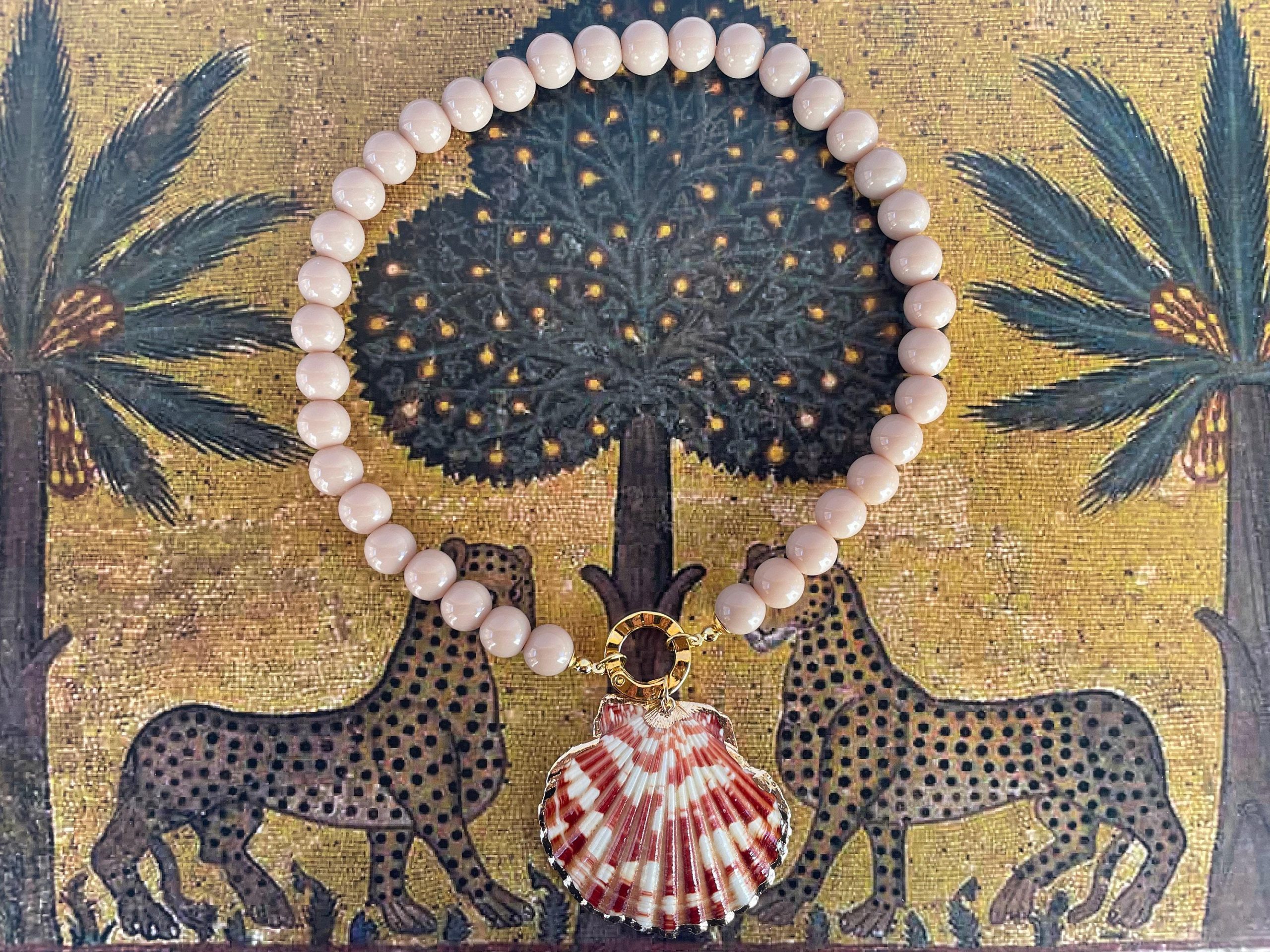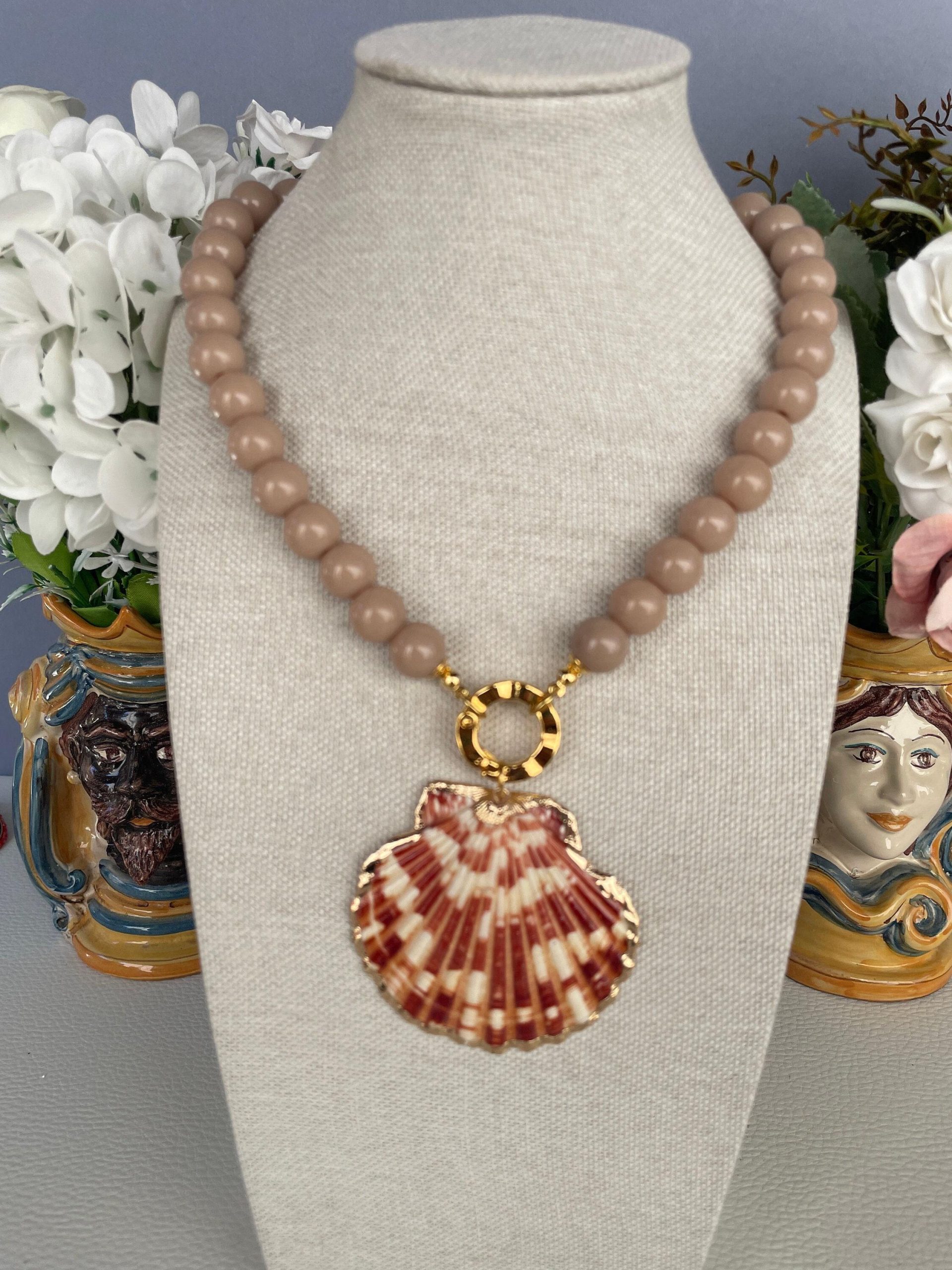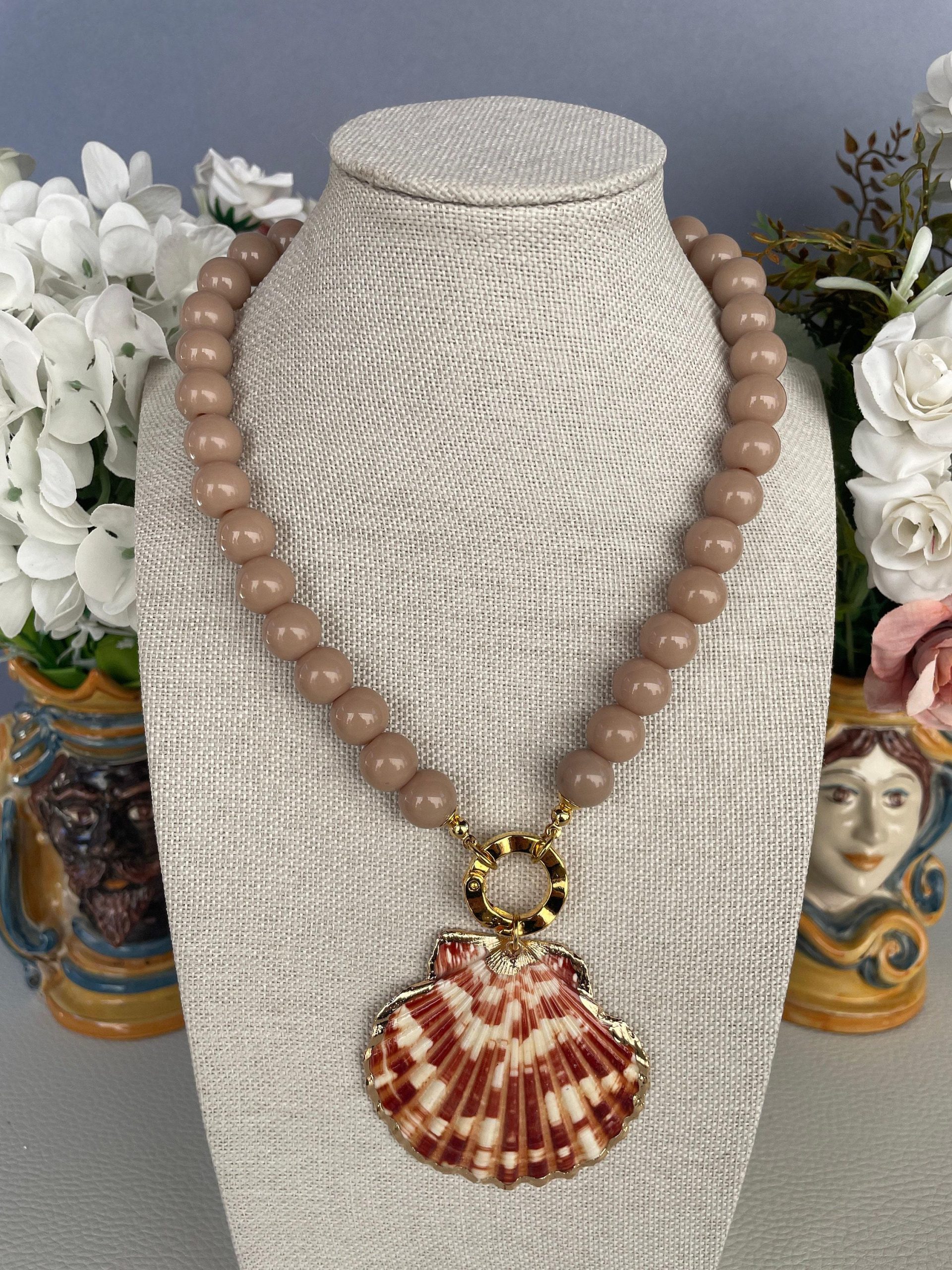 Dalla chiusura tonda pende una grande conchiglia naturale contornata da smalto oro.