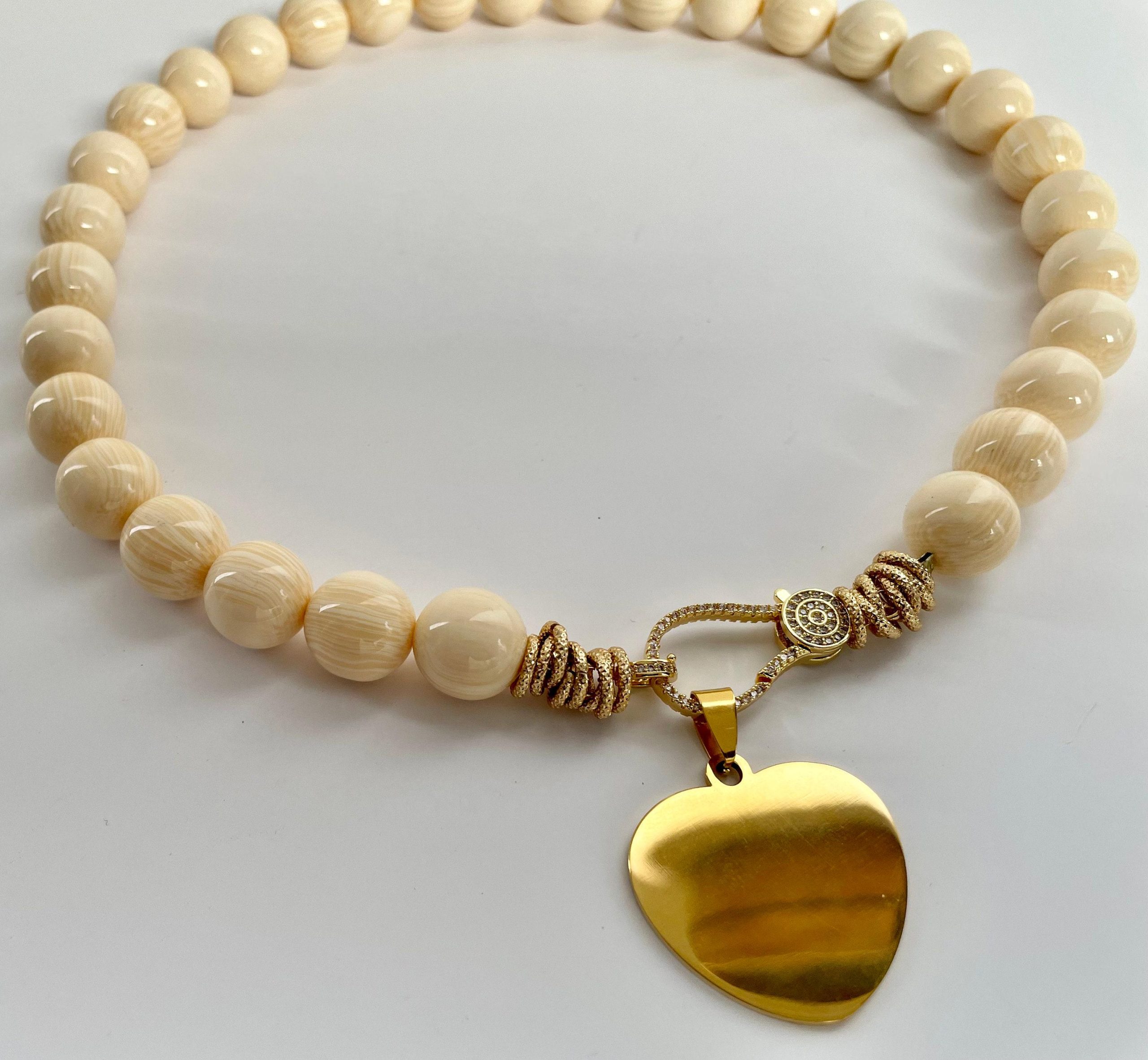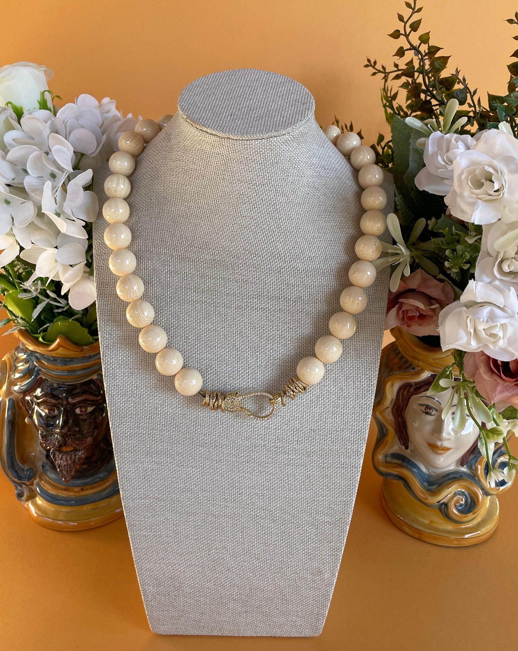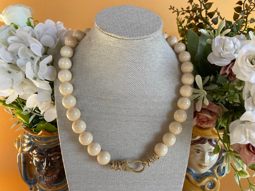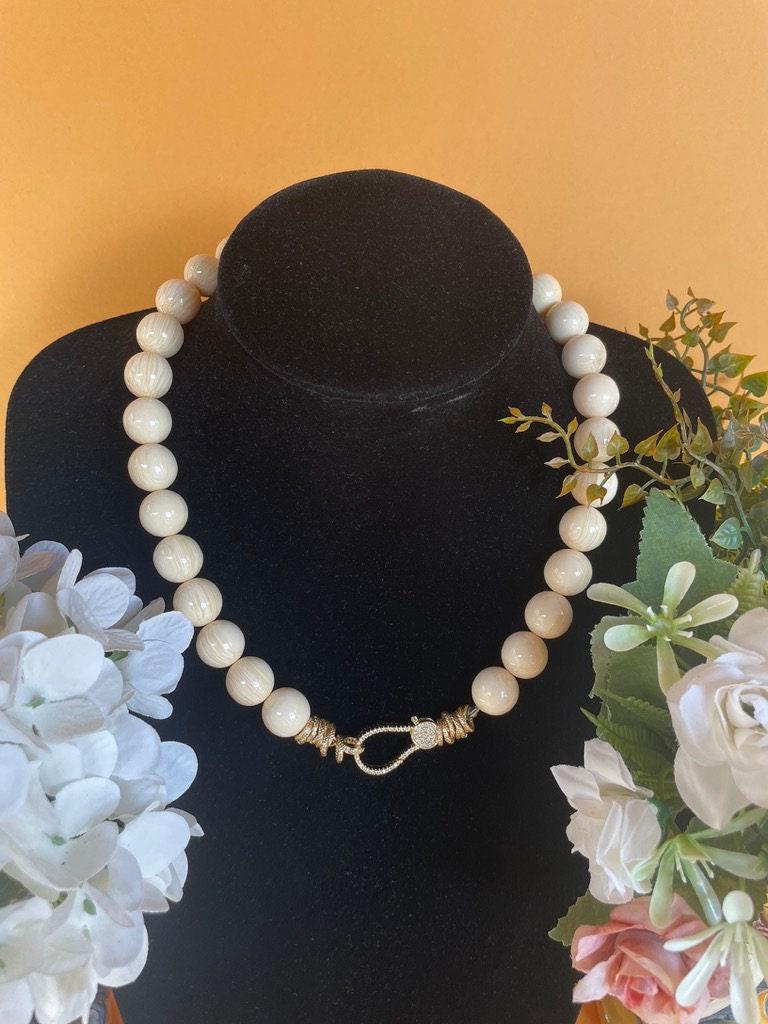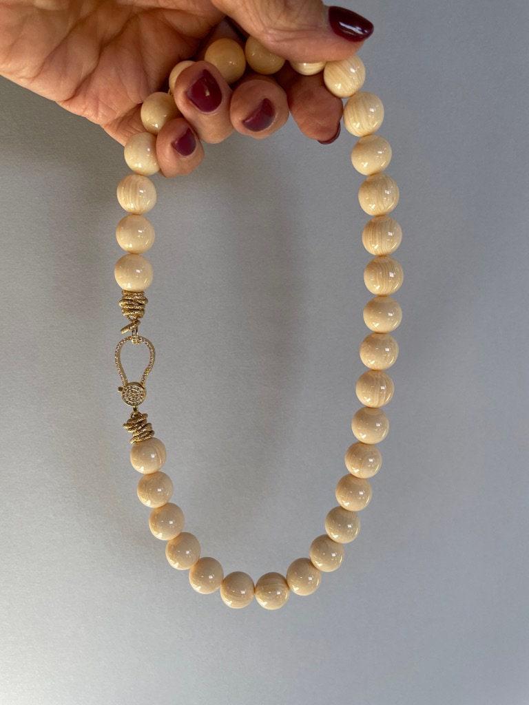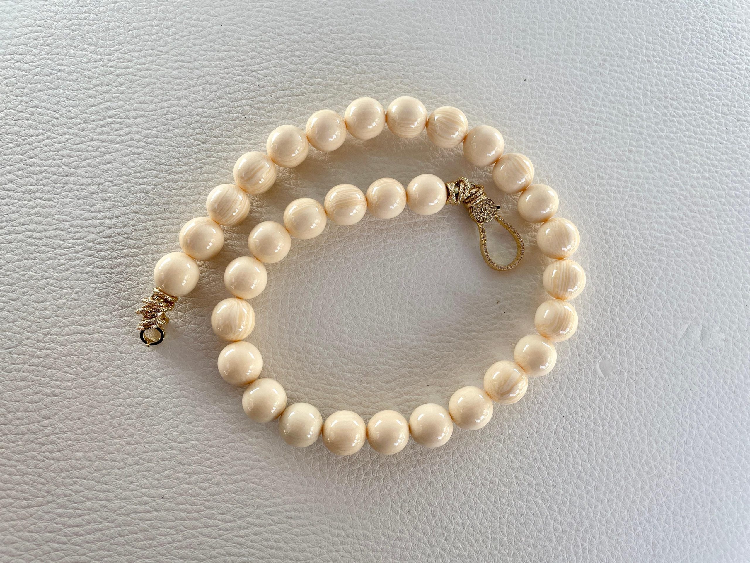 Collana con boules da 14 mm in resina italiana di alta qualità colore osso con una splendida chiusura a moschettone in acciaio inossidabile placcato oro e rivestita di zirconi!