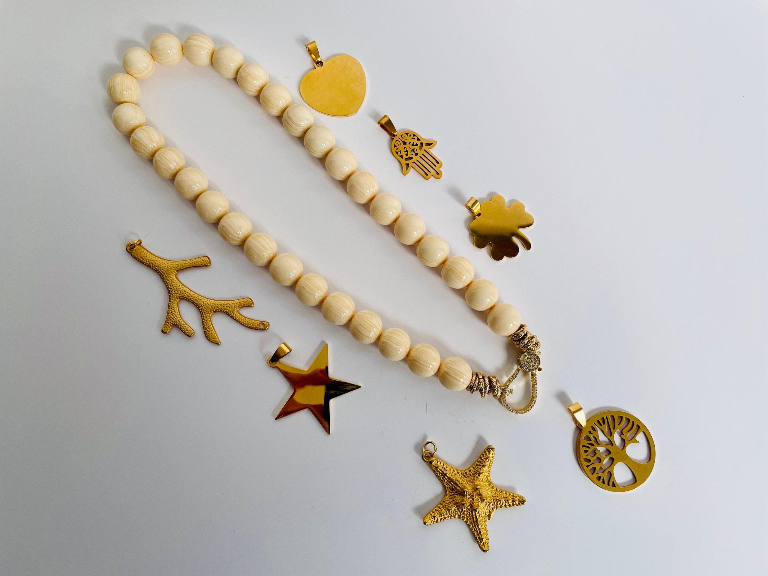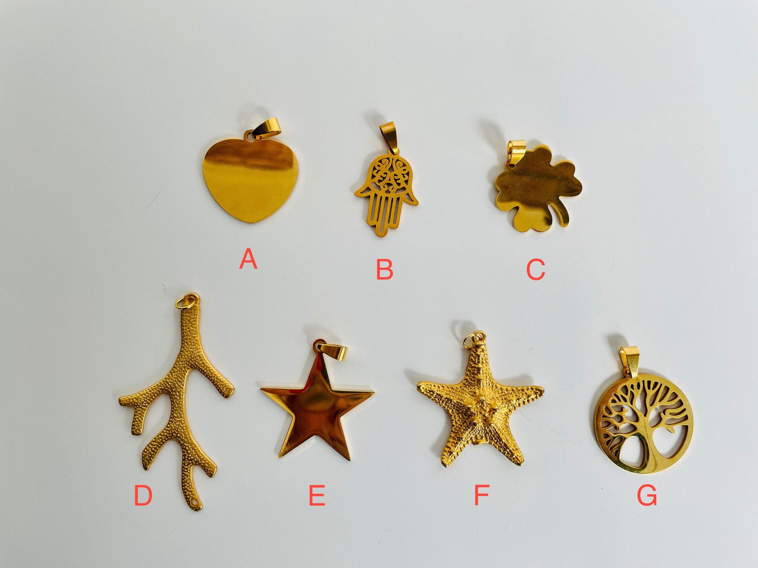 Nelle opzioni puoi scegliere se acquistarlo singolarmente o con qualche ciondolo. I pendenti, tranne il #D che è in Zama oro, sono in acciaio inox placcato oro.
