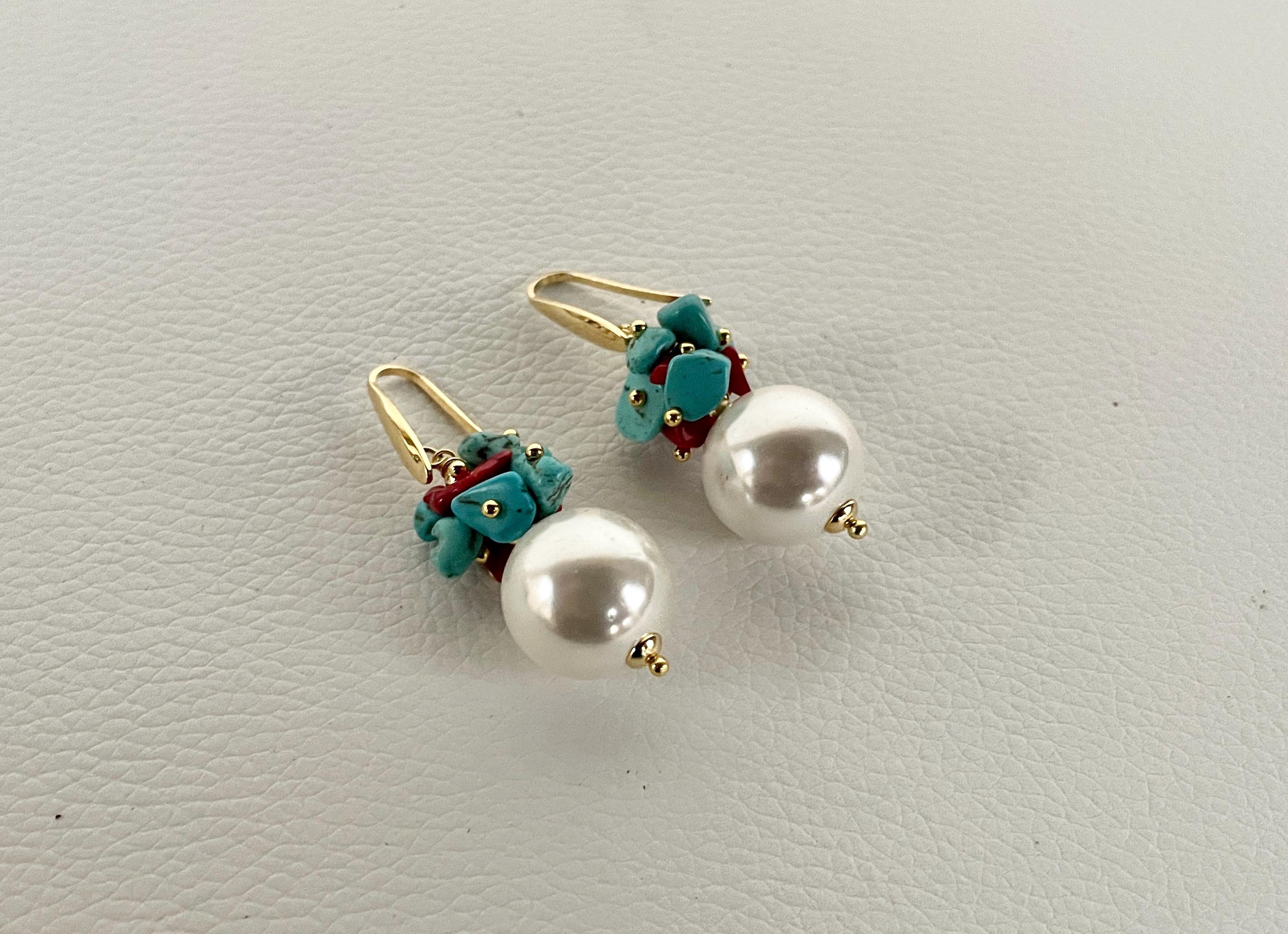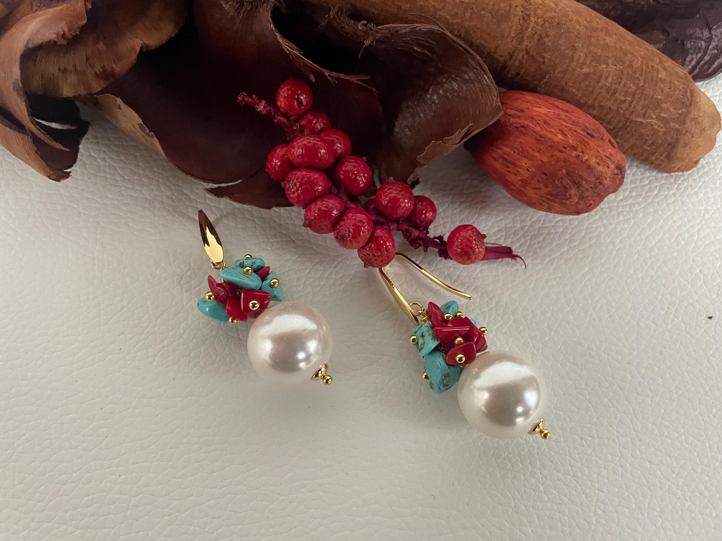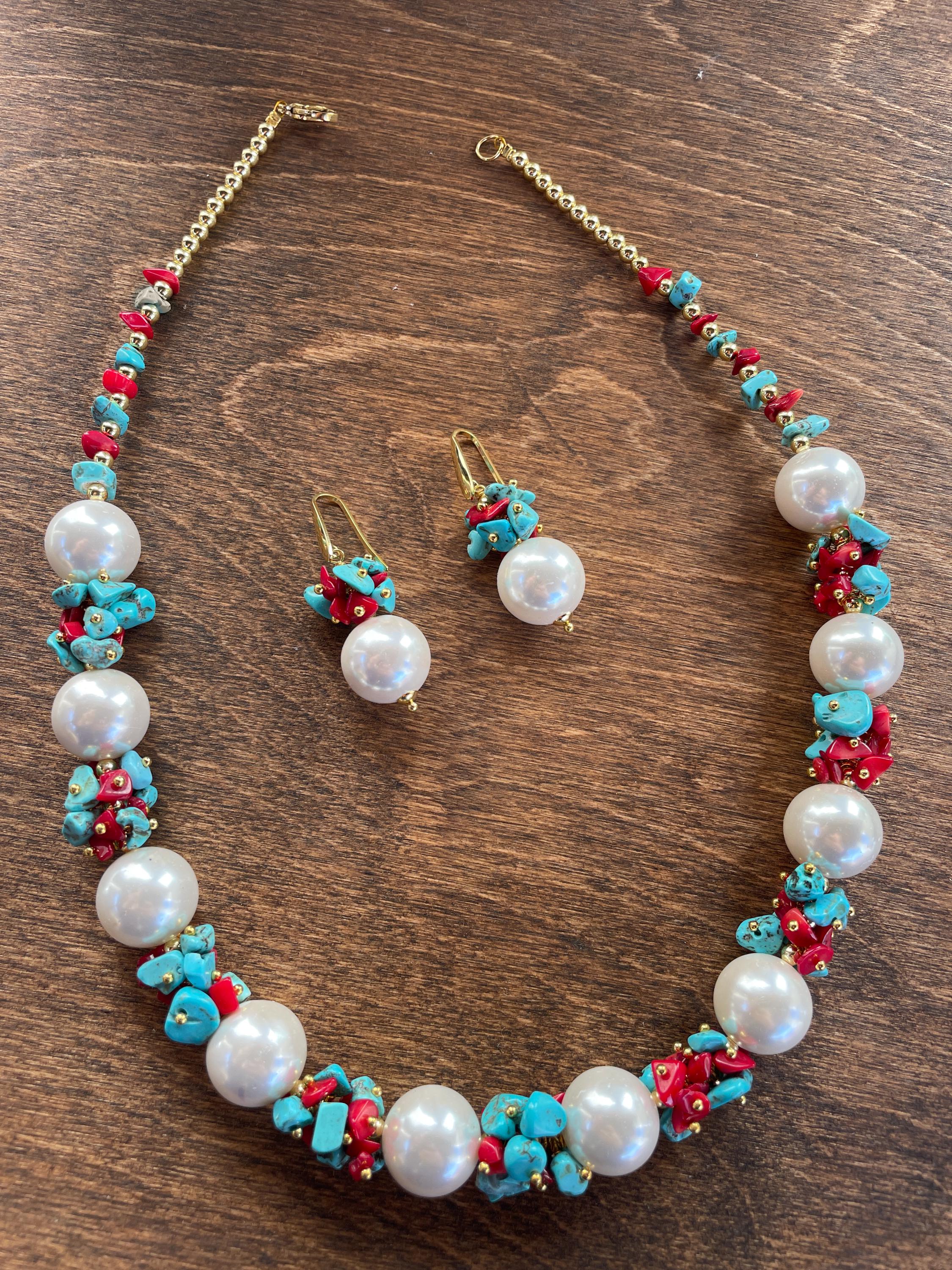 Realizzata con maxi boules di perle Maiorca (mm 16) e grappoli di chips di corallo bambù rosso e chips turchesi (Aulite).
