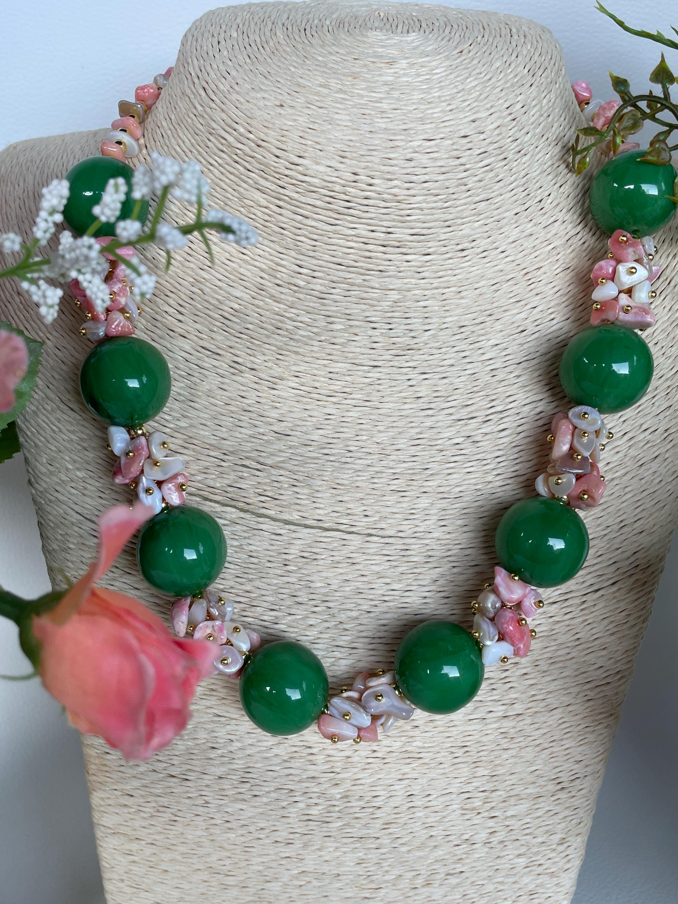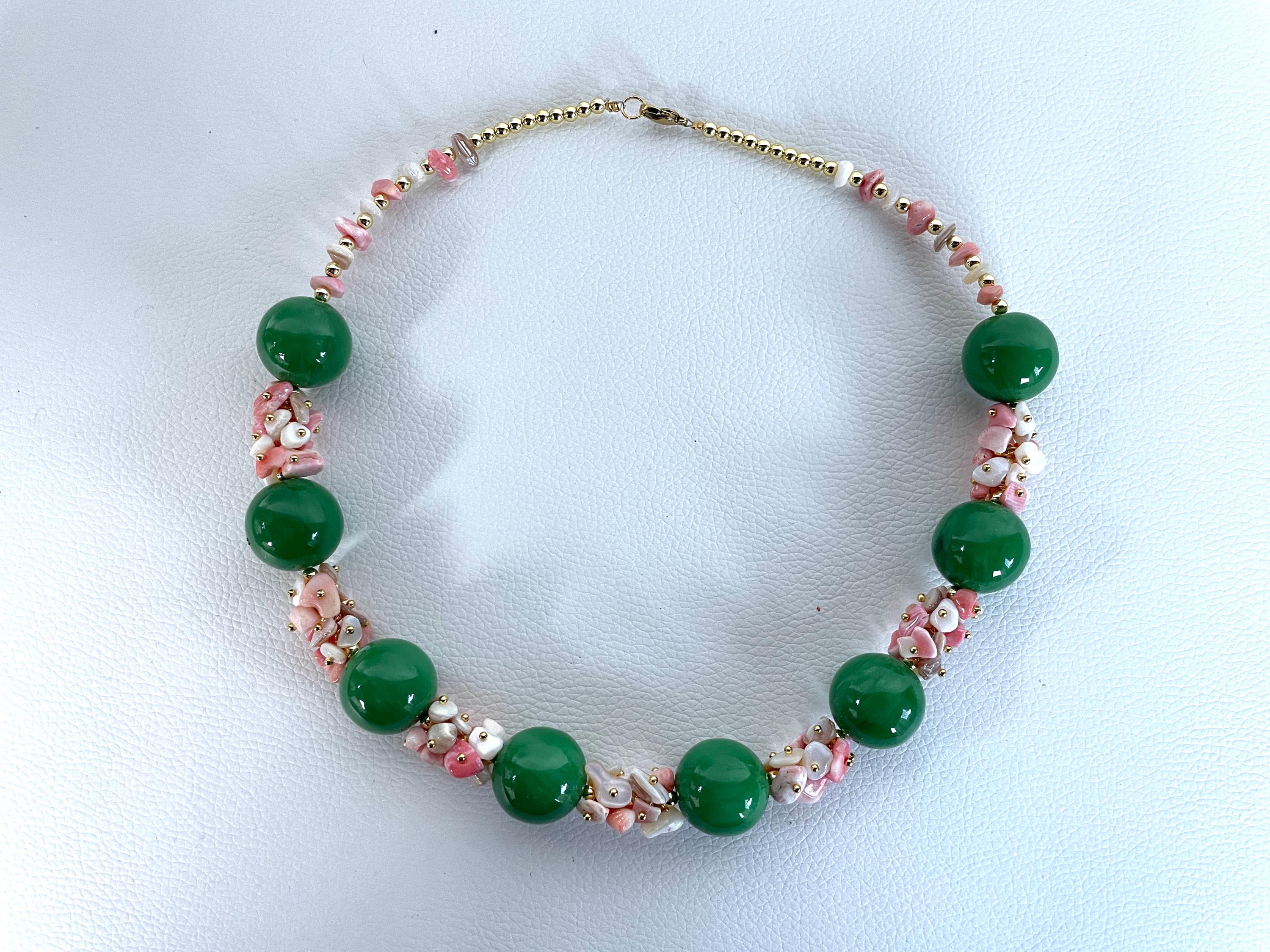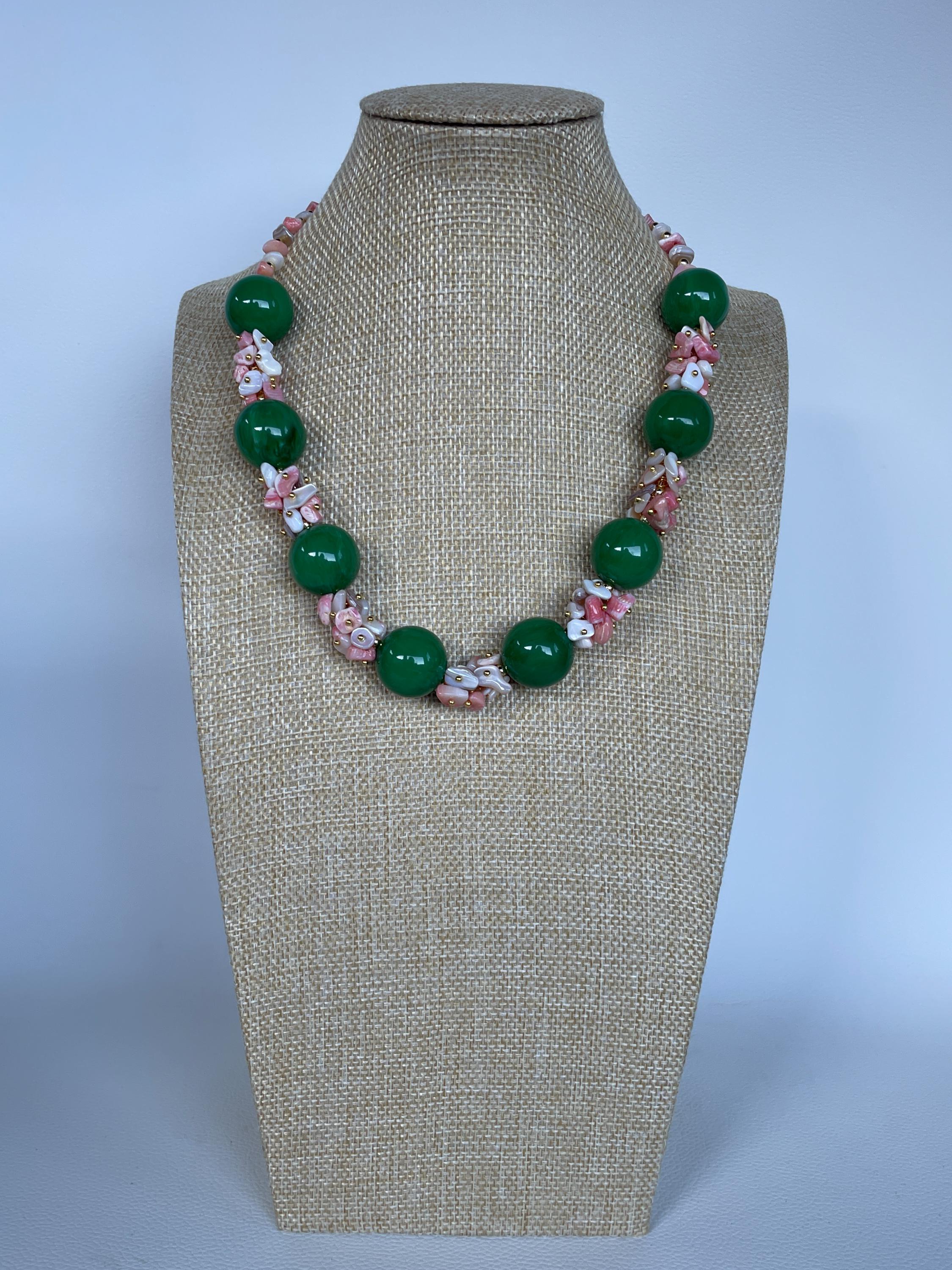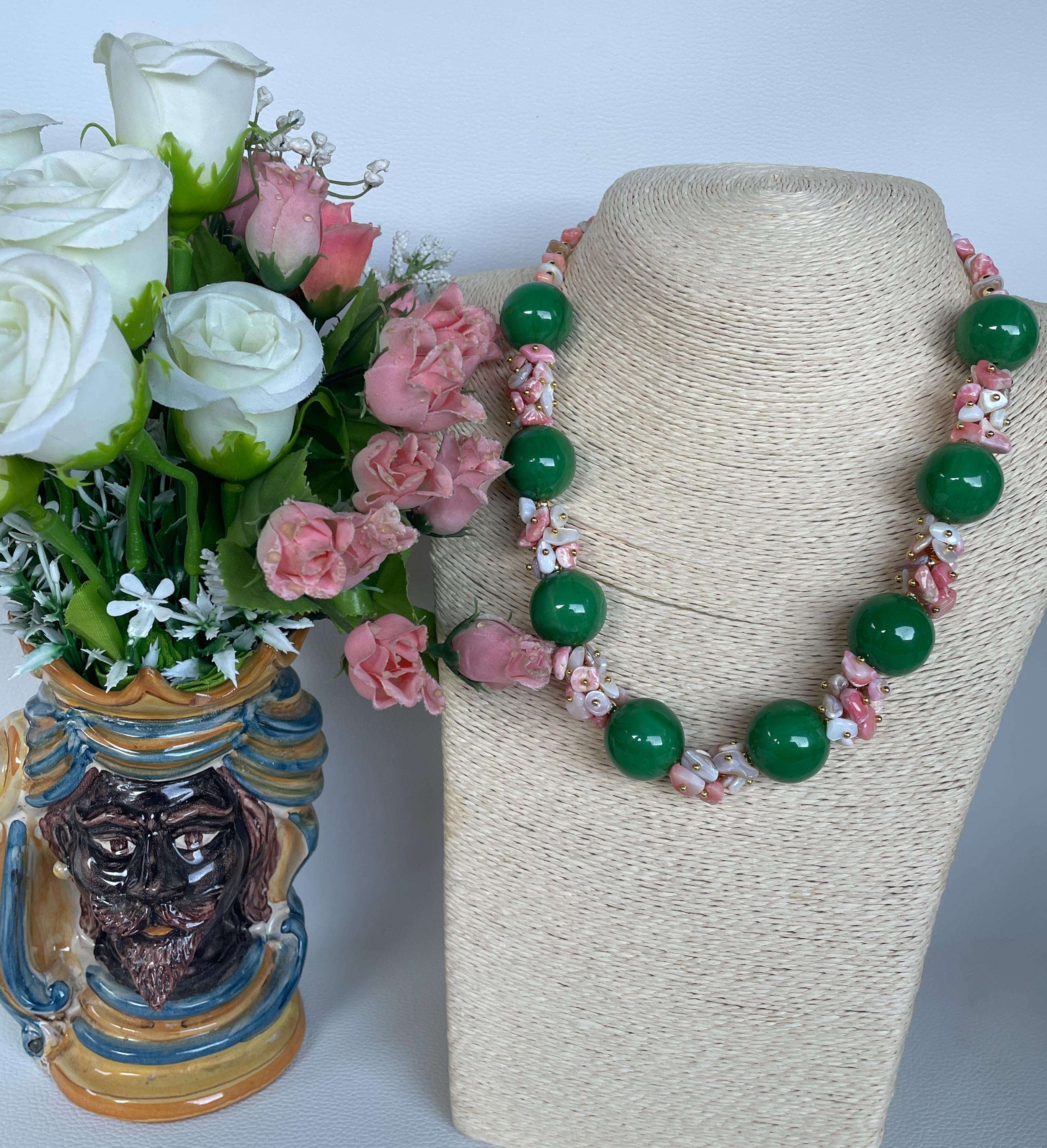 Realizzata con maxi boules verdi di resina italiana di prima qualità e grappoli di chips di corallo bambù rosa chiaro.
