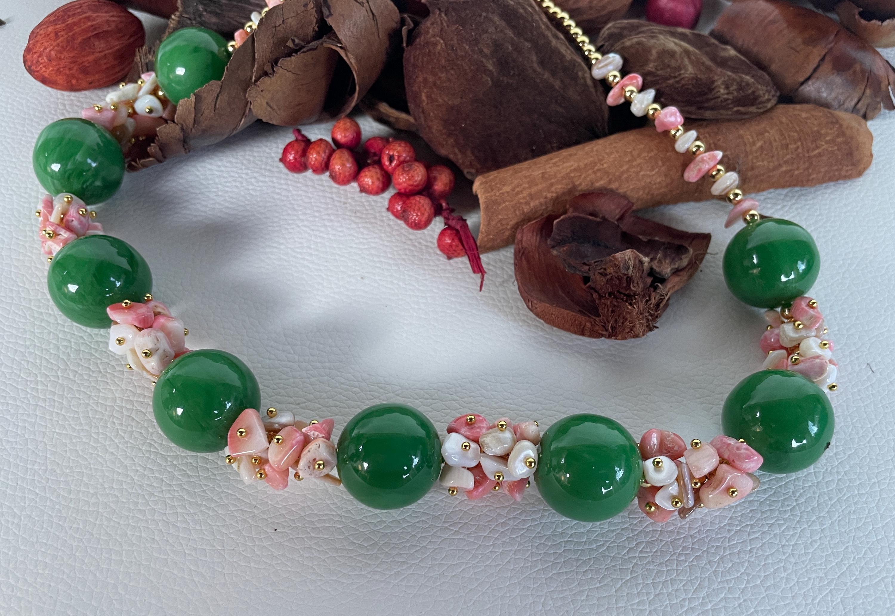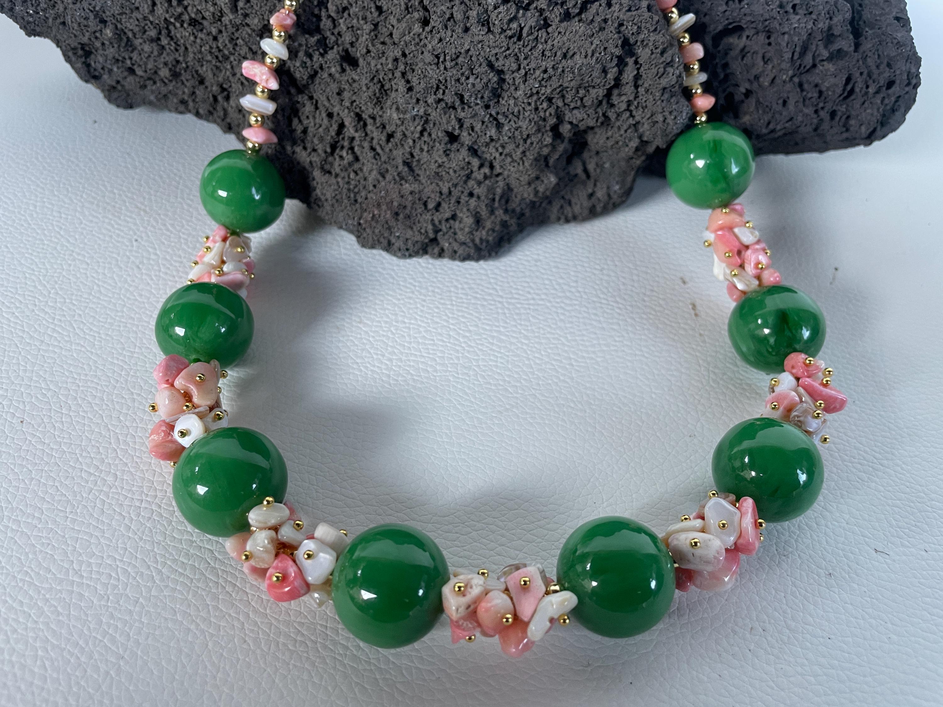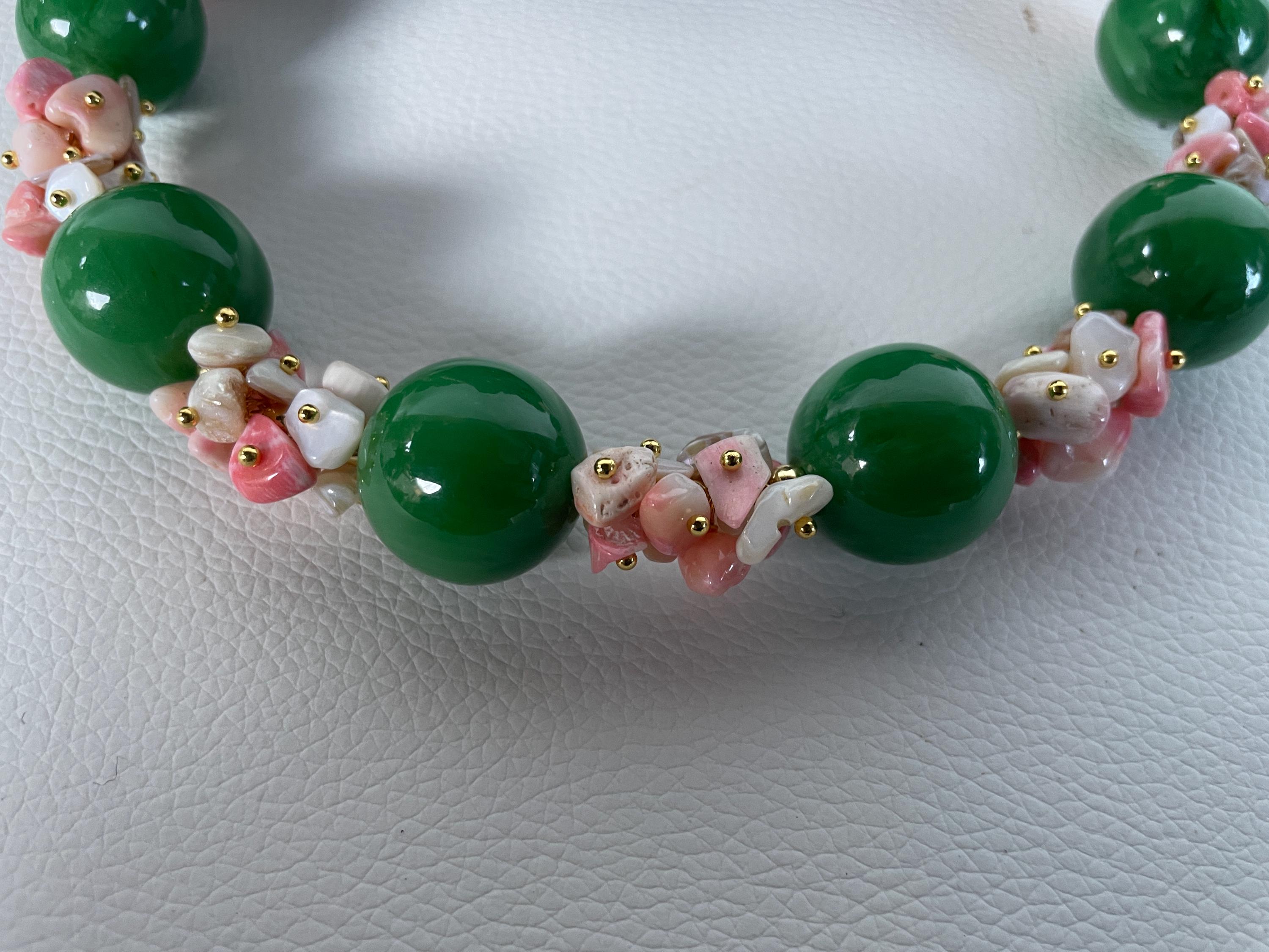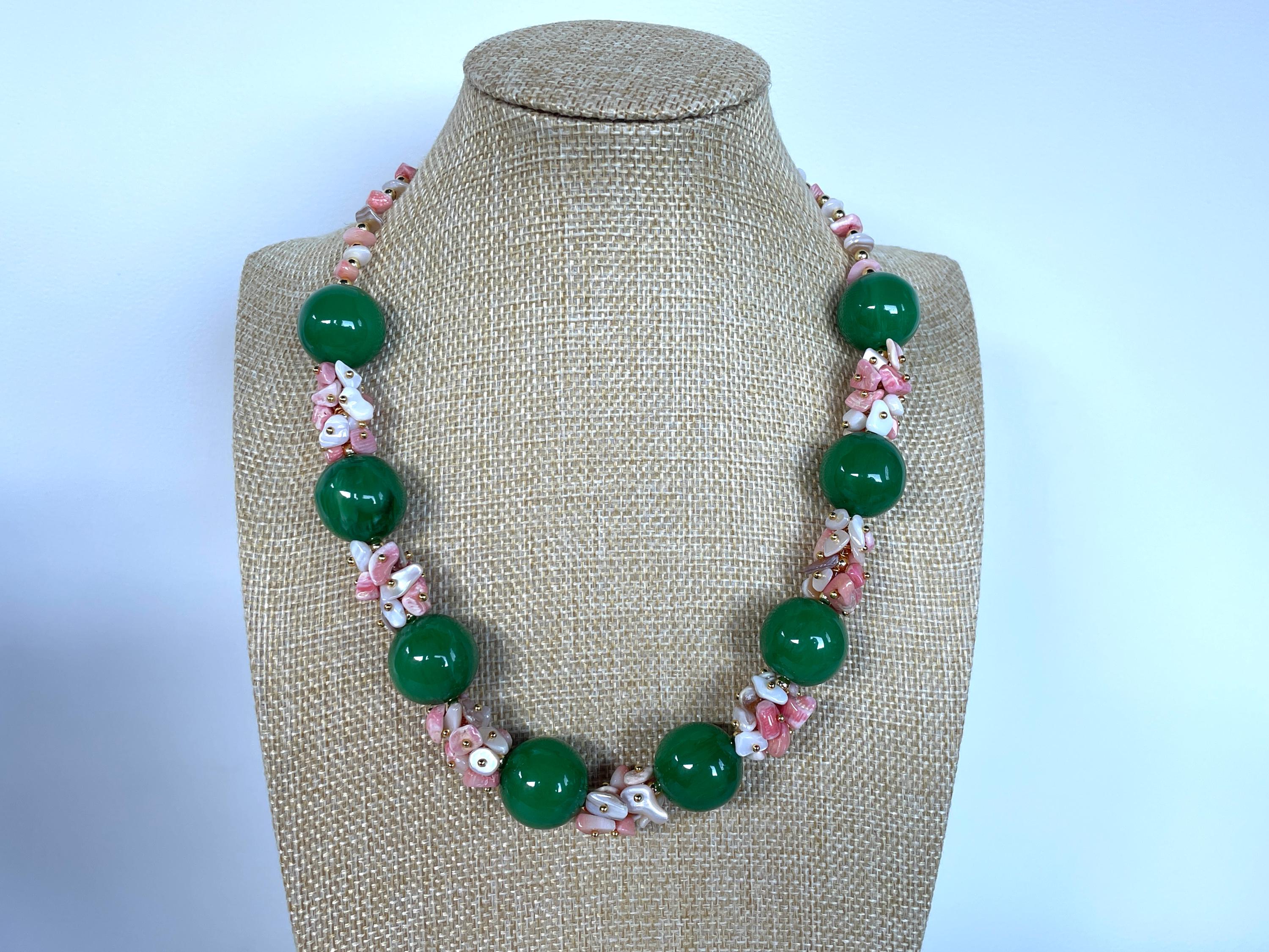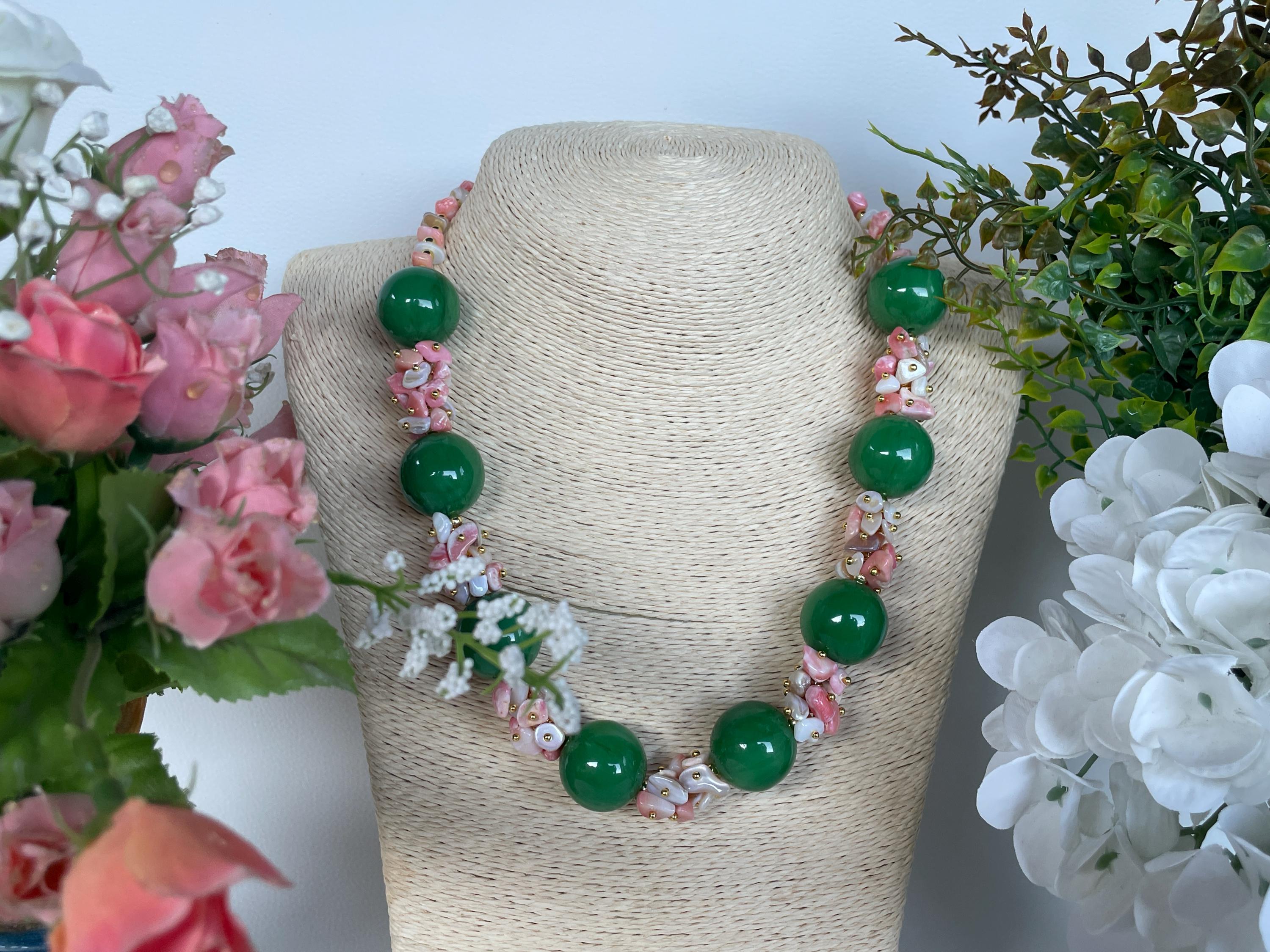 Realizzata con maxi boules verdi di resina italiana di prima qualità e grappoli di chips di corallo bambù rosa chiaro.