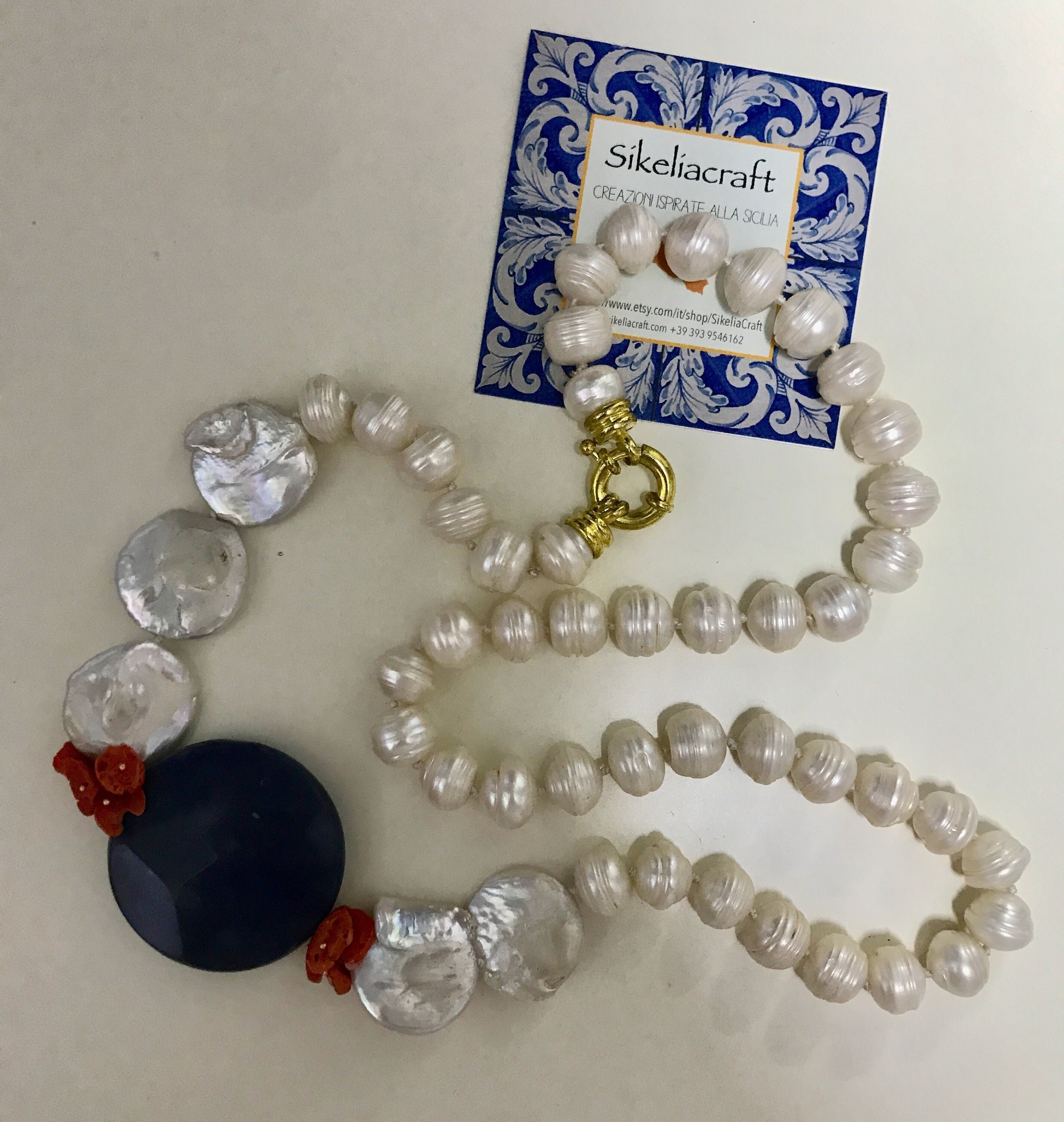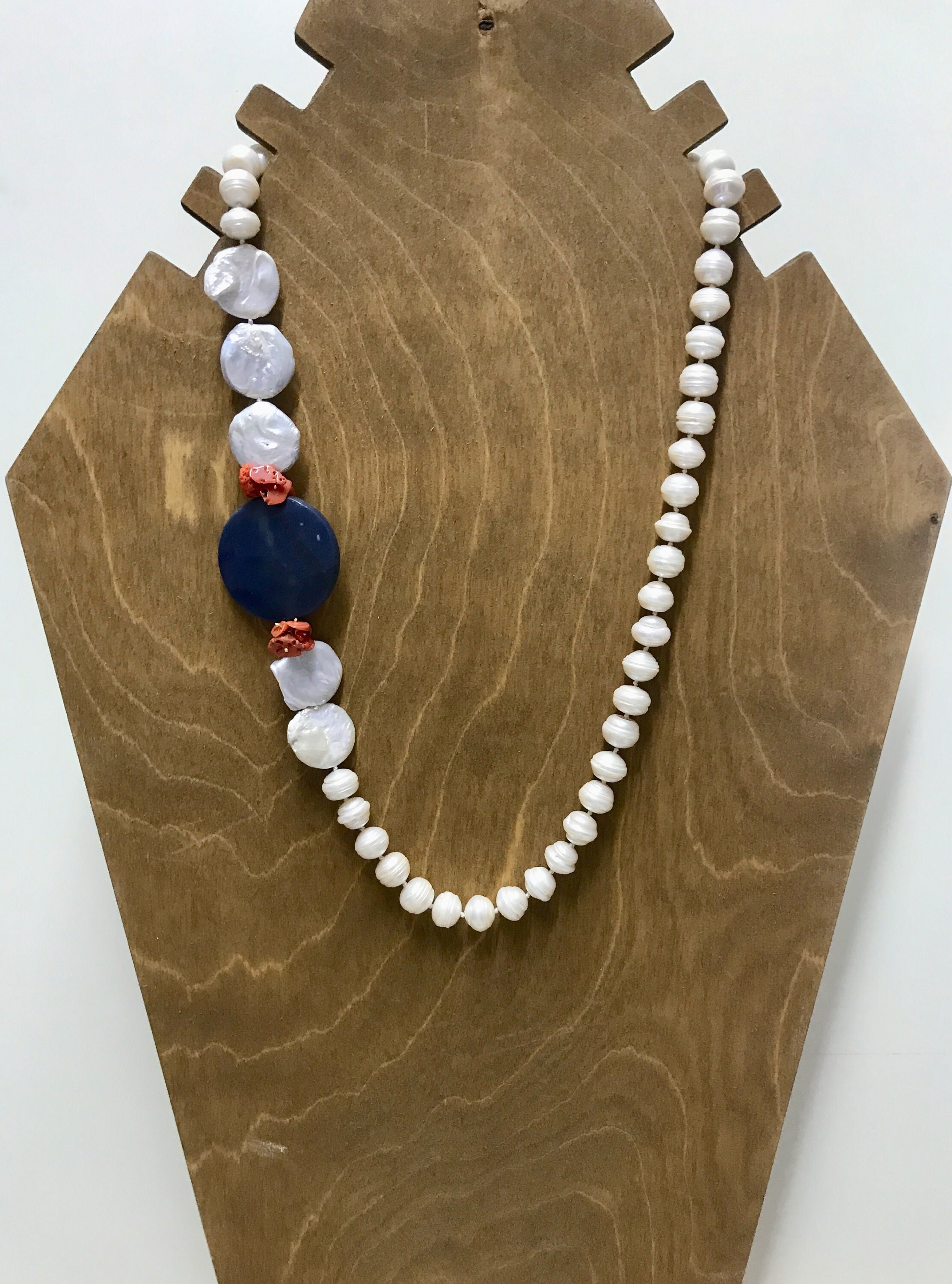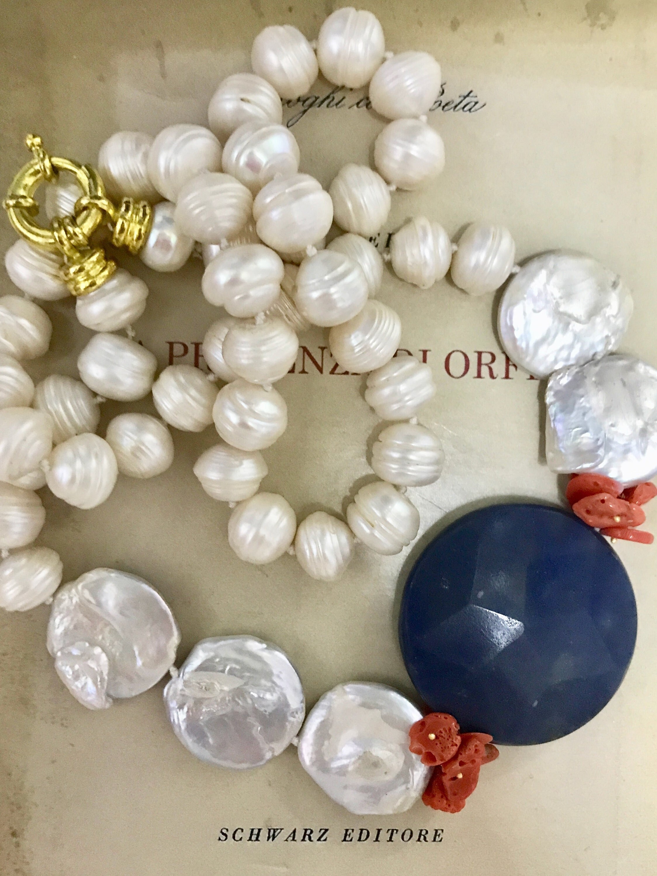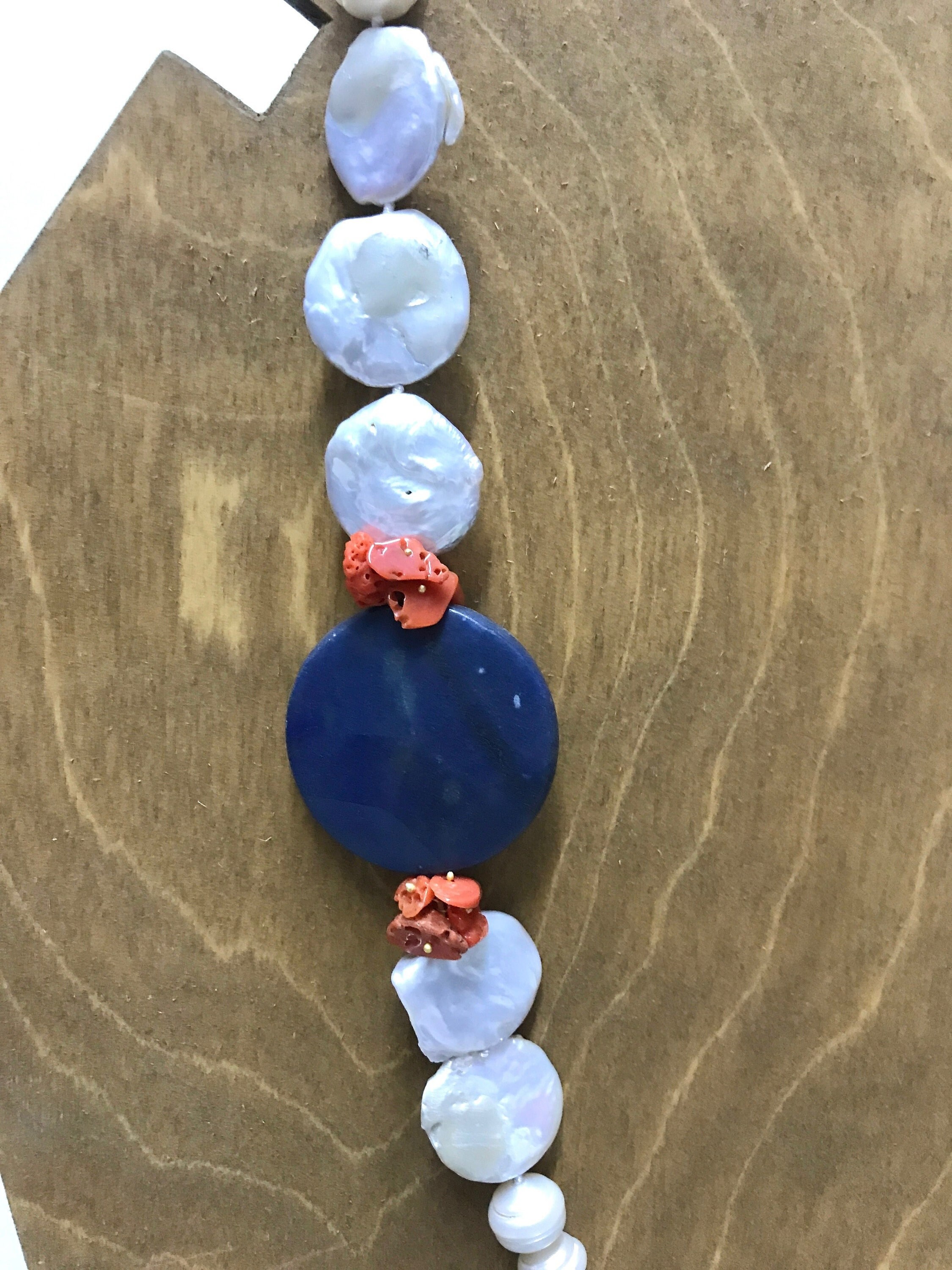 Realizzata con filo di perle di fiume, singolarmente annodate, interrotta da perle tonde piatte di madreperla e una grande perla piatta di Avventurina blu.