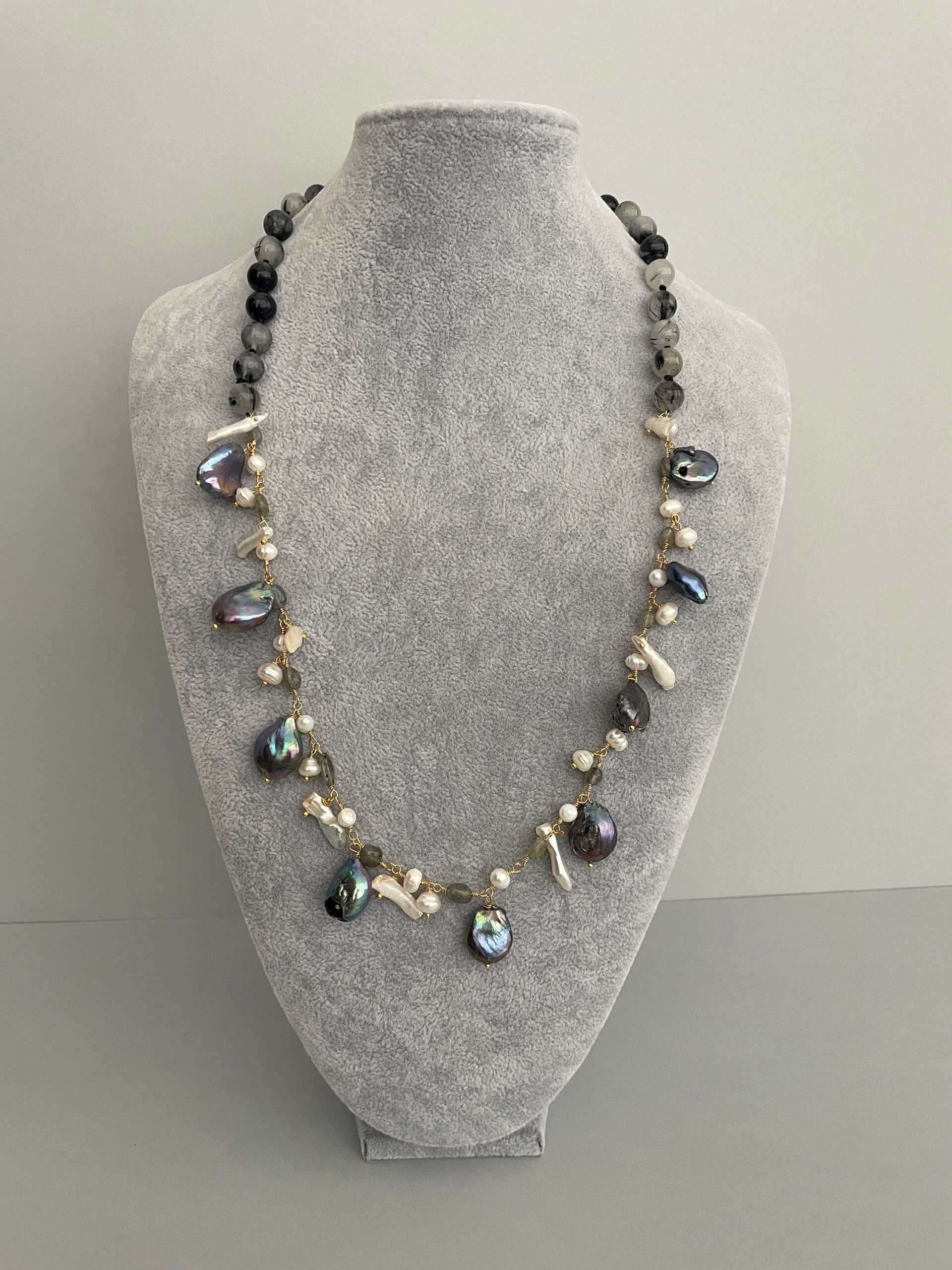 Collana composita realizzata con vari elementi e che esprime uno stile classico e contemporaneo al tempo stesso.
