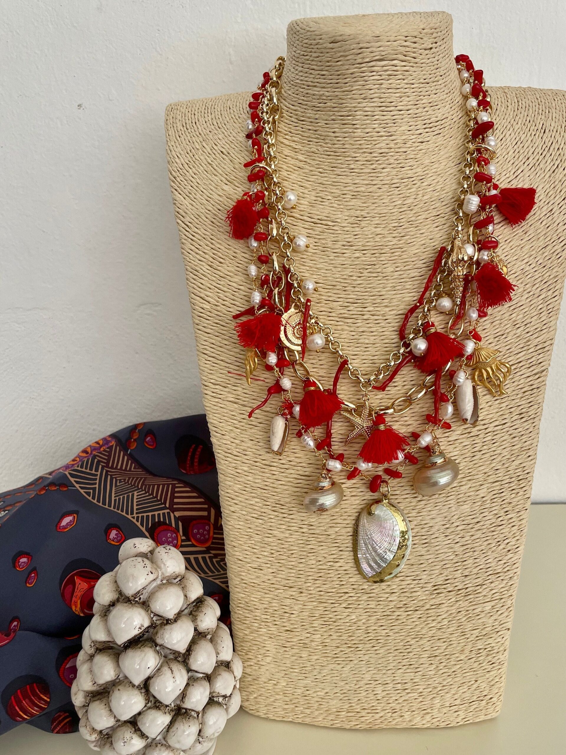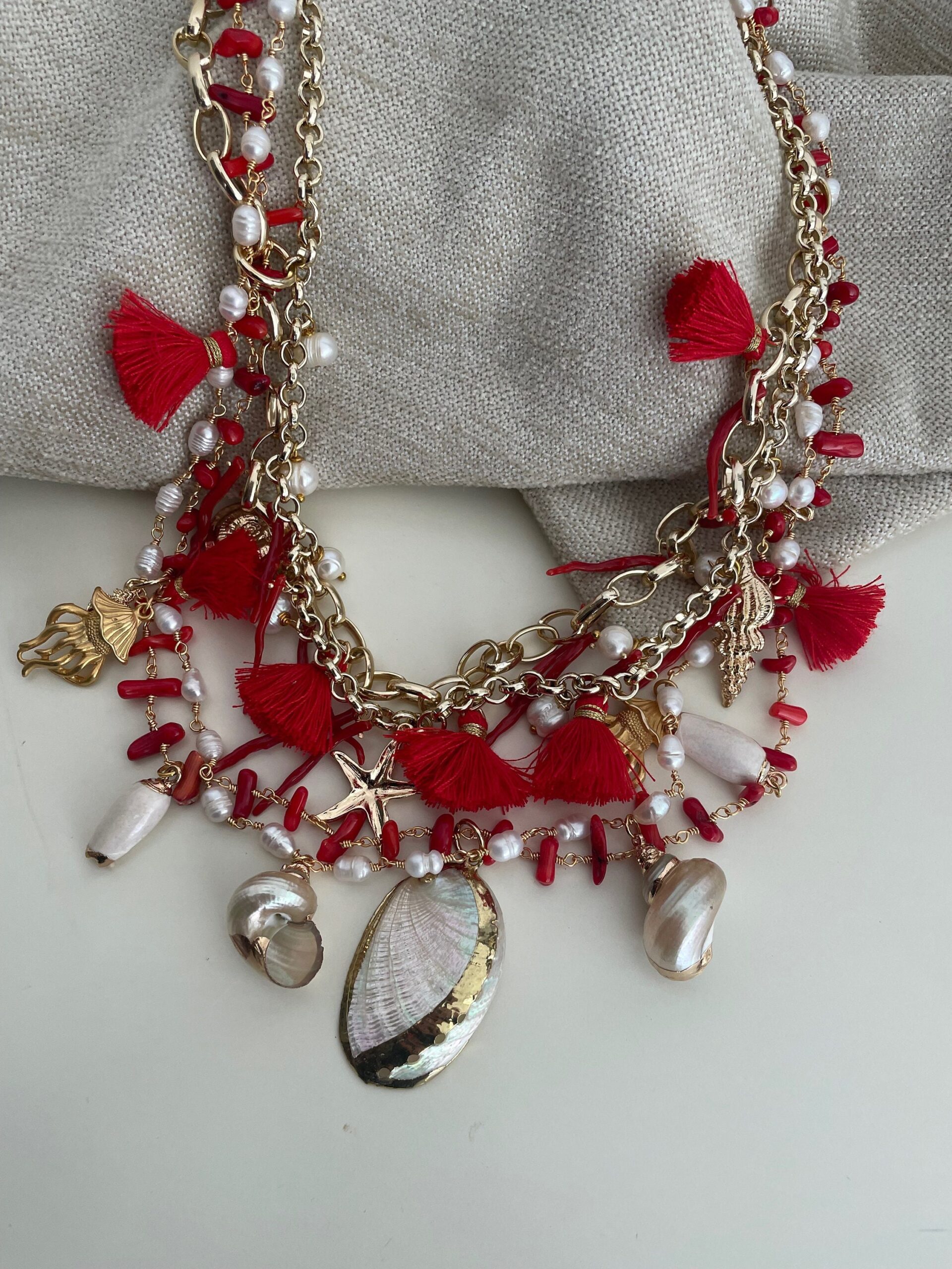 Completano il tutto vari charms assortiti: perle di fiume, rami di corallo rosso autentico, conchiglie naturali, charms marini in ottone e nappe rosse in cotone.