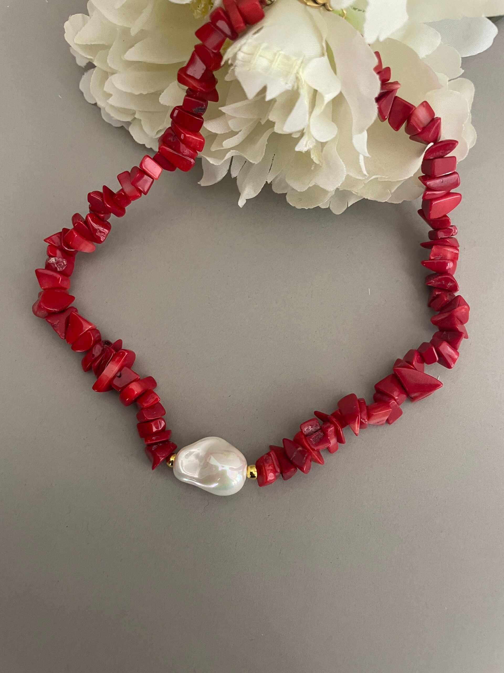 Collana corta, collana Corallo, collana girocollo con grande perla centrale, collana chips rosse, stile moderno, regalo laurea.