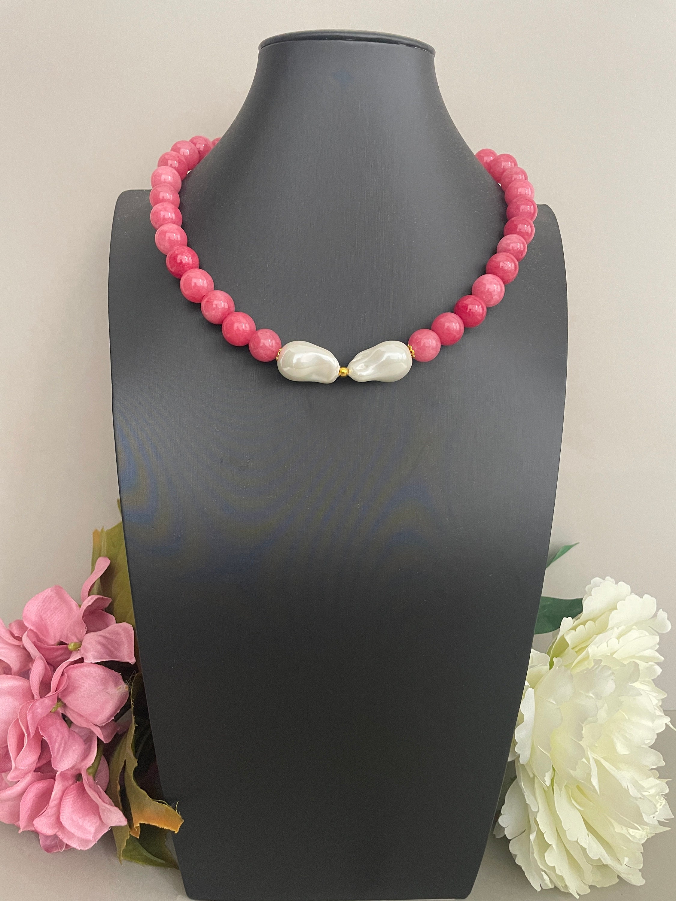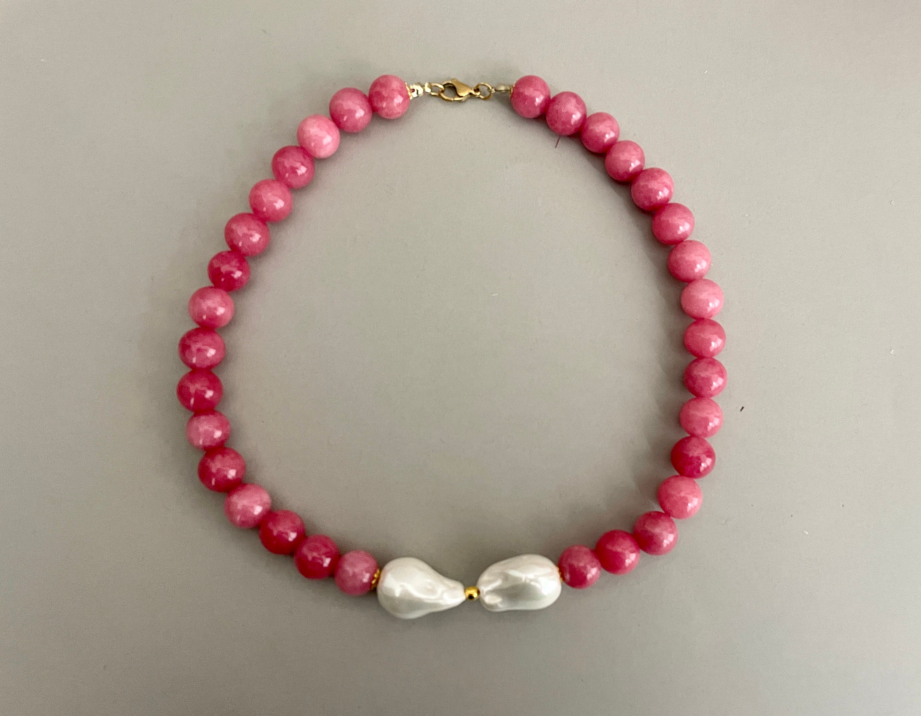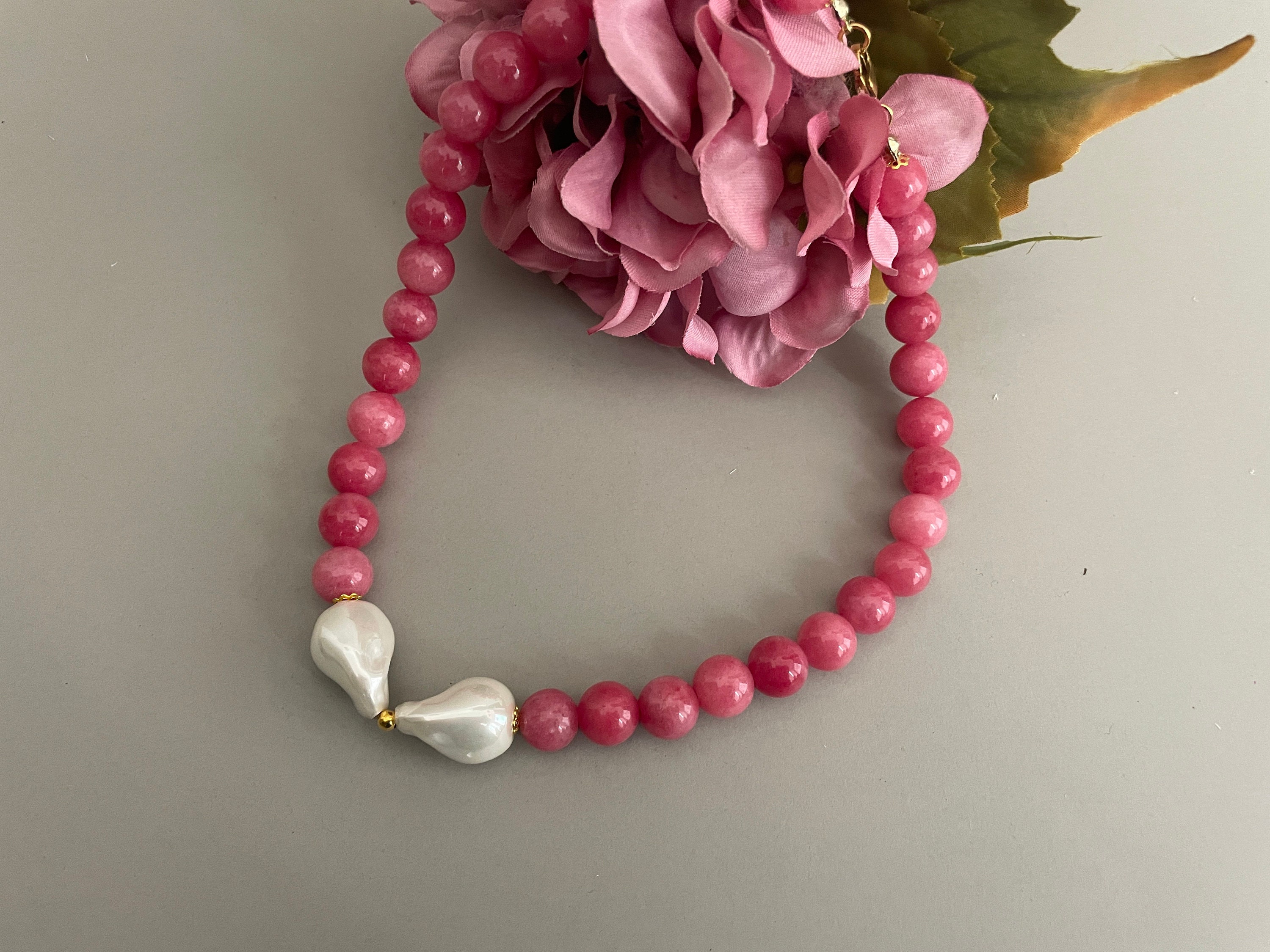 Collana corta, collana pietre dure naturali, perle di Agata rosa, centrale due maxi perle Maiorca irregolari, regalo per lei.