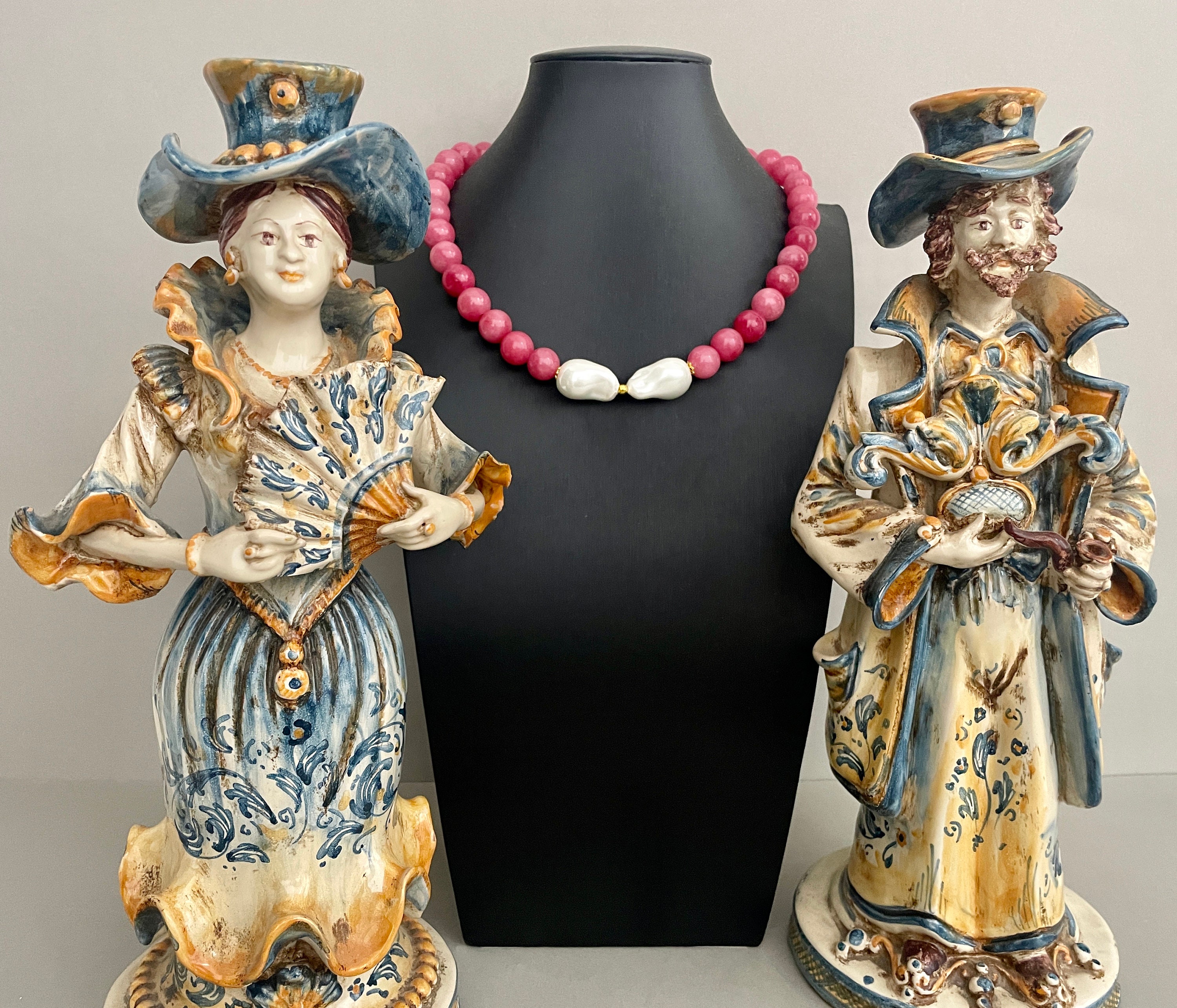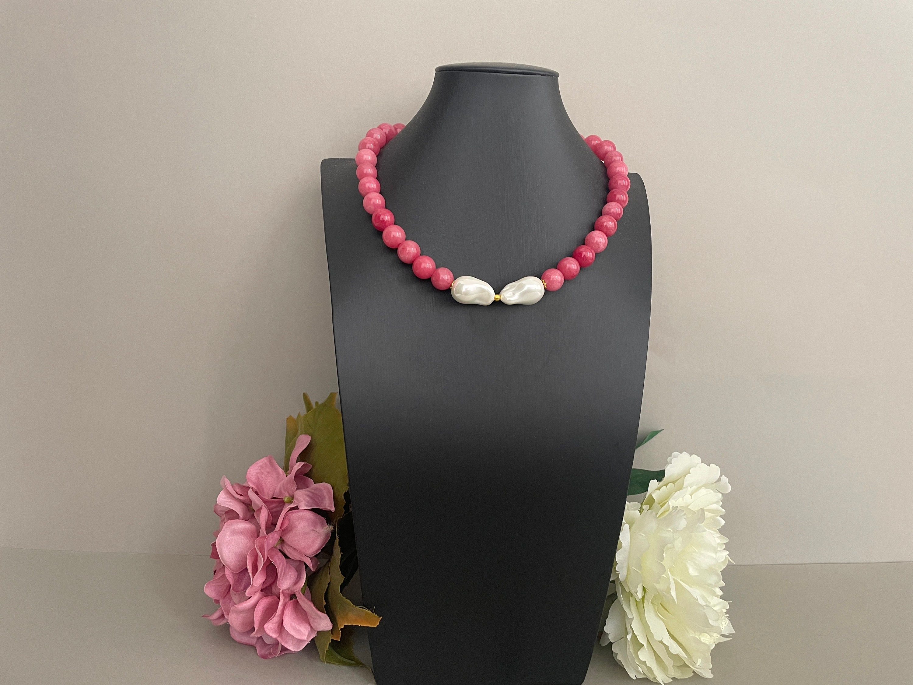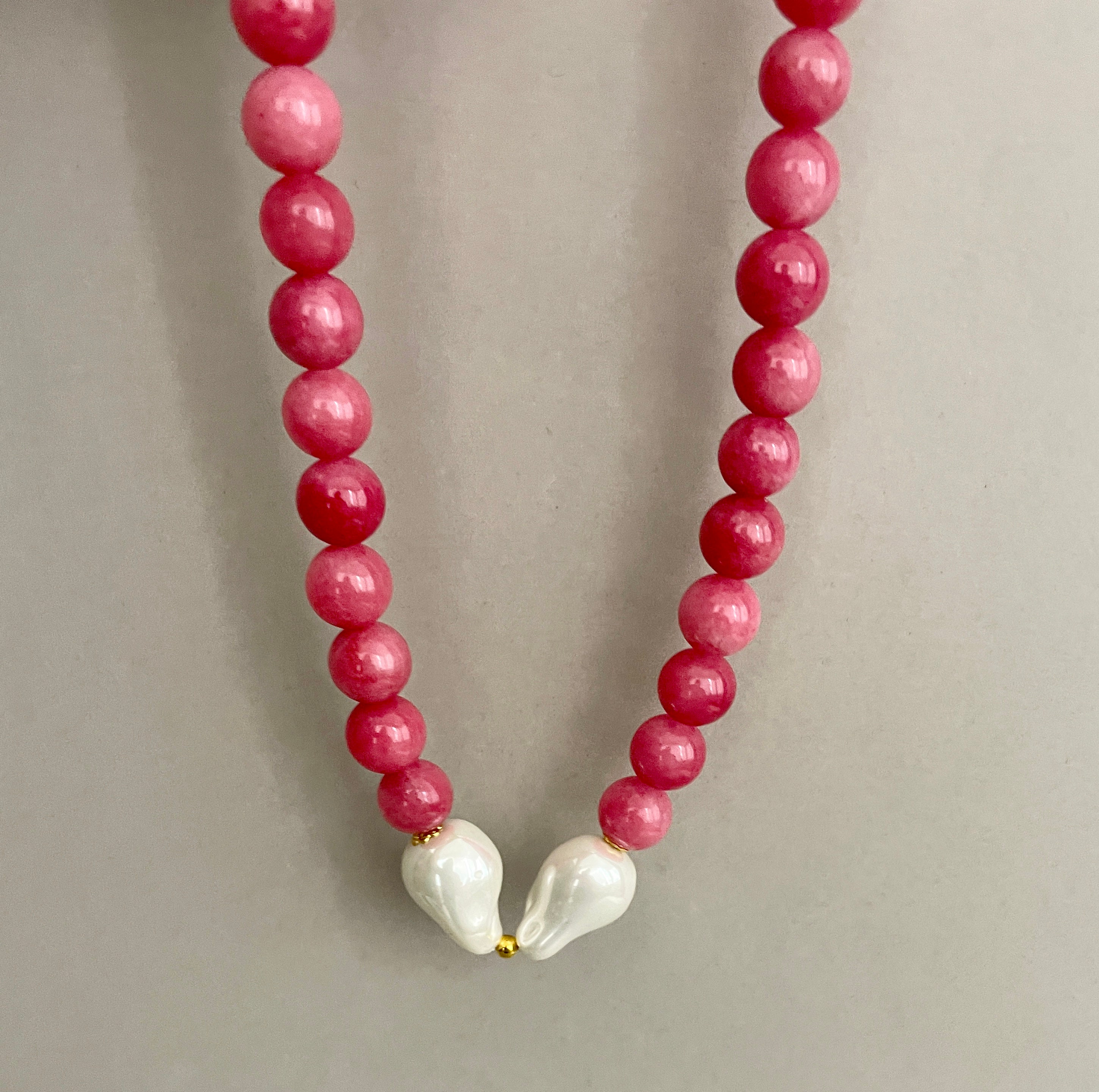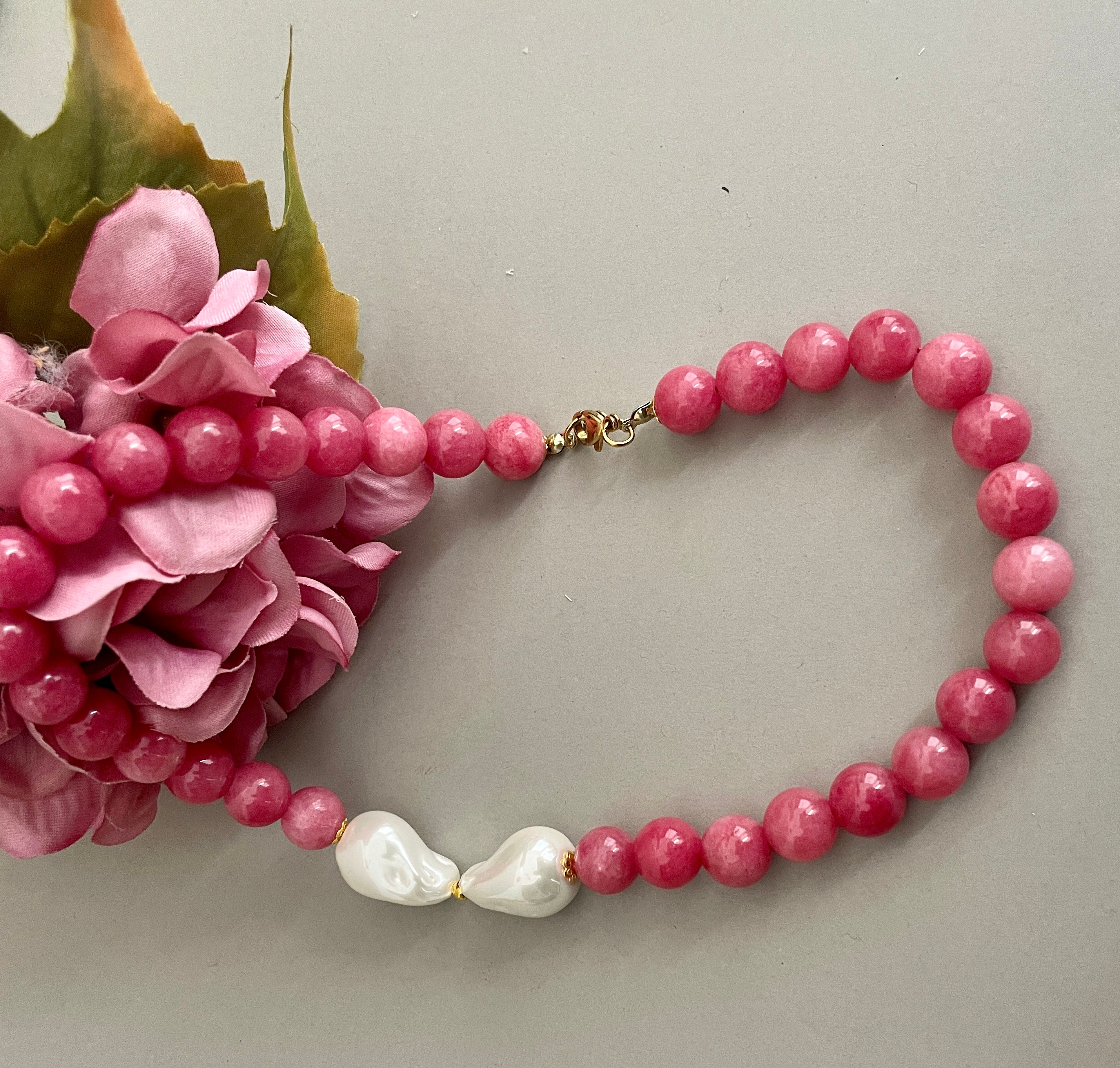 Collana corta, collana pietre dure naturali, perle di Agata rosa, centrale due maxi perle Maiorca irregolari, regalo per lei.