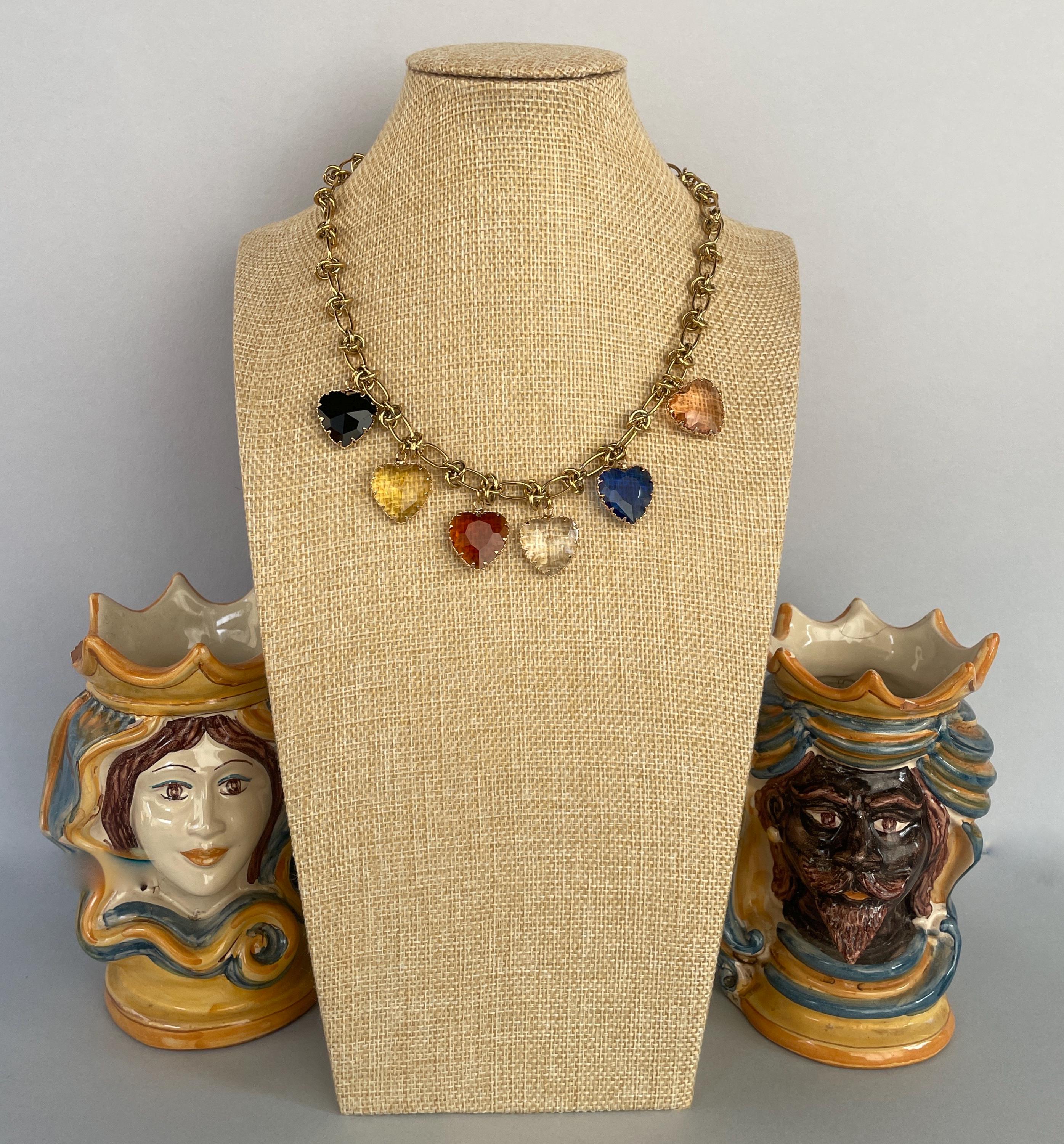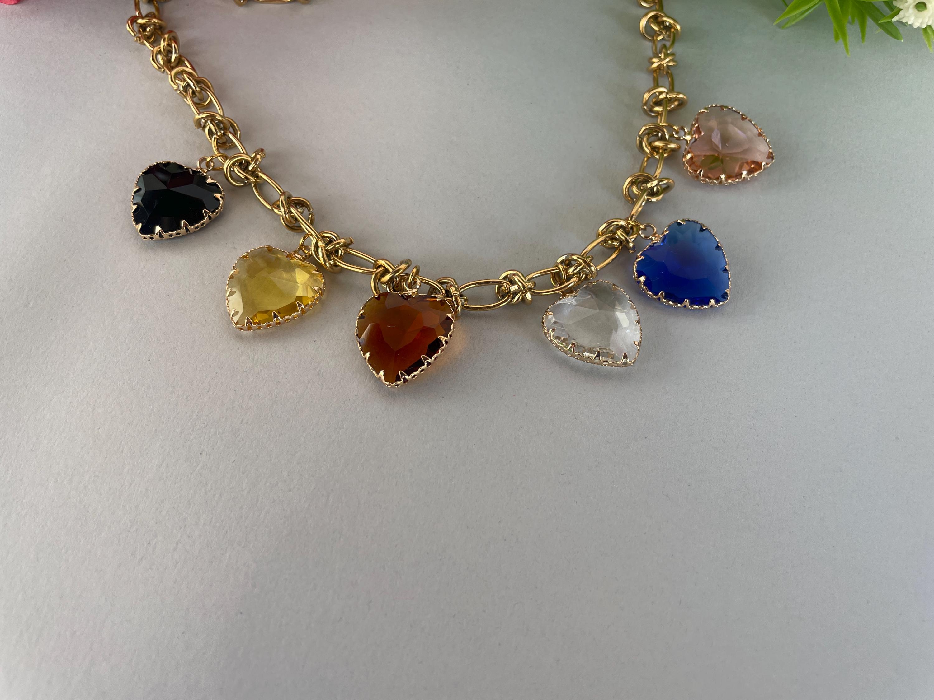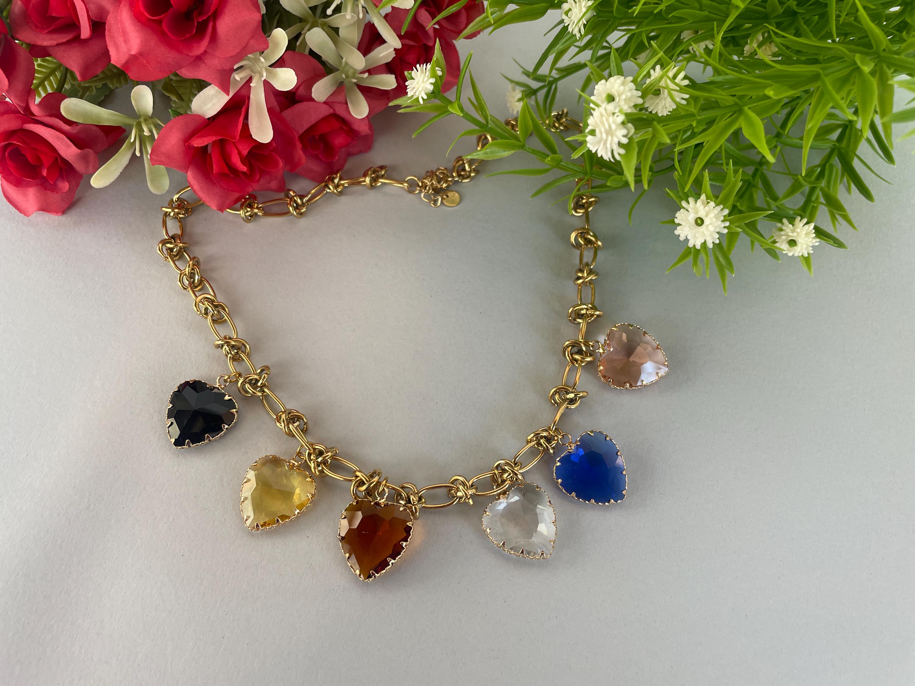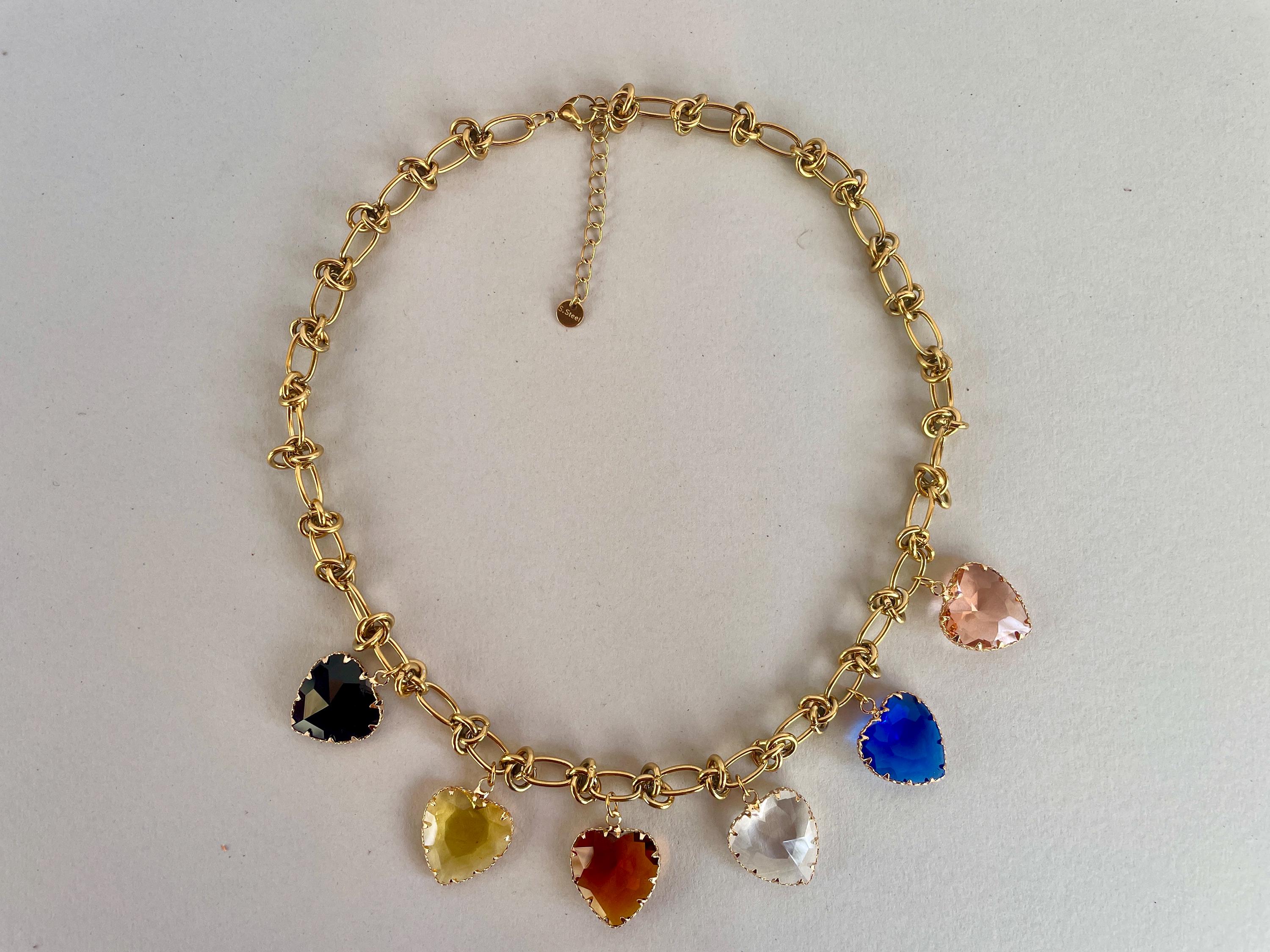 Dalla catena pendono 6 deliziosi cuori di cristallo di colori diversi fra loro che rendono il girocollo allegro e vivace.