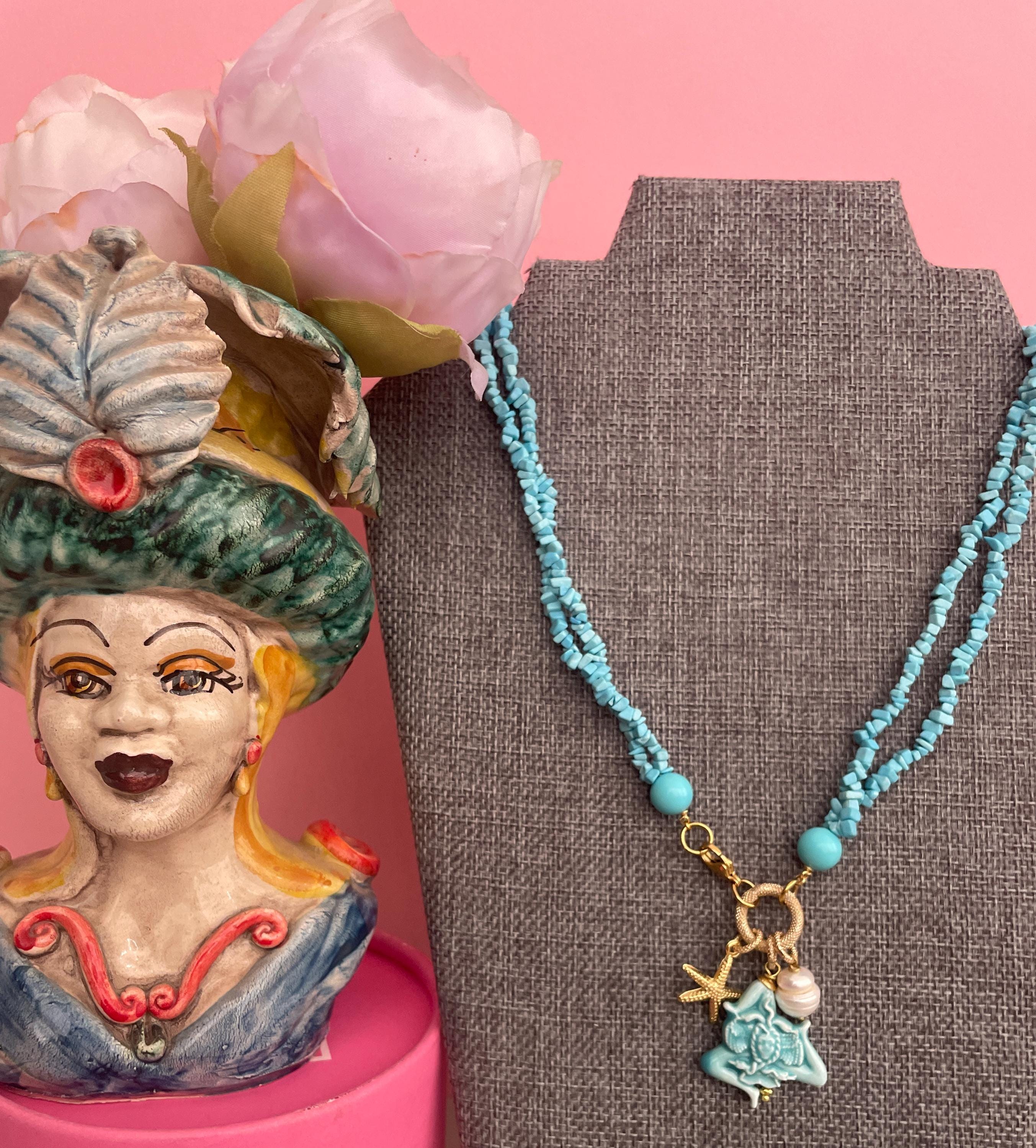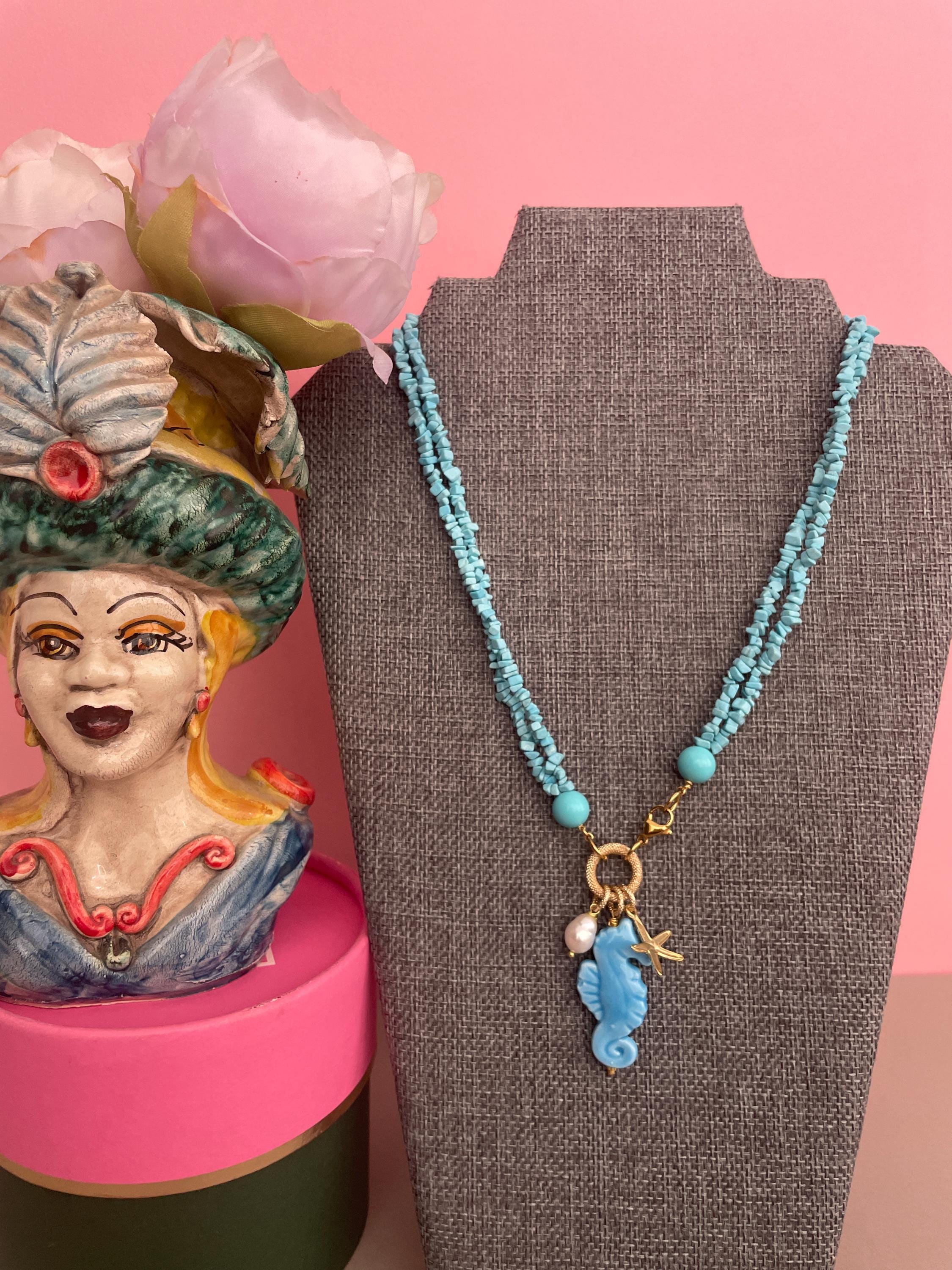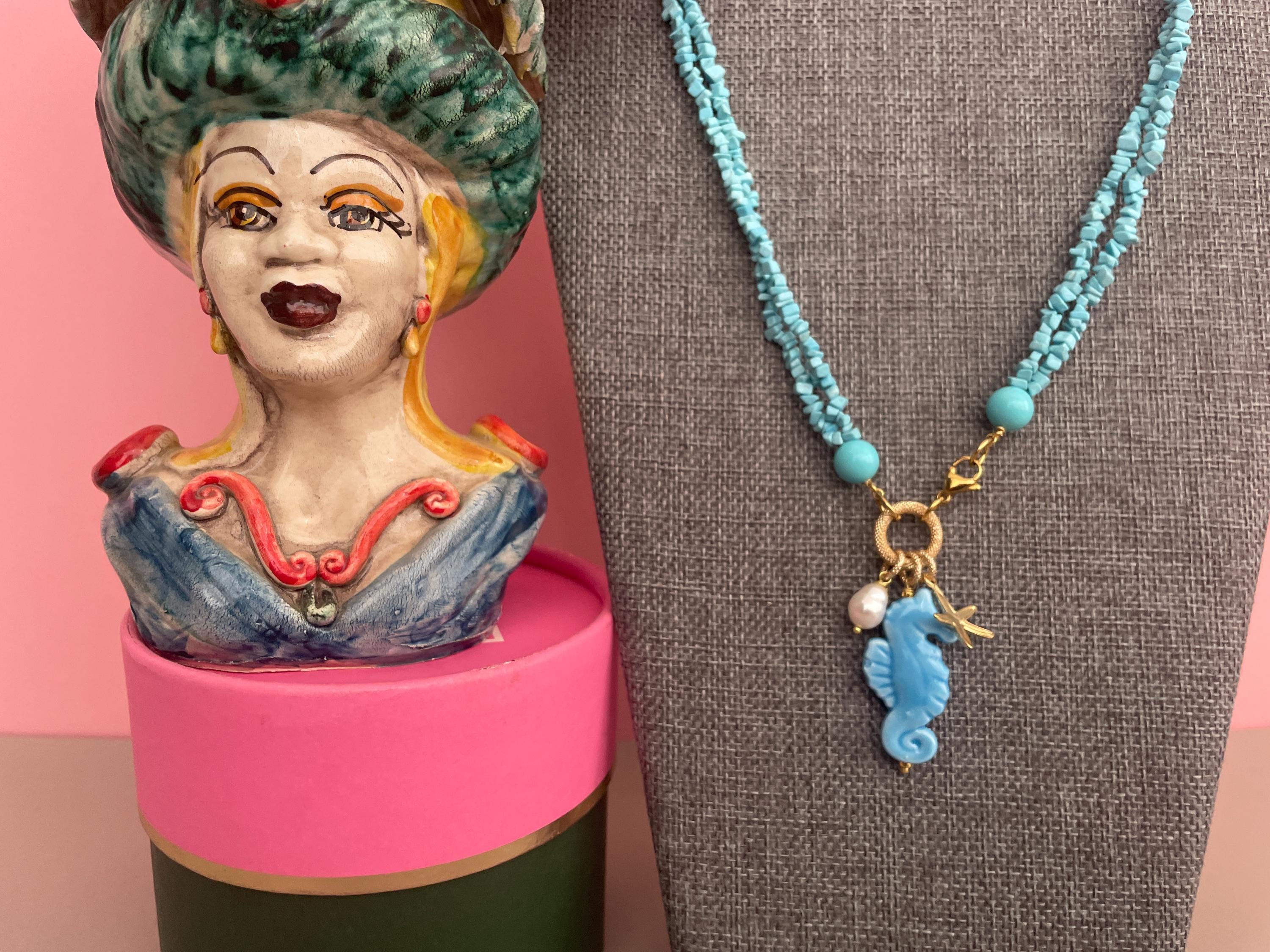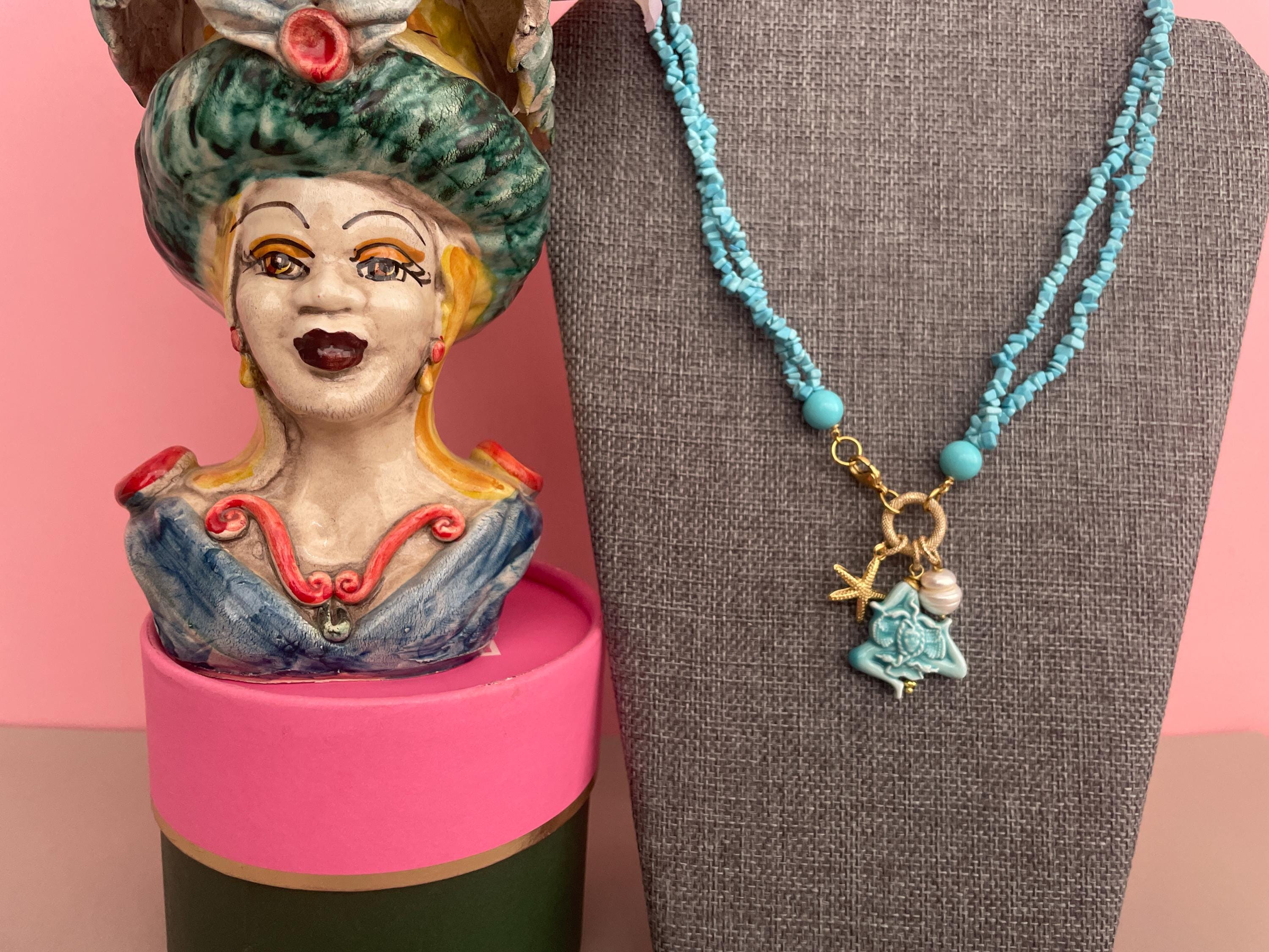 Deliziosa siciliana corta realizzata con due fili di chips di pasta di Turchese e per ciondolo un Cavalluccio marino oppure una Trinacria di ceramica di Caltagirone accompagnati da una perla barocca e una Stella dorata.
