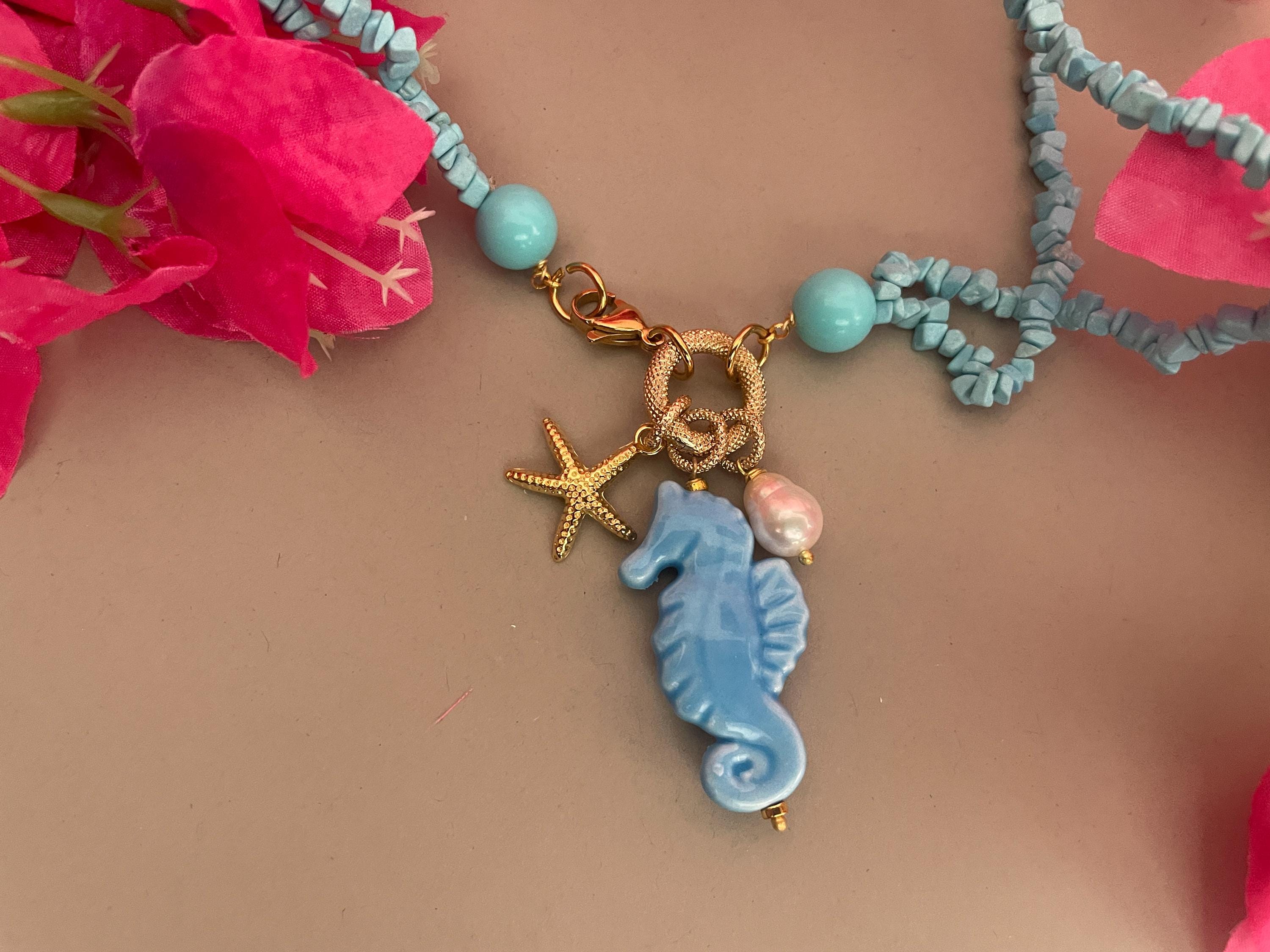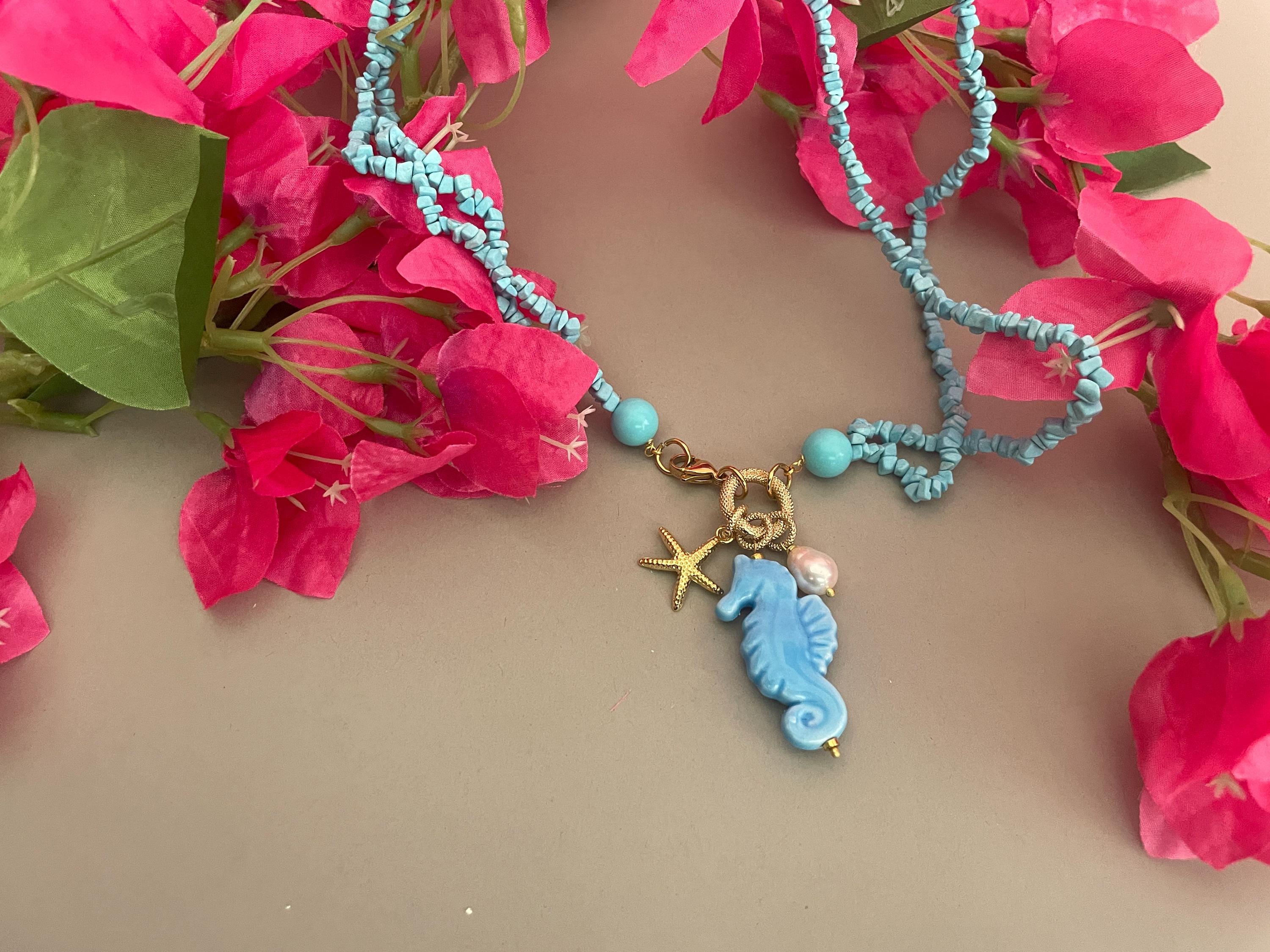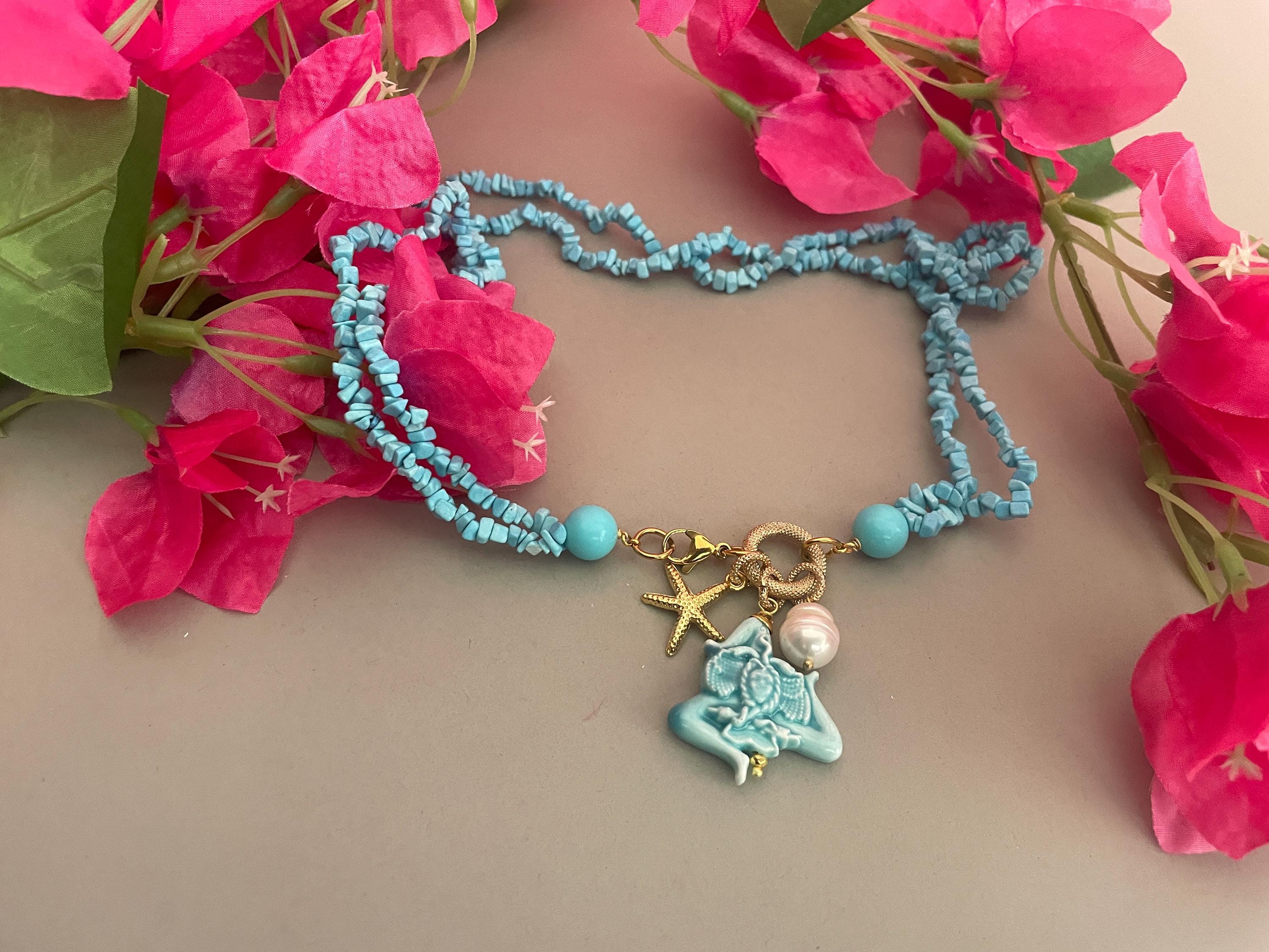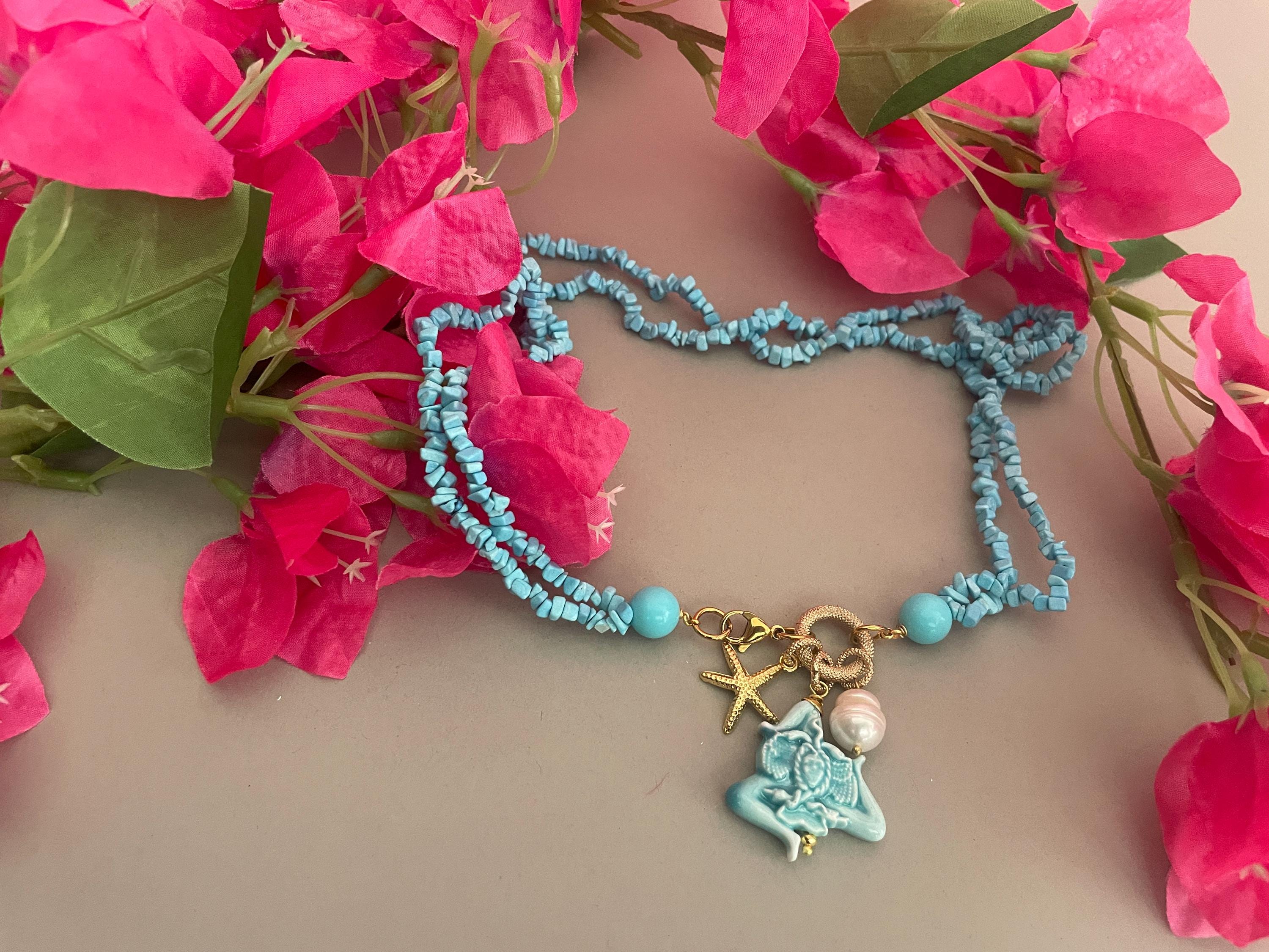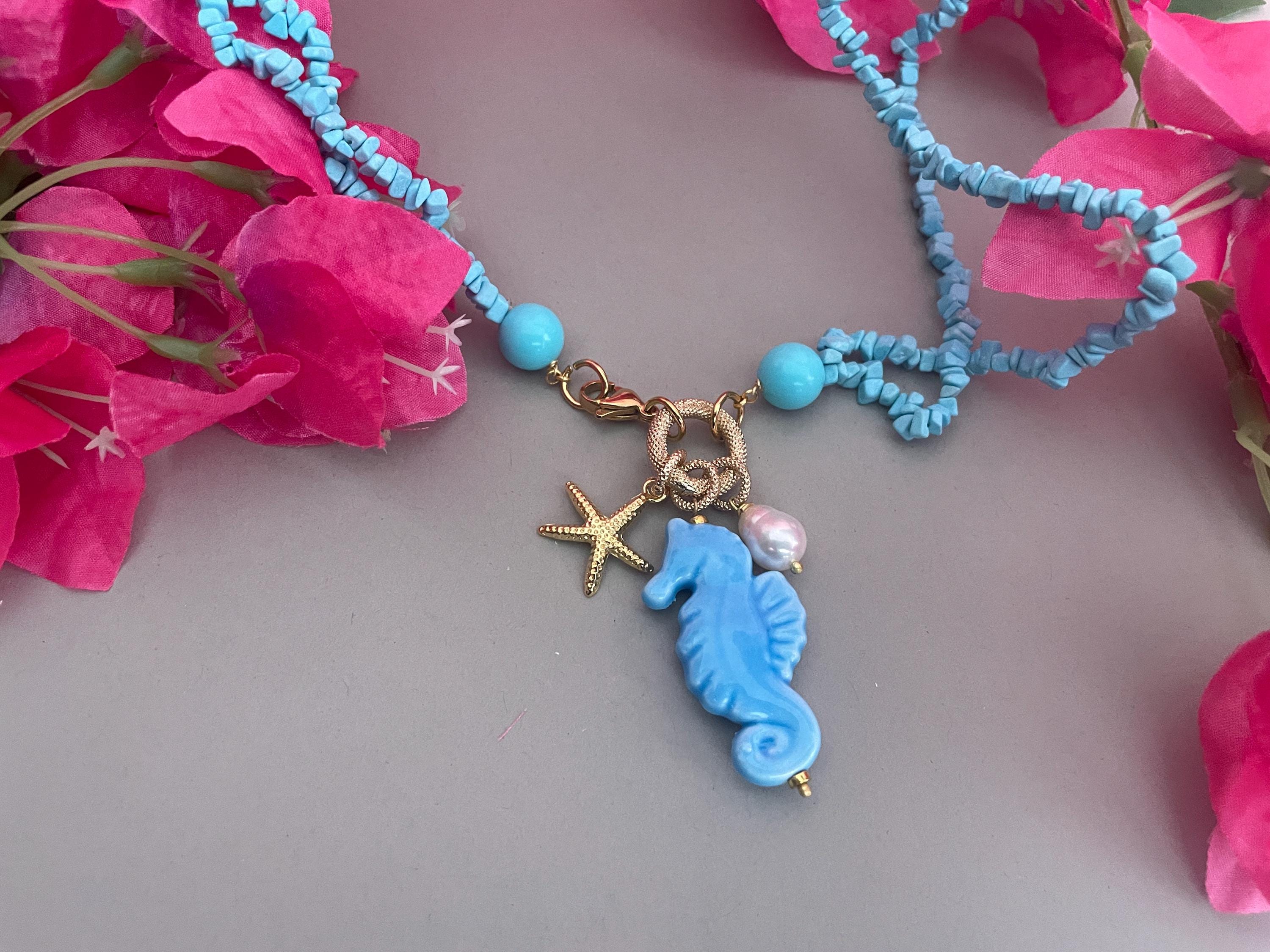 Deliziosa siciliana corta realizzata con due fili di chips di pasta di Turchese e per ciondolo un Cavalluccio marino oppure una Trinacria di ceramica di Caltagirone accompagnati da una perla barocca e una Stella dorata.