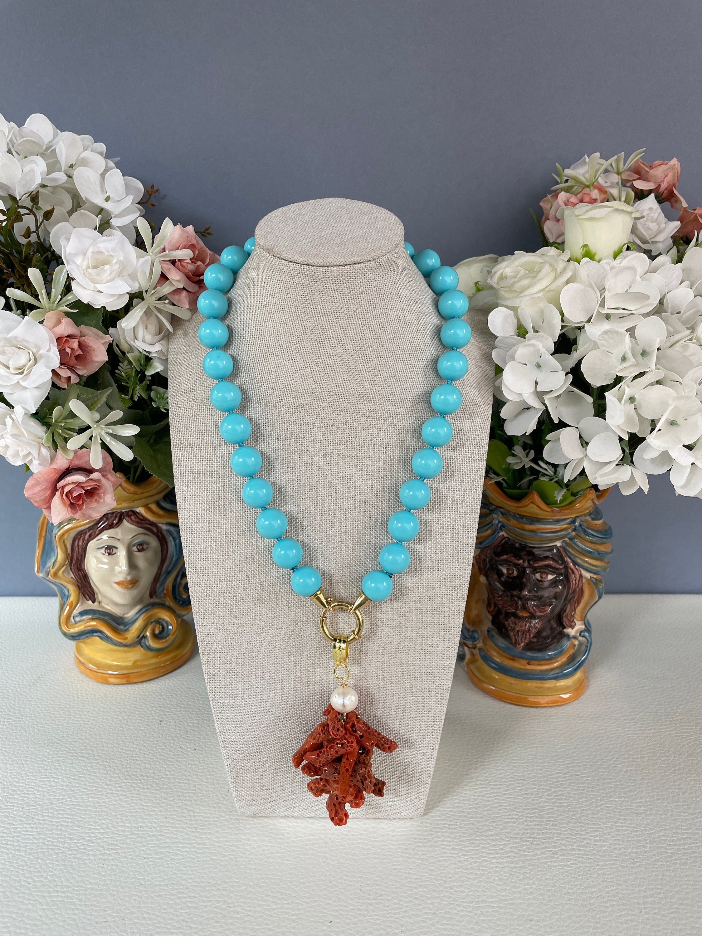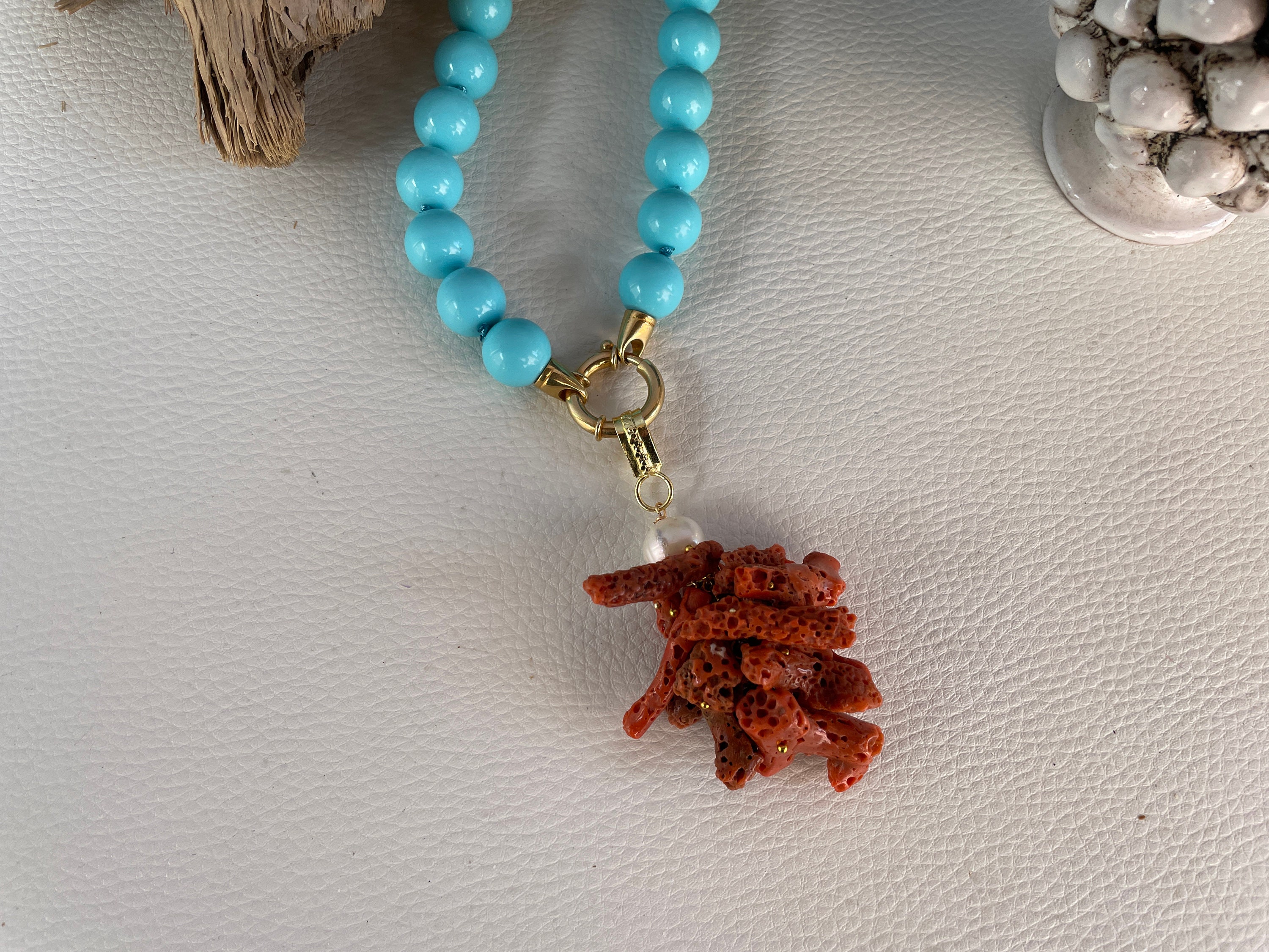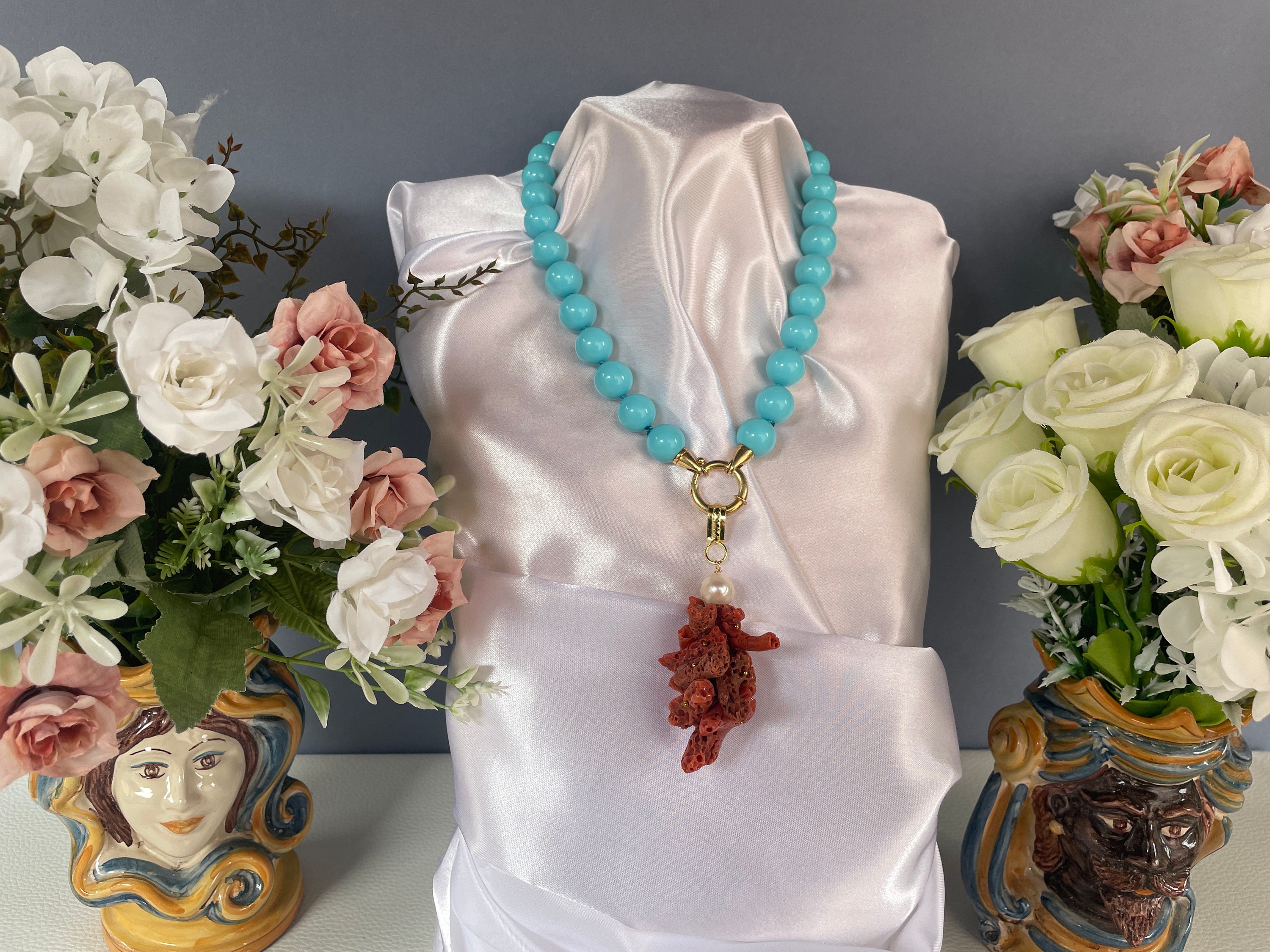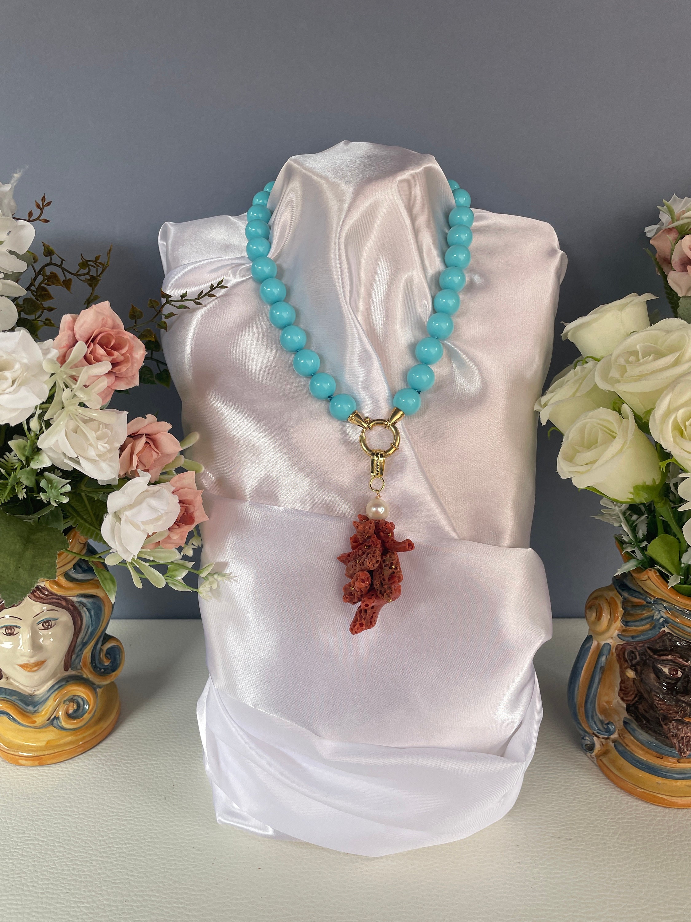 La collana è completata da un bellissimo ciondolo realizzato con pezzi grossi di Corallo autentico del Mediterraneo.