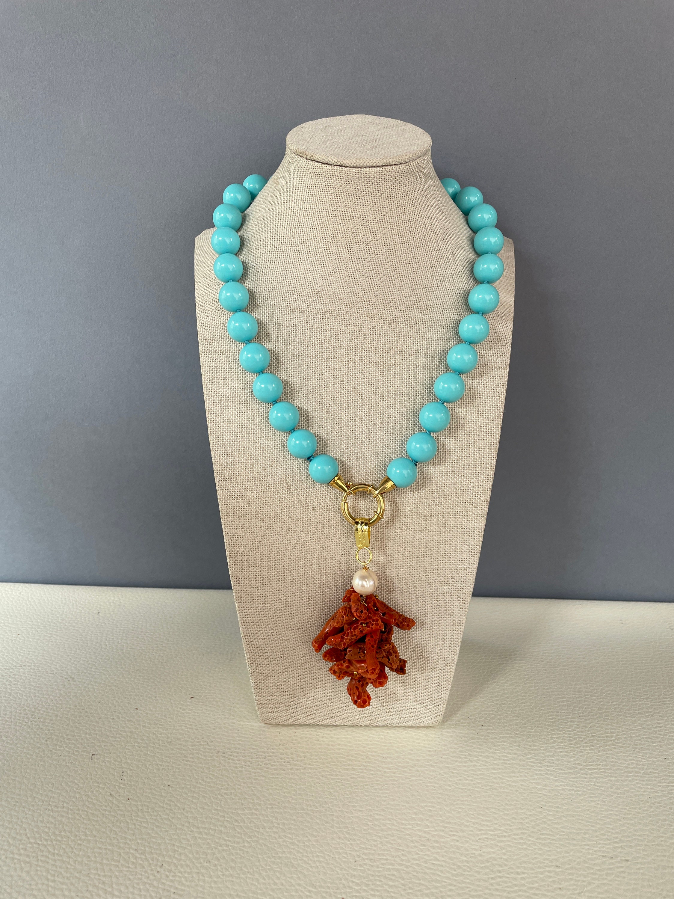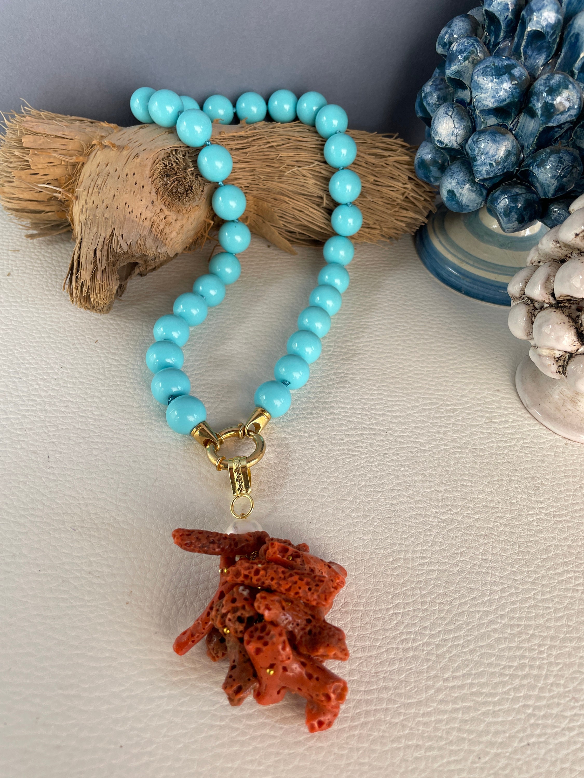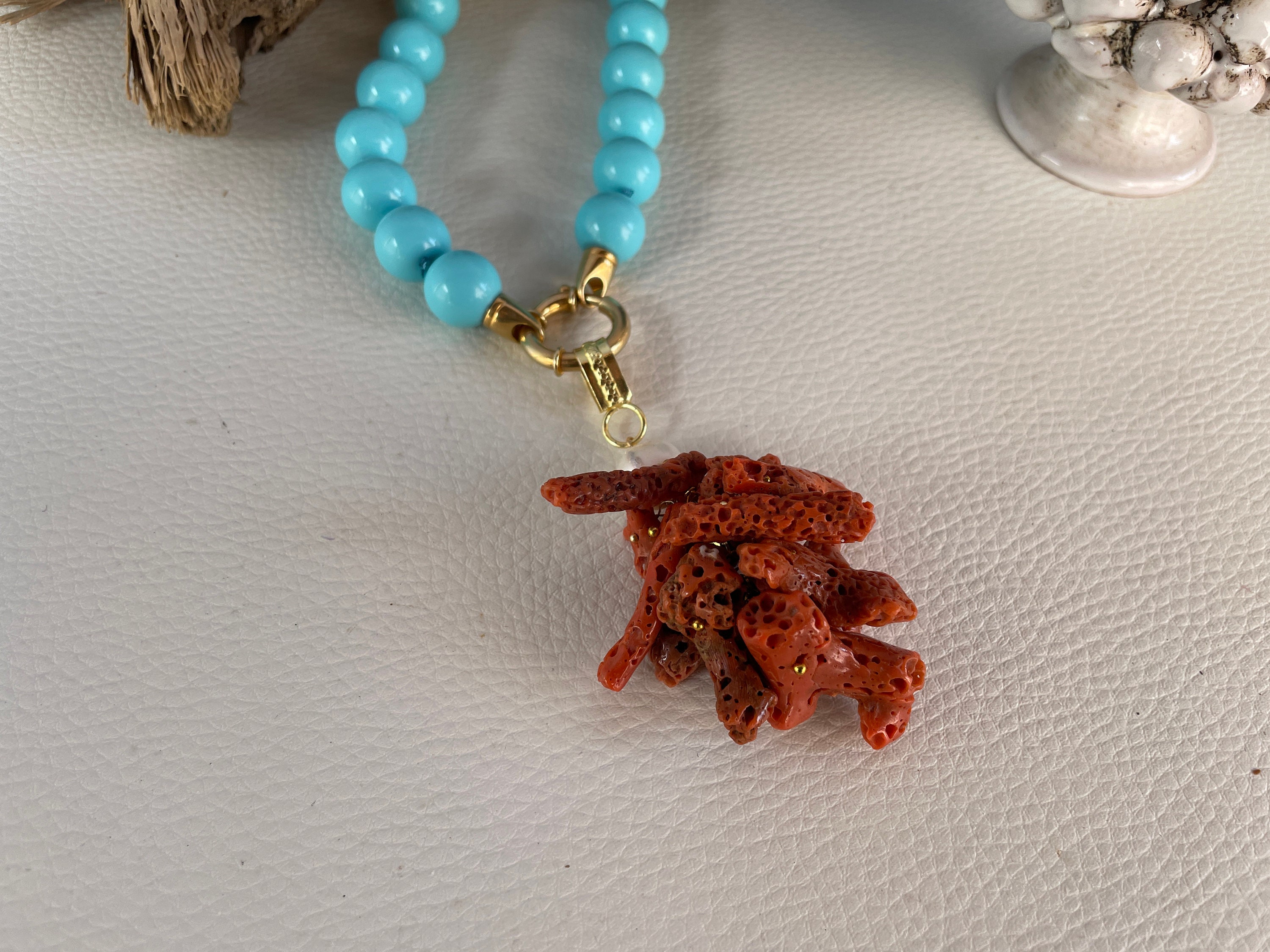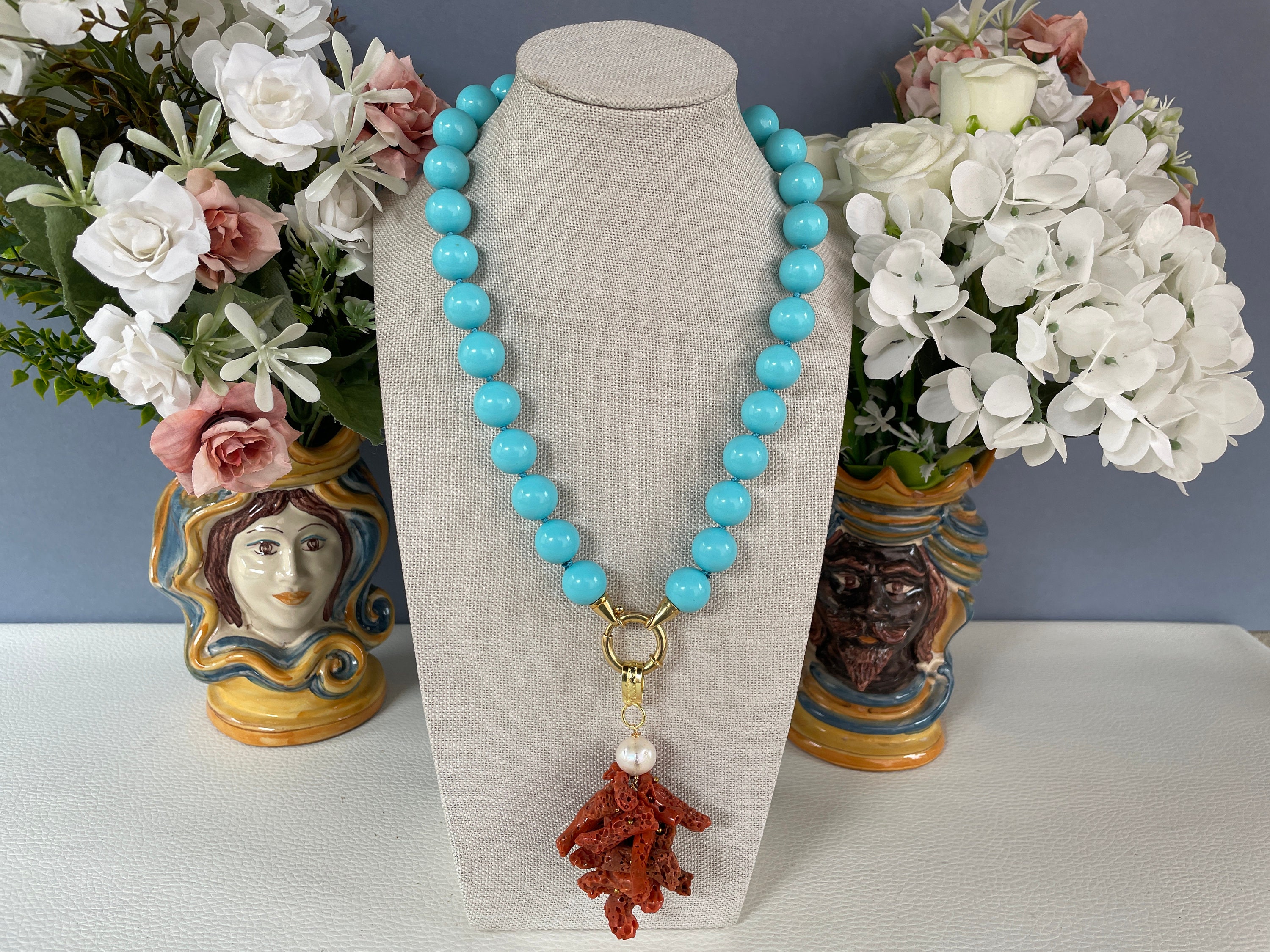 La collana è completata da un bellissimo ciondolo realizzato con pezzi grossi di Corallo autentico del Mediterraneo.