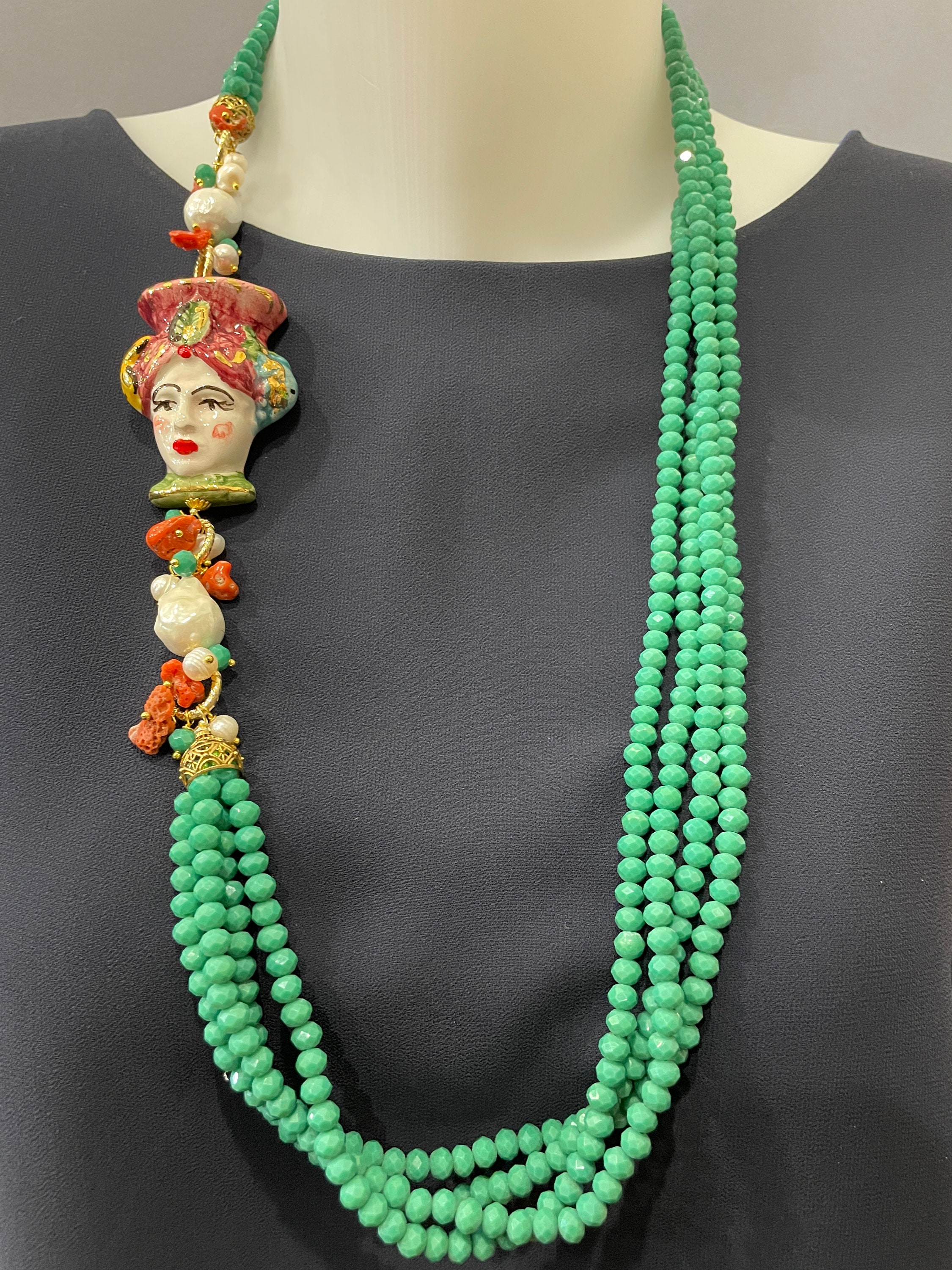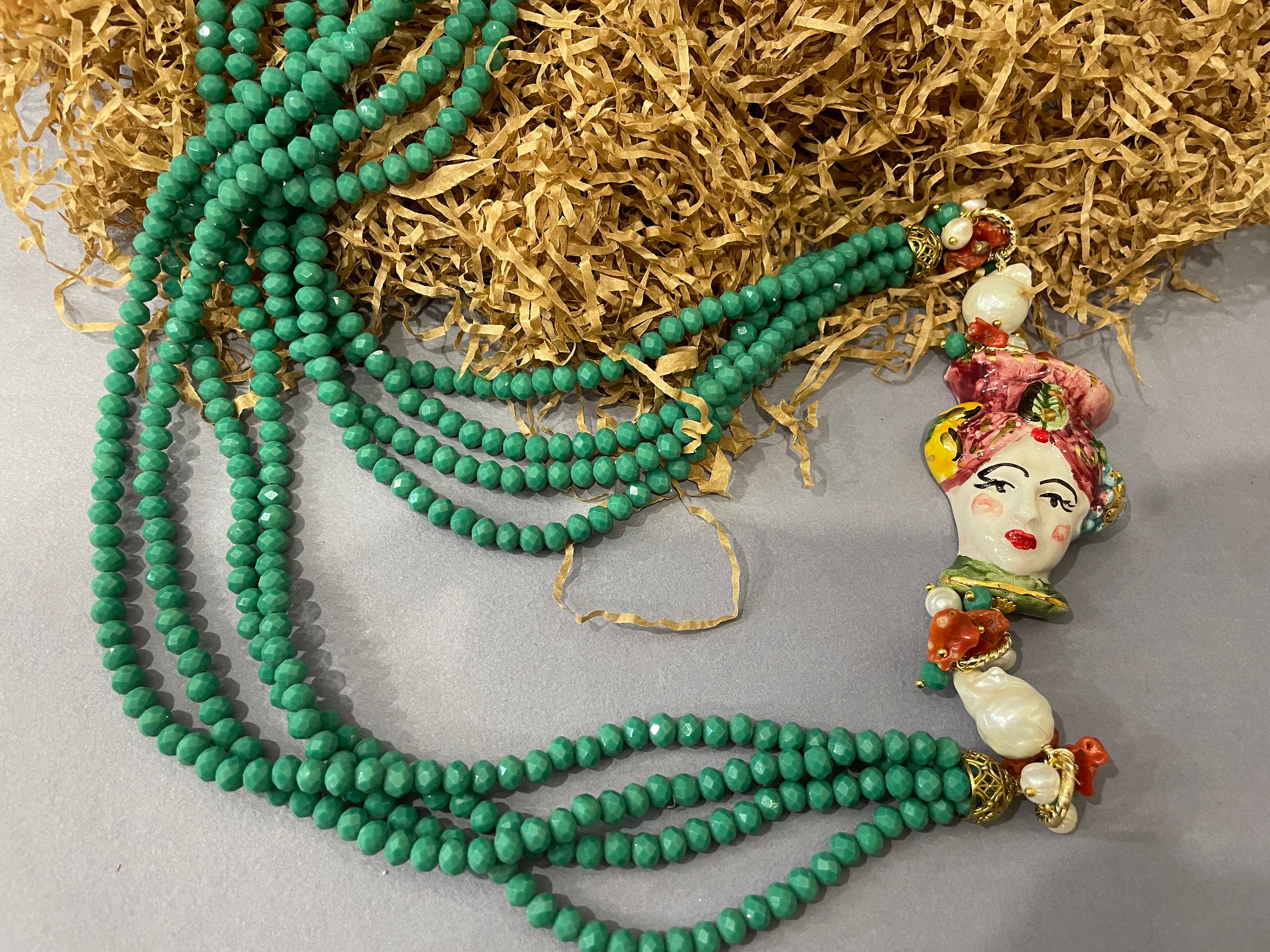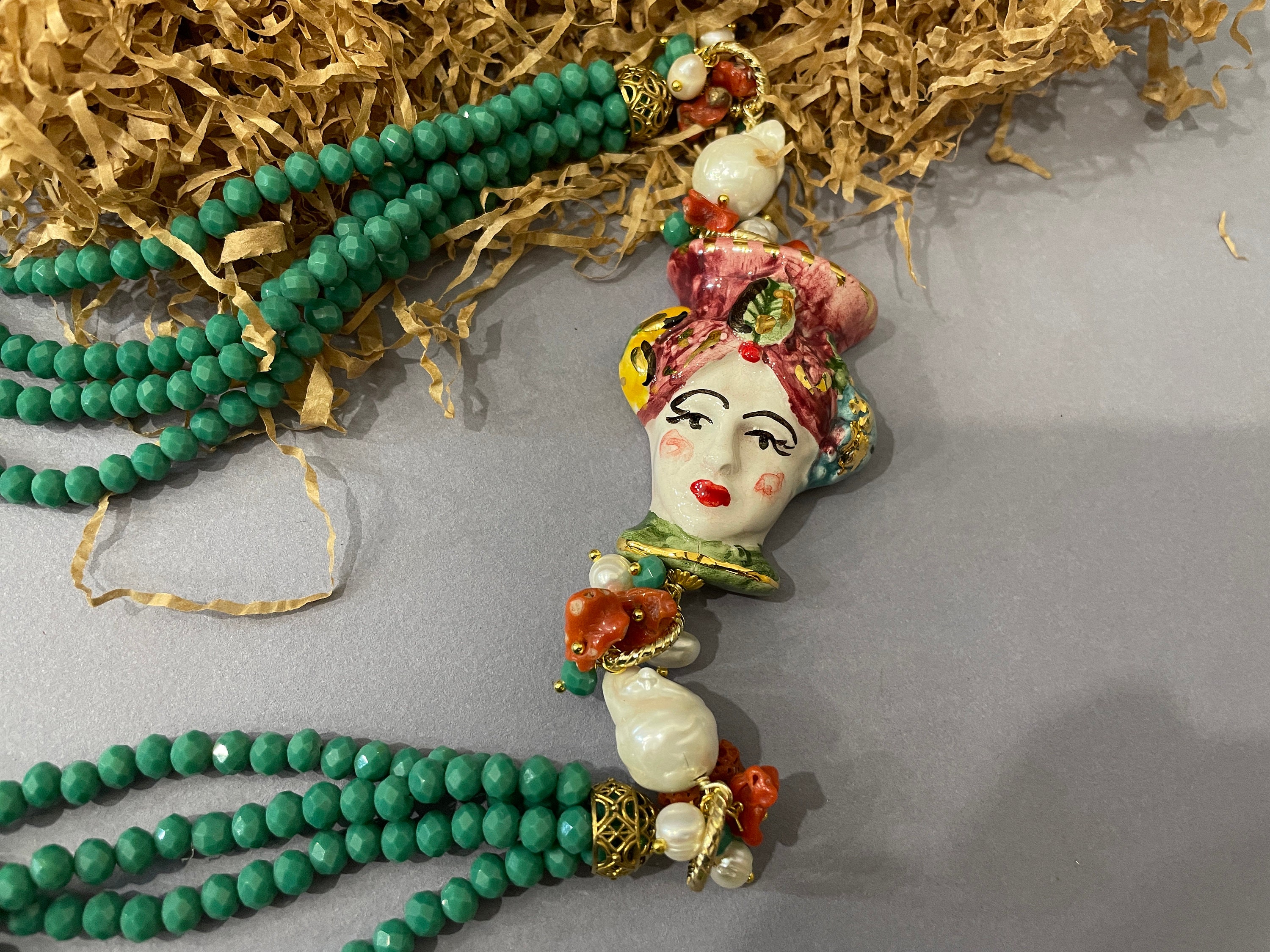 Completa il gioiello un elemento in ceramica di Caltagirone, raffigurante Testa di Moro, dipinto a mano.