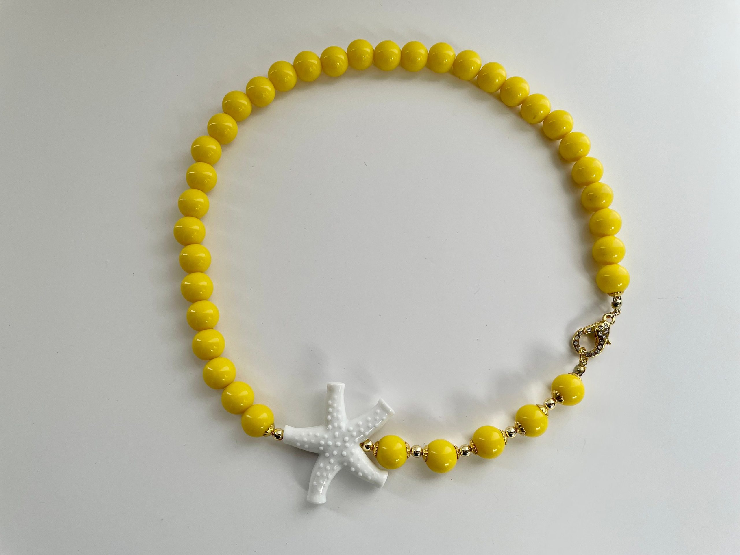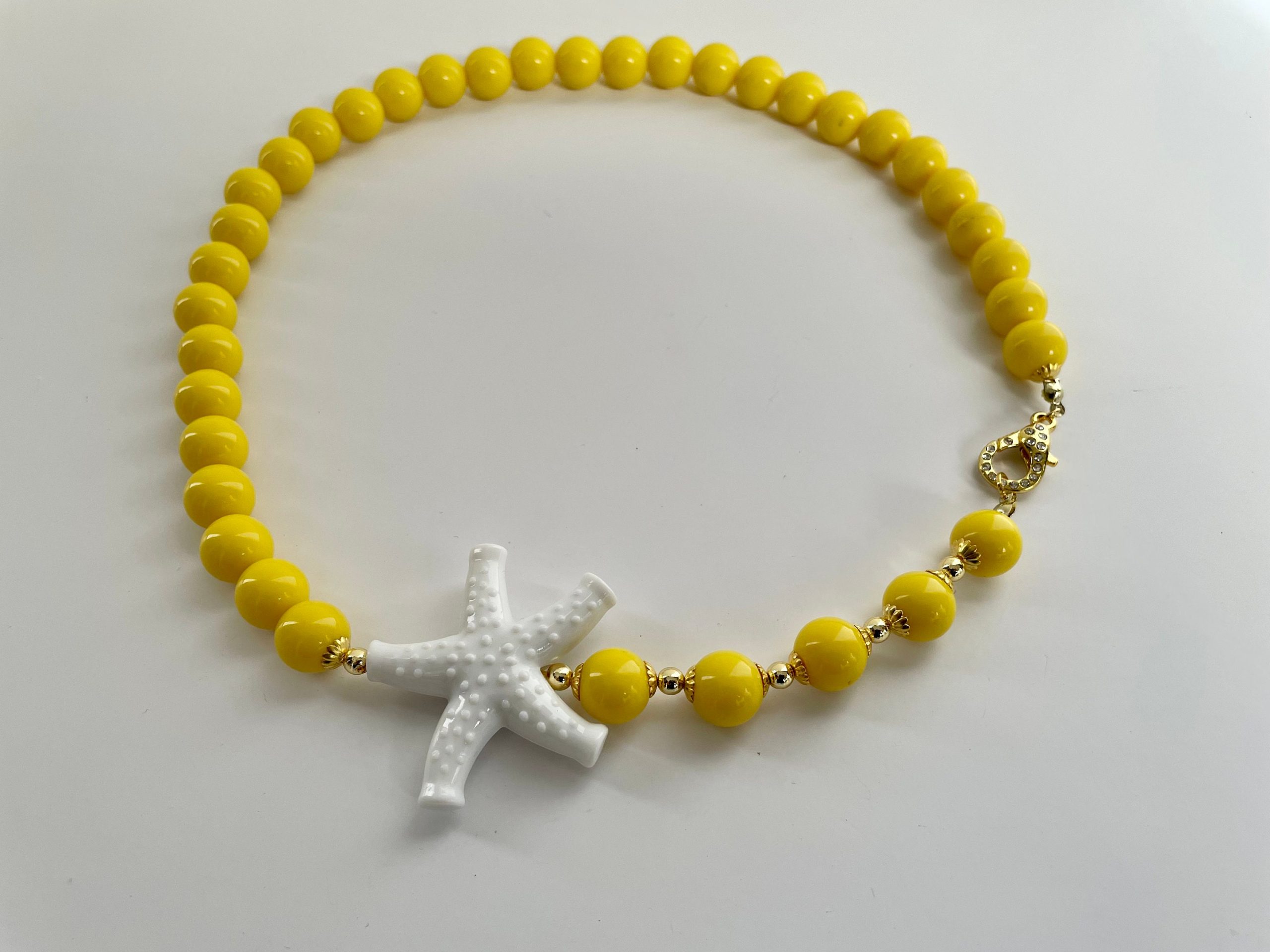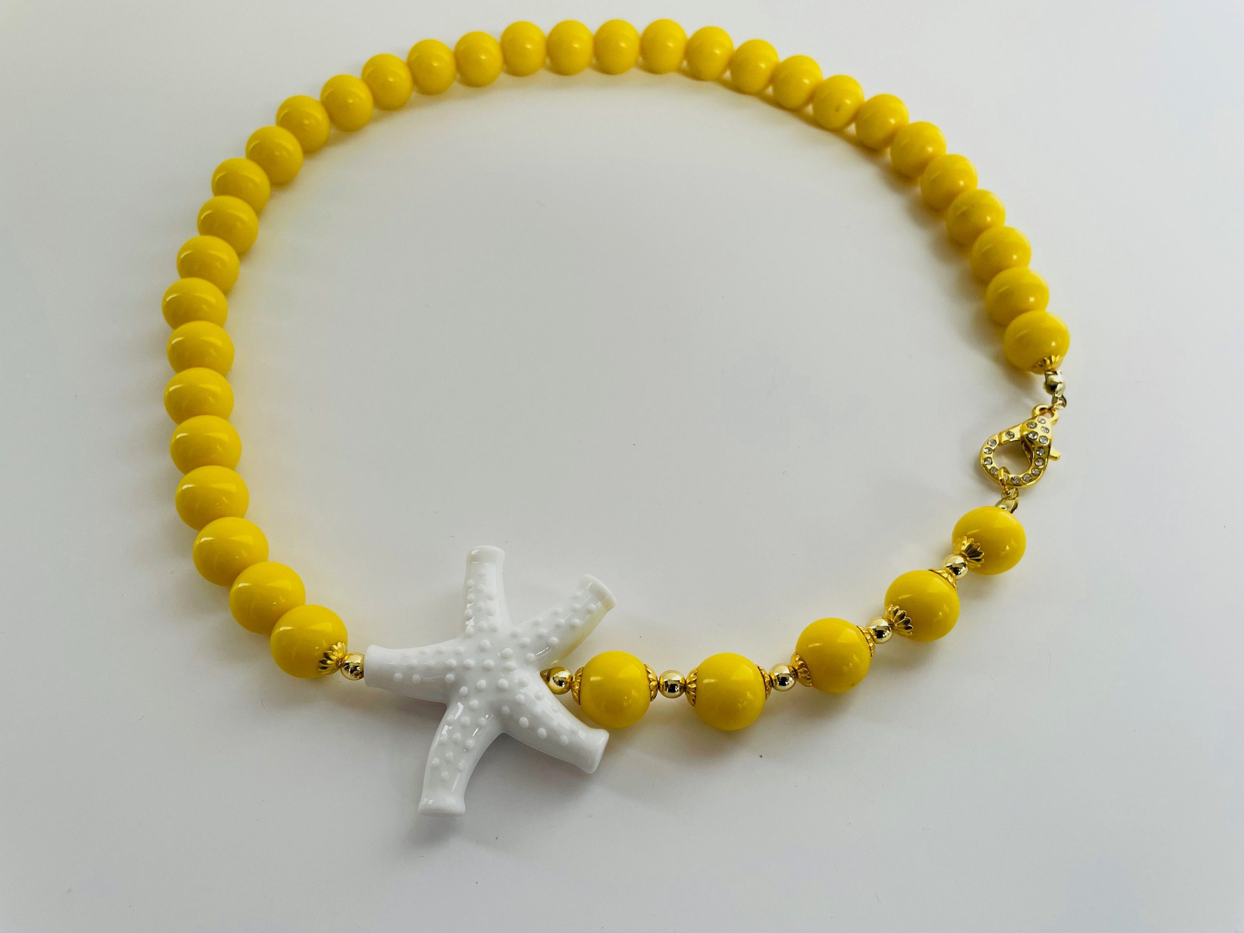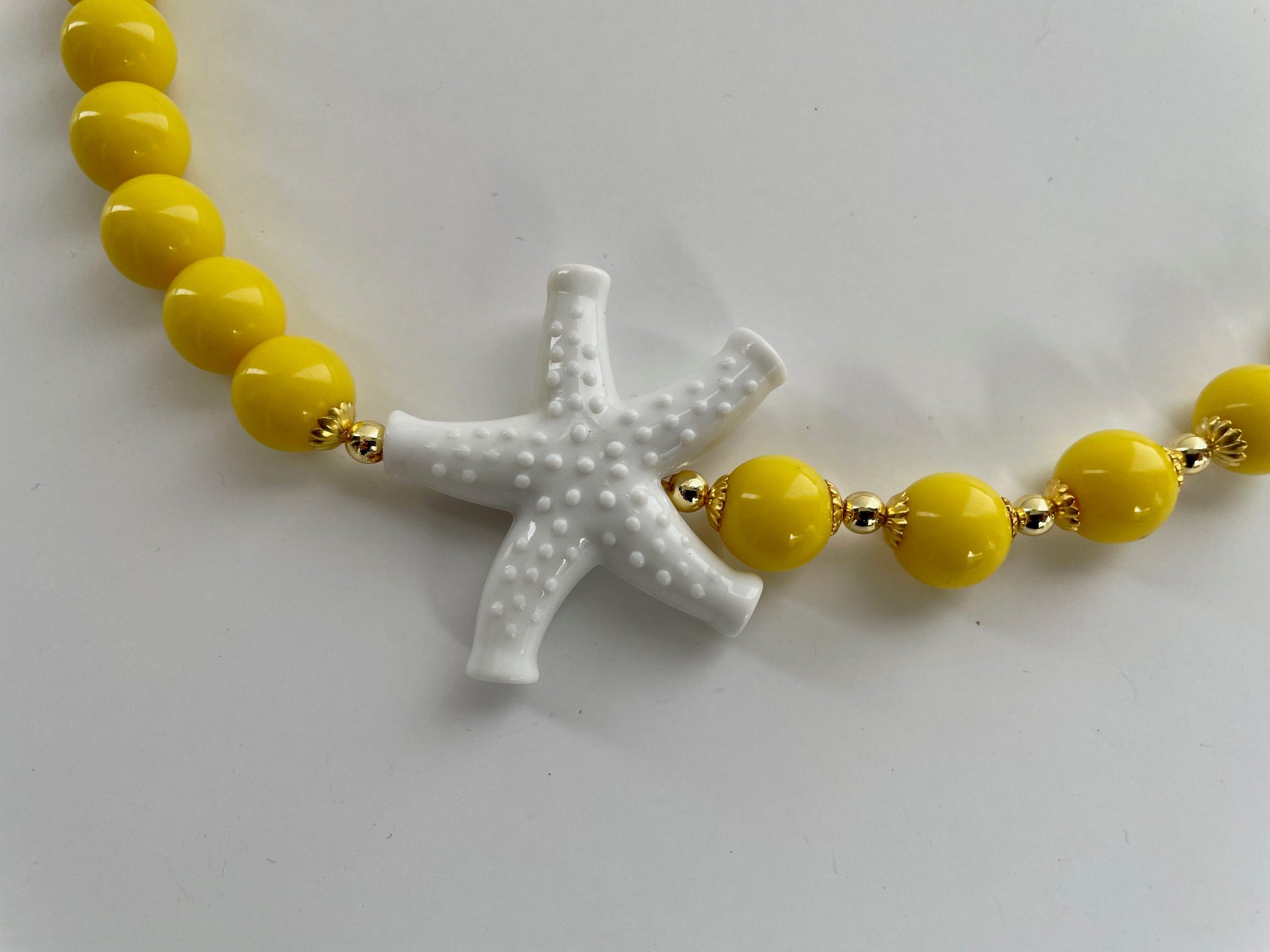 Collana corta gialla con un connettore a forma di stella marina bianco.
