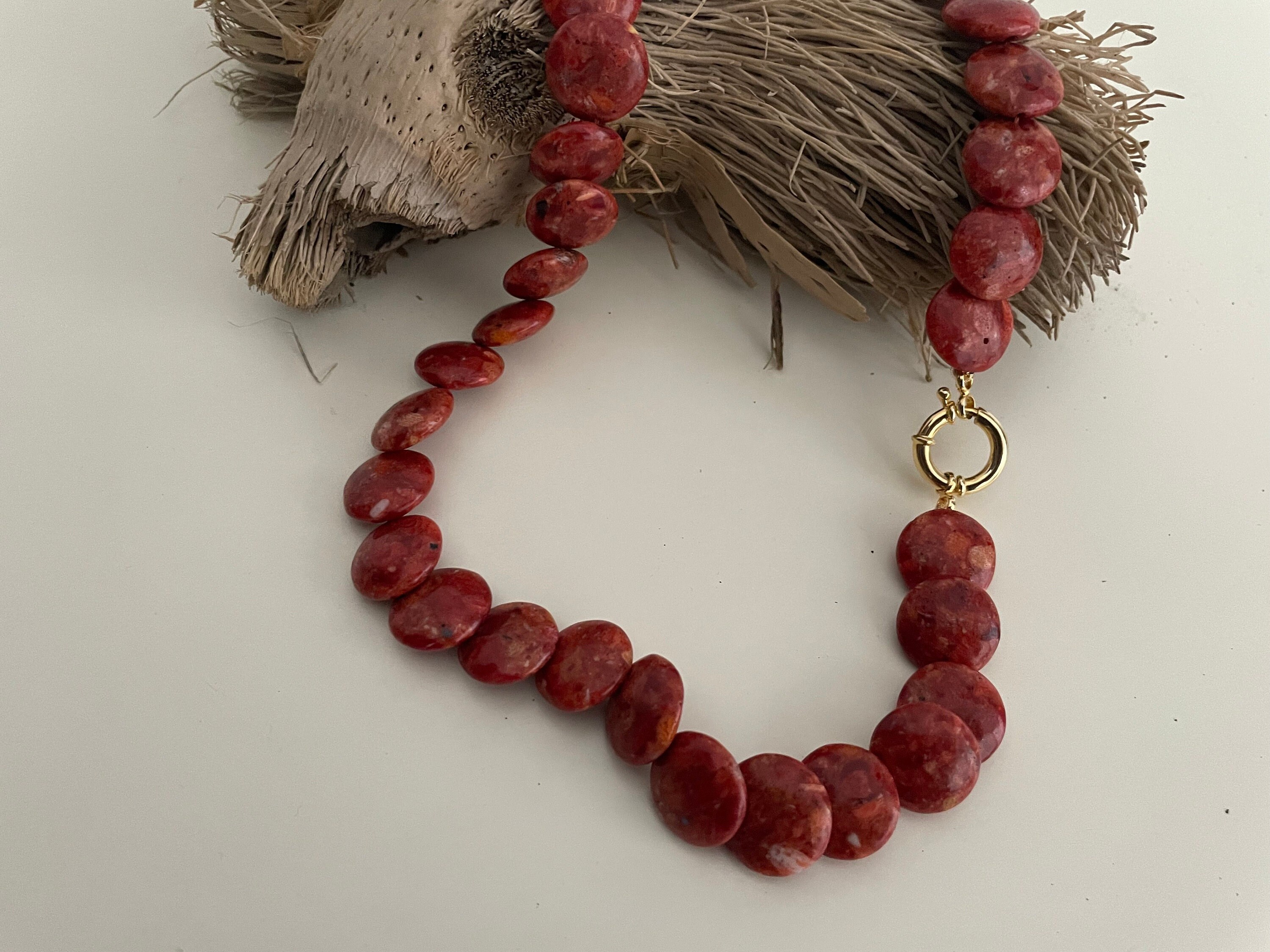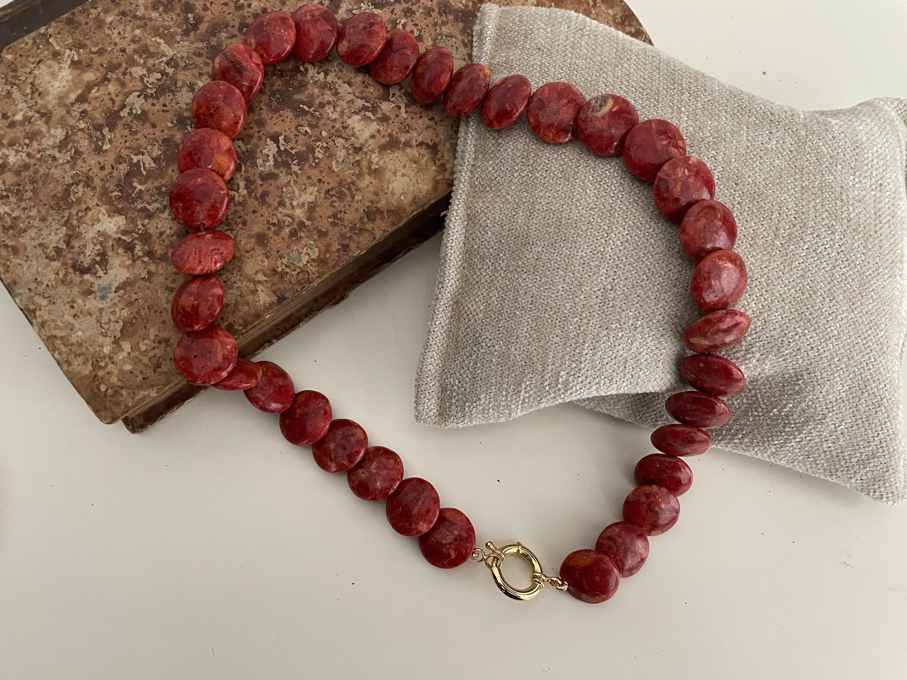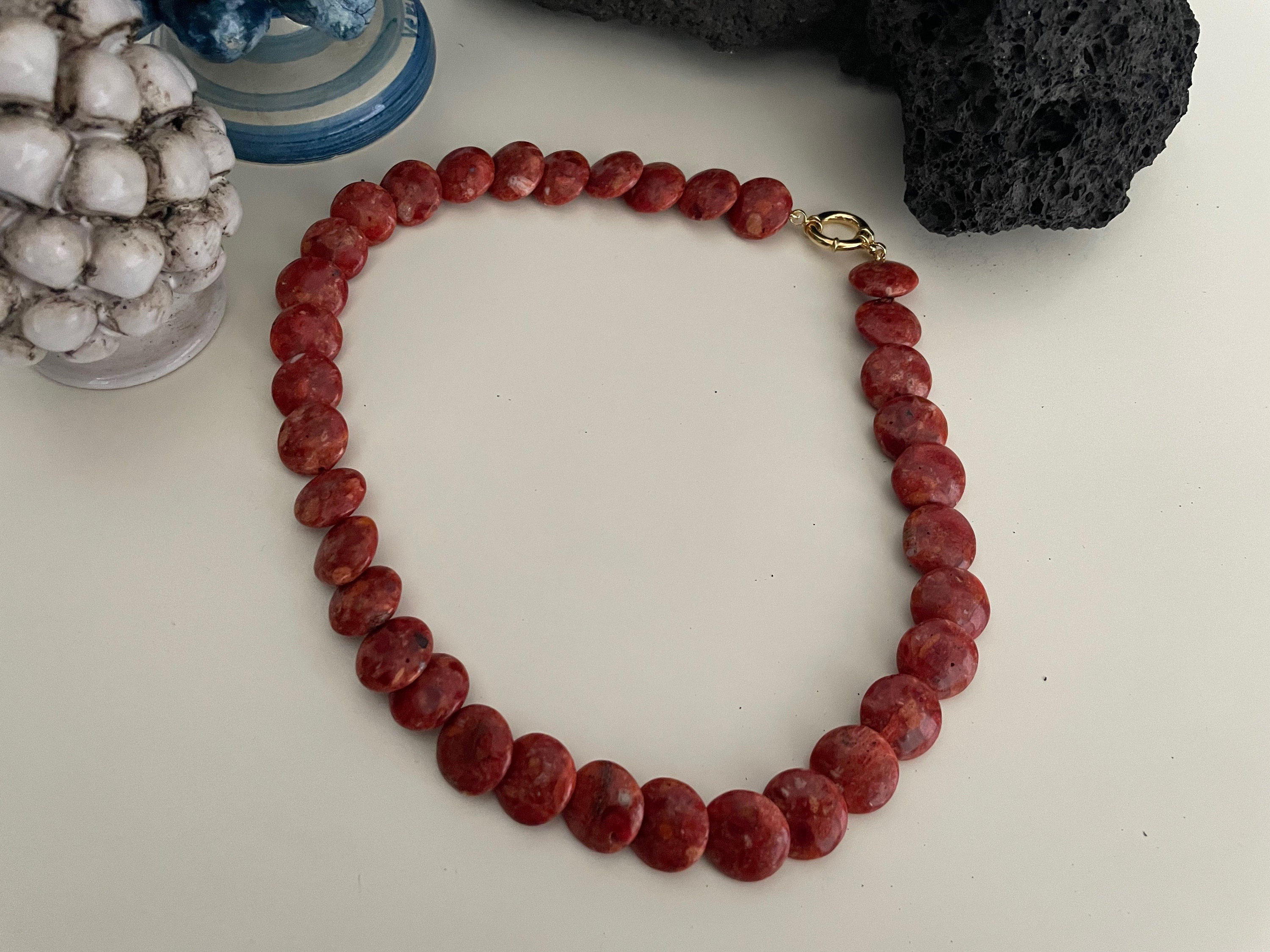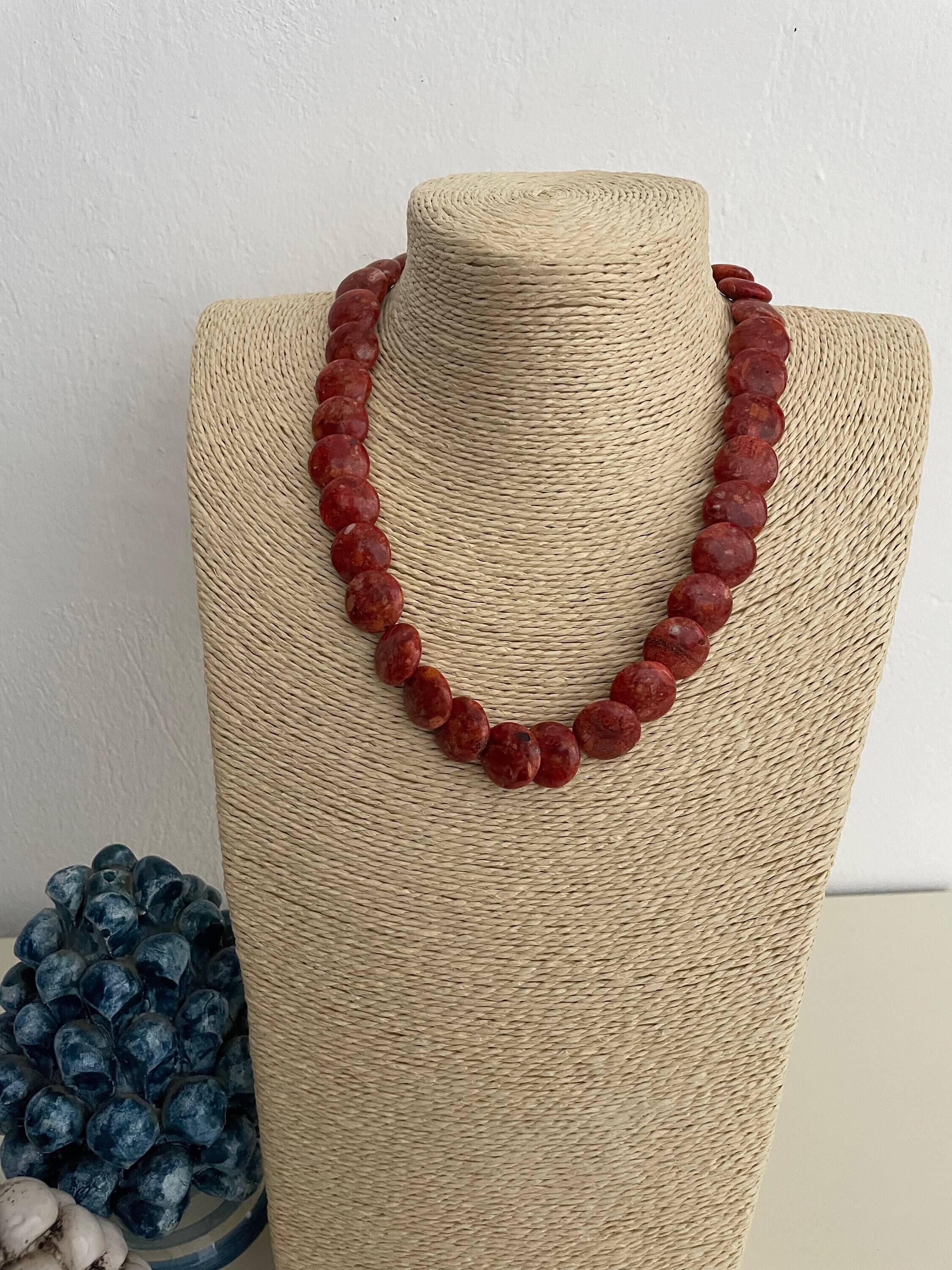 Collana girocollo dal fascino intramontabile con filo di grandi perle di Madrepora rossa a moneta.