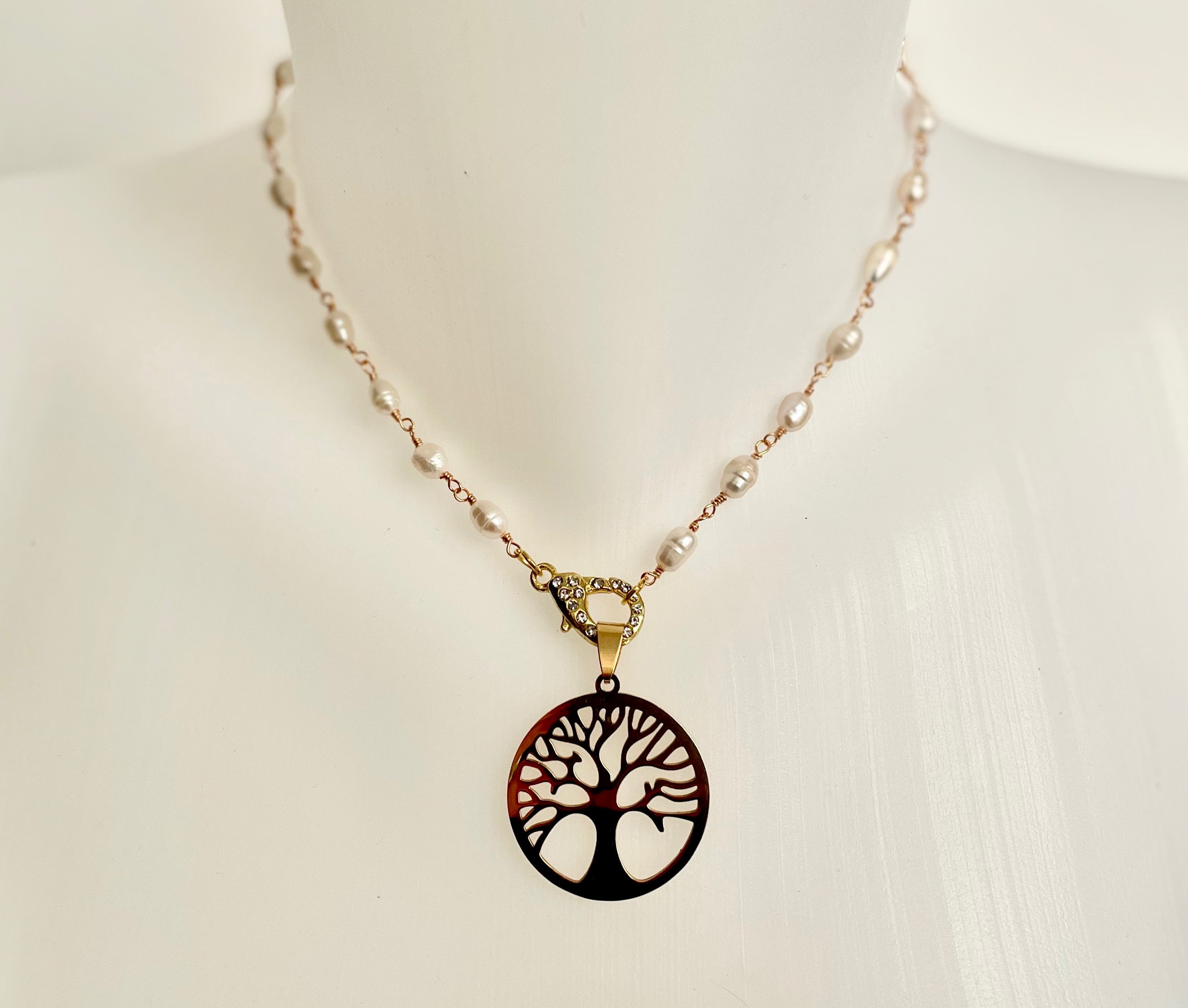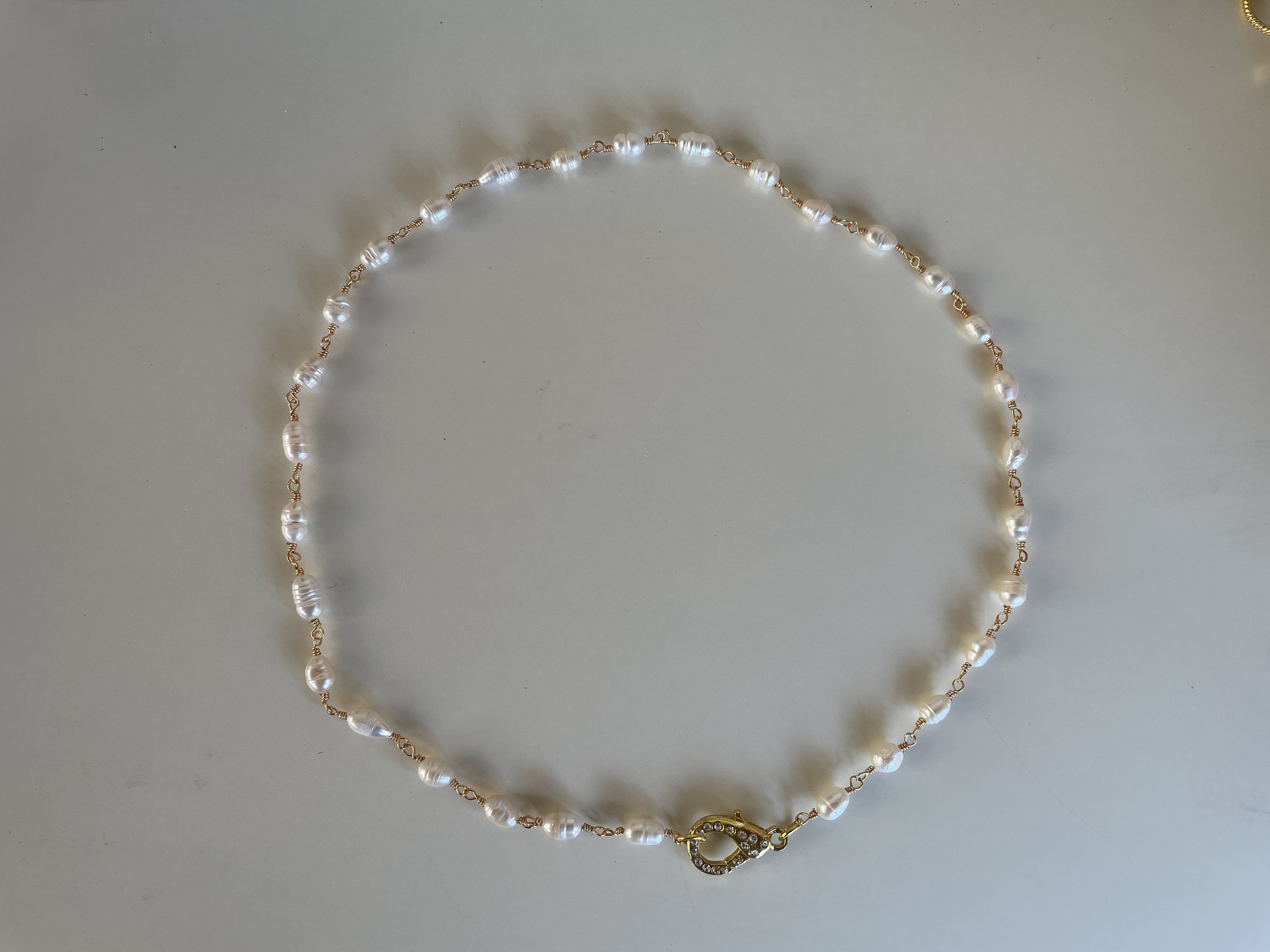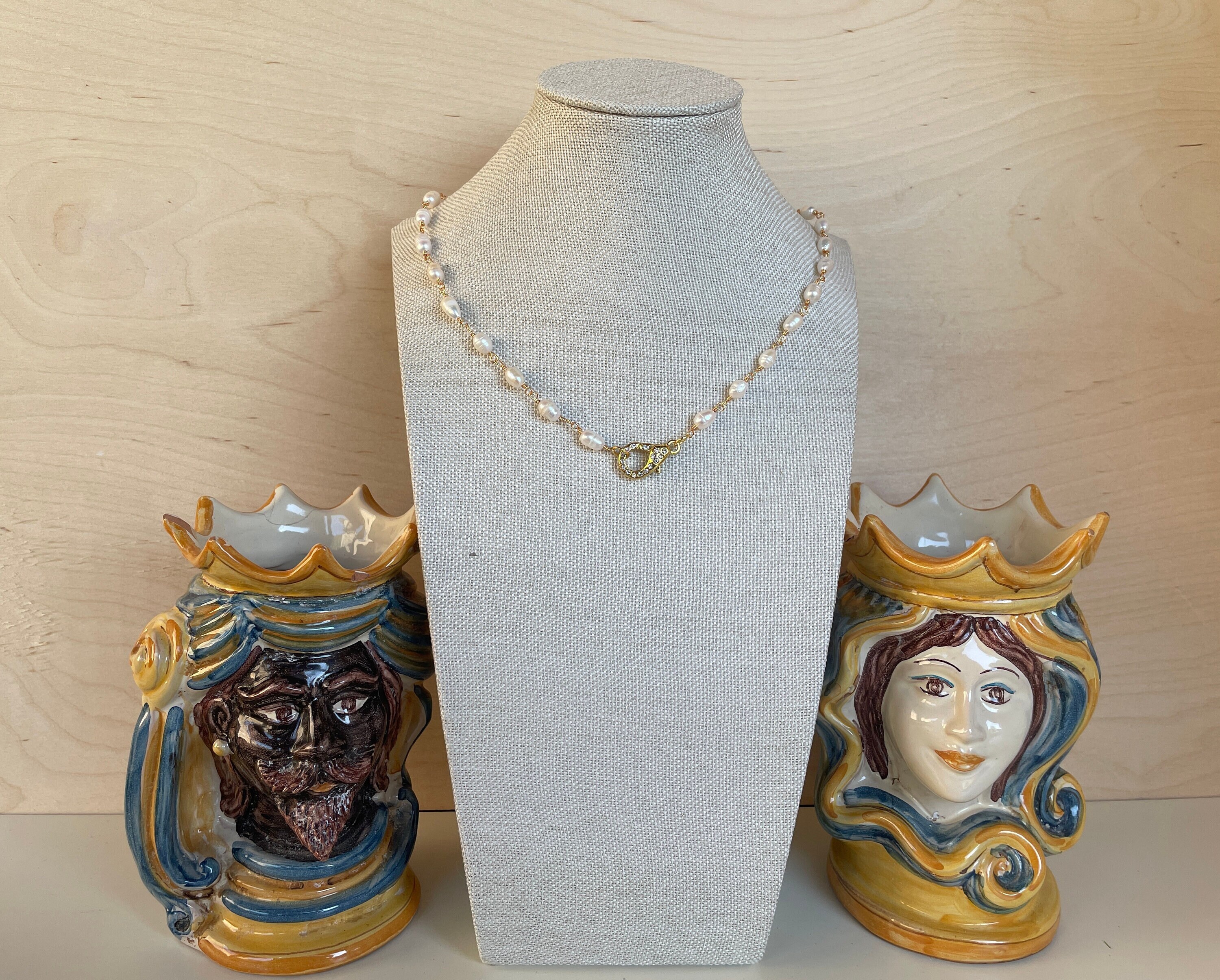 Collana classica e sobria e dal gusto intramontabile realizzata con perle di fiume legate da un filo di ottone dorato.