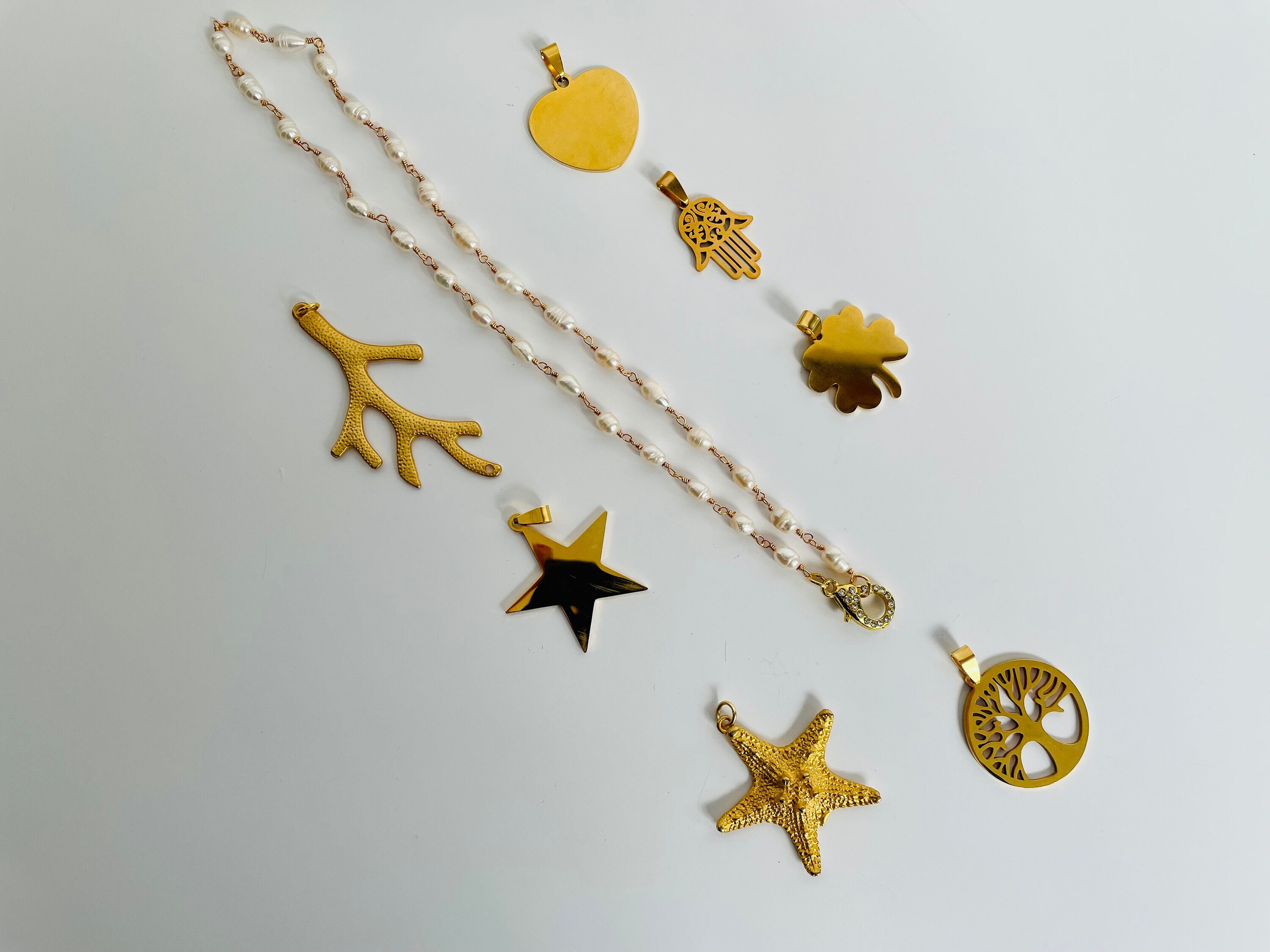 Noi vi proponiamo alcuni ciondoli che sono visibili in foto e tutti, tranne il #D che è in Zama oro, sono di acciaio inossidabile 316L, placcato oro 18k.