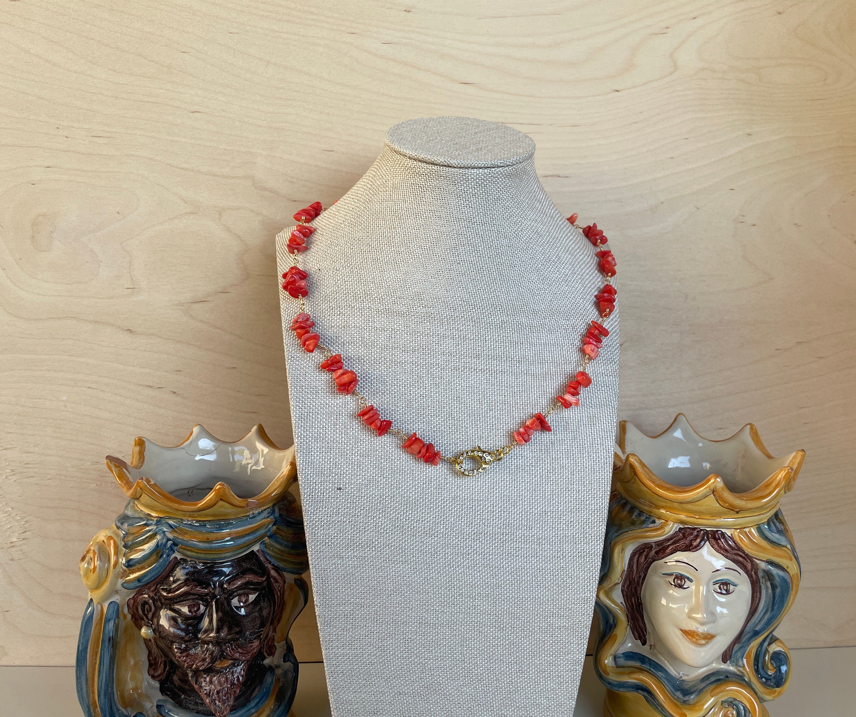 Collana girocollo semplice e di buon gusto realizzata con chips di pasta di corallo rosso chiaro legati da filo di ottone dorato.