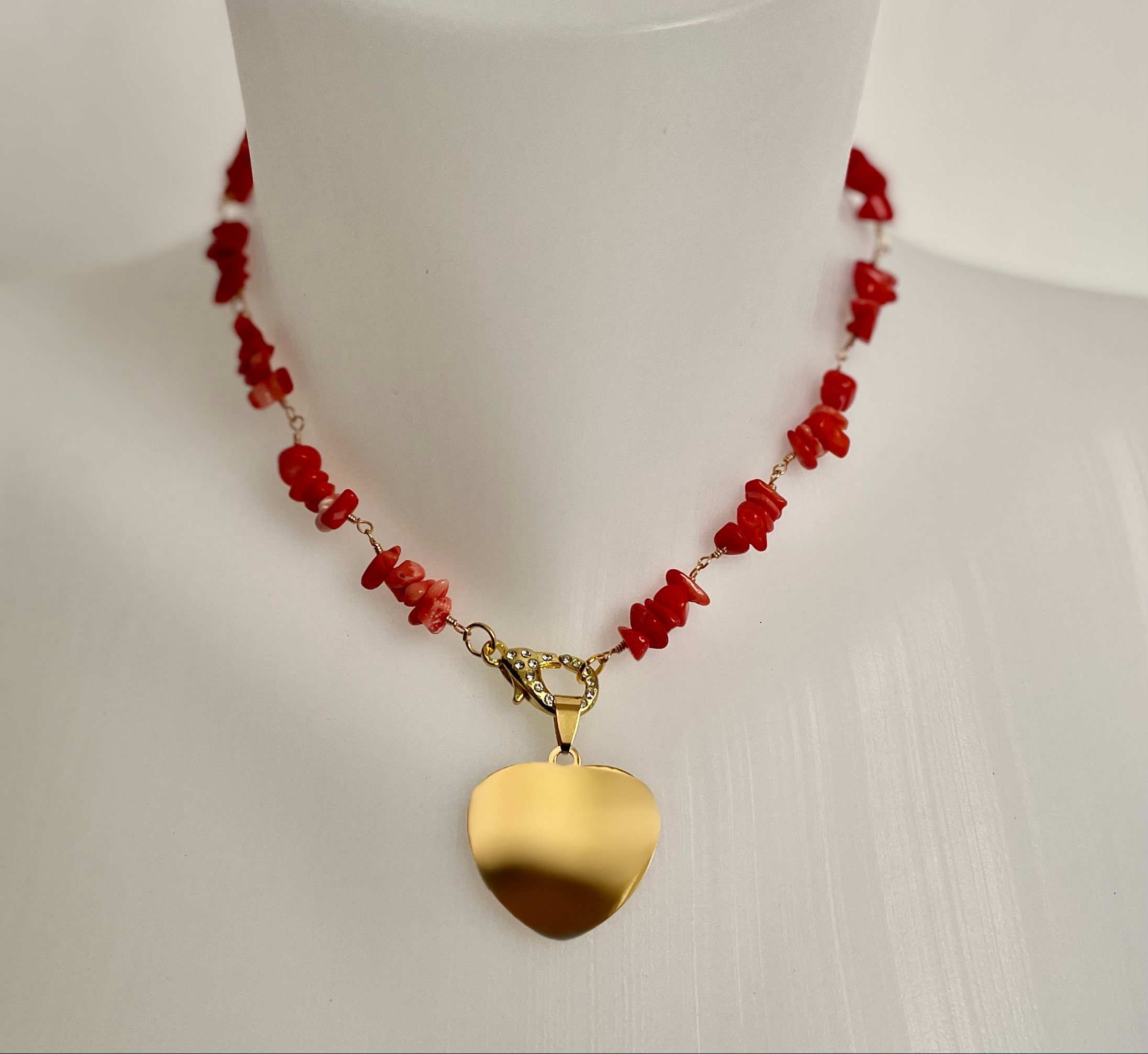 Collana di chips di corallo, collana rosario ottone e pasta di corallo, collana girocollo, girocollo corallo con ciondolo, regalo laurea.