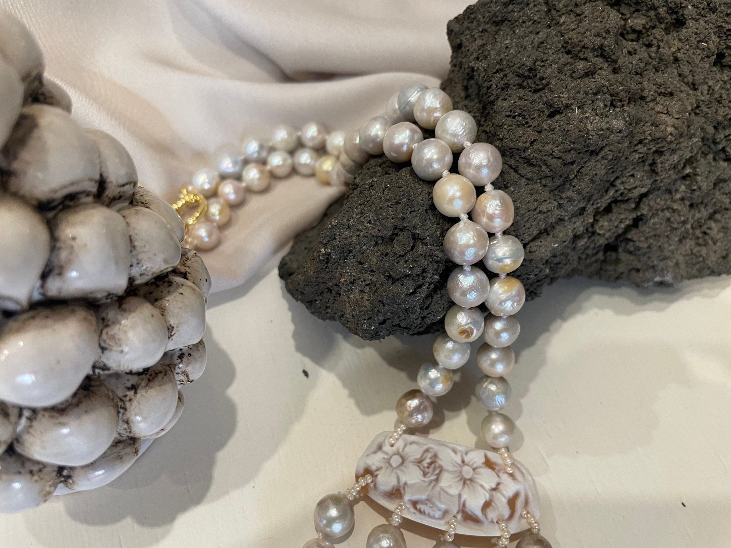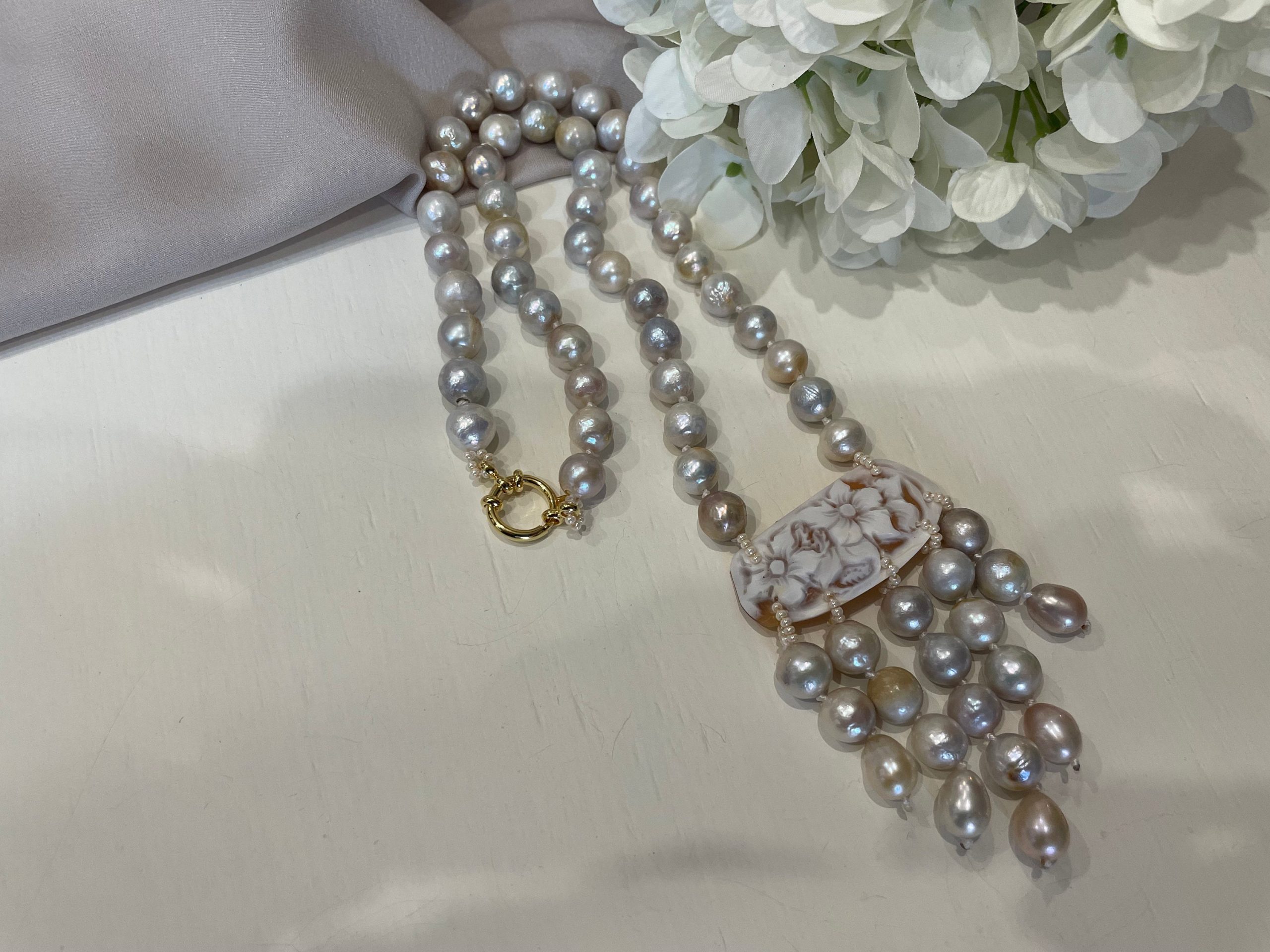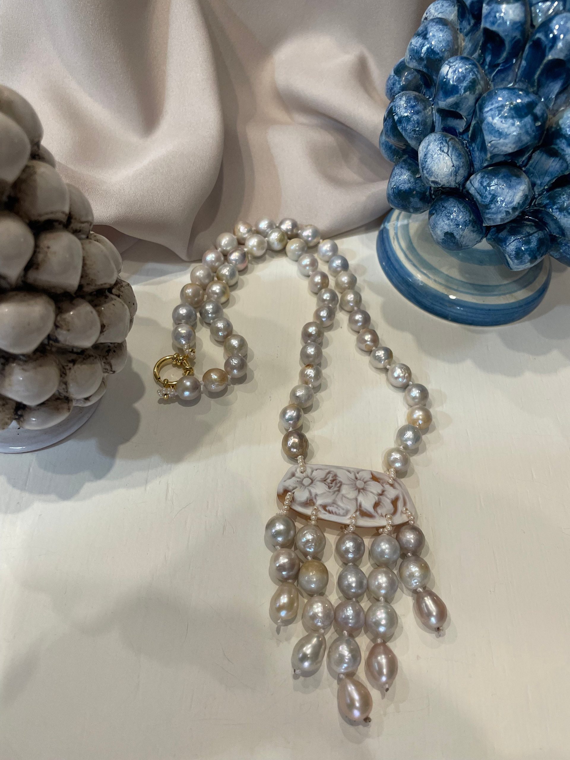 Un bel filo di perle barocche naturali tonde e leggermente rosate collegato a un Cammeo originale di conchiglia sardonica. Il Cammeo è decorato con motivi floreali.