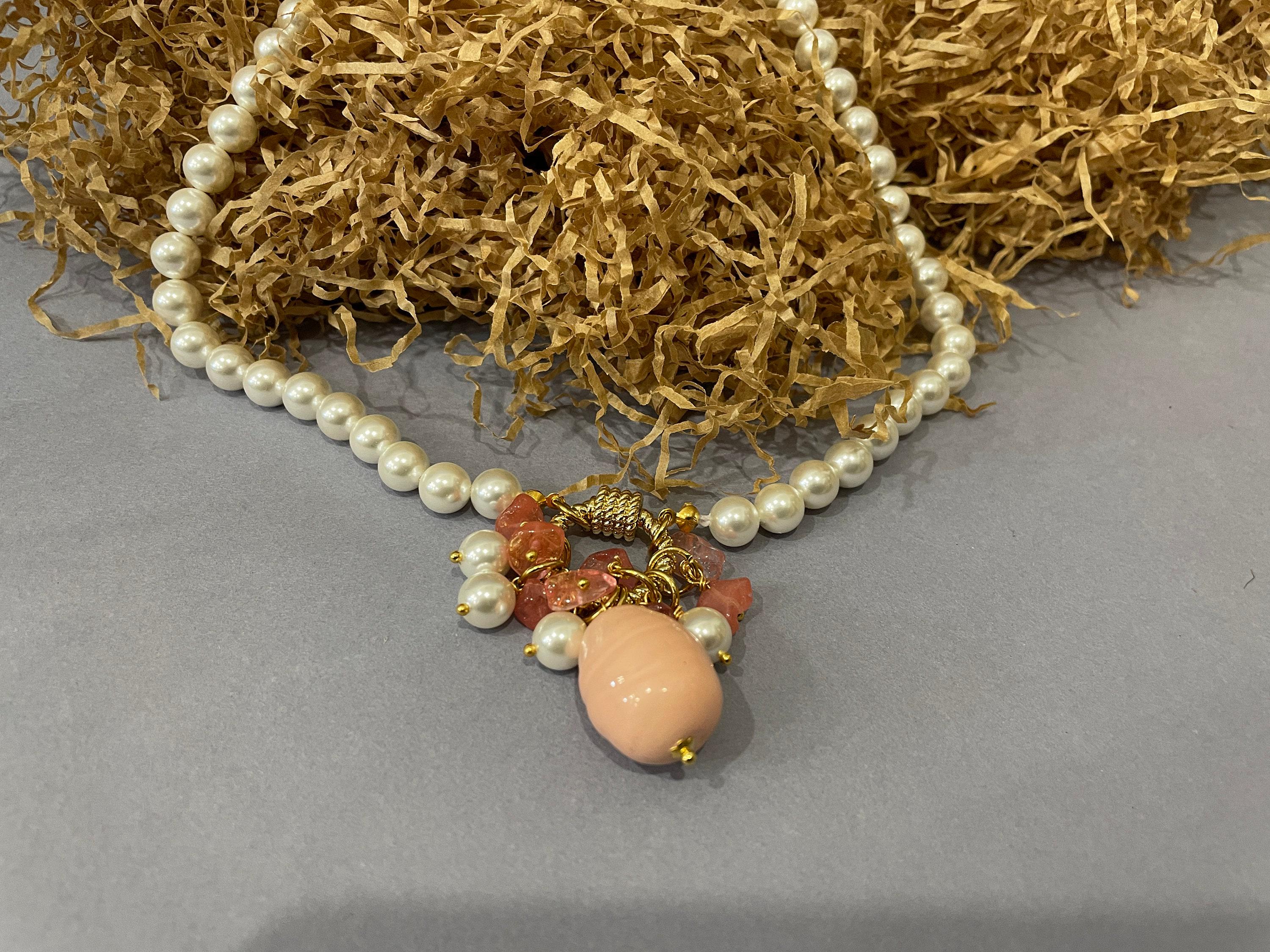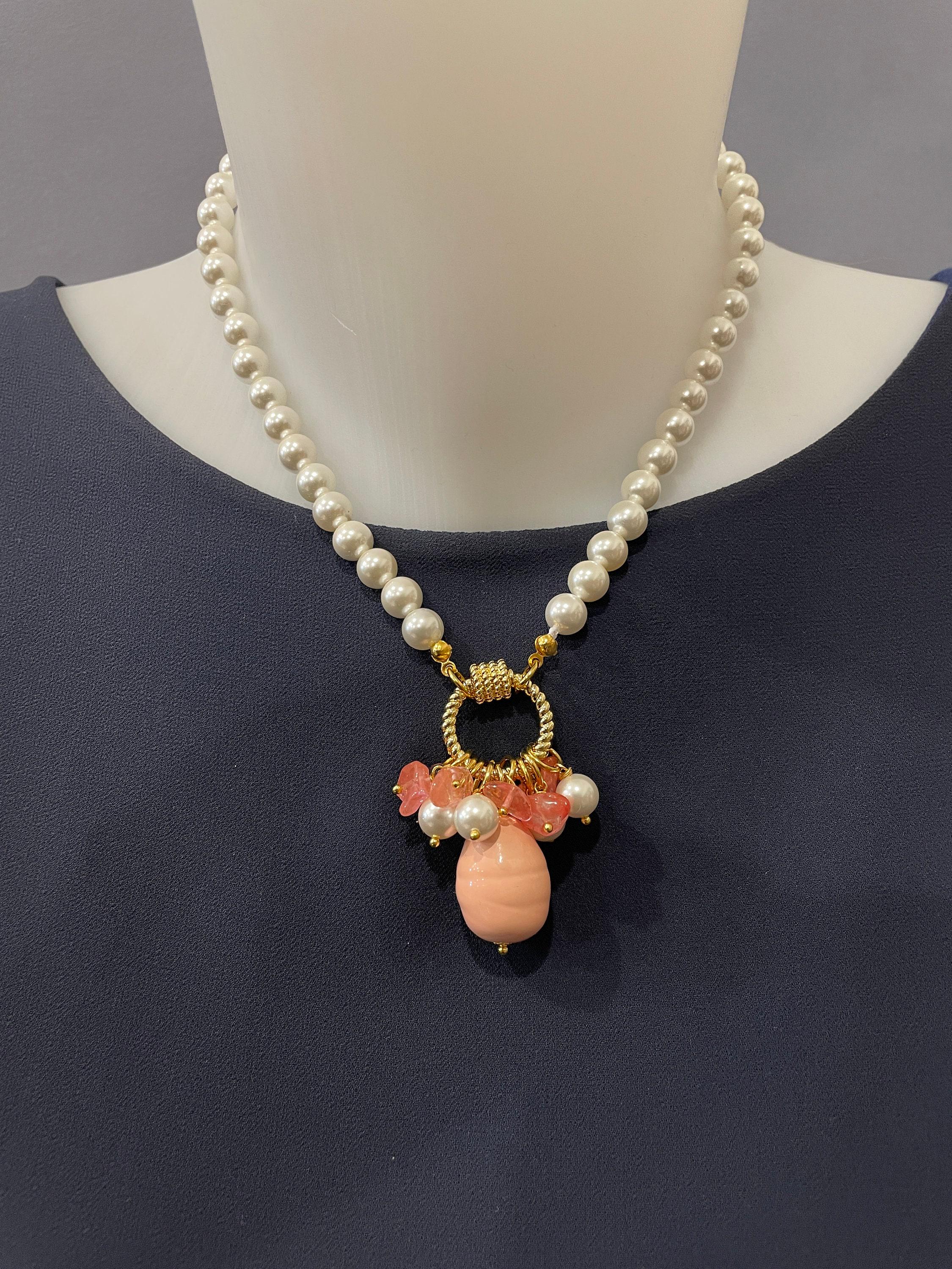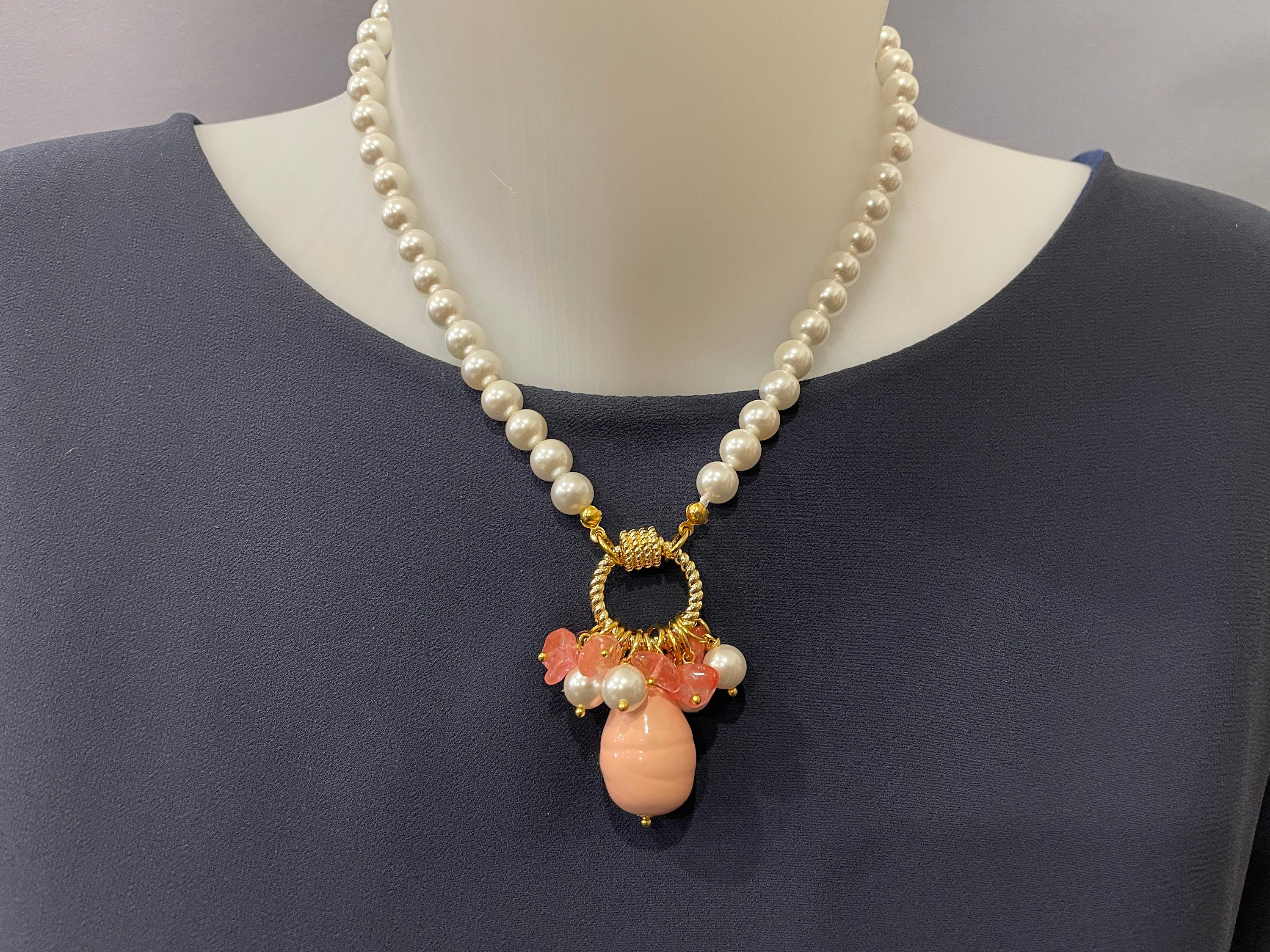 Collana di perle e Agata rosa, girocollo di perle di Maiorca, grande ciondolo a grappolo con perle di Agata rosa, regalo per lei.