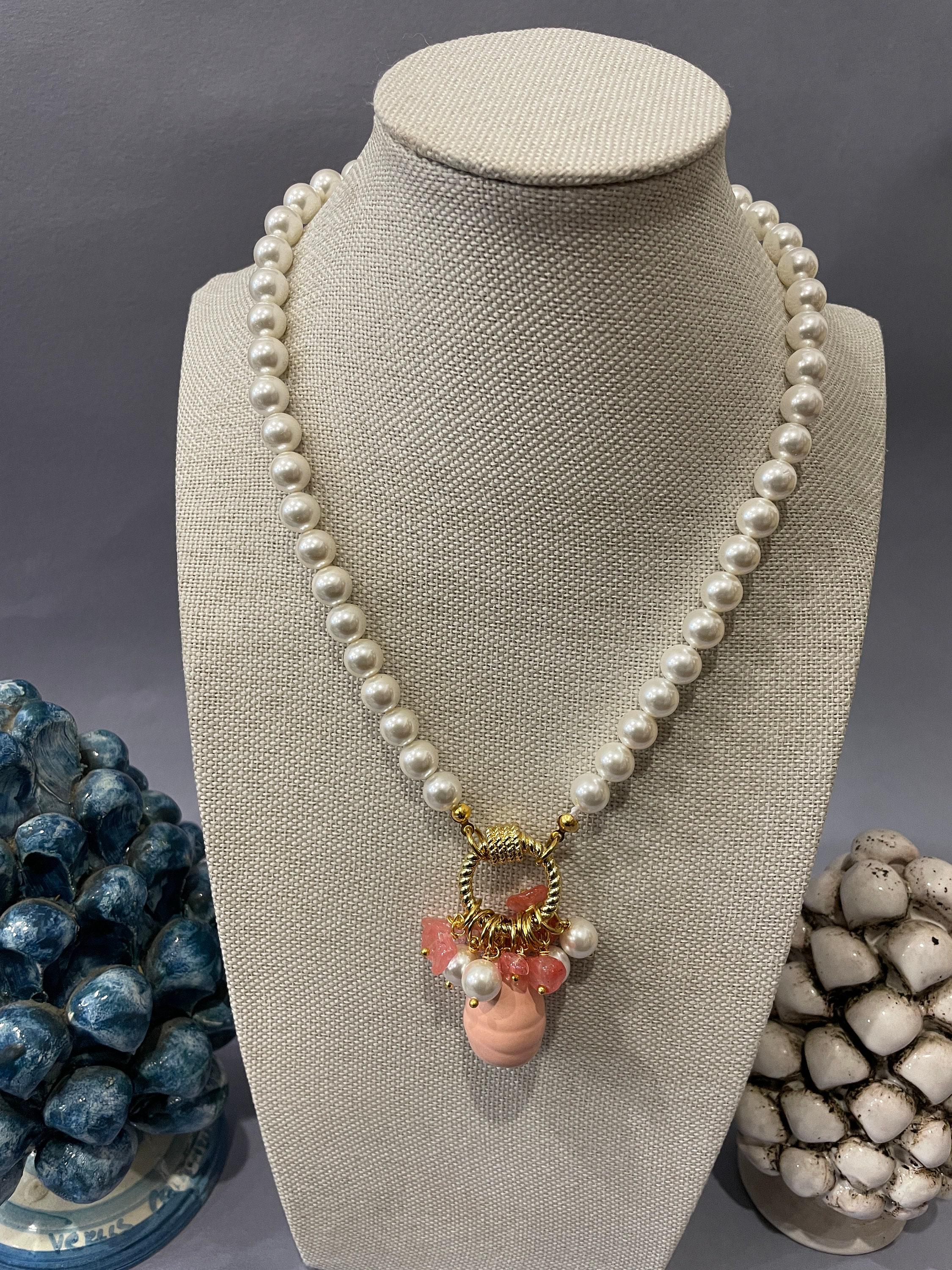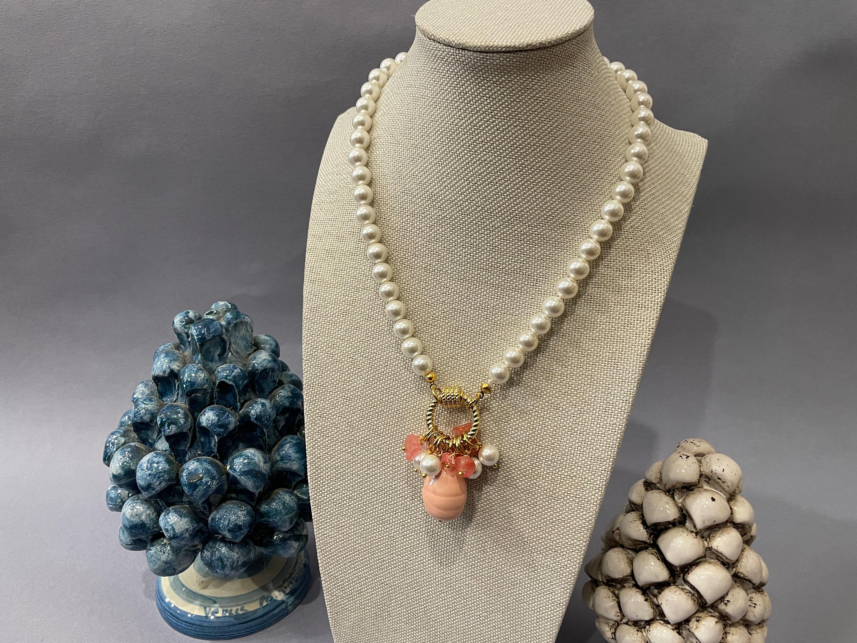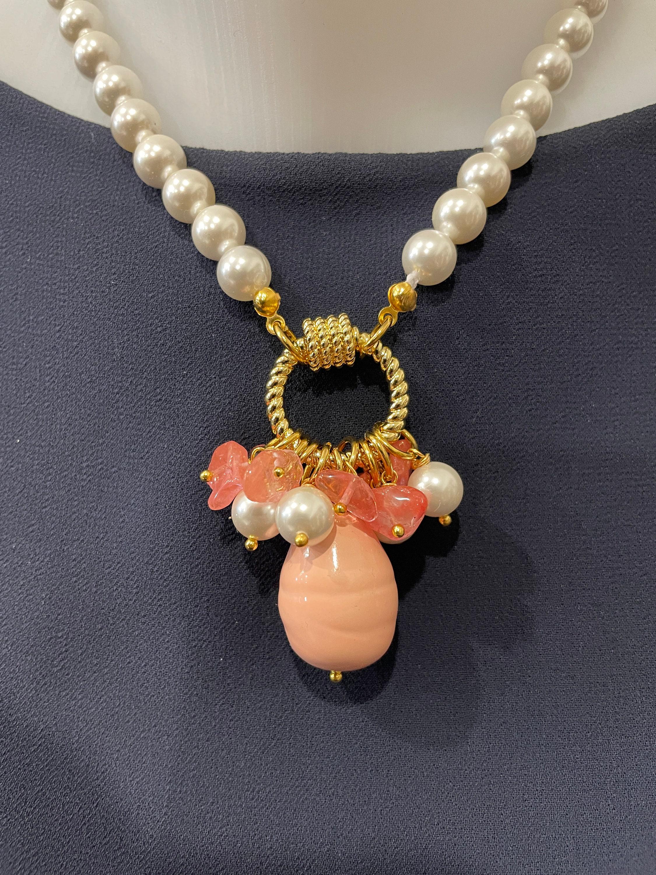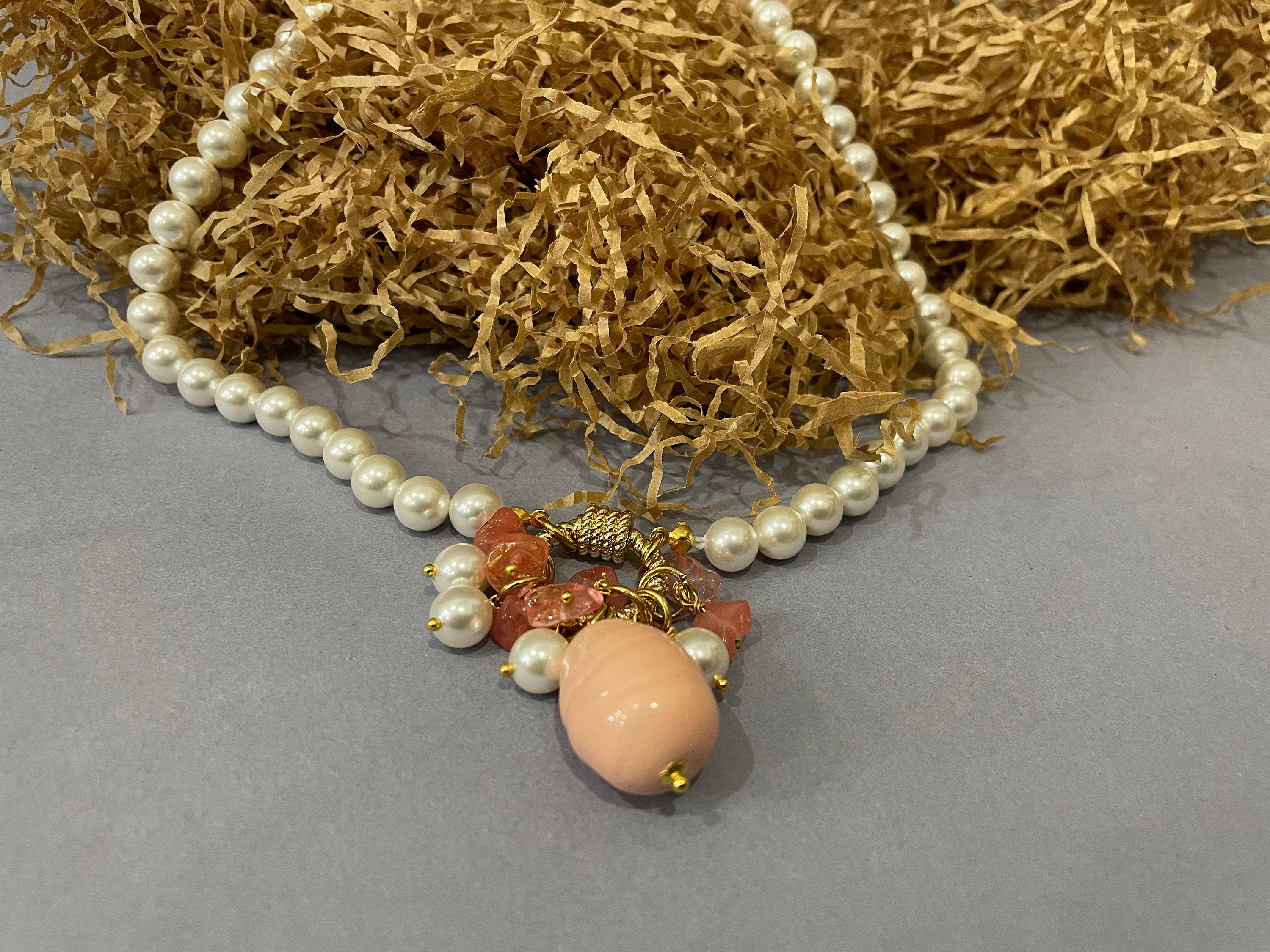 Collana di perle e Agata rosa, girocollo di perle di Maiorca, grande ciondolo a grappolo con perle di Agata rosa, regalo per lei.