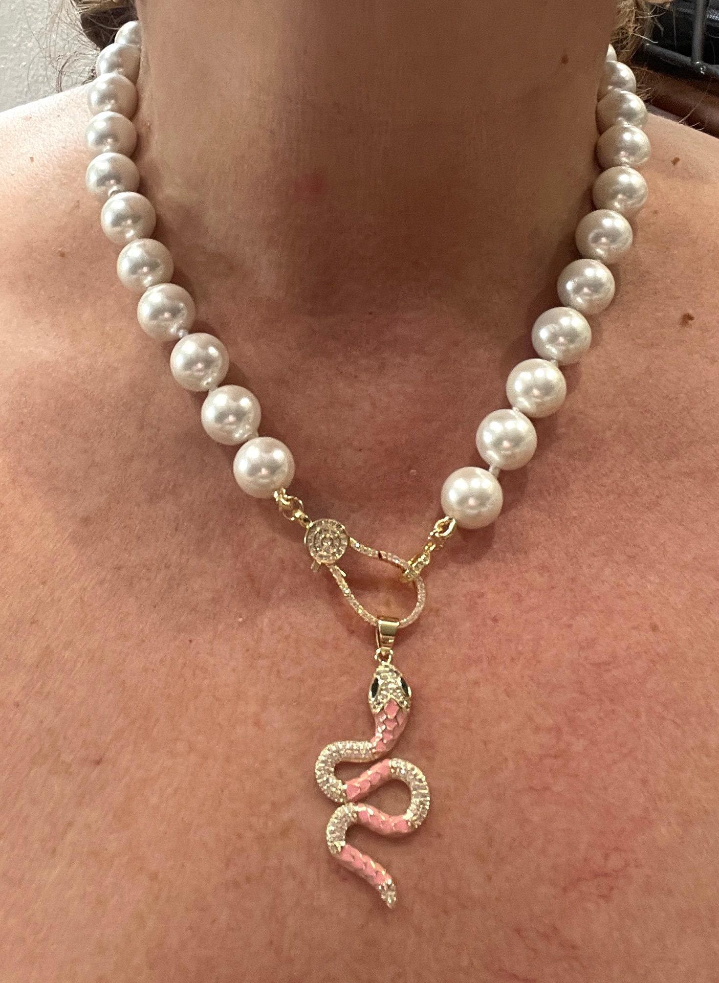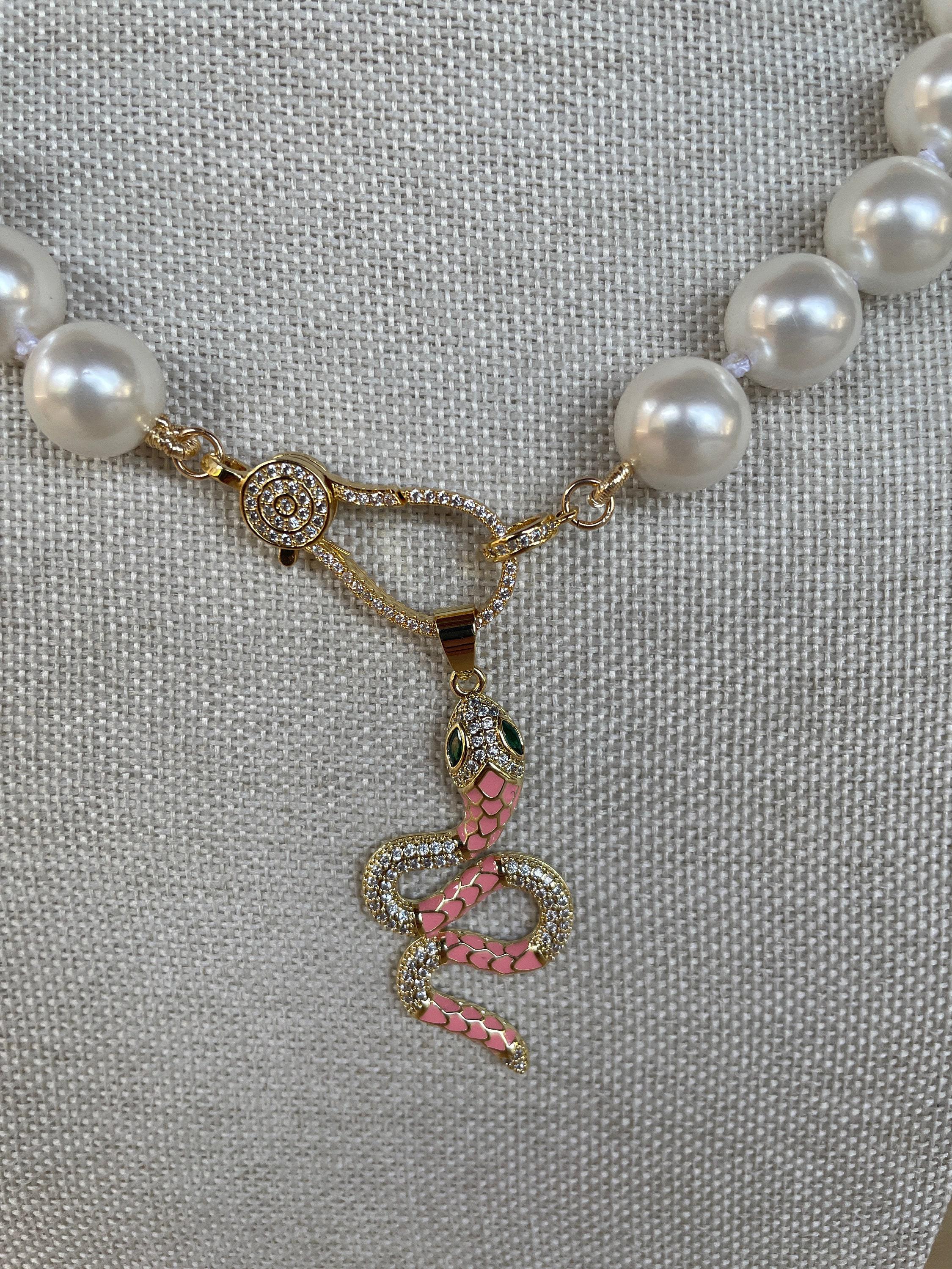 Il girocollo è decorato con un bel ciondolo a forma di Serpente smaltato di rosa e rivestito di zirconi pendente dalla chiusura frontale.