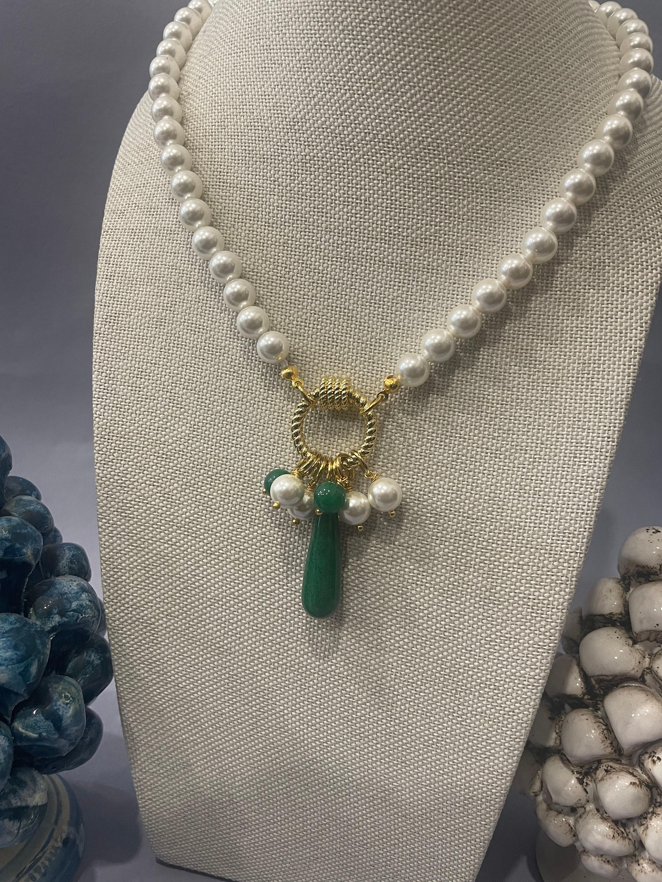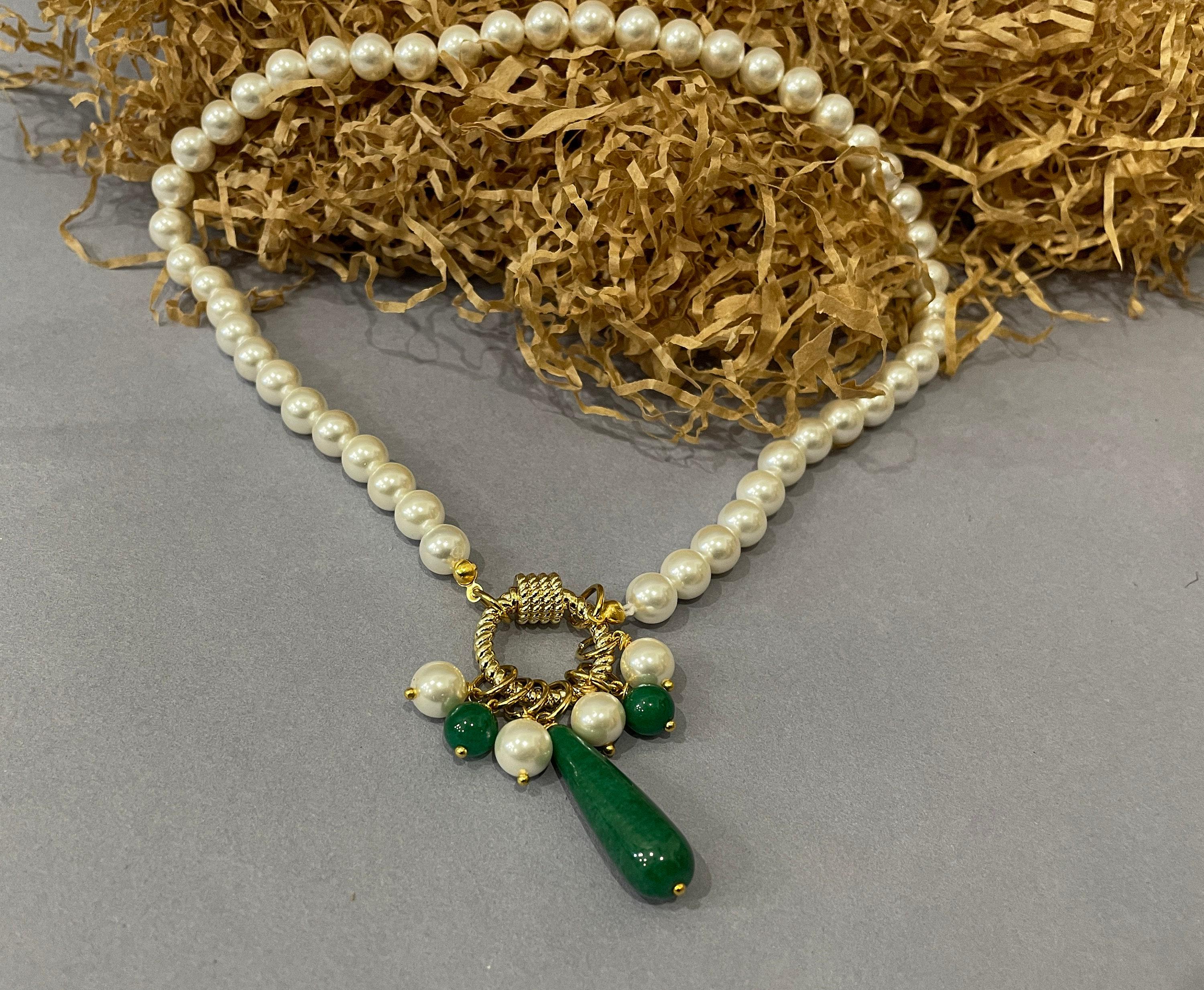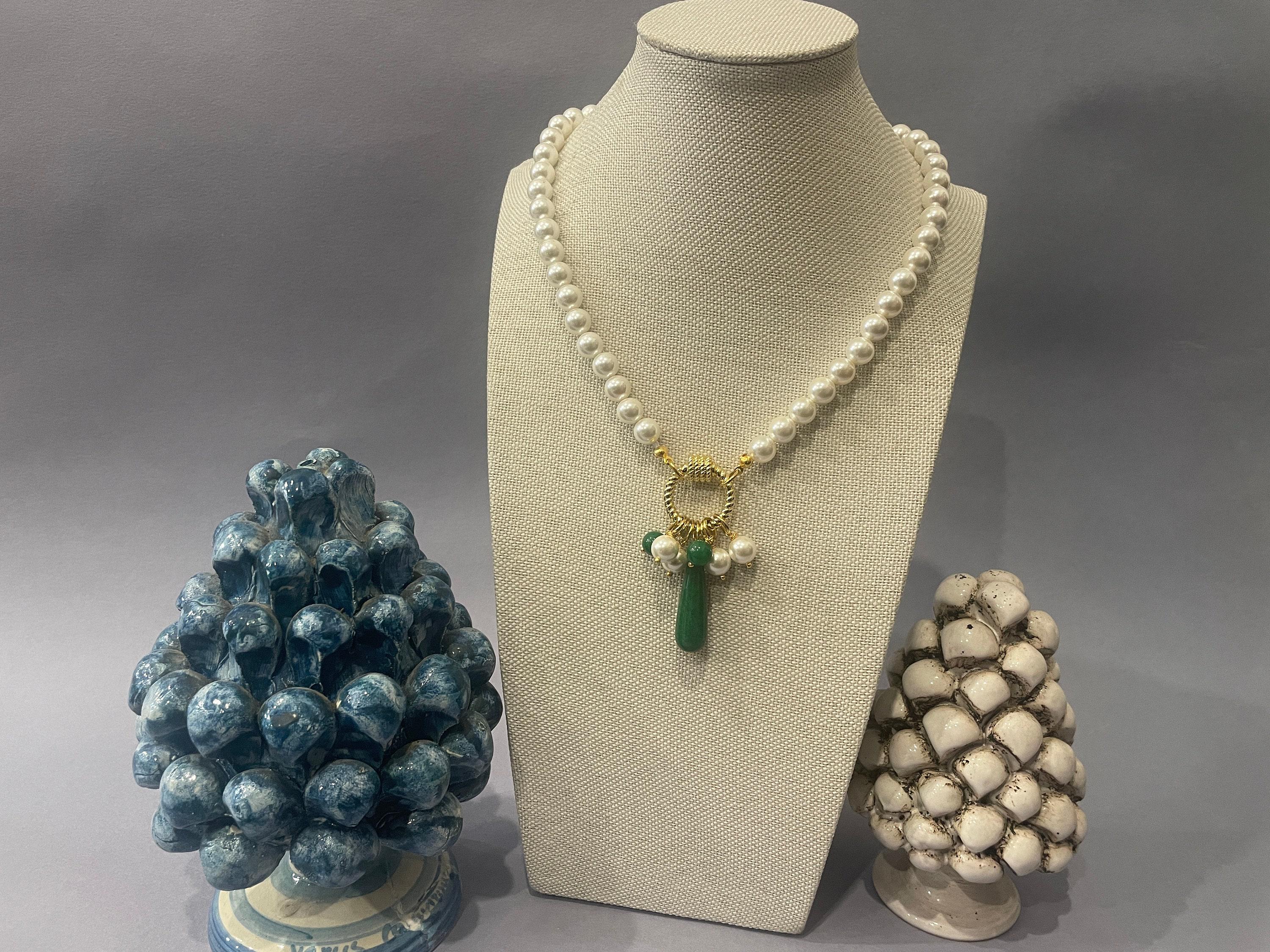 Il girocollo è decorato con un elegante grappolo di perle di Agata verde e perle di fiume.