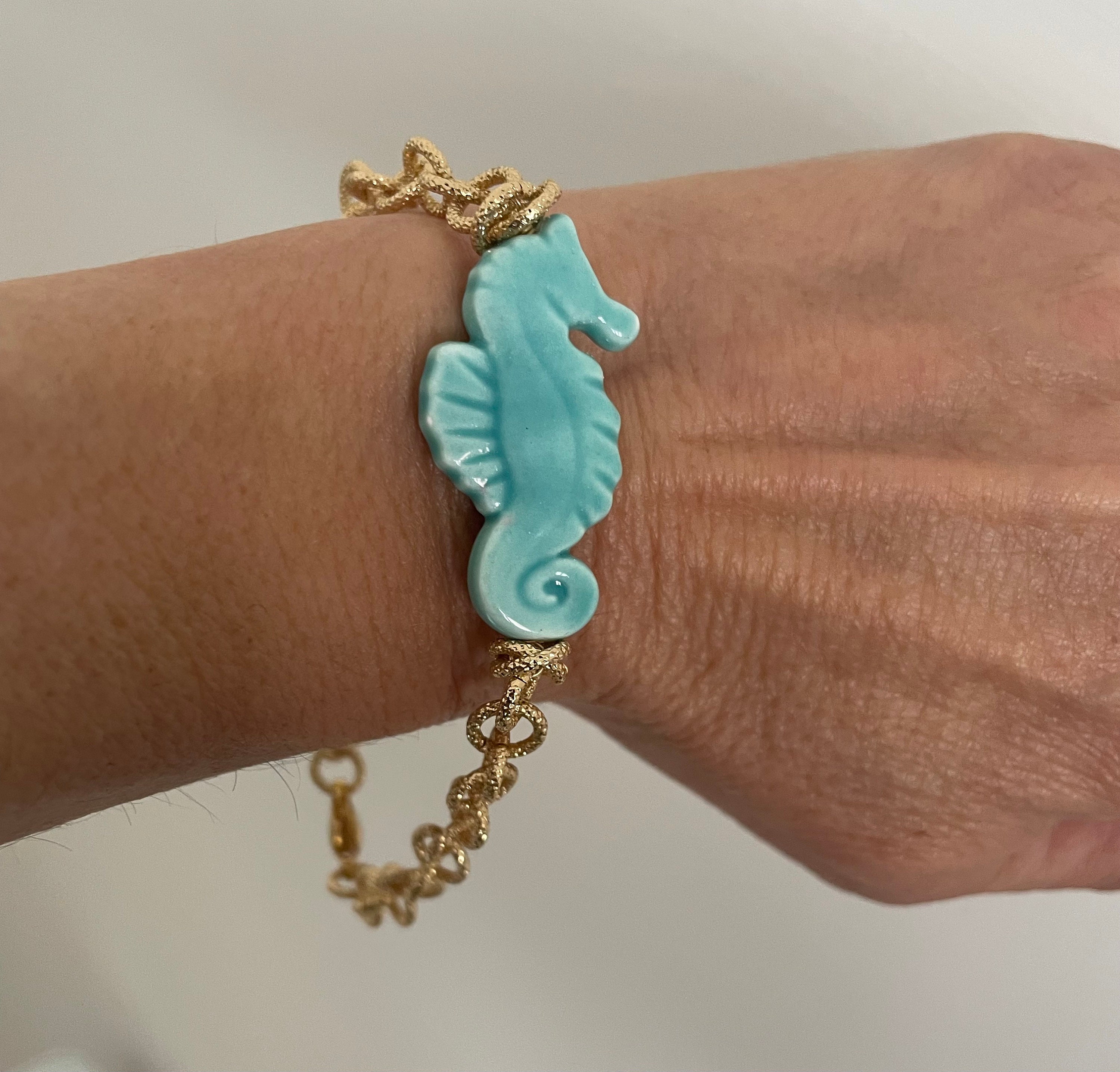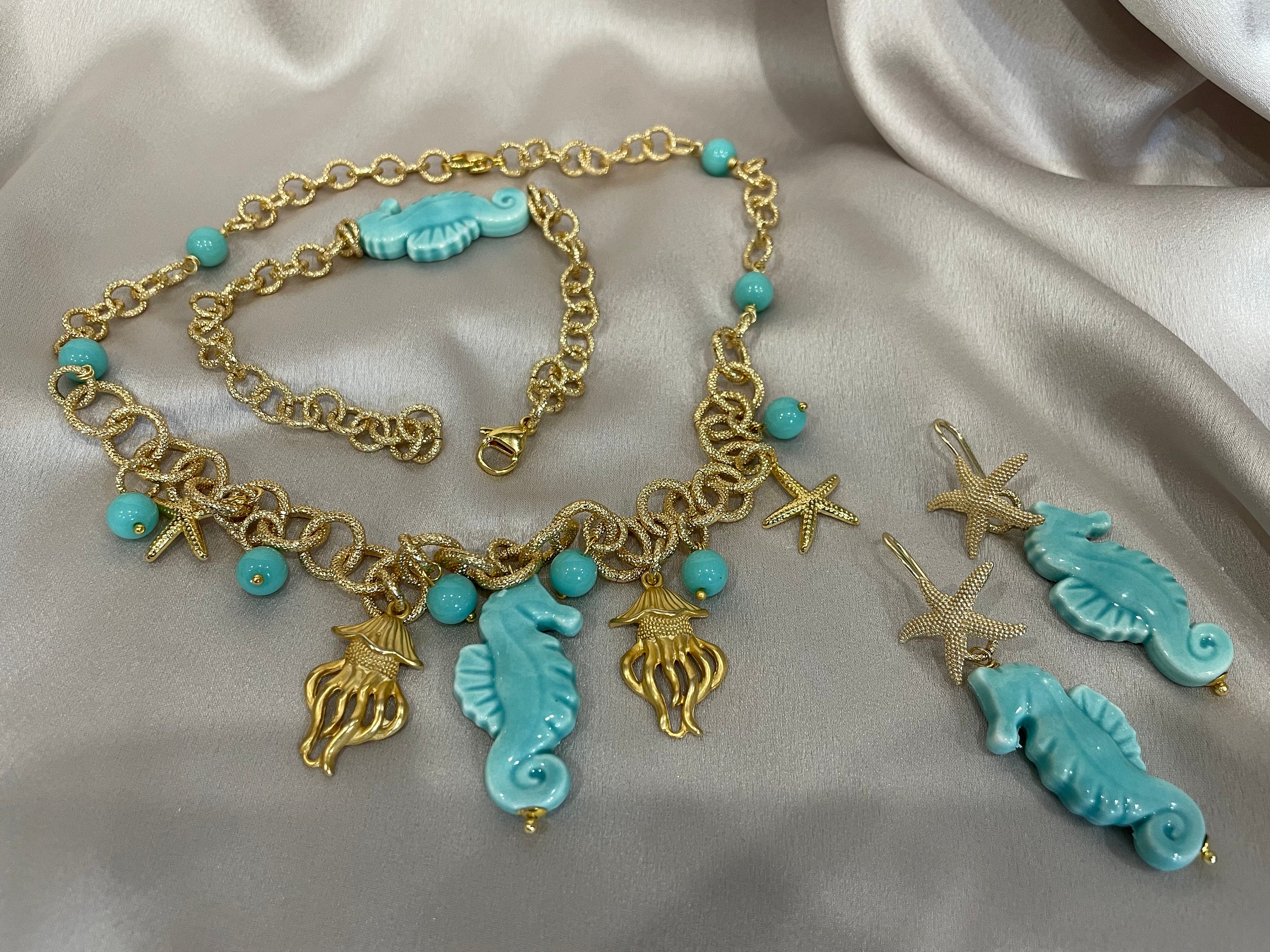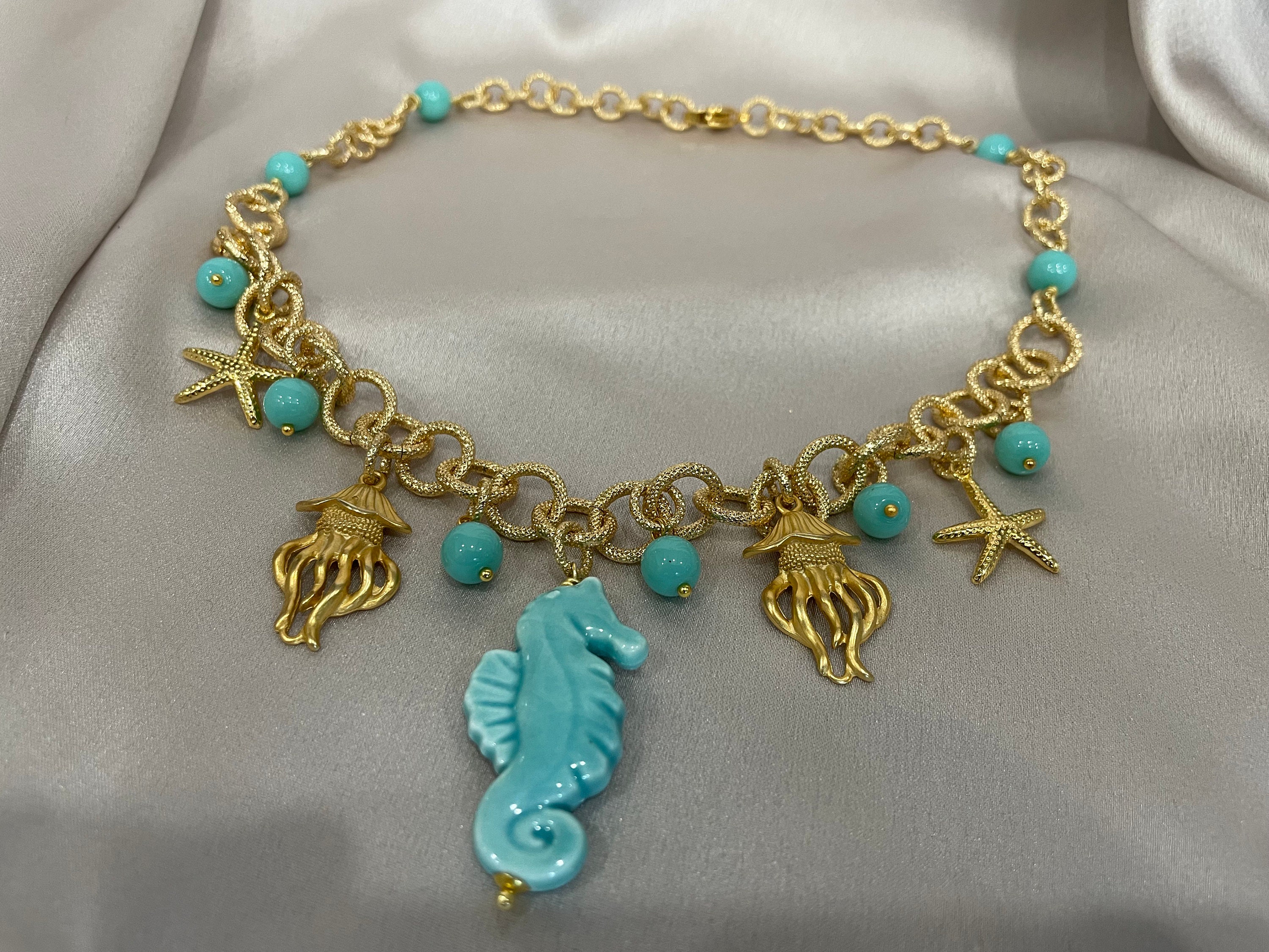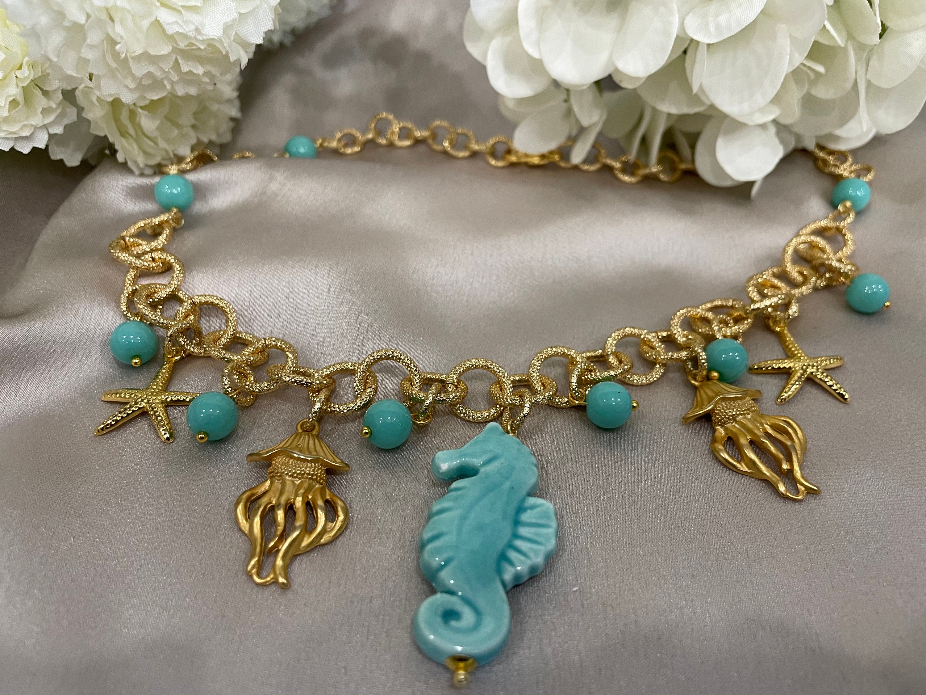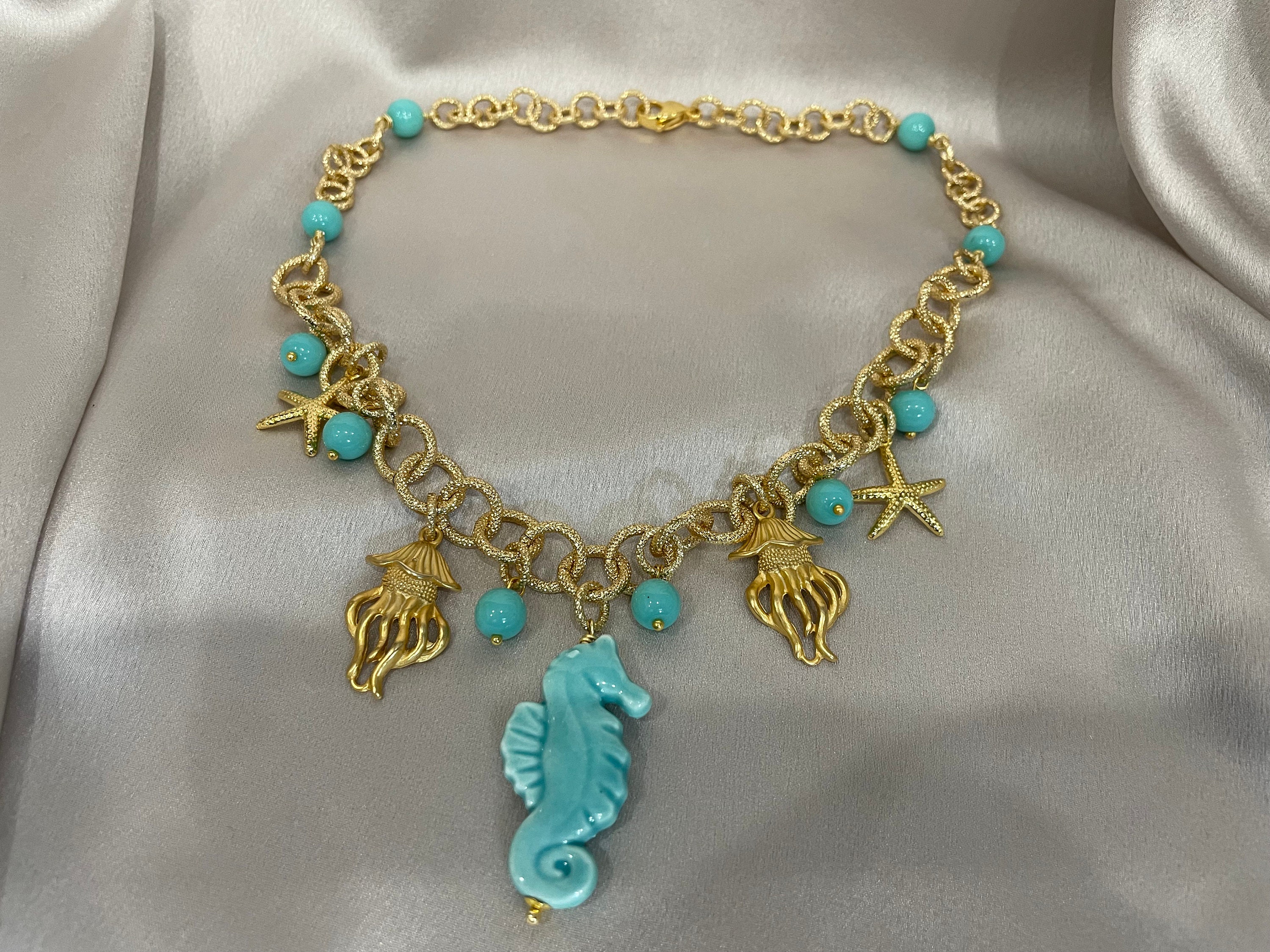 Collana girocollo, dal sapore vintage, creata con catena a maglie larghe in alluminio anallergico dorato e satinato in superficie. Ciondolo centrale in Ceramica di Caltagirone dipinto a mano e raffigurante un Cavalluccio marino, vari charms marini e perle di pietra naturale di colore turchese.