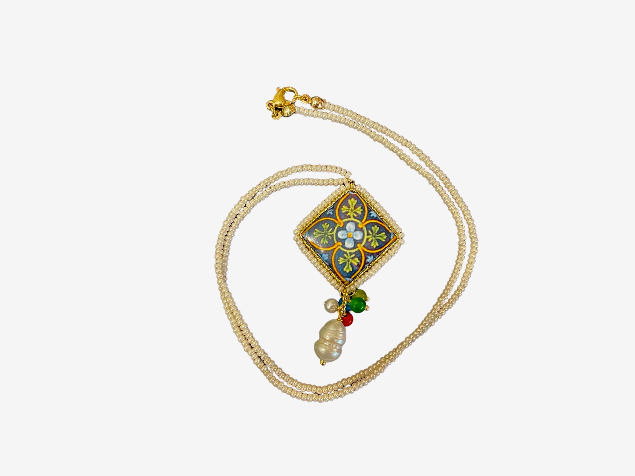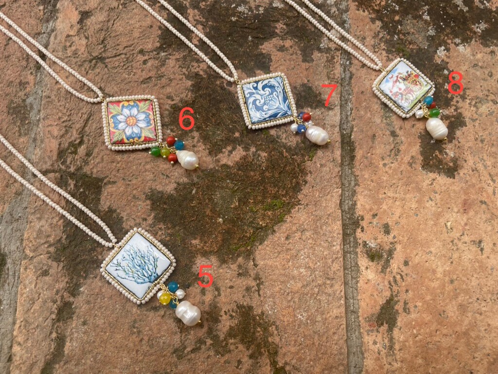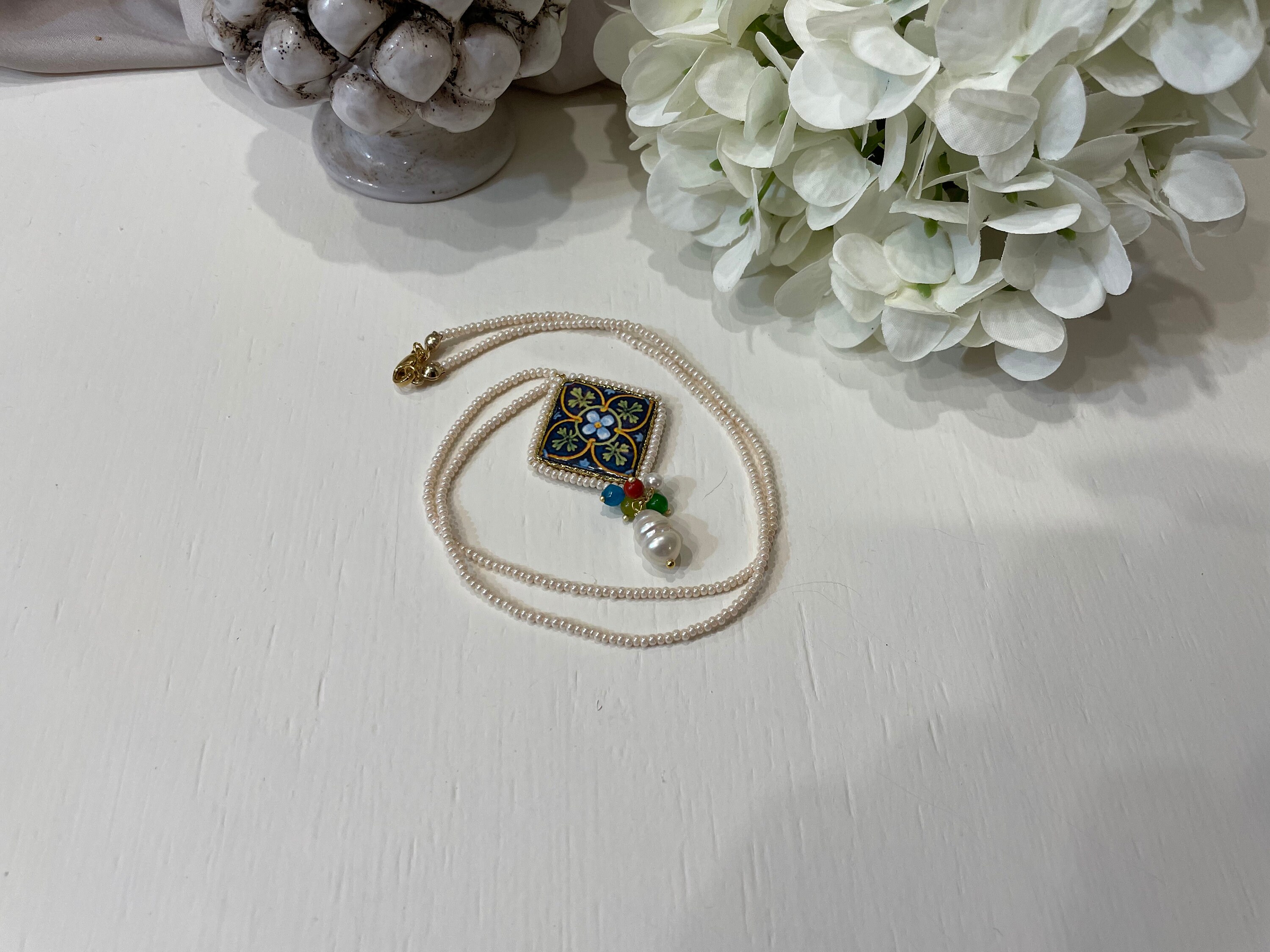 Realizzata con un filo di microperle di fiume, e come ciondolo una mattonella di ceramica di Caltagirone, stampata in superficie con motivi tipici della maiolica siciliana.