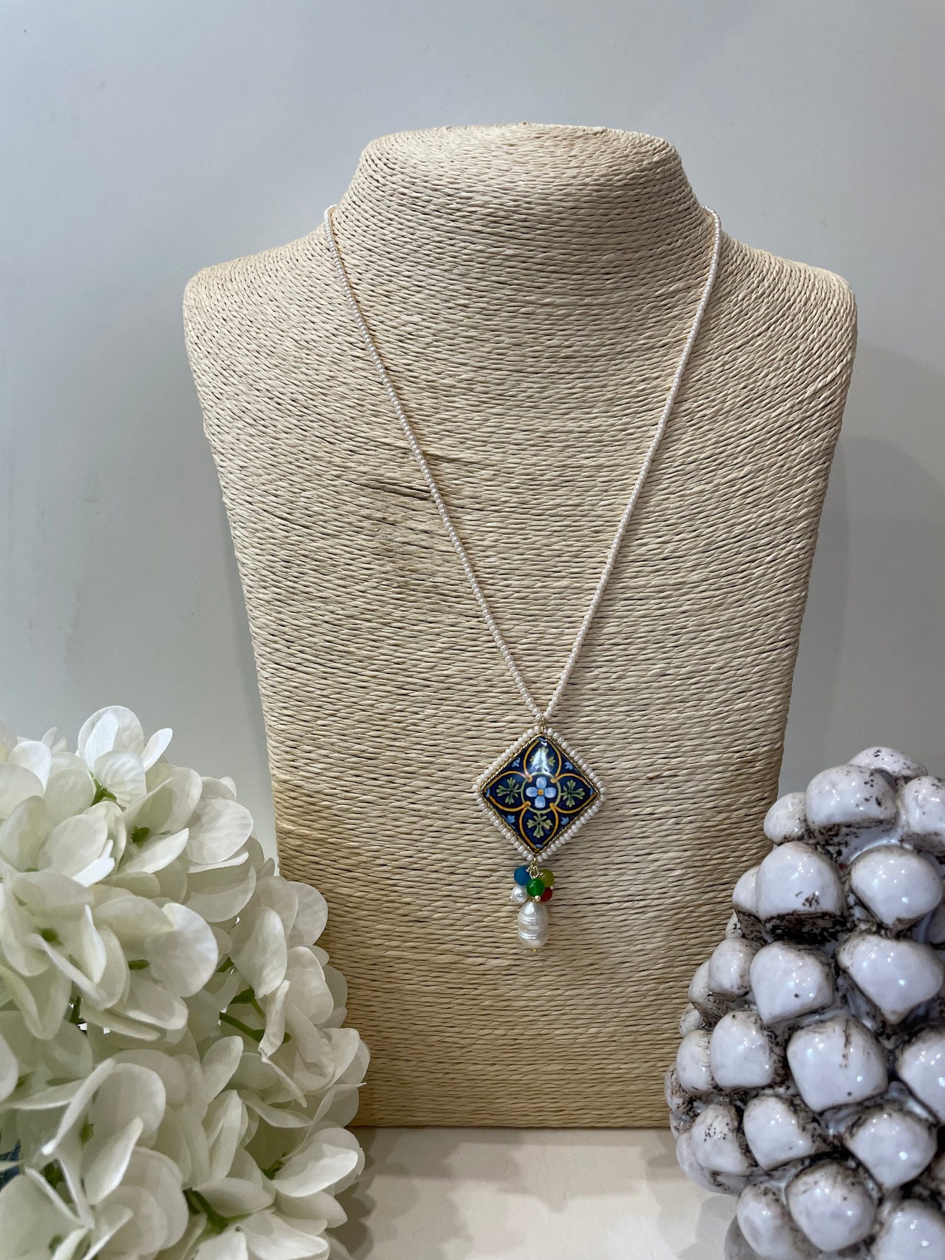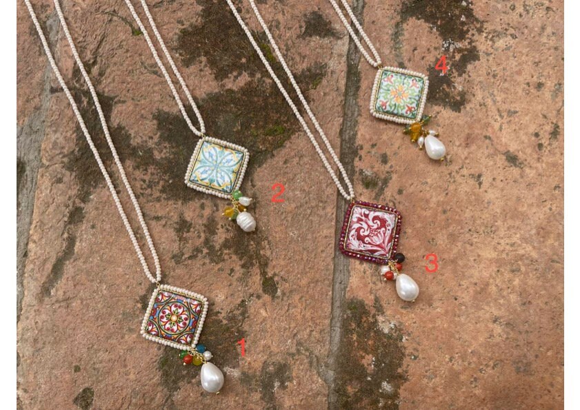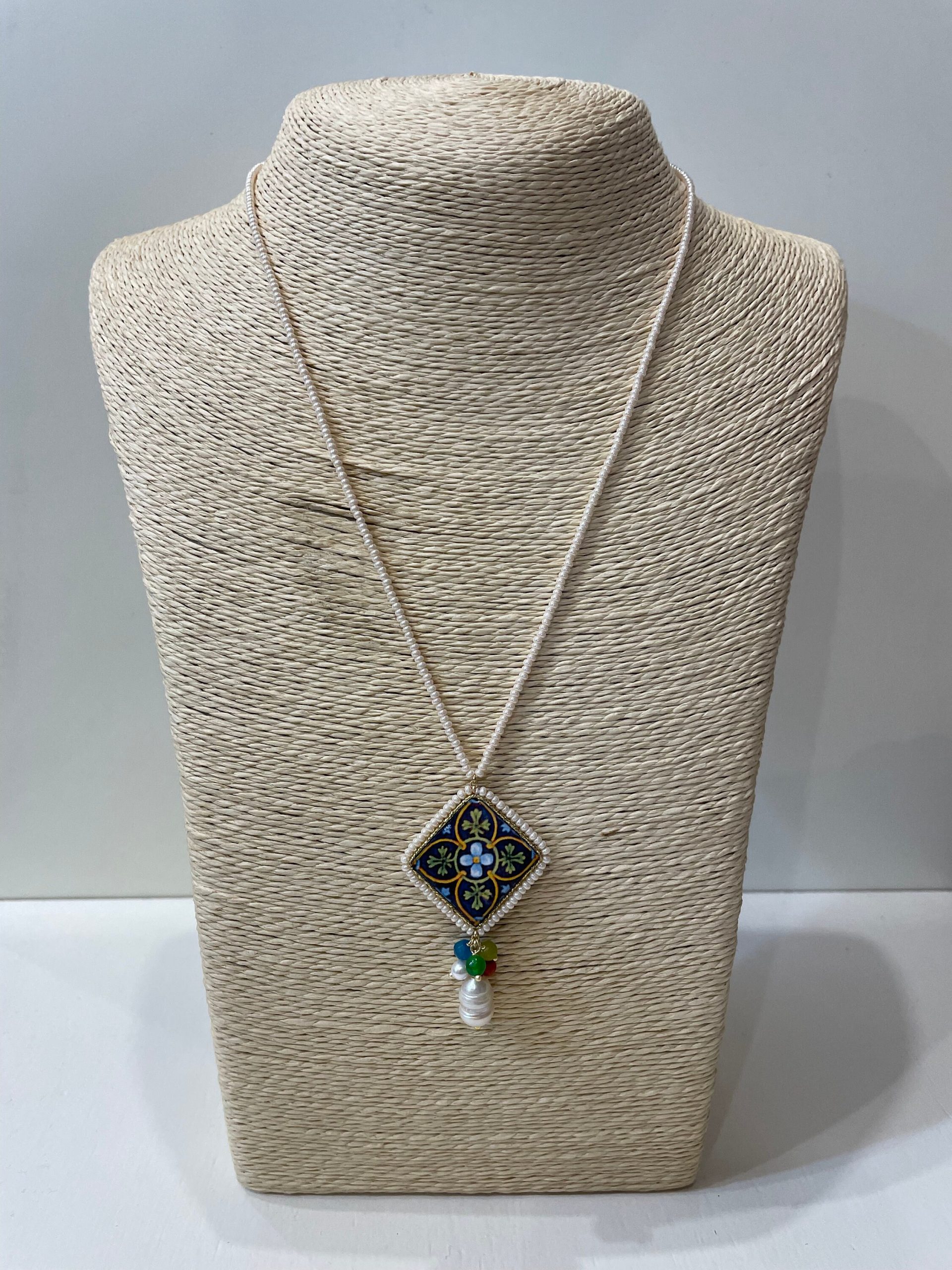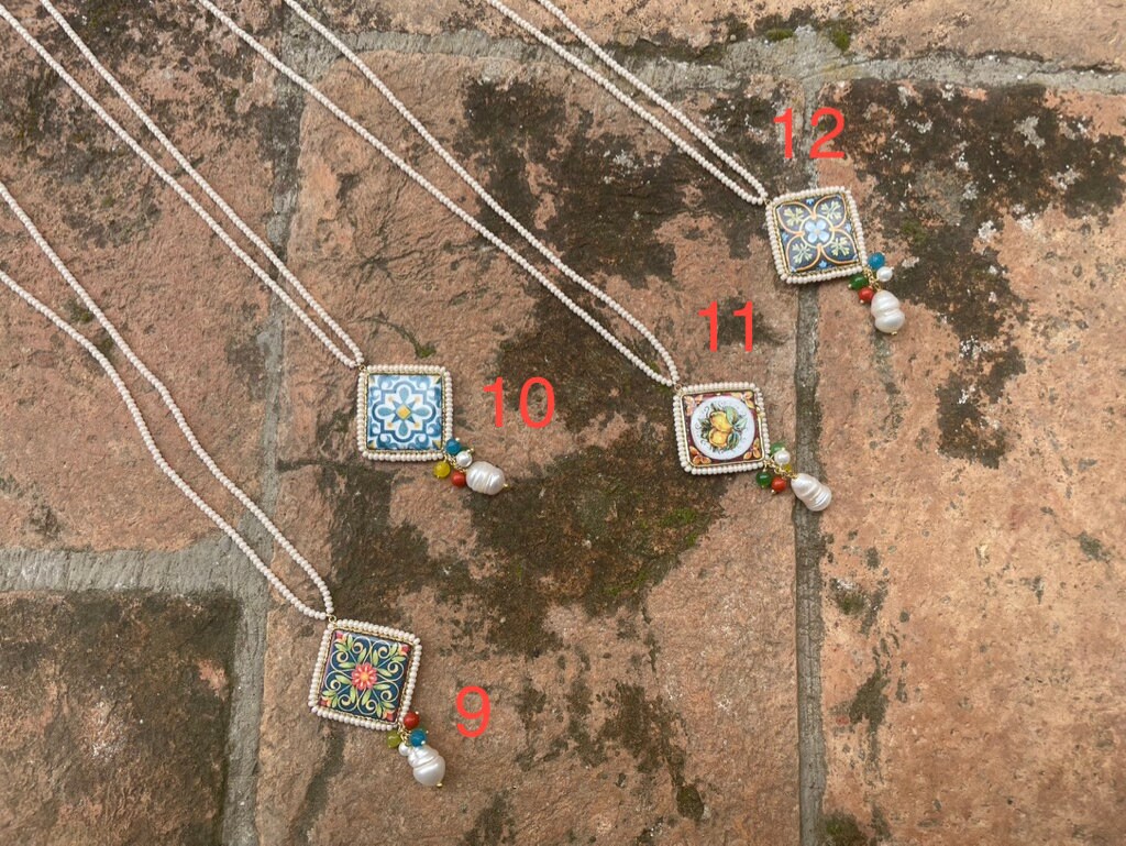 Realizzata con un filo di microperle di fiume, e come ciondolo una mattonella di ceramica di Caltagirone, stampata in superficie con motivi tipici della maiolica siciliana.